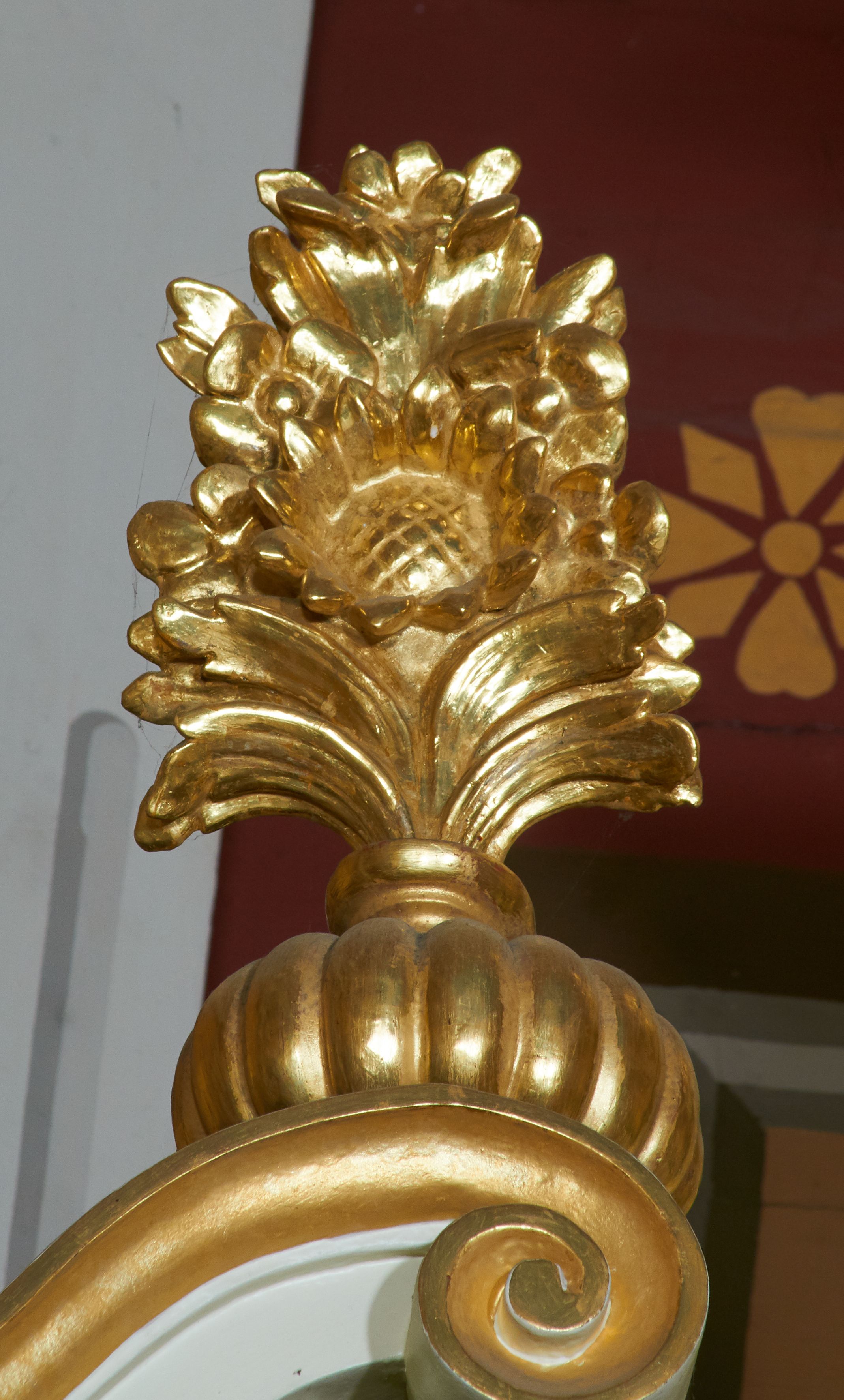 Zwieńczenie w kształcie stojącego prostokąta, flankowane parą pilastrów podtrzymujących przerwane belkowanie, zamknięte gzymsem w formie łuku odcinkowego. Na szczycie promienista gloria z otokiem chmur pośrodku z płaskorzeźbionym monogramem IHS. W polu głównym obraz przedstawiający Ekstazę św. Teresy w kształcie stojącego prostokąta, zamknięty łukiem nadwieszonym. Po bokach zwieńczenia uszy z liści akantu i kwiatów. Pod obrazem uskrzydlona para główek aniołków.