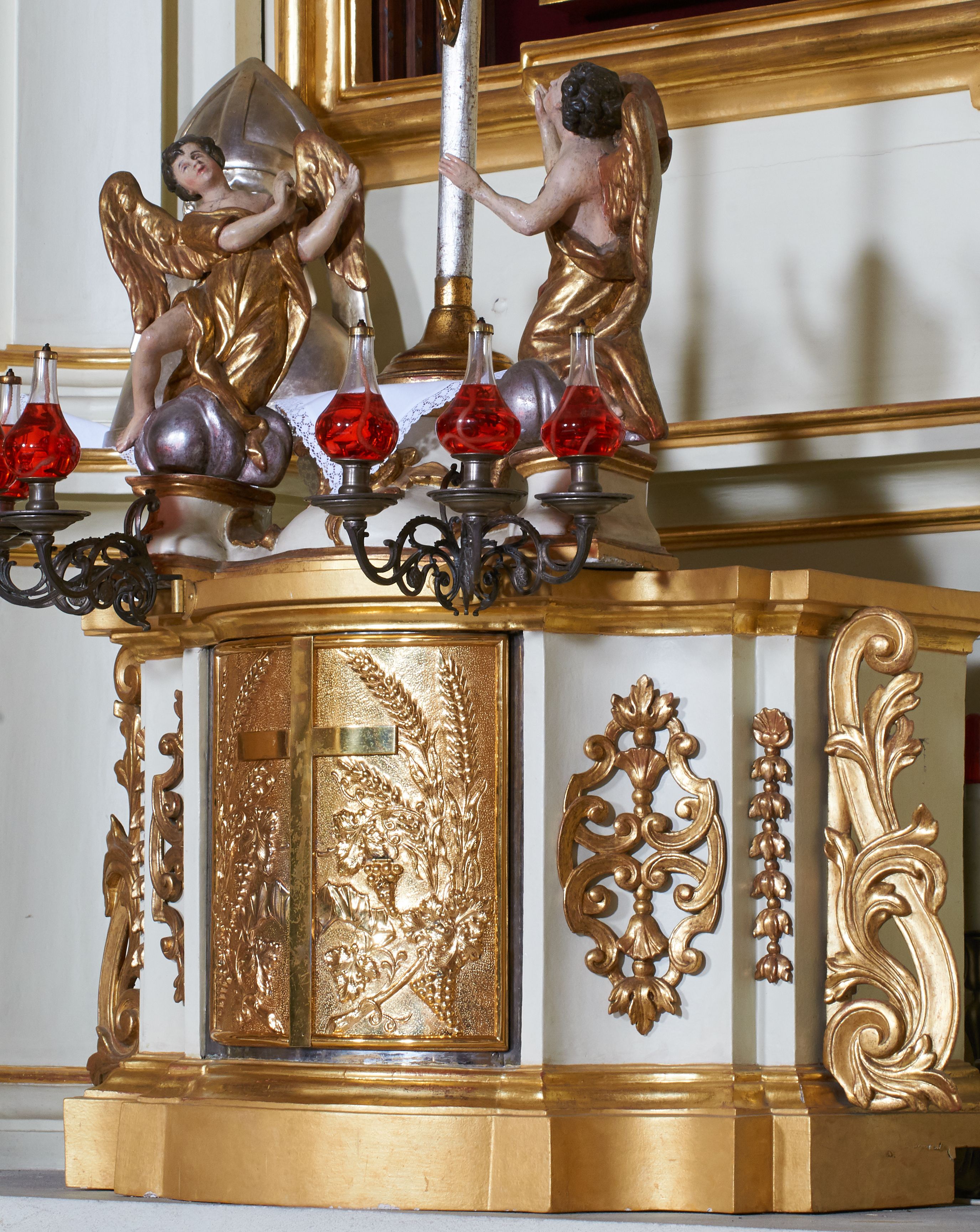 Ołtarz architektoniczny, drewniany, jednoosiowy, jednokondygnacyjny z bramkami. Mensa wąska, prostopadłościenna o ściankach wklęsło-wypukłych. Tabernakulum w kształcie prostopadłościennej skrzynki z przodu o linii wklęsło-wypukłej z uskokami. Ustawione jest na wysokim cokole, flankowane parą szerokich, wklęsłych pilastrów, zdobionych ornamentem złożonym z przeplatających się wolut i kampanul. Ścianka frontowa wypukła, w polu prostokątne, metalowe drzwiczki, zdobione kiśćmi winogron i kłosami zbóż, pośrodku łaciński prosty krzyż. Całość zamknięta profilowanym gzymsem. Po bokach tabernakulum zwisy z kampanul, a na skrajach płaskorzeźbione uszy z liści akantu. Do górnej krawędzi przybite gwoździem na trzech tulejach lampki oliwne. Nad tabernakulum tron wystawienia z rzeźbionymi w drewnie aniołkami na obłokach adorującymi krucyfiks.