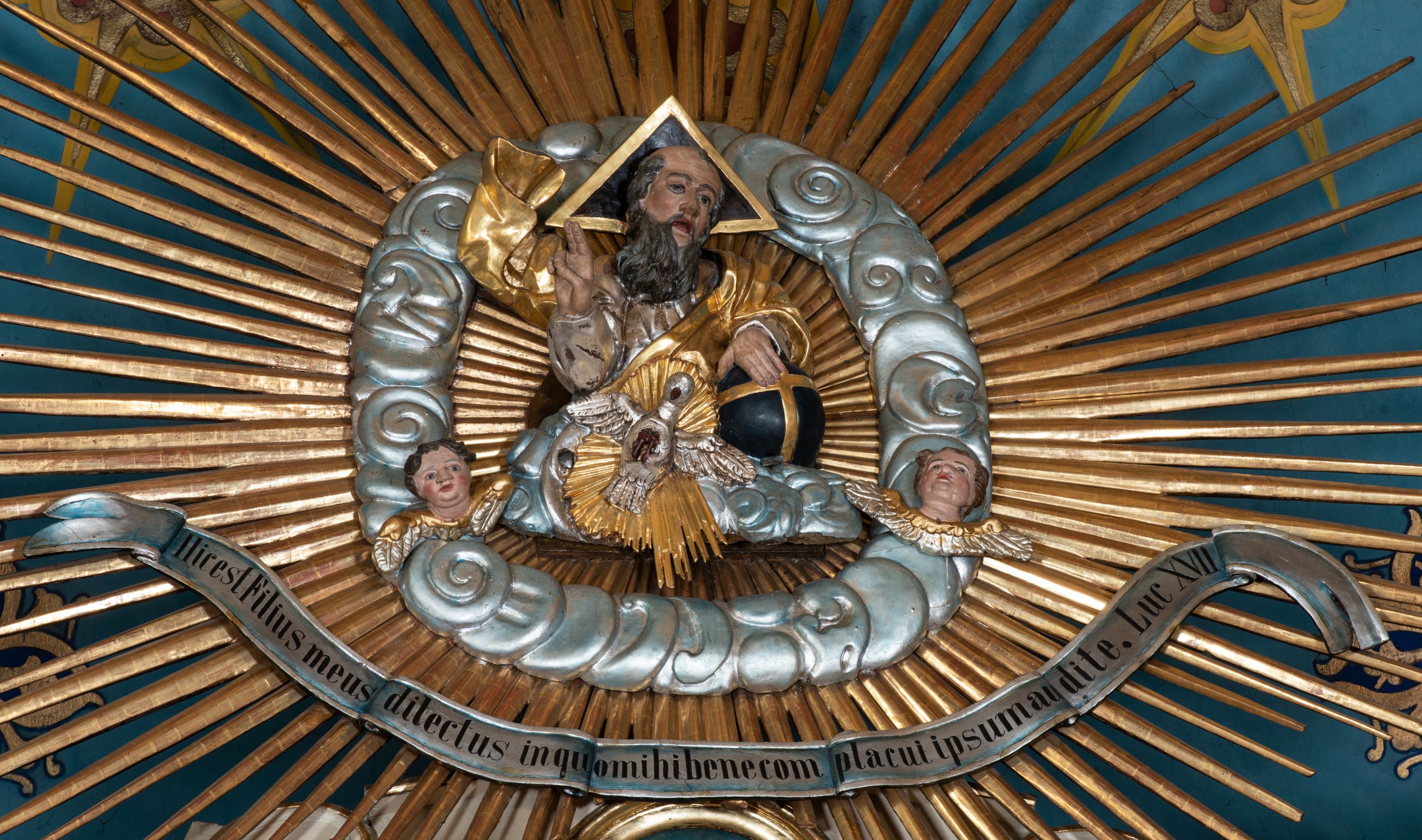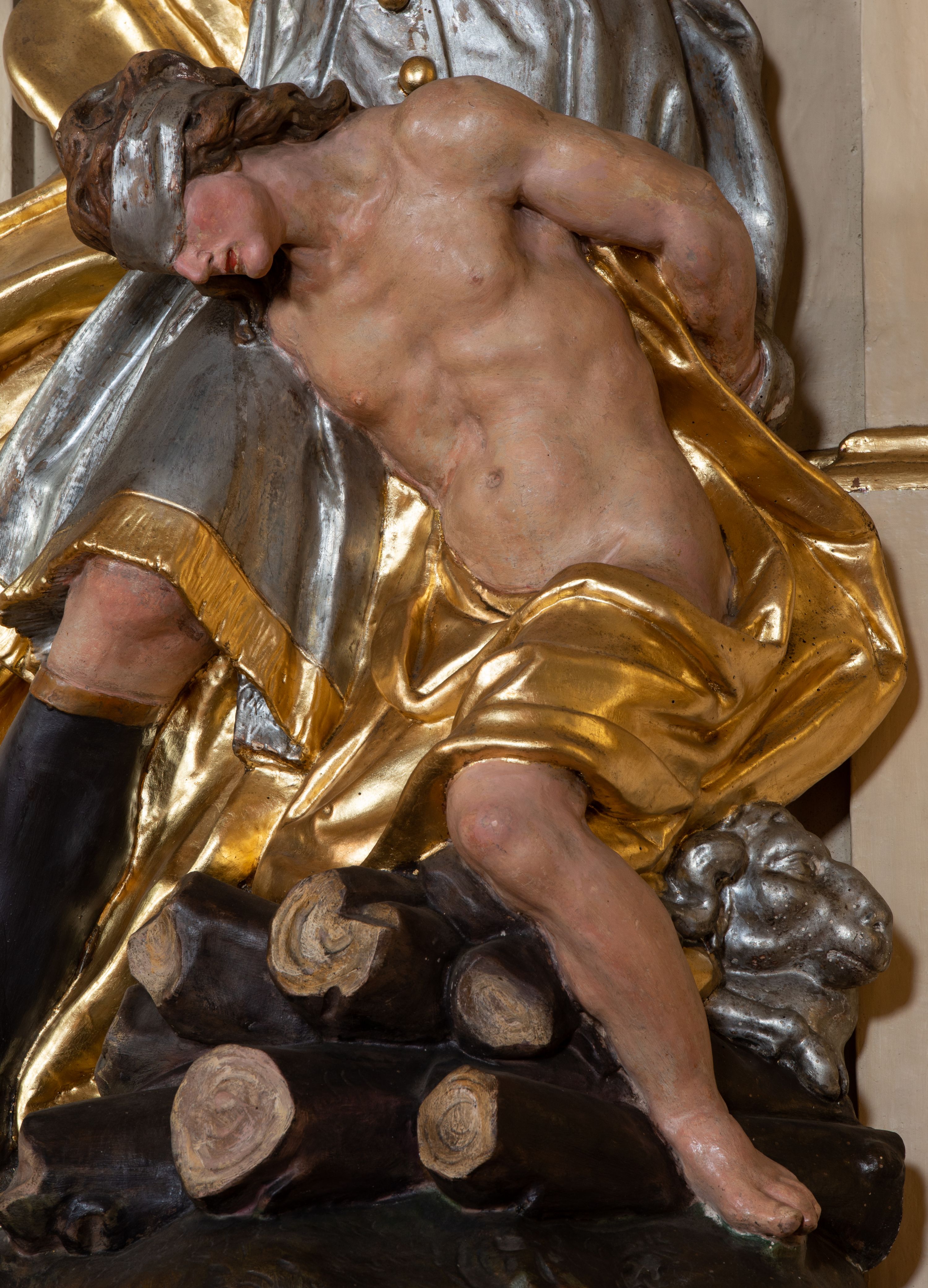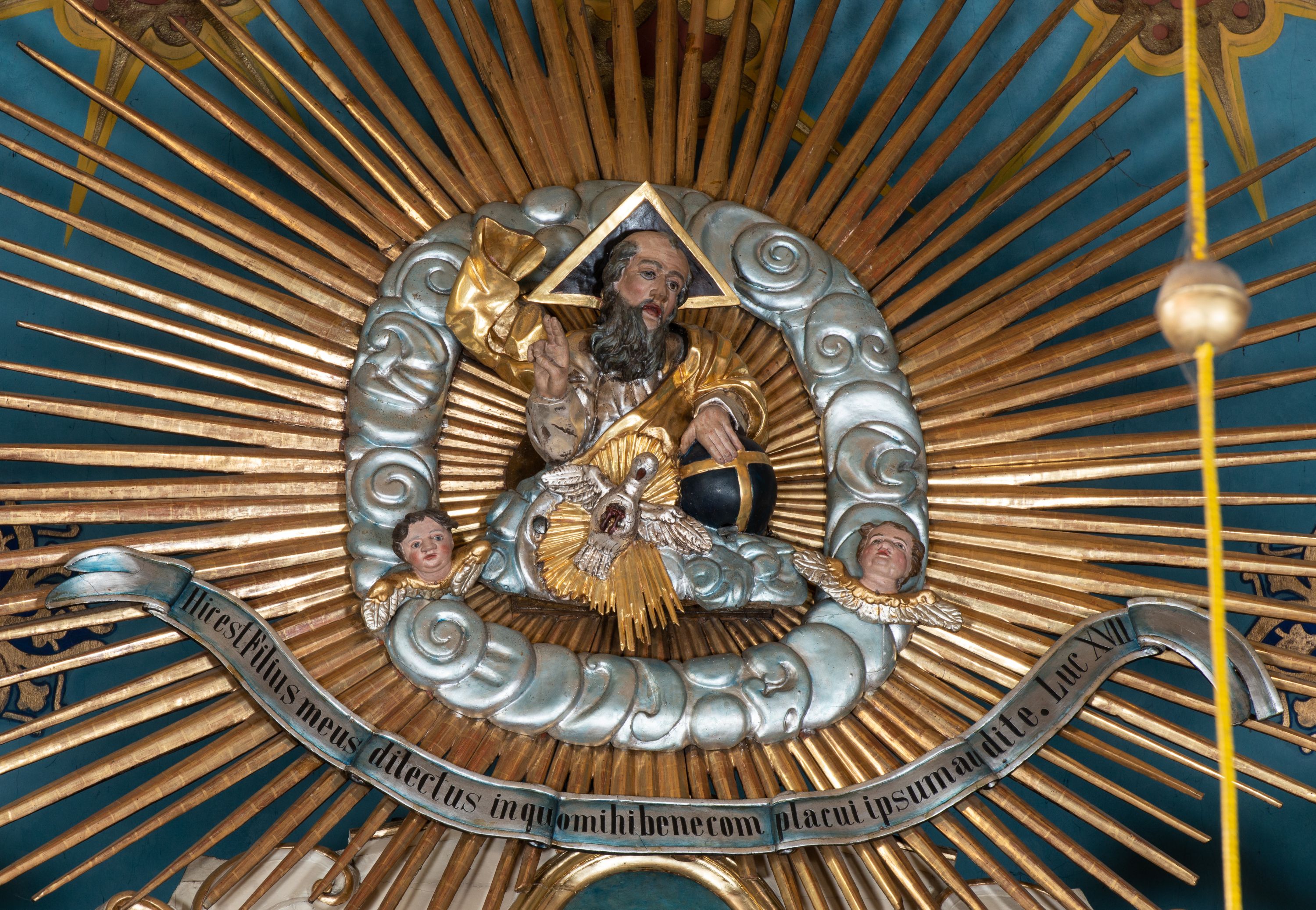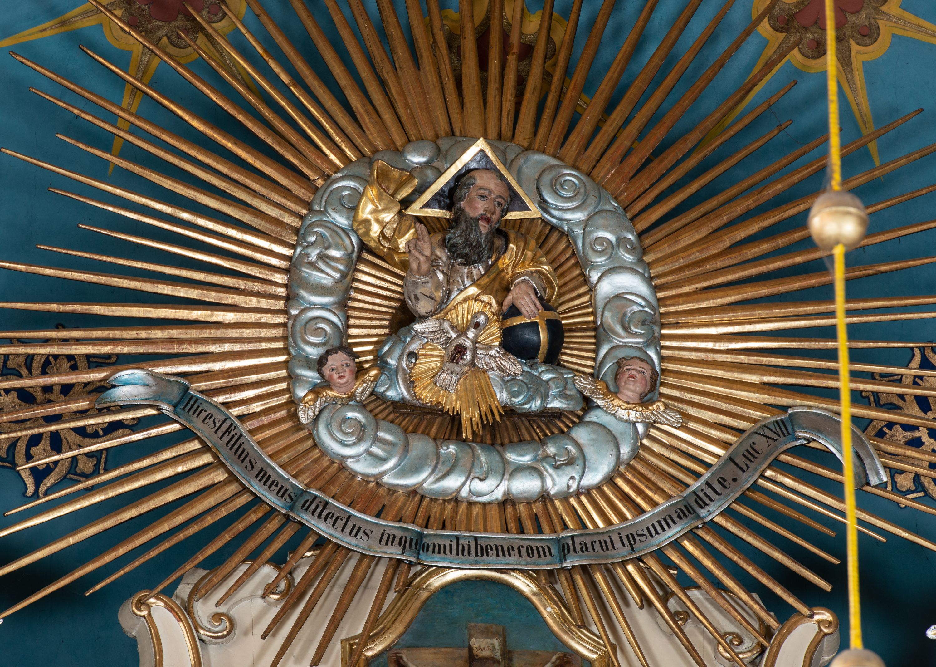 Pierwsza kondygnacja wydzielona czterema parami wklęsłych pilastrów o trzonach dekorowanych rocaille'em i zwisami kwiatowymi oraz stojącymi na ich tle dwiema parami kolumn o kapitelach kompozytowych. Podpory dźwigają niepełne belkowanie, przerwane nad polami kondygnacji, obniżone nad zewnętrzną parą kolumn. Na skrajnej partii cokołu nastawy karbowane woluty z fantazyjnymi gruszkowatymi cokołami podtrzymującymi rocaille'owe wazony. W polu środkowym głęboka wnęka w formie stojącego prostokąta zamkniętego łukiem odcinkowym podwójnie nadwieszonym z uskokiem, ujęta profilowaną ramą, z obrazem Ecce Homo w osobnej, podwójnej ramie. Nad nią kartusz rokokowy z napisem „In nomine Jesu / om(n)e Genu flec / tatur. ad Philipenses / Cap(ut) II”. Wnękę flankują figury Matki Boskiej i św. Marii Magdaleny ustawione na rocaille'owych konsolach. Na osiach bocznych figura Dawida i grupa ofiary Izaaka na cokołach z nadlatującymi puttami nad nimi. Druga kondygnacja flankowana trzema parami pilastrów o trzonach przechodzących w spływy wolutowe i osobne woluty, opadające na belkowanie pierwszej kondygnacji, na których siedzą putta i anioły trzymające kartusze z napisami: „ET / GLORIA” i „SOLI / DEO / HONOR”. Kondygnacja zamknięta profilowanym gzymsem wyłamanym na ich osi oraz załamanym w dół nad polem. Na gzymsie fragmenty przerwanego, falistego przyczółka, na których siedzą anioły. W polu obraz św. Macieja w formie zbliżonej do trapezu o dwóch wypukłych bokach, ujęty profilowaną ramą. Pole flankowane akantem, powyżej rocaille'owy kartusz z napisem: „IN / CRUCE / SALUS”. Zwieńczenie w formie zbliżonej do trapezu, o wklęsłych bokach, ujętych wolutami, zamknięte cęgowymi wolutami. W polu obraz Ukrzyżowania w formie zbliżonej do trapezu o dwóch wypukłych bokach, ujęty profilowaną ramą, flankowany akantem. Całość zamknięta płaskorzeźbionym przedstawieniem popiersia Boga Ojca oraz gołębicy Ducha Świętego w glorii, w otoku z obłoków i uskrzydlonych główek anielskich, w glorii promienistej, u dołu szarfa z napisem: „Hic est Filius meus dilectus in quo mihi bene complacui ipsum audite. Luc[a] XVII”. Struktura polichromowana w kolorze beżowym, dolna strefa cokołu brązowa, część trzonów pilastrów pomalowana na kolor jasnoróżowy; trzony kolumn, profile i ornamentyka złocone, detal srebrzony.