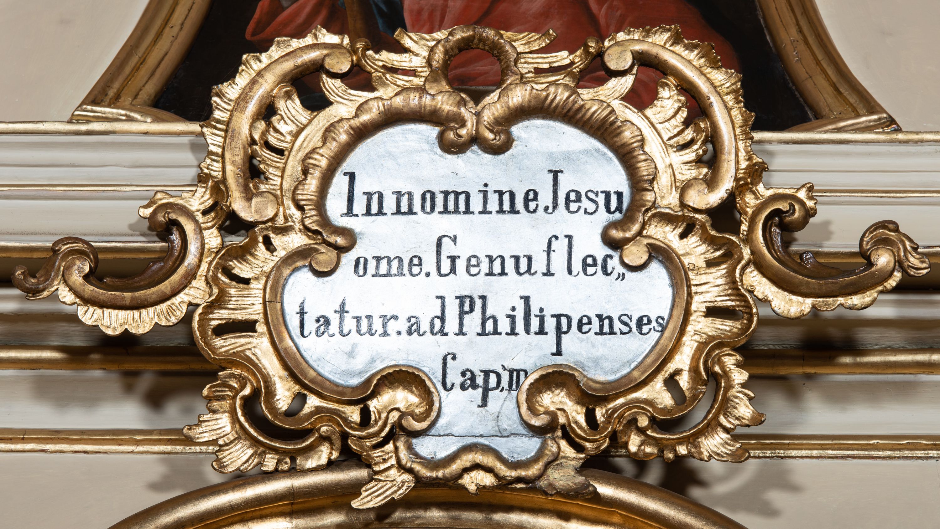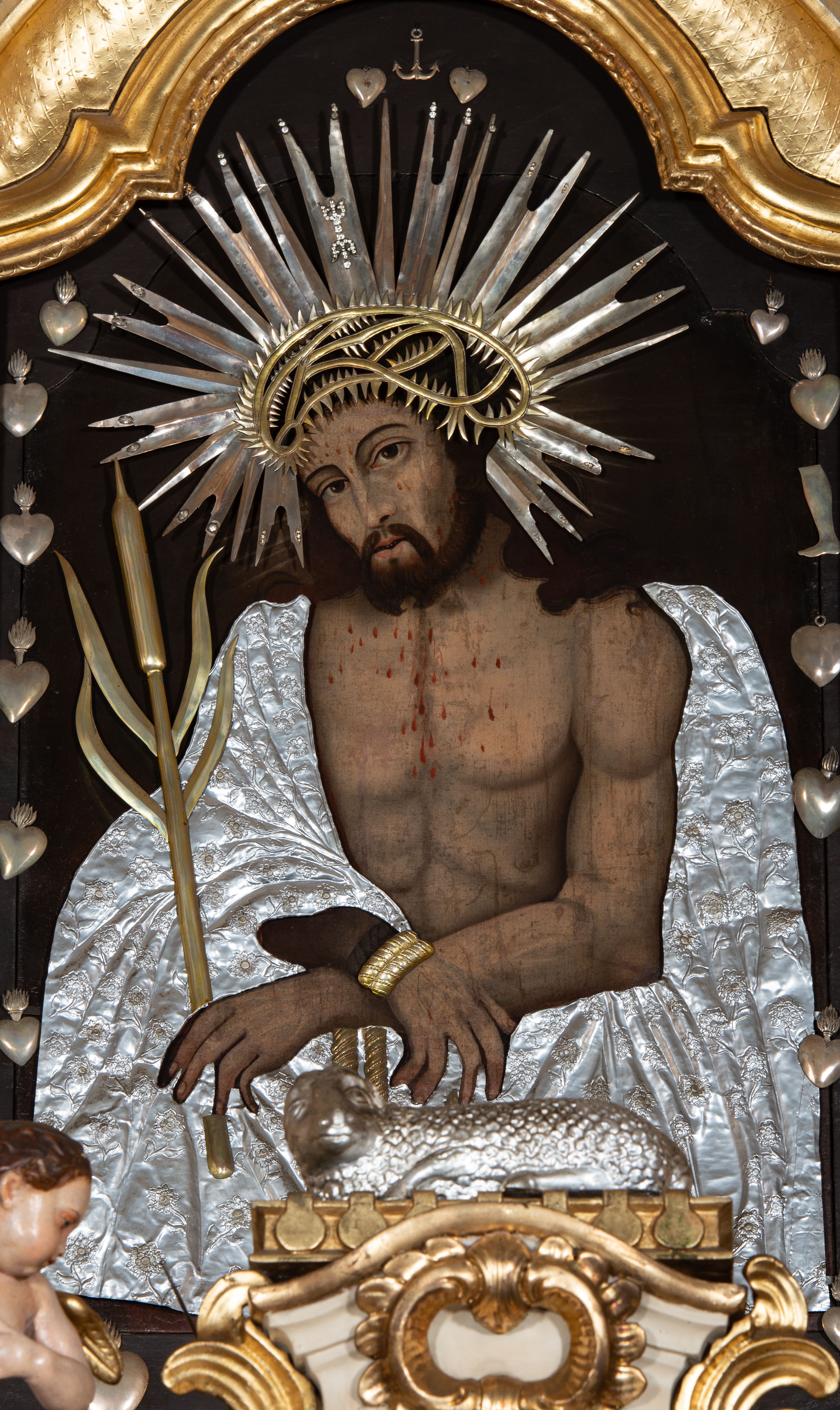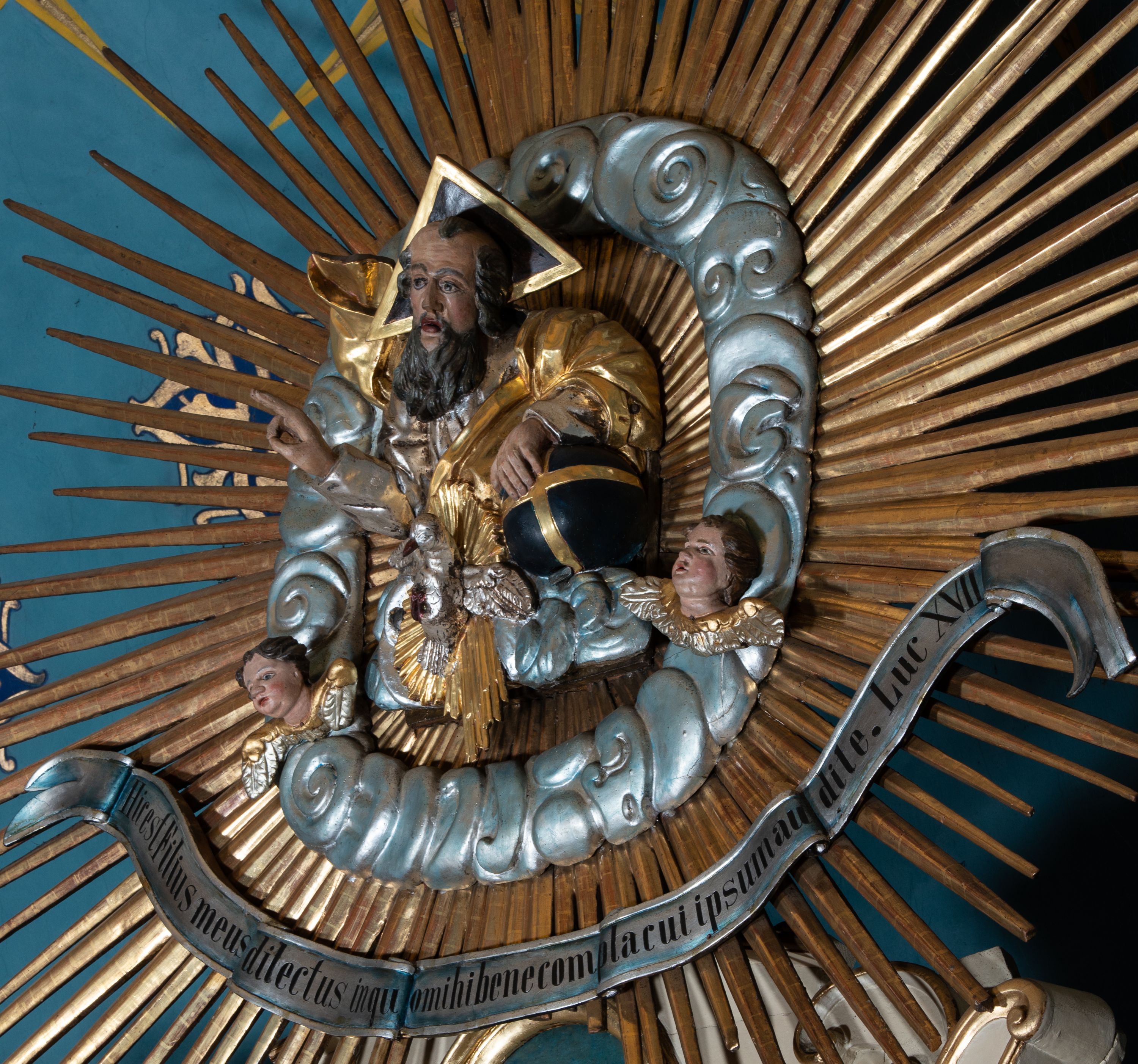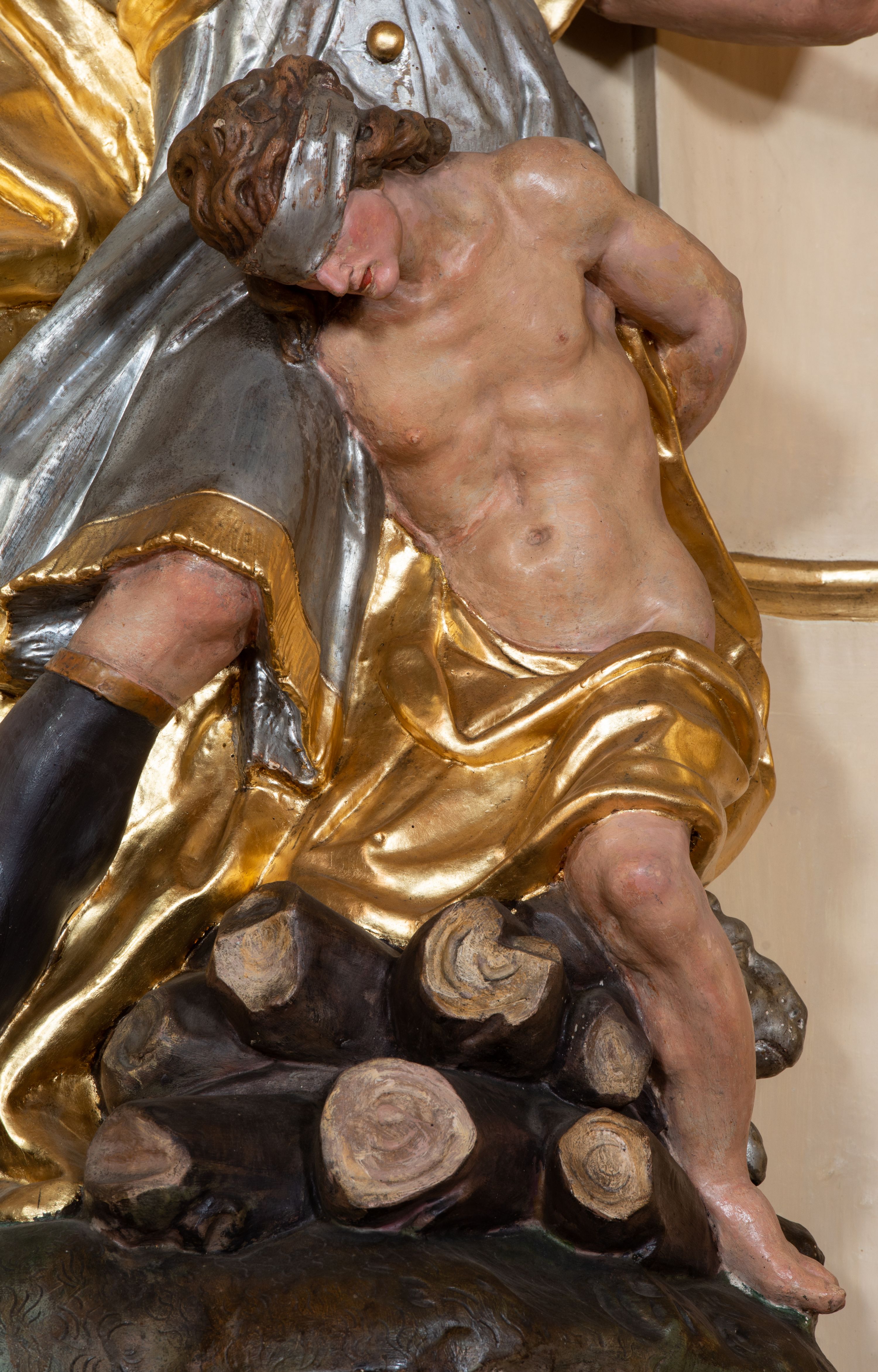 Pierwsza kondygnacja wydzielona czterema parami wklęsłych pilastrów o trzonach dekorowanych rocaille'em i zwisami kwiatowymi oraz stojącymi na ich tle dwiema parami kolumn o kapitelach kompozytowych. Podpory dźwigają niepełne belkowanie, przerwane nad polami kondygnacji, obniżone nad zewnętrzną parą kolumn. Na skrajnej partii cokołu nastawy karbowane woluty z fantazyjnymi gruszkowatymi cokołami podtrzymującymi rocaille'owe wazony. W polu środkowym głęboka wnęka w formie stojącego prostokąta zamkniętego łukiem odcinkowym podwójnie nadwieszonym z uskokiem, ujęta profilowaną ramą, z obrazem Ecce Homo w osobnej, podwójnej ramie. Nad nią kartusz rokokowy z napisem „In nomine Jesu / om(n)e Genu flec / tatur. ad Philipenses / Cap(ut) II”. Wnękę flankują figury Matki Boskiej i św. Marii Magdaleny ustawione na rocaille'owych konsolach. Na osiach bocznych figura Dawida i grupa ofiary Izaaka na cokołach z nadlatującymi puttami nad nimi. Druga kondygnacja flankowana trzema parami pilastrów o trzonach przechodzących w spływy wolutowe i osobne woluty, opadające na belkowanie pierwszej kondygnacji, na których siedzą putta i anioły trzymające kartusze z napisami: „ET / GLORIA” i „SOLI / DEO / HONOR”. Kondygnacja zamknięta profilowanym gzymsem wyłamanym na ich osi oraz załamanym w dół nad polem. Na gzymsie fragmenty przerwanego, falistego przyczółka, na których siedzą anioły. W polu obraz św. Macieja w formie zbliżonej do trapezu o dwóch wypukłych bokach, ujęty profilowaną ramą. Pole flankowane akantem, powyżej rocaille'owy kartusz z napisem: „IN / CRUCE / SALUS”. Zwieńczenie w formie zbliżonej do trapezu, o wklęsłych bokach, ujętych wolutami, zamknięte cęgowymi wolutami. W polu obraz Ukrzyżowania w formie zbliżonej do trapezu o dwóch wypukłych bokach, ujęty profilowaną ramą, flankowany akantem. Całość zamknięta płaskorzeźbionym przedstawieniem popiersia Boga Ojca oraz gołębicy Ducha Świętego w glorii, w otoku z obłoków i uskrzydlonych główek anielskich, w glorii promienistej, u dołu szarfa z napisem: „Hic est Filius meus dilectus in quo mihi bene complacui ipsum audite. Luc[a] XVII”. Struktura polichromowana w kolorze beżowym, dolna strefa cokołu brązowa, część trzonów pilastrów pomalowana na kolor jasnoróżowy; trzony kolumn, profile i ornamentyka złocone, detal srebrzony.