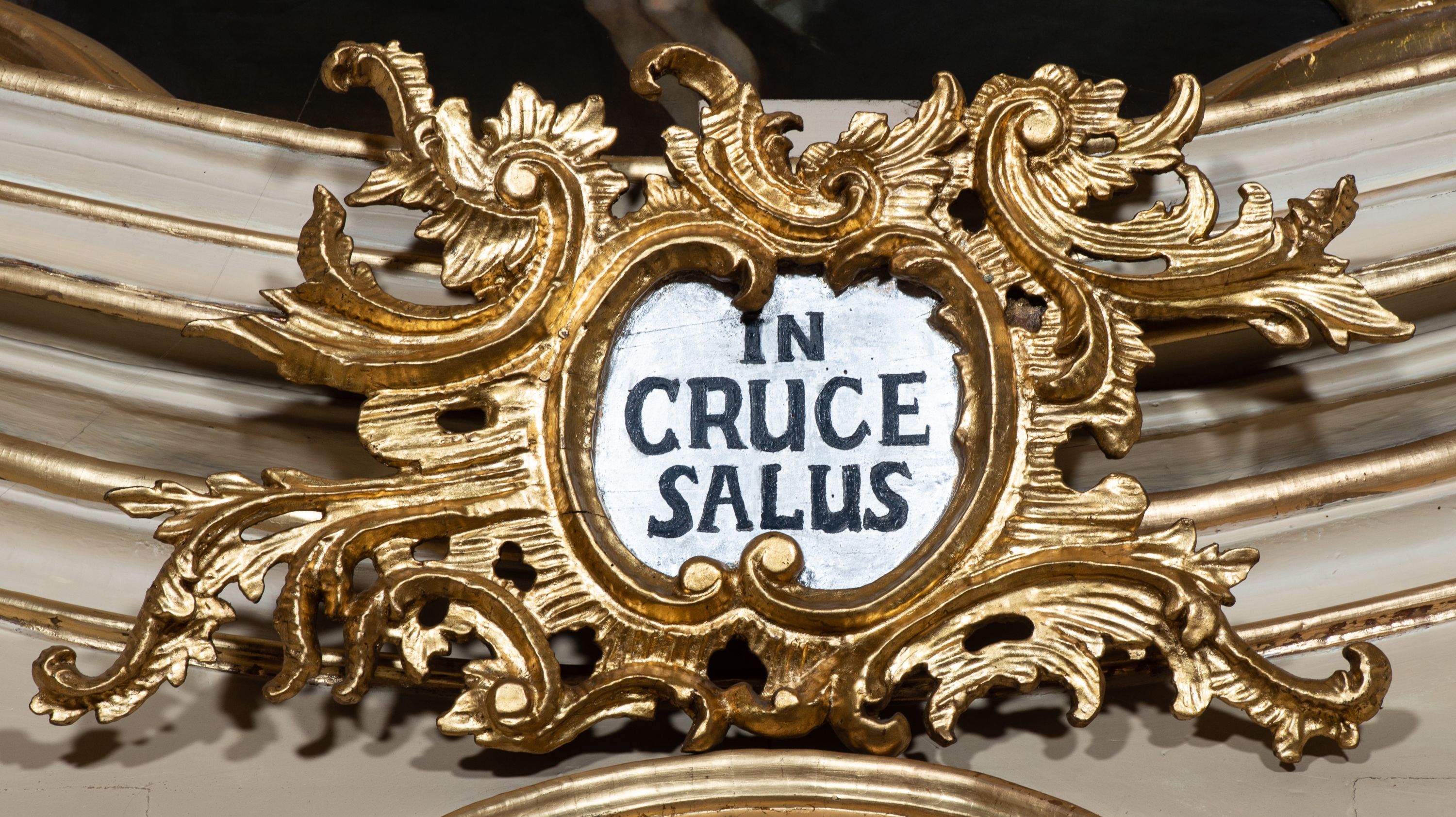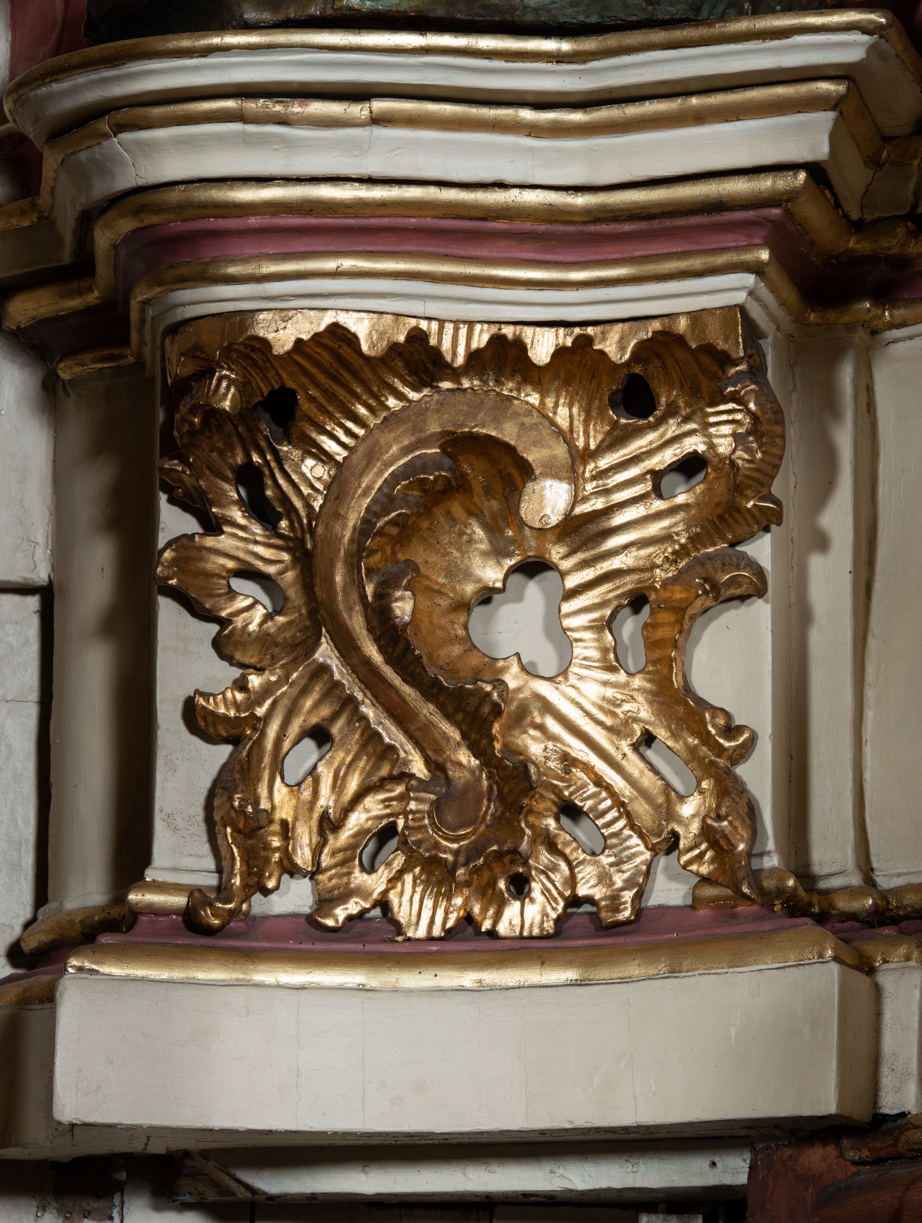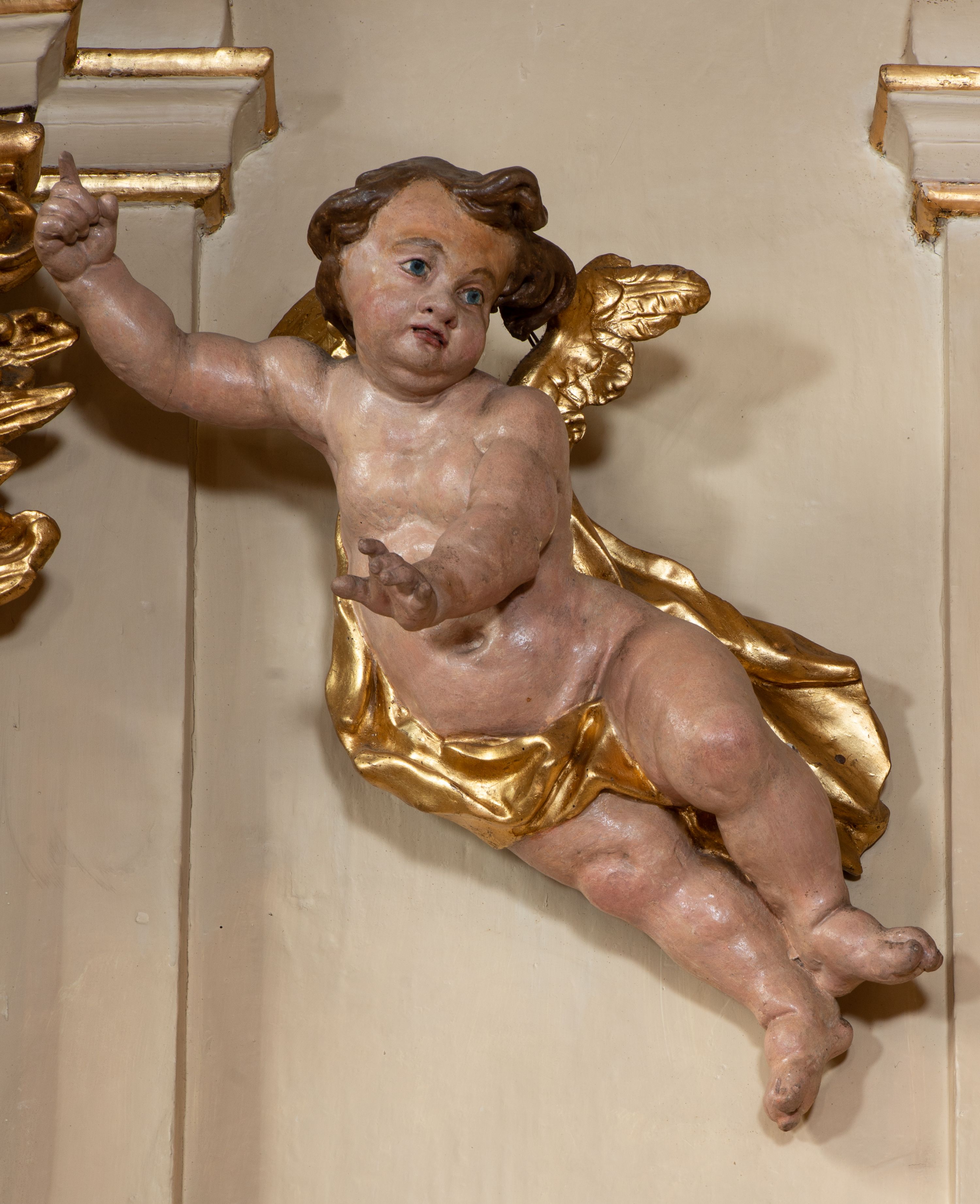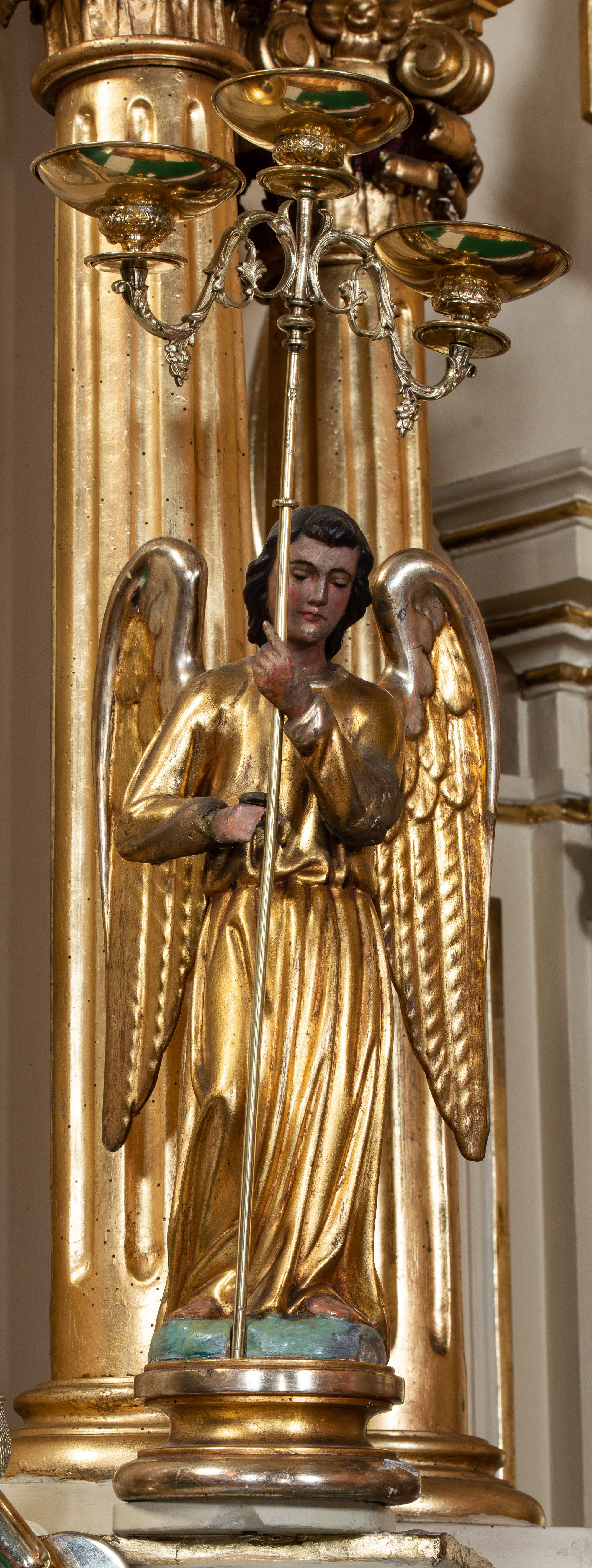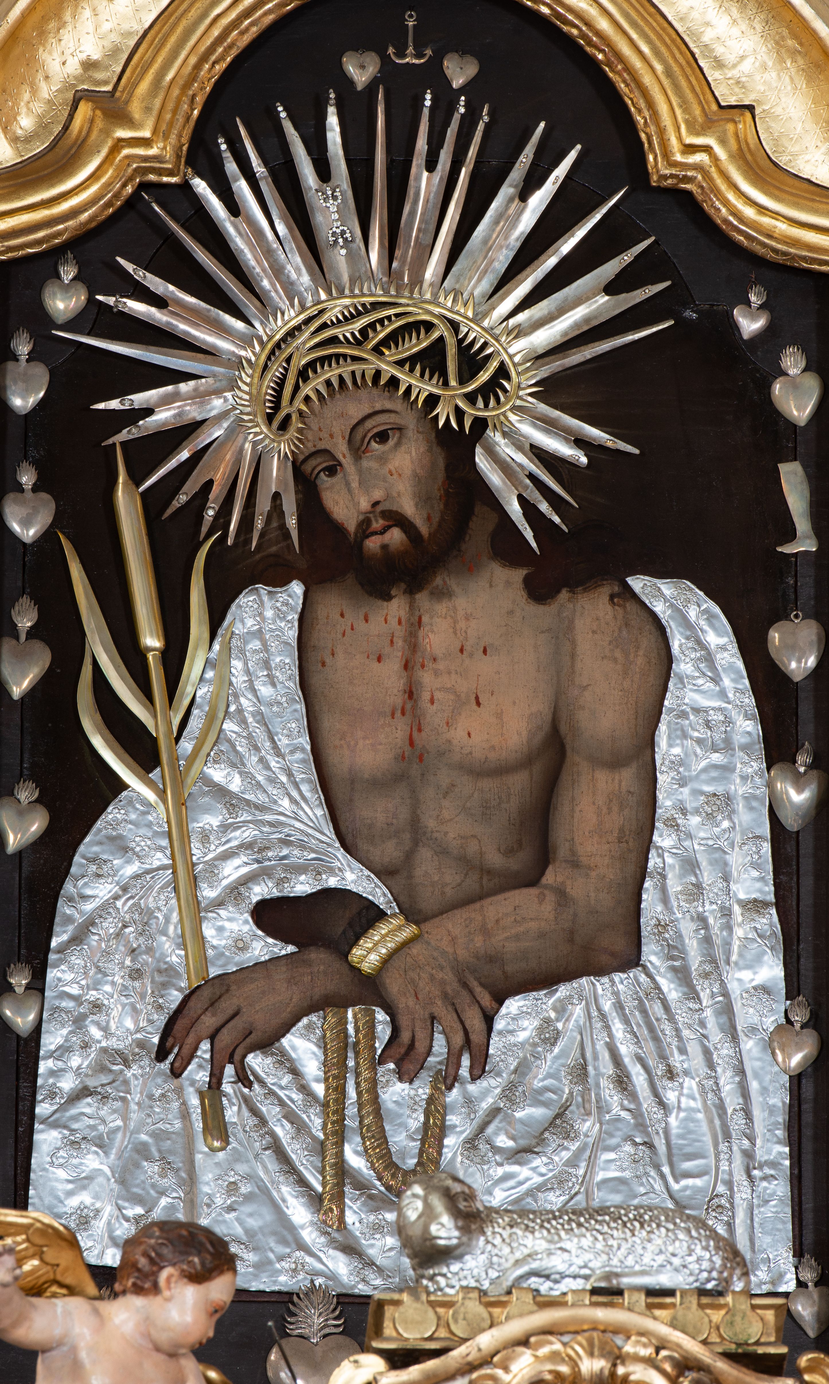 Pierwsza kondygnacja wydzielona czterema parami wklęsłych pilastrów o trzonach dekorowanych rocaille'em i zwisami kwiatowymi oraz stojącymi na ich tle dwiema parami kolumn o kapitelach kompozytowych. Podpory dźwigają niepełne belkowanie, przerwane nad polami kondygnacji, obniżone nad zewnętrzną parą kolumn. Na skrajnej partii cokołu nastawy karbowane woluty z fantazyjnymi gruszkowatymi cokołami podtrzymującymi rocaille'owe wazony. W polu środkowym głęboka wnęka w formie stojącego prostokąta zamkniętego łukiem odcinkowym podwójnie nadwieszonym z uskokiem, ujęta profilowaną ramą, z obrazem Ecce Homo w osobnej, podwójnej ramie. Nad nią kartusz rokokowy z napisem „In nomine Jesu / om(n)e Genu flec / tatur. ad Philipenses / Cap(ut) II”. Wnękę flankują figury Matki Boskiej i św. Marii Magdaleny ustawione na rocaille'owych konsolach. Na osiach bocznych figura Dawida i grupa ofiary Izaaka na cokołach z nadlatującymi puttami nad nimi. Druga kondygnacja flankowana trzema parami pilastrów o trzonach przechodzących w spływy wolutowe i osobne woluty, opadające na belkowanie pierwszej kondygnacji, na których siedzą putta i anioły trzymające kartusze z napisami: „ET / GLORIA” i „SOLI / DEO / HONOR”. Kondygnacja zamknięta profilowanym gzymsem wyłamanym na ich osi oraz załamanym w dół nad polem. Na gzymsie fragmenty przerwanego, falistego przyczółka, na których siedzą anioły. W polu obraz św. Macieja w formie zbliżonej do trapezu o dwóch wypukłych bokach, ujęty profilowaną ramą. Pole flankowane akantem, powyżej rocaille'owy kartusz z napisem: „IN / CRUCE / SALUS”. Zwieńczenie w formie zbliżonej do trapezu, o wklęsłych bokach, ujętych wolutami, zamknięte cęgowymi wolutami. W polu obraz Ukrzyżowania w formie zbliżonej do trapezu o dwóch wypukłych bokach, ujęty profilowaną ramą, flankowany akantem. Całość zamknięta płaskorzeźbionym przedstawieniem popiersia Boga Ojca oraz gołębicy Ducha Świętego w glorii, w otoku z obłoków i uskrzydlonych główek anielskich, w glorii promienistej, u dołu szarfa z napisem: „Hic est Filius meus dilectus in quo mihi bene complacui ipsum audite. Luc[a] XVII”. Struktura polichromowana w kolorze beżowym, dolna strefa cokołu brązowa, część trzonów pilastrów pomalowana na kolor jasnoróżowy; trzony kolumn, profile i ornamentyka złocone, detal srebrzony.