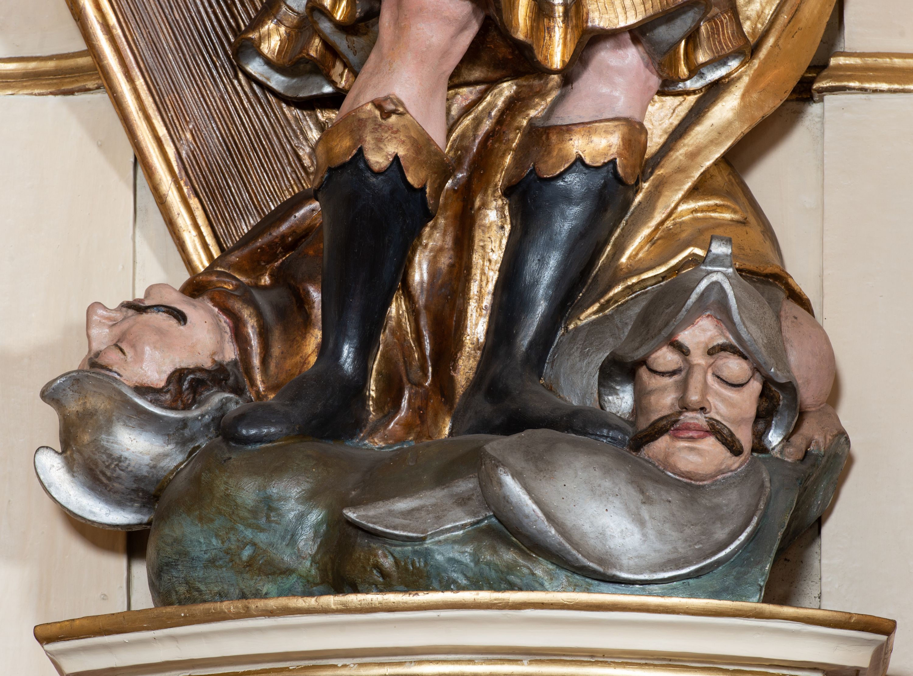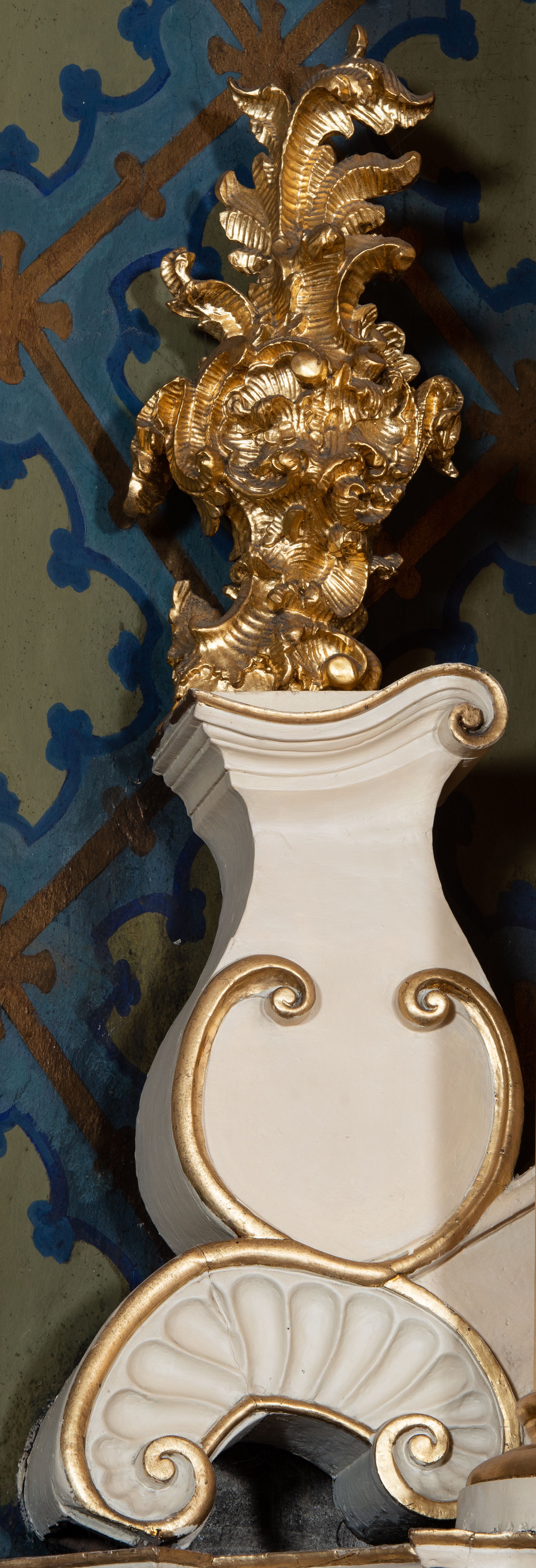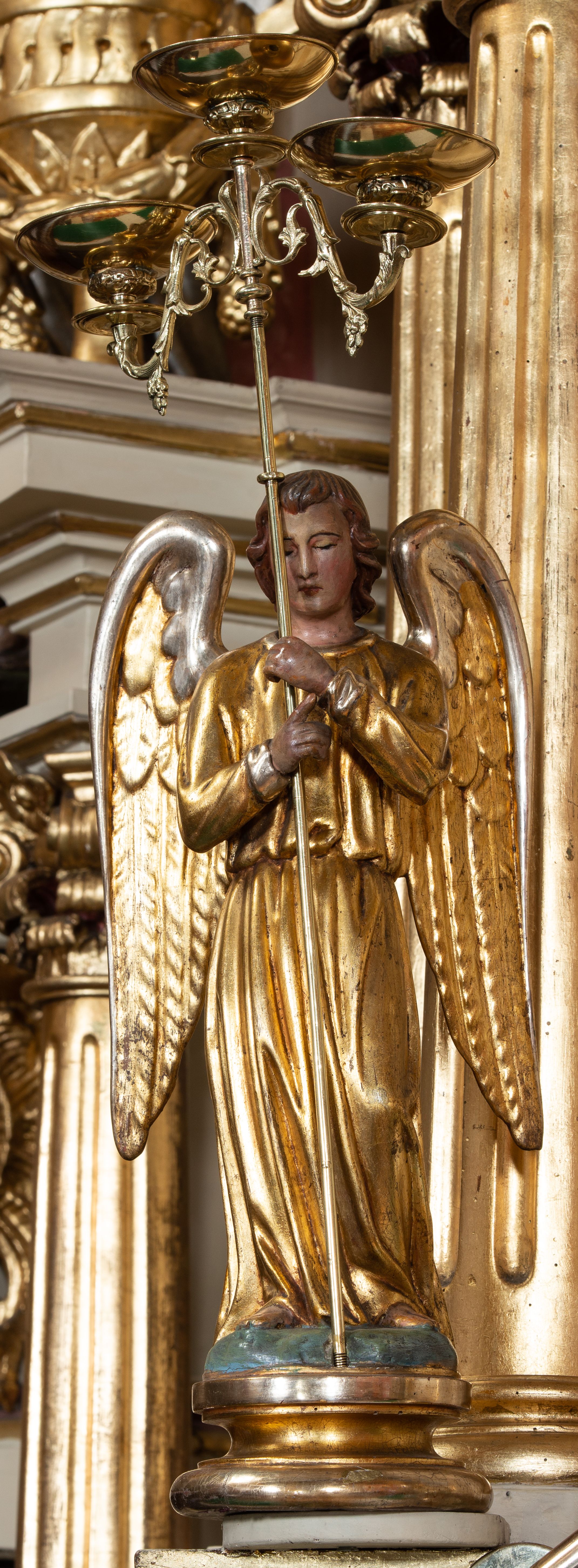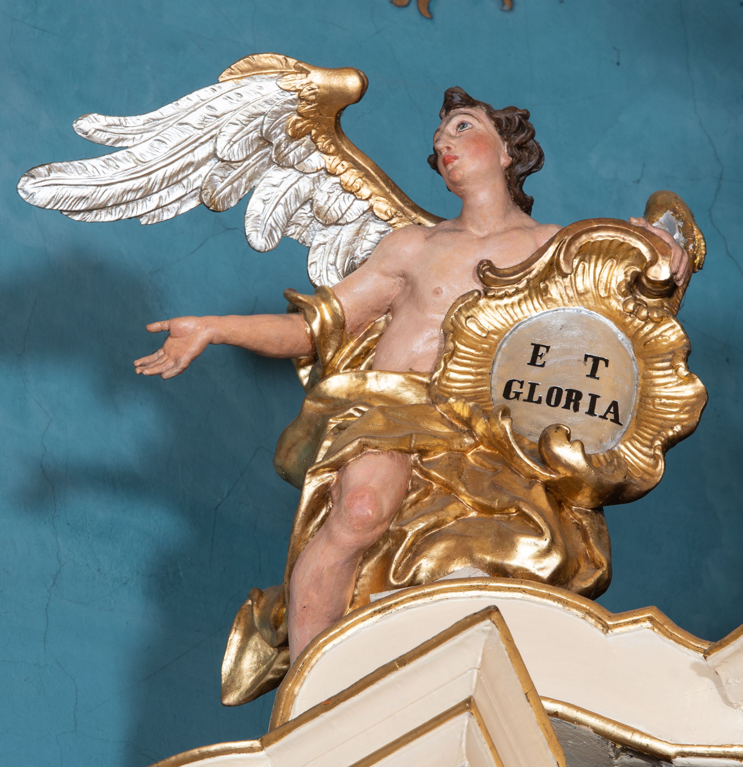 Pierwsza kondygnacja wydzielona czterema parami wklęsłych pilastrów o trzonach dekorowanych rocaille'em i zwisami kwiatowymi oraz stojącymi na ich tle dwiema parami kolumn o kapitelach kompozytowych. Podpory dźwigają niepełne belkowanie, przerwane nad polami kondygnacji, obniżone nad zewnętrzną parą kolumn. Na skrajnej partii cokołu nastawy karbowane woluty z fantazyjnymi gruszkowatymi cokołami podtrzymującymi rocaille'owe wazony. W polu środkowym głęboka wnęka w formie stojącego prostokąta zamkniętego łukiem odcinkowym podwójnie nadwieszonym z uskokiem, ujęta profilowaną ramą, z obrazem Ecce Homo w osobnej, podwójnej ramie. Nad nią kartusz rokokowy z napisem „In nomine Jesu / om(n)e Genu flec / tatur. ad Philipenses / Cap(ut) II”. Wnękę flankują figury Matki Boskiej i św. Marii Magdaleny ustawione na rocaille'owych konsolach. Na osiach bocznych figura Dawida i grupa ofiary Izaaka na cokołach z nadlatującymi puttami nad nimi. Druga kondygnacja flankowana trzema parami pilastrów o trzonach przechodzących w spływy wolutowe i osobne woluty, opadające na belkowanie pierwszej kondygnacji, na których siedzą putta i anioły trzymające kartusze z napisami: „ET / GLORIA” i „SOLI / DEO / HONOR”. Kondygnacja zamknięta profilowanym gzymsem wyłamanym na ich osi oraz załamanym w dół nad polem. Na gzymsie fragmenty przerwanego, falistego przyczółka, na których siedzą anioły. W polu obraz św. Macieja w formie zbliżonej do trapezu o dwóch wypukłych bokach, ujęty profilowaną ramą. Pole flankowane akantem, powyżej rocaille'owy kartusz z napisem: „IN / CRUCE / SALUS”. Zwieńczenie w formie zbliżonej do trapezu, o wklęsłych bokach, ujętych wolutami, zamknięte cęgowymi wolutami. W polu obraz Ukrzyżowania w formie zbliżonej do trapezu o dwóch wypukłych bokach, ujęty profilowaną ramą, flankowany akantem. Całość zamknięta płaskorzeźbionym przedstawieniem popiersia Boga Ojca oraz gołębicy Ducha Świętego w glorii, w otoku z obłoków i uskrzydlonych główek anielskich, w glorii promienistej, u dołu szarfa z napisem: „Hic est Filius meus dilectus in quo mihi bene complacui ipsum audite. Luc[a] XVII”. Struktura polichromowana w kolorze beżowym, dolna strefa cokołu brązowa, część trzonów pilastrów pomalowana na kolor jasnoróżowy; trzony kolumn, profile i ornamentyka złocone, detal srebrzony.