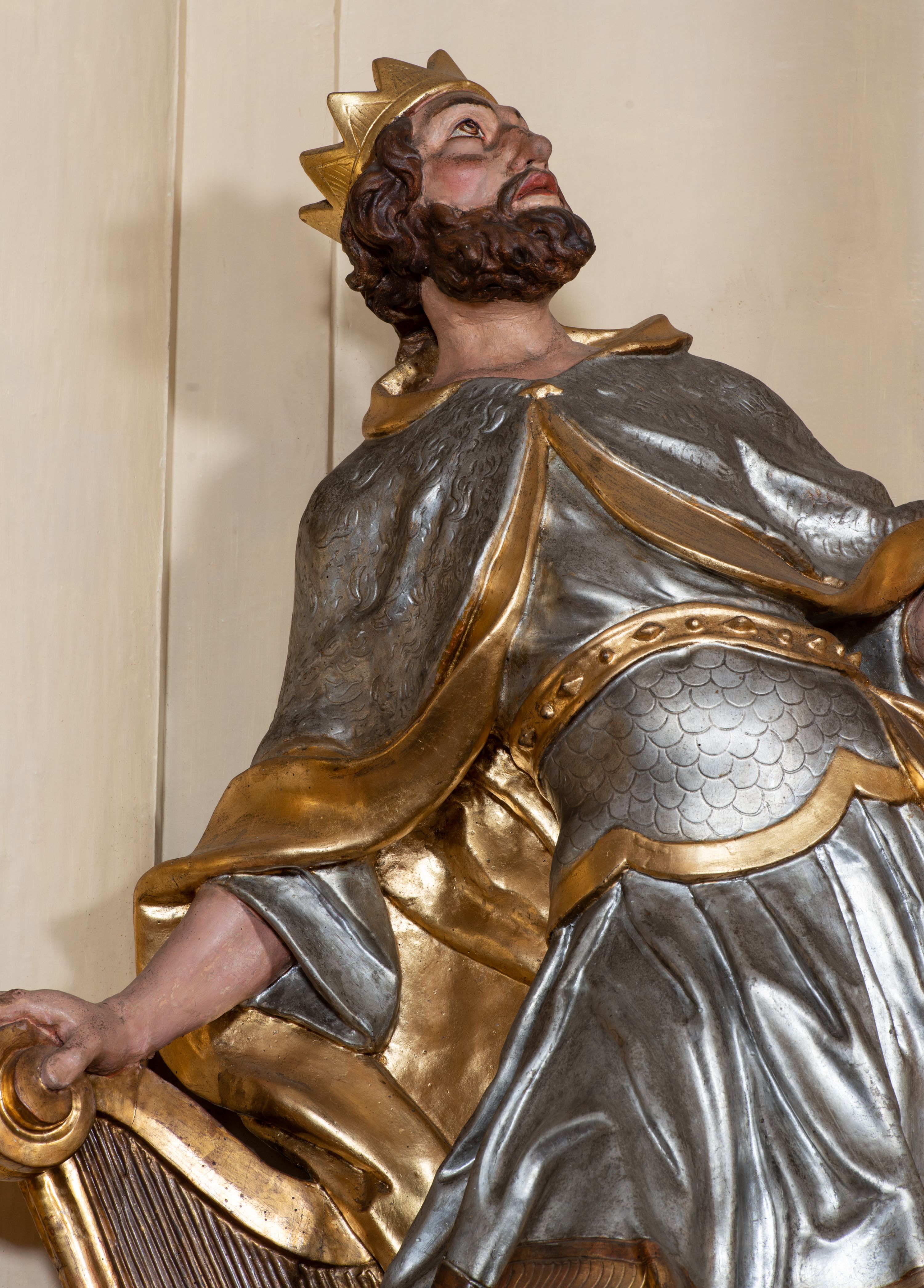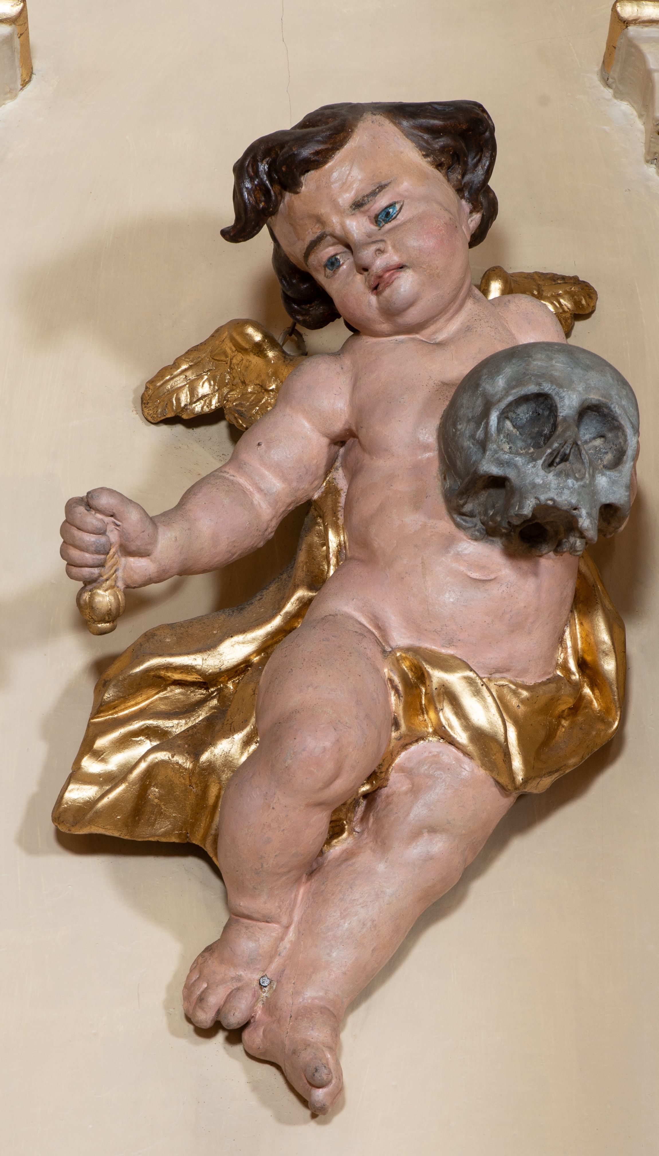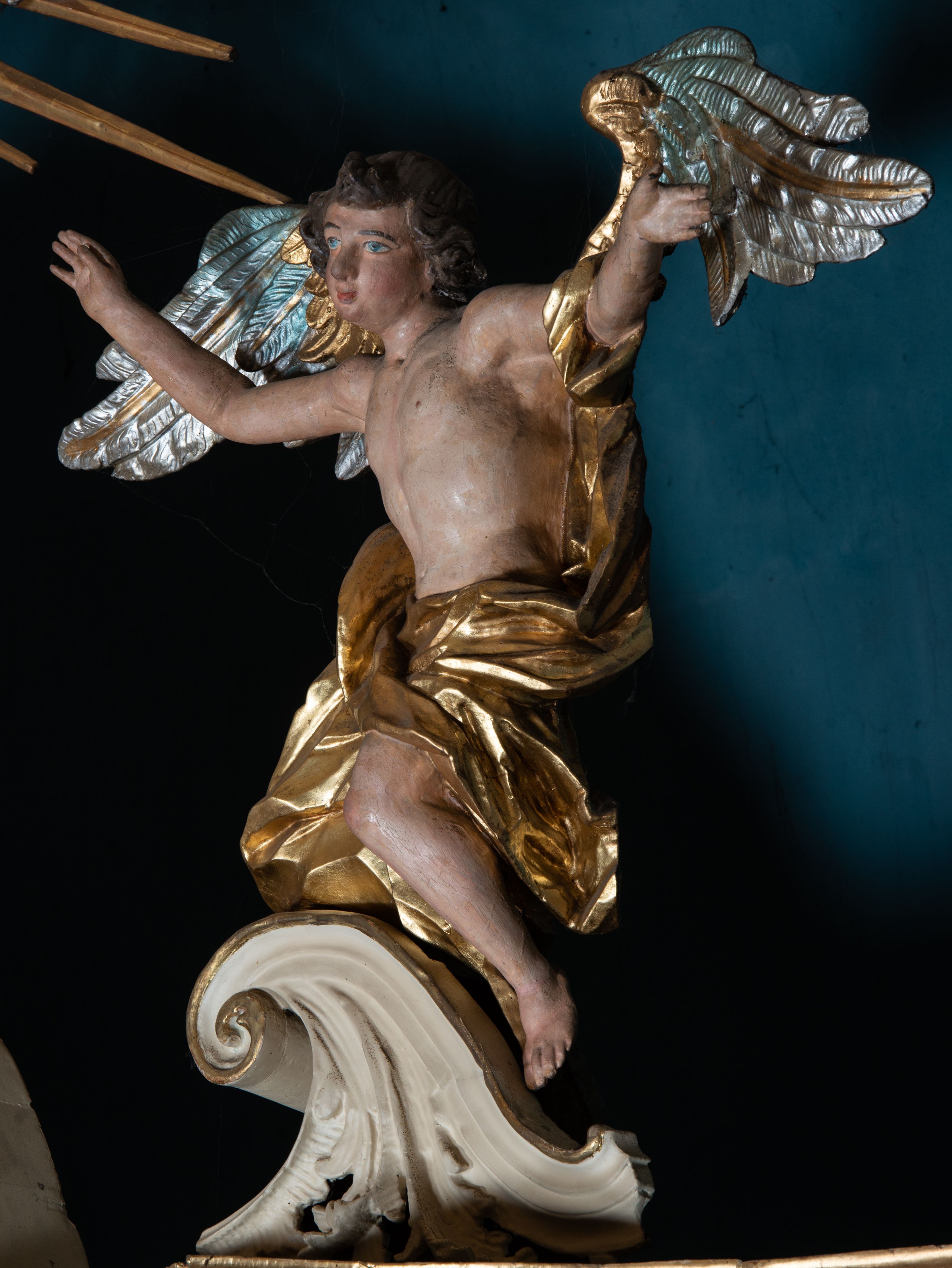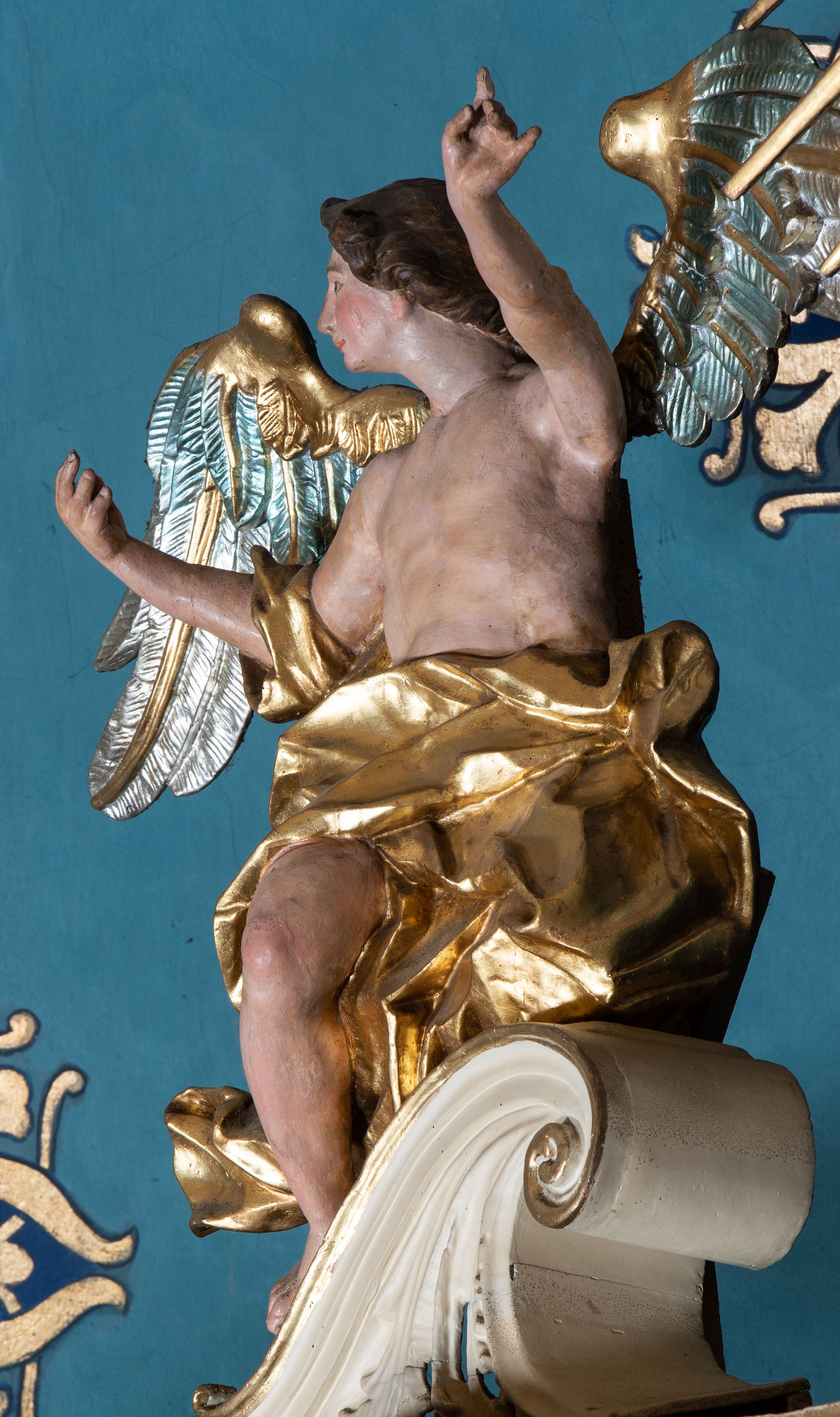 Pierwsza kondygnacja wydzielona czterema parami wklęsłych pilastrów o trzonach dekorowanych rocaille'em i zwisami kwiatowymi oraz stojącymi na ich tle dwiema parami kolumn o kapitelach kompozytowych. Podpory dźwigają niepełne belkowanie, przerwane nad polami kondygnacji, obniżone nad zewnętrzną parą kolumn. Na skrajnej partii cokołu nastawy karbowane woluty z fantazyjnymi gruszkowatymi cokołami podtrzymującymi rocaille'owe wazony. W polu środkowym głęboka wnęka w formie stojącego prostokąta zamkniętego łukiem odcinkowym podwójnie nadwieszonym z uskokiem, ujęta profilowaną ramą, z obrazem Ecce Homo w osobnej, podwójnej ramie. Nad nią kartusz rokokowy z napisem „In nomine Jesu / om(n)e Genu flec / tatur. ad Philipenses / Cap(ut) II”. Wnękę flankują figury Matki Boskiej i św. Marii Magdaleny ustawione na rocaille'owych konsolach. Na osiach bocznych figura Dawida i grupa ofiary Izaaka na cokołach z nadlatującymi puttami nad nimi. Druga kondygnacja flankowana trzema parami pilastrów o trzonach przechodzących w spływy wolutowe i osobne woluty, opadające na belkowanie pierwszej kondygnacji, na których siedzą putta i anioły trzymające kartusze z napisami: „ET / GLORIA” i „SOLI / DEO / HONOR”. Kondygnacja zamknięta profilowanym gzymsem wyłamanym na ich osi oraz załamanym w dół nad polem. Na gzymsie fragmenty przerwanego, falistego przyczółka, na których siedzą anioły. W polu obraz św. Macieja w formie zbliżonej do trapezu o dwóch wypukłych bokach, ujęty profilowaną ramą. Pole flankowane akantem, powyżej rocaille'owy kartusz z napisem: „IN / CRUCE / SALUS”. Zwieńczenie w formie zbliżonej do trapezu, o wklęsłych bokach, ujętych wolutami, zamknięte cęgowymi wolutami. W polu obraz Ukrzyżowania w formie zbliżonej do trapezu o dwóch wypukłych bokach, ujęty profilowaną ramą, flankowany akantem. Całość zamknięta płaskorzeźbionym przedstawieniem popiersia Boga Ojca oraz gołębicy Ducha Świętego w glorii, w otoku z obłoków i uskrzydlonych główek anielskich, w glorii promienistej, u dołu szarfa z napisem: „Hic est Filius meus dilectus in quo mihi bene complacui ipsum audite. Luc[a] XVII”. Struktura polichromowana w kolorze beżowym, dolna strefa cokołu brązowa, część trzonów pilastrów pomalowana na kolor jasnoróżowy; trzony kolumn, profile i ornamentyka złocone, detal srebrzony.