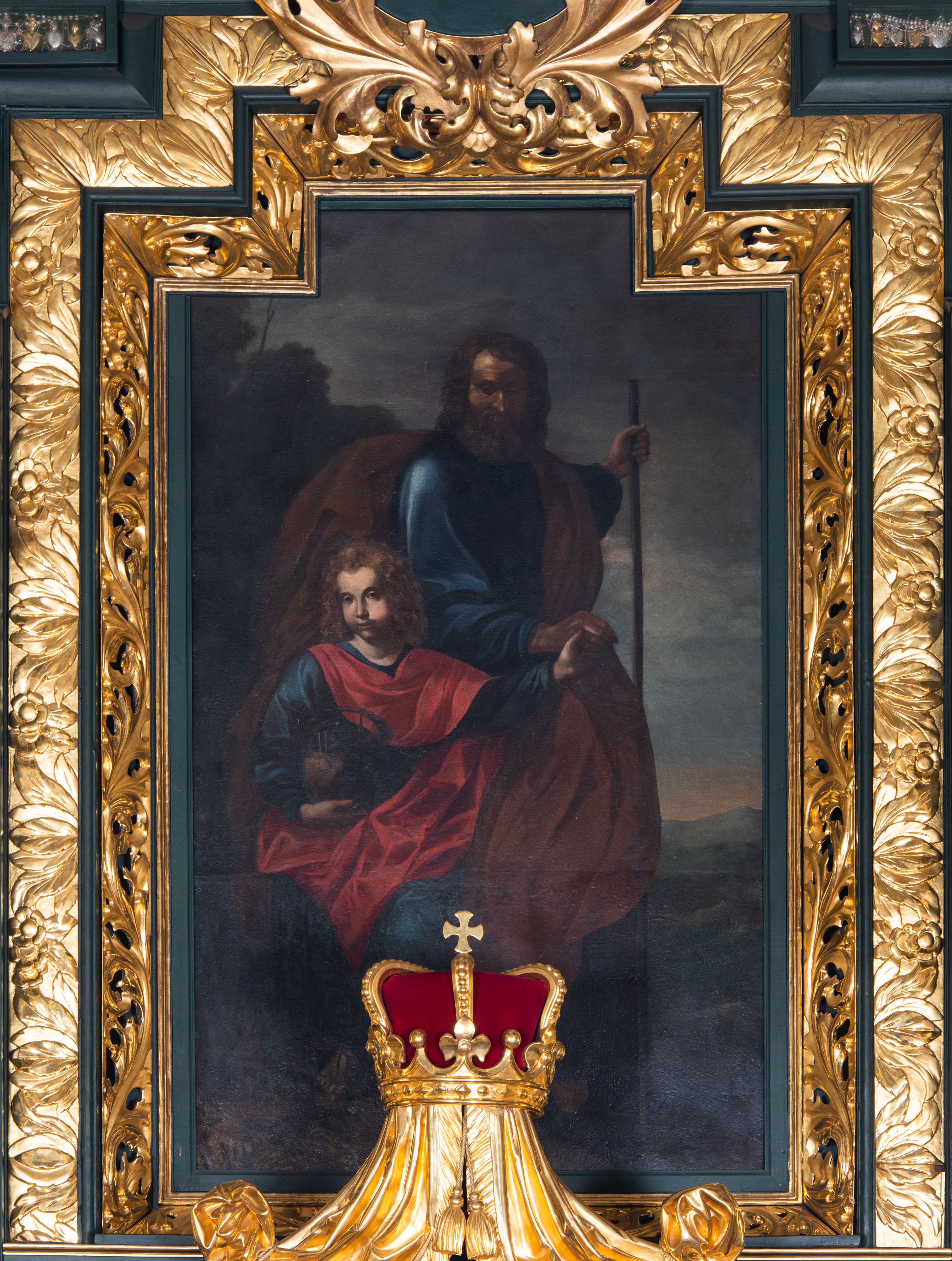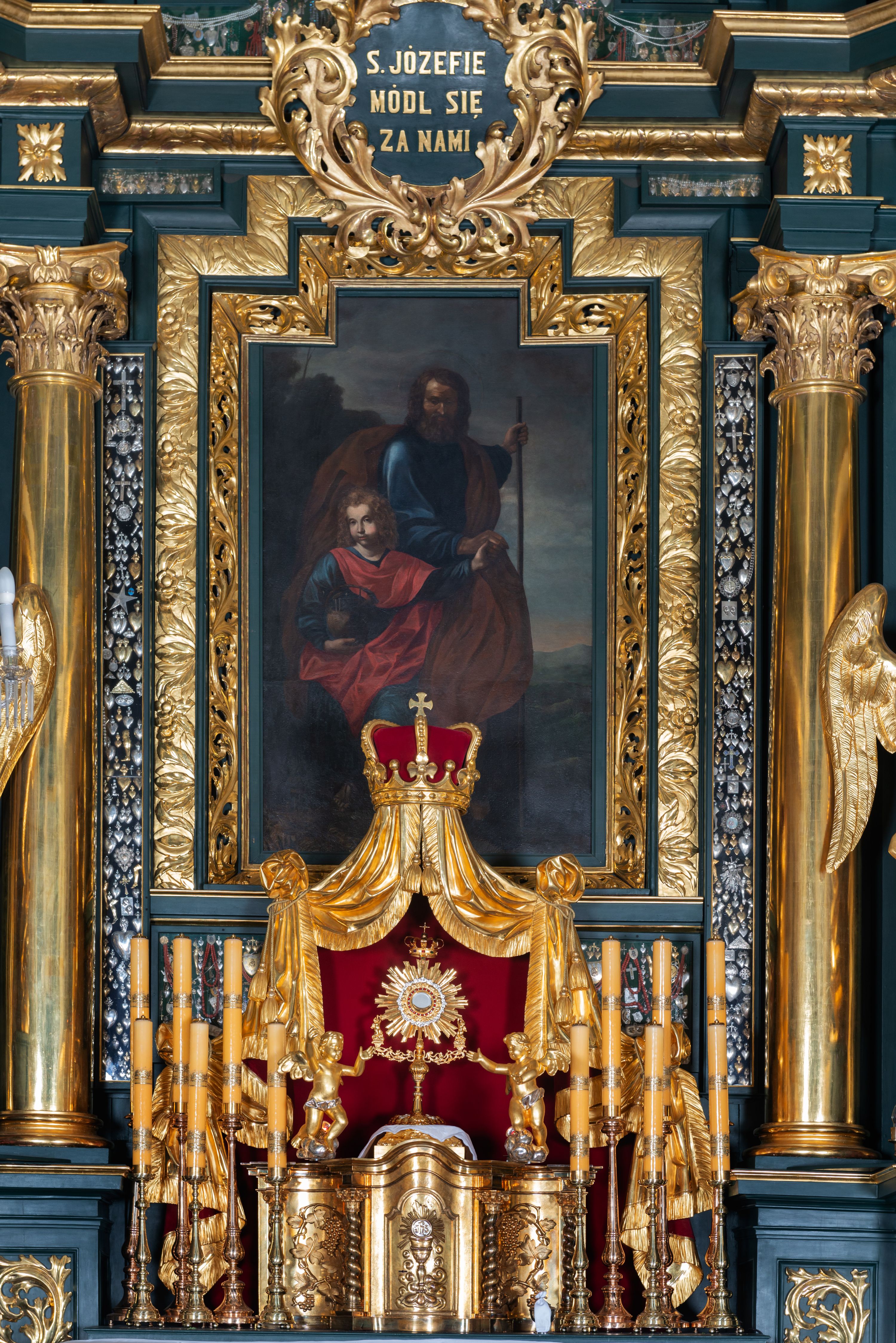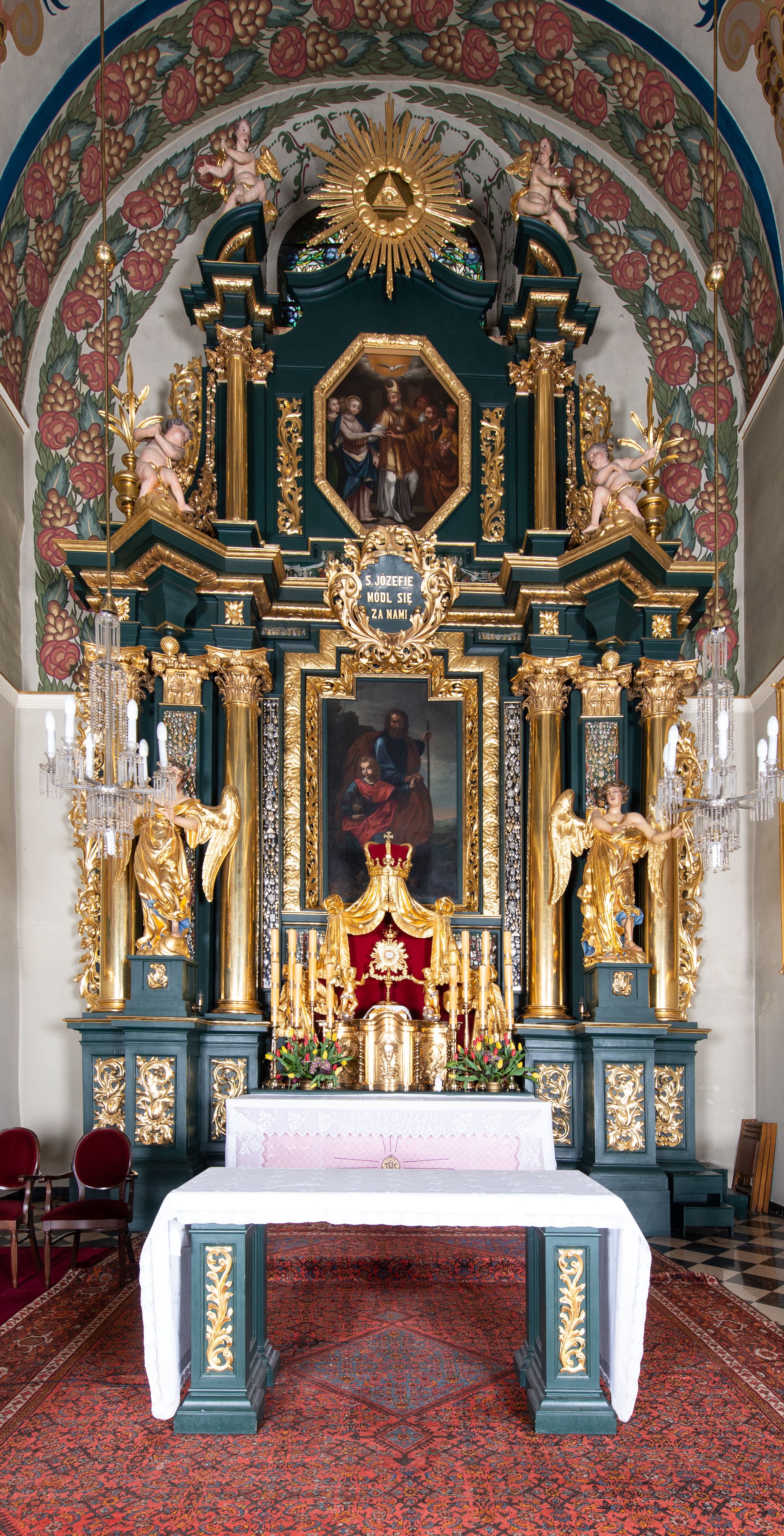Cokół dekorowany płycinami wypełnionymi suchym akantem. Pierwsza kondygnacja nastawy ujęta dwiema parami kolumn o kapitelach kompozytowych oraz stojącą między nimi parą pilastrów, w których trzonach znajdują się gabloty na wota. Przed pilastrami na cokołach ustawione dwie figury aniołów. Podpory dźwigają pełne belkowanie, przerwane w partii architrawu i fryzu nad polem środkowym, wyłamane na osi kolumn, na osi pilastrów belkowanie wyłamane pod kątem, w formie impostu z podwieszonymi szyszkami. Na belkowaniu, na obłokach dwie figurki adorujących puttów oraz dwa wazony na cokołach. W polu środkowym wnęka w formie stojącego prostokąta o wciętych górnych narożach, ujęta podwójną ramą, dekorowaną ornamentem roślinnym, z obrazem św. Józefa. Wnęka otoczona z trzech stron gablotami z wotami. Nad nią, w polu belkowania kartusz utworzony z suchego akantu z napisem w polu: „ŚW(IĘTY) JÓZEFIE / MÓDL SIĘ / ZA NAMI”. Druga kondygnacja o szerokości osi środkowej, ustawiona na cokole z wyodrębnionymi prostopadłościanami oraz gablotą z wotami, ujęta dwiema parami pilastrów i spływami wolutowymi oraz stojącą przed nimi parą kolumn, dźwigających zdwojone imposty oraz fragmenty przerwanego, półkolistego przyczółka z siedzącymi puttami. Spływy zdobione festonami utworzonymi z wstęgi oraz kwiatów. Całość zamknięta fragmentem falistego gzymsu oraz Okiem Opatrzności w glorii promienistej. W polu obraz Zaślubin Marii ze św. Józefem w formie stojącego prostokąta o ściętych narożach, ujęty ramą dekorowaną ornamentem roślinnym. Flankowany dwiema prostokątnymi płycinami wypełnionymi akantem. Obie kondygnacje ujęte uszami utworzonymi z suchego akantu. Struktura polichromowana w kolorze zielonym, kolumny, ornamentyka i profile złocone.