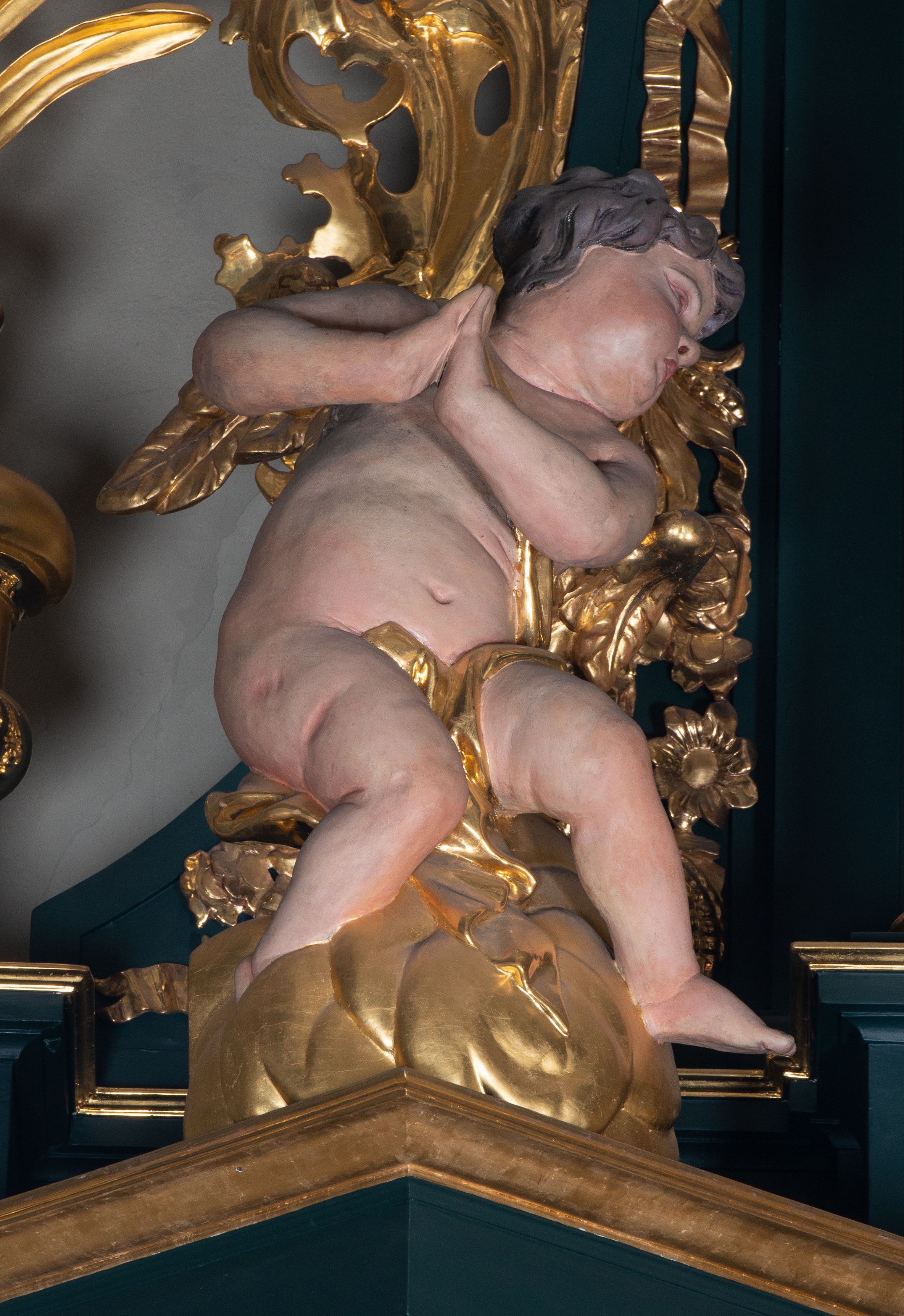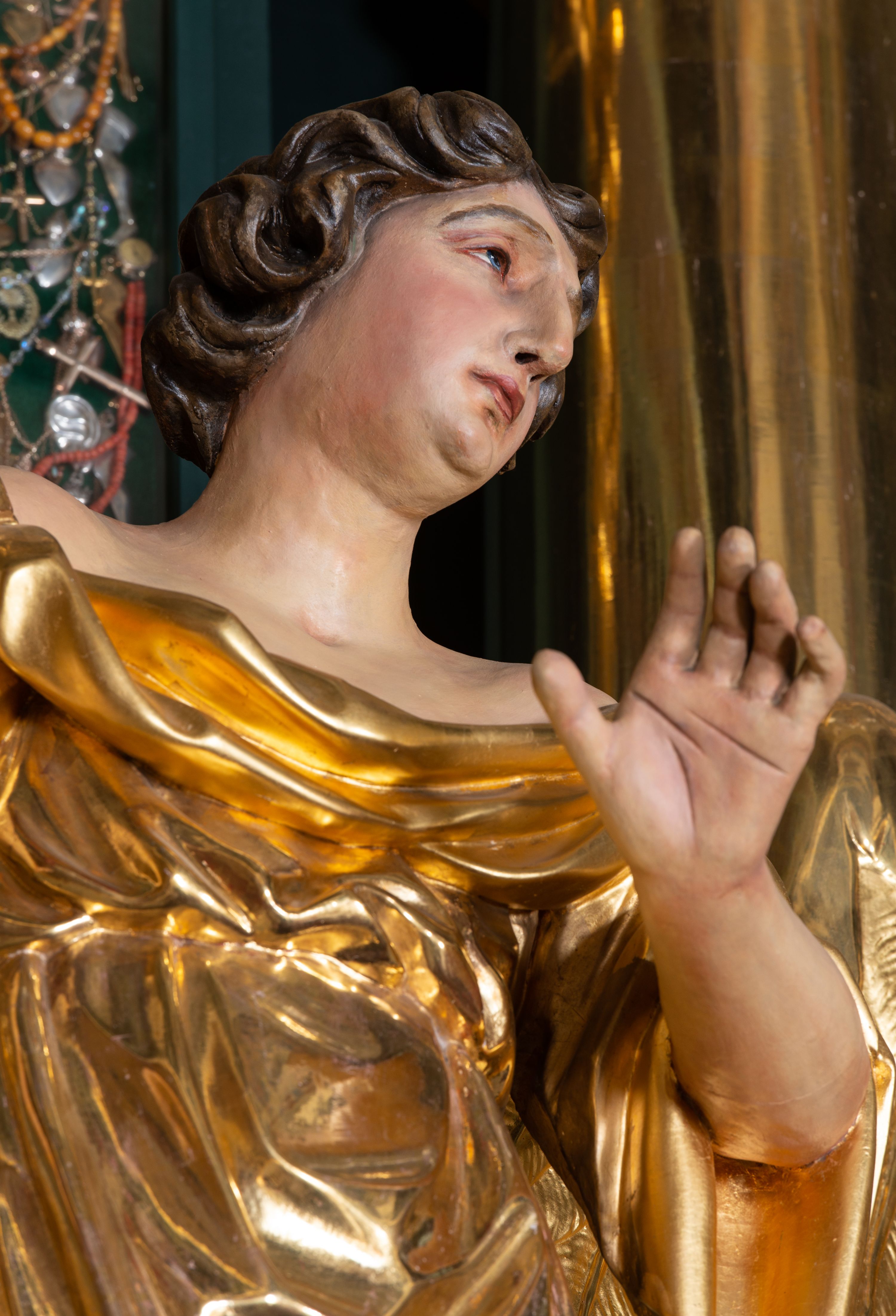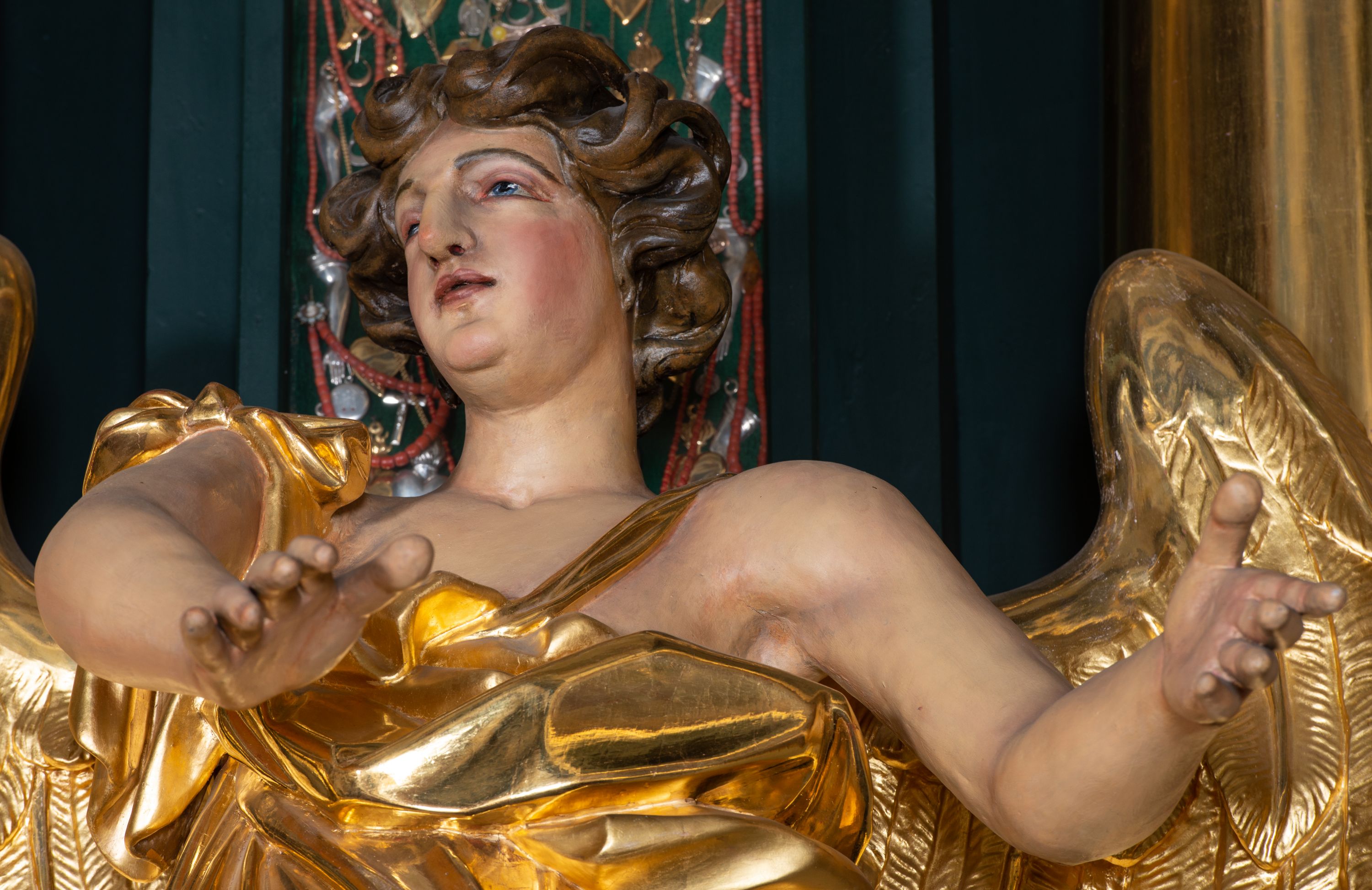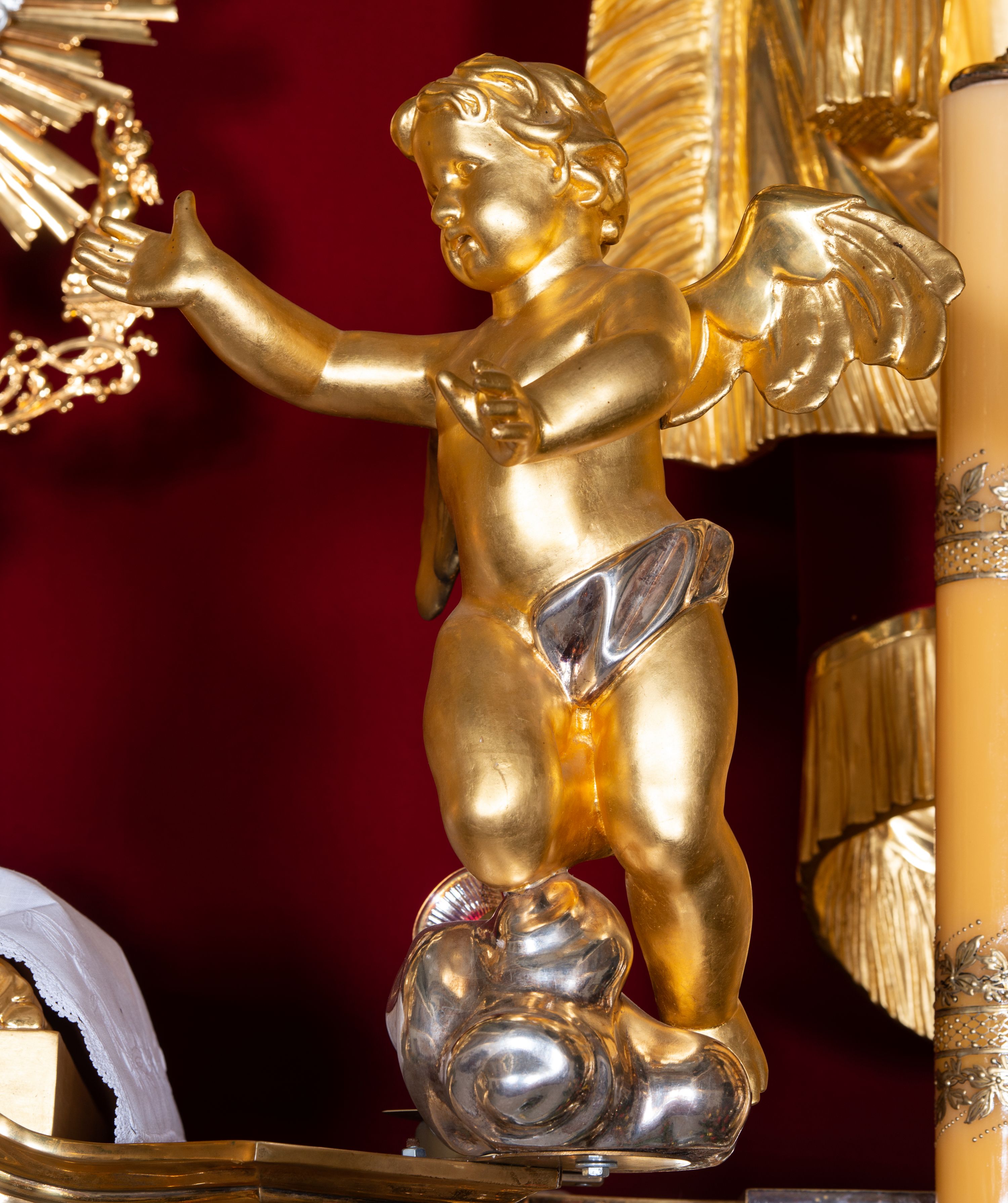 Cokół dekorowany płycinami wypełnionymi suchym akantem. Pierwsza kondygnacja nastawy ujęta dwiema parami kolumn o kapitelach kompozytowych oraz stojącą między nimi parą pilastrów, w których trzonach znajdują się gabloty na wota. Przed pilastrami na cokołach ustawione dwie figury aniołów. Podpory dźwigają pełne belkowanie, przerwane w partii architrawu i fryzu nad polem środkowym, wyłamane na osi kolumn, na osi pilastrów belkowanie wyłamane pod kątem, w formie impostu z podwieszonymi szyszkami. Na belkowaniu, na obłokach dwie figurki adorujących puttów oraz dwa wazony na cokołach. W polu środkowym wnęka w formie stojącego prostokąta o wciętych górnych narożach, ujęta podwójną ramą, dekorowaną ornamentem roślinnym, z obrazem św. Józefa. Wnęka otoczona z trzech stron gablotami z wotami. Nad nią, w polu belkowania kartusz utworzony z suchego akantu z napisem w polu: „ŚW(IĘTY) JÓZEFIE / MÓDL SIĘ / ZA NAMI”. Druga kondygnacja o szerokości osi środkowej, ustawiona na cokole z wyodrębnionymi prostopadłościanami oraz gablotą z wotami, ujęta dwiema parami pilastrów i spływami wolutowymi oraz stojącą przed nimi parą kolumn, dźwigających zdwojone imposty oraz fragmenty przerwanego, półkolistego przyczółka z siedzącymi puttami. Spływy zdobione festonami utworzonymi z wstęgi oraz kwiatów. Całość zamknięta fragmentem falistego gzymsu oraz Okiem Opatrzności w glorii promienistej. W polu obraz Zaślubin Marii ze św. Józefem w formie stojącego prostokąta o ściętych narożach, ujęty ramą dekorowaną ornamentem roślinnym. Flankowany dwiema prostokątnymi płycinami wypełnionymi akantem. Obie kondygnacje ujęte uszami utworzonymi z suchego akantu. Struktura polichromowana w kolorze zielonym, kolumny, ornamentyka i profile złocone.