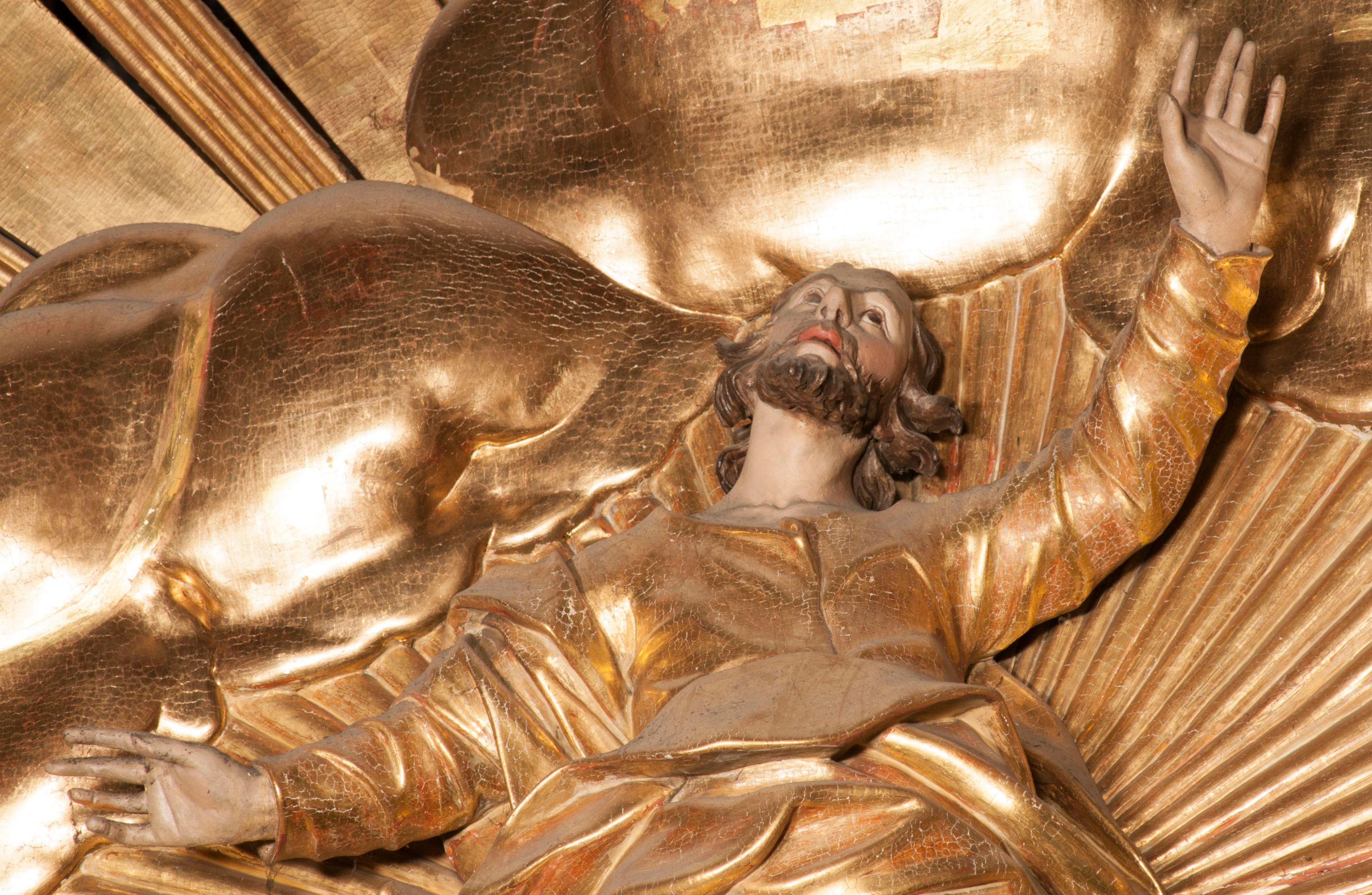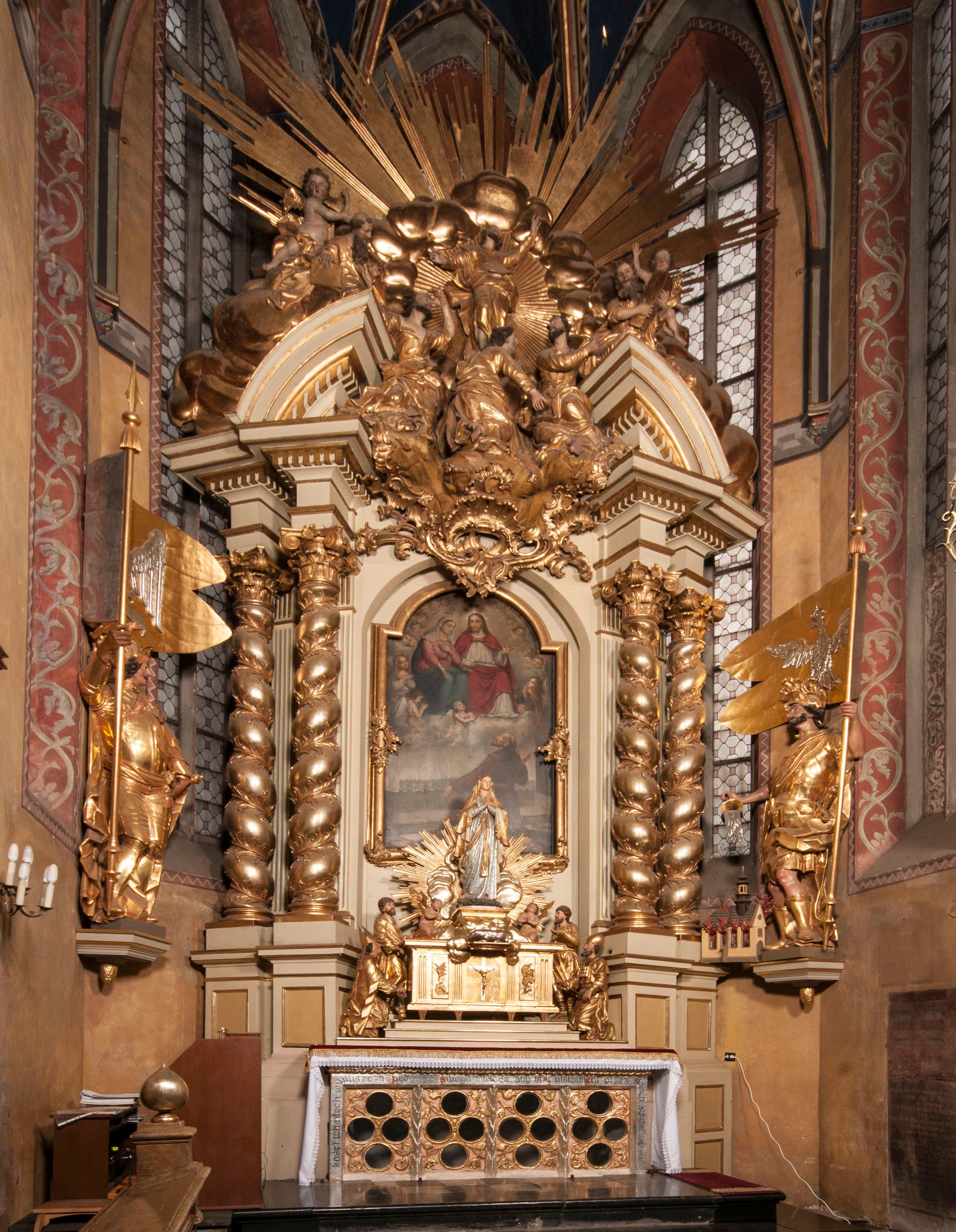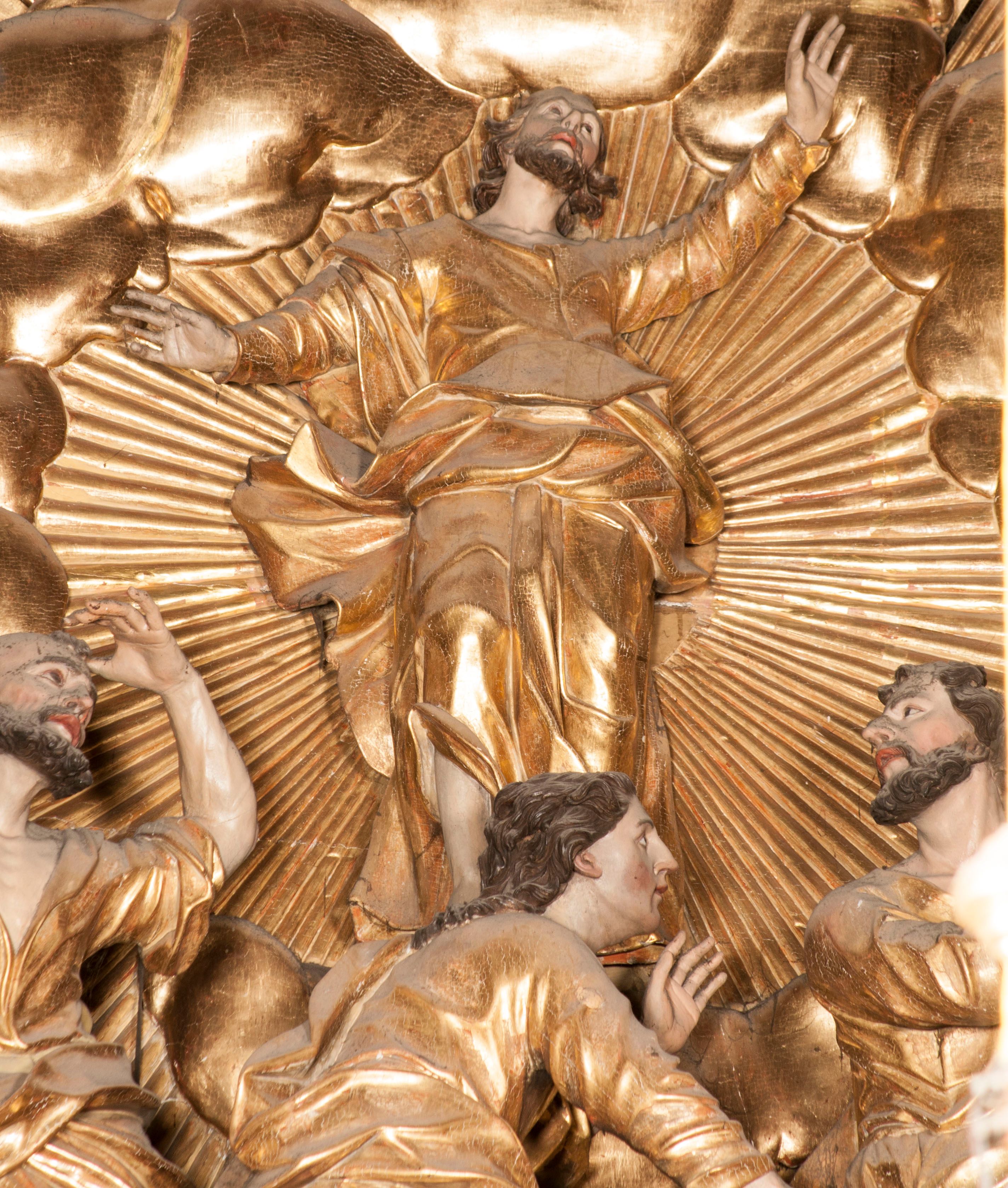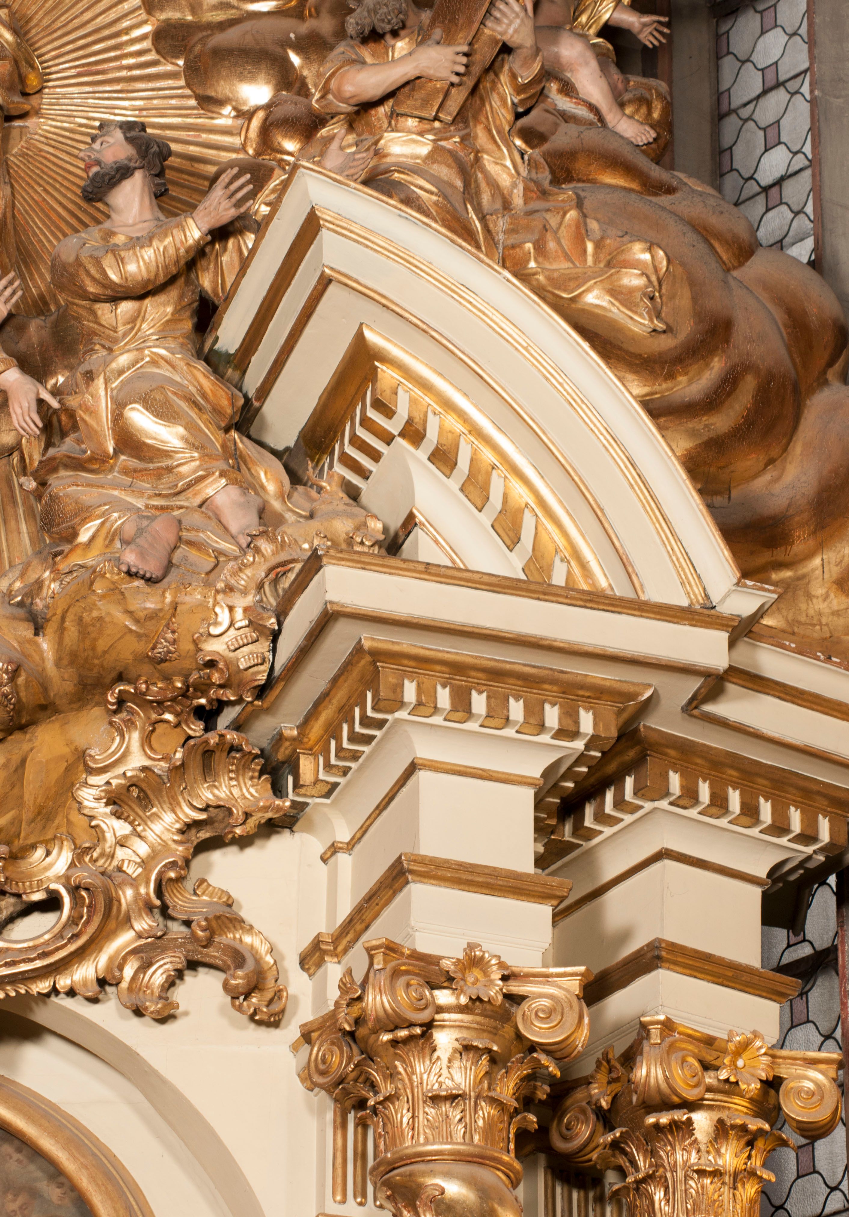 W partii belkowania nad polem głównym, na rzeźbionej skale podtrzymywanej przez rocaille klęczące postacie św. Piotra, św. Jana i św. Jakuba w dynamicznych pozach. Nad nimi unosi się Chrystus w otoku z obłoków i glorii, flankowany przez figury Mojżesza i Eliasza klęczące na przerwanym przyczółku, za nimi nadlatujące putta na obłokach. Po lewej stronie Piotr klęczący frontalnie z uniesionymi rękami. Obok niego klęczący św. Jan zwrócony profilem w lewo, z rękami wyciągniętymi w przód, o młodzieńczych rysach i długich, kręconych włosach. Święty Jakub po prawej stronie, w pozycji siedzącej, zwrócony w trzech czwartych w prawo z rękami wyciągniętymi w lewo. Wszyscy ubrani w przylegające do ciała tuniki oraz płaszcze przepasane w partii nóg. Nad nimi Chrystus w pozycji stojącej, frontalnie, w kontrapoście, z uniesioną głową i rękami rozłożonymi na boki, ubrany jest w tunikę oraz płaszcz przewiązany przez lewe ramię i wokół nóg. Na lewym fragmencie przyczółka klęczy Eliasz, zwrócony w trzech czwartych w lewo, pochylony, prawą ręką przytrzymuje na boku księgę, lewą wyciąga w przód. Ubrany jest w tunikę oraz rozwiany płaszcz. Na prawym fragmencie przyczółka klęczy Mojżesz, zwrócony w trzech czwartych w prawo, z pochylona głową, obiema rękami trzyma tablice przykazań. Ubrany jest w tunikę o krótkich rękawach oraz płaszcz zawinięty na lewym ramieniu i opadający na nogi. Obaj prorocy ukazani jako starcy. Nastawa flankowana dwoma wspornikami z figurami św. Wacława i św. Floriana. Struktura polichromowana w kolorze beżowym z żółtymi detalami oraz złoconymi profilami, ornamentyką i zwieńczeniem. Figury w partii ciała polichromowane naturalistycznie z brązowymi włosami i brodami oraz złoconymi szatami i atrybutami.