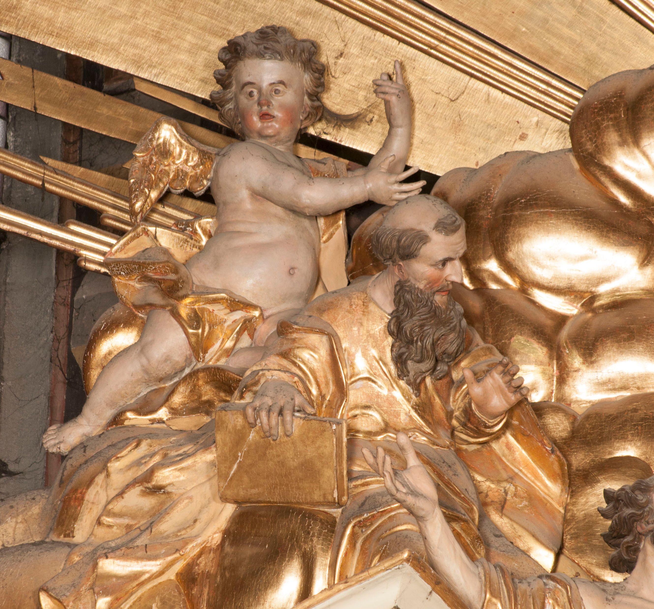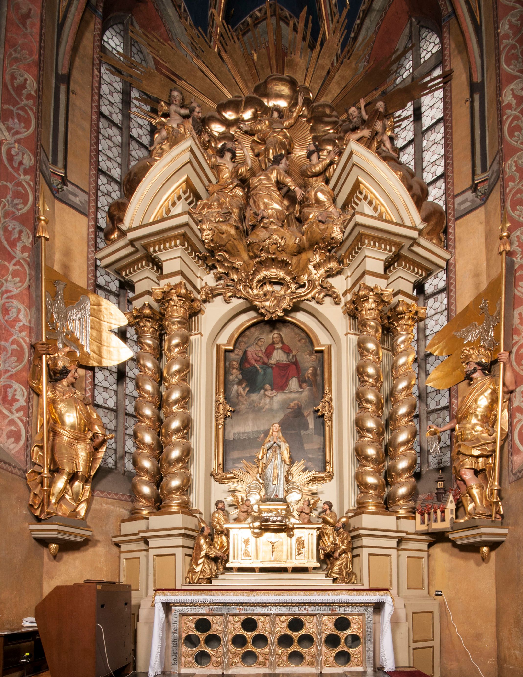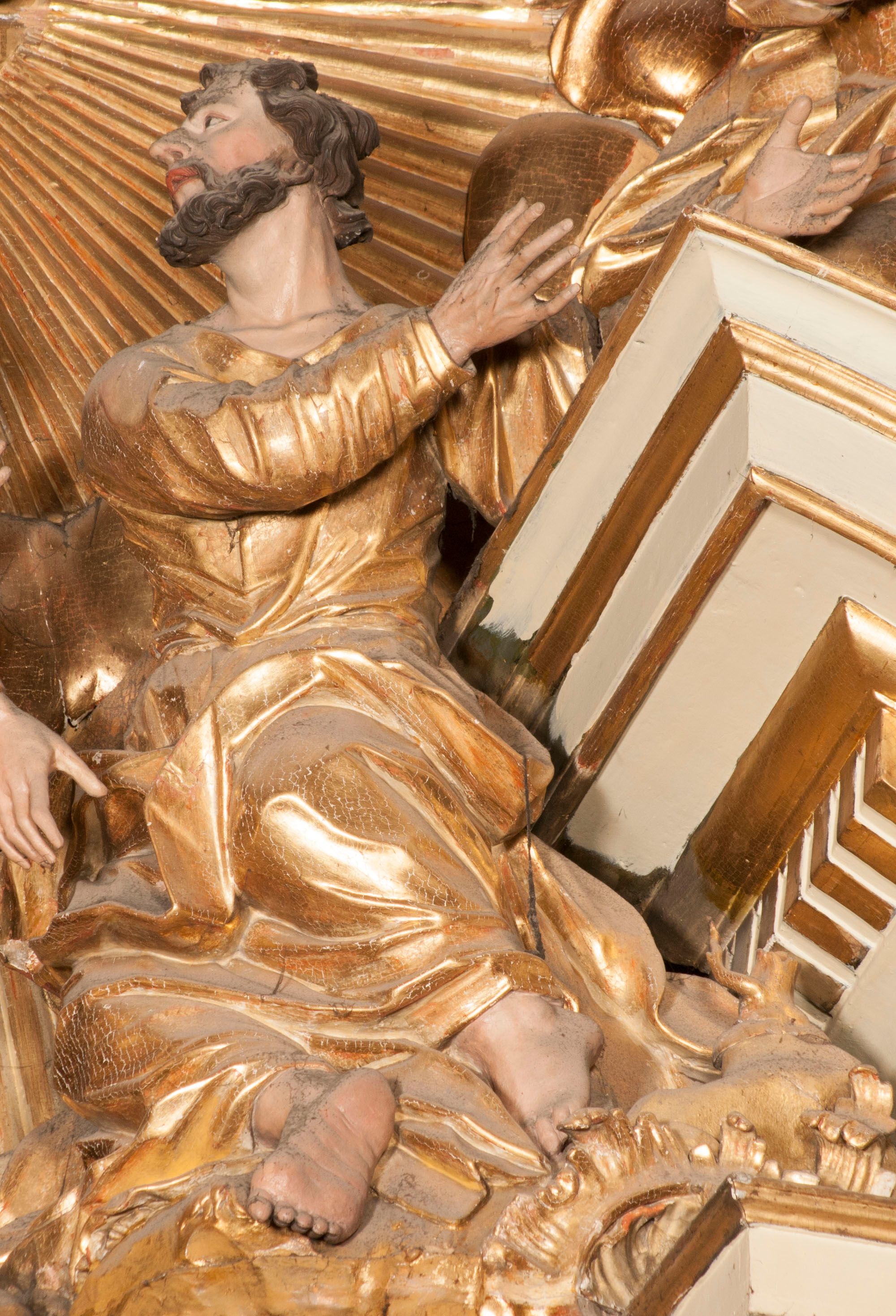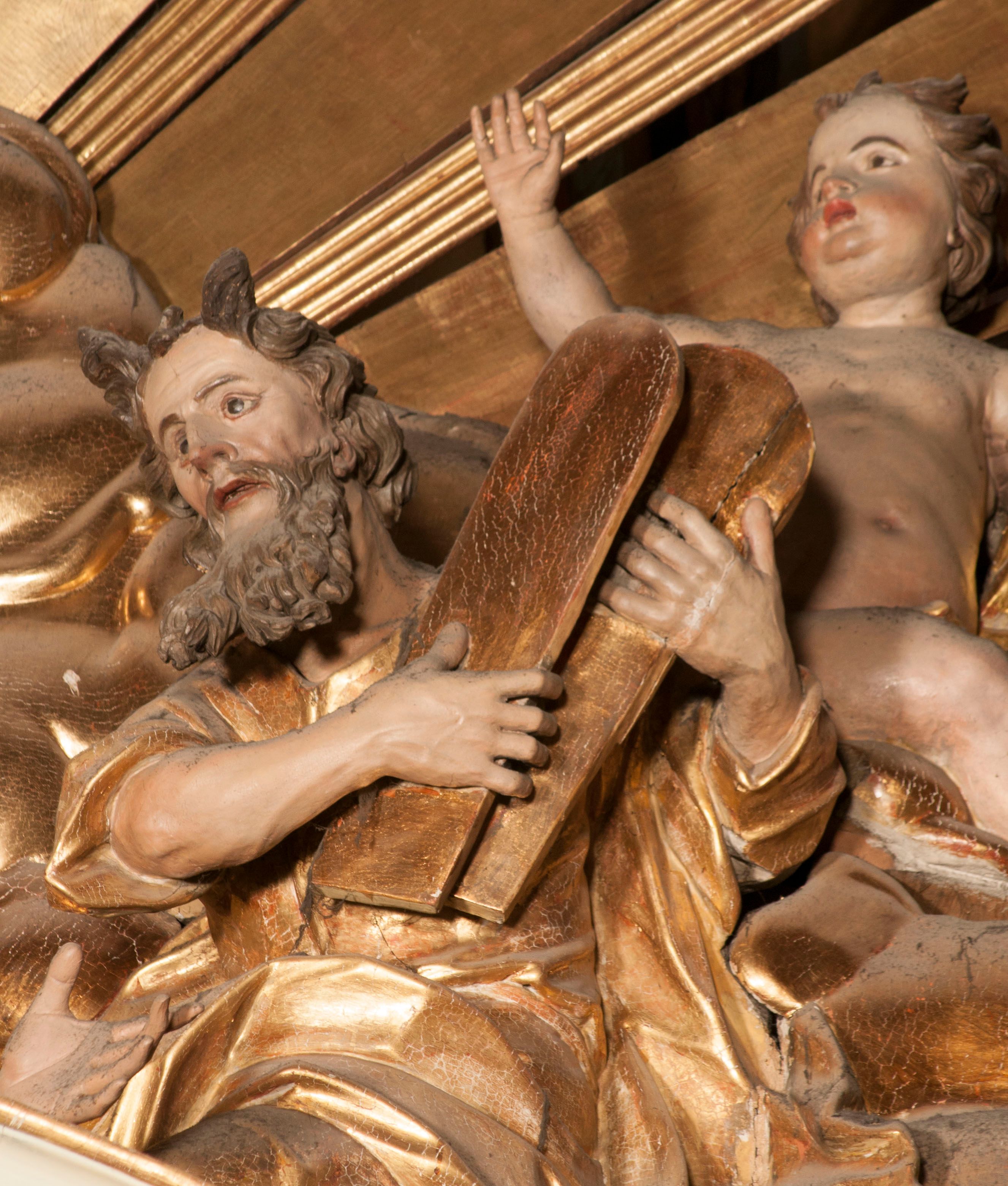 W partii belkowania nad polem głównym, na rzeźbionej skale podtrzymywanej przez rocaille klęczące postacie św. Piotra, św. Jana i św. Jakuba w dynamicznych pozach. Nad nimi unosi się Chrystus w otoku z obłoków i glorii, flankowany przez figury Mojżesza i Eliasza klęczące na przerwanym przyczółku, za nimi nadlatujące putta na obłokach. Po lewej stronie Piotr klęczący frontalnie z uniesionymi rękami. Obok niego klęczący św. Jan zwrócony profilem w lewo, z rękami wyciągniętymi w przód, o młodzieńczych rysach i długich, kręconych włosach. Święty Jakub po prawej stronie, w pozycji siedzącej, zwrócony w trzech czwartych w prawo z rękami wyciągniętymi w lewo. Wszyscy ubrani w przylegające do ciała tuniki oraz płaszcze przepasane w partii nóg. Nad nimi Chrystus w pozycji stojącej, frontalnie, w kontrapoście, z uniesioną głową i rękami rozłożonymi na boki, ubrany jest w tunikę oraz płaszcz przewiązany przez lewe ramię i wokół nóg. Na lewym fragmencie przyczółka klęczy Eliasz, zwrócony w trzech czwartych w lewo, pochylony, prawą ręką przytrzymuje na boku księgę, lewą wyciąga w przód. Ubrany jest w tunikę oraz rozwiany płaszcz. Na prawym fragmencie przyczółka klęczy Mojżesz, zwrócony w trzech czwartych w prawo, z pochylona głową, obiema rękami trzyma tablice przykazań. Ubrany jest w tunikę o krótkich rękawach oraz płaszcz zawinięty na lewym ramieniu i opadający na nogi. Obaj prorocy ukazani jako starcy. Nastawa flankowana dwoma wspornikami z figurami św. Wacława i św. Floriana. Struktura polichromowana w kolorze beżowym z żółtymi detalami oraz złoconymi profilami, ornamentyką i zwieńczeniem. Figury w partii ciała polichromowane naturalistycznie z brązowymi włosami i brodami oraz złoconymi szatami i atrybutami.