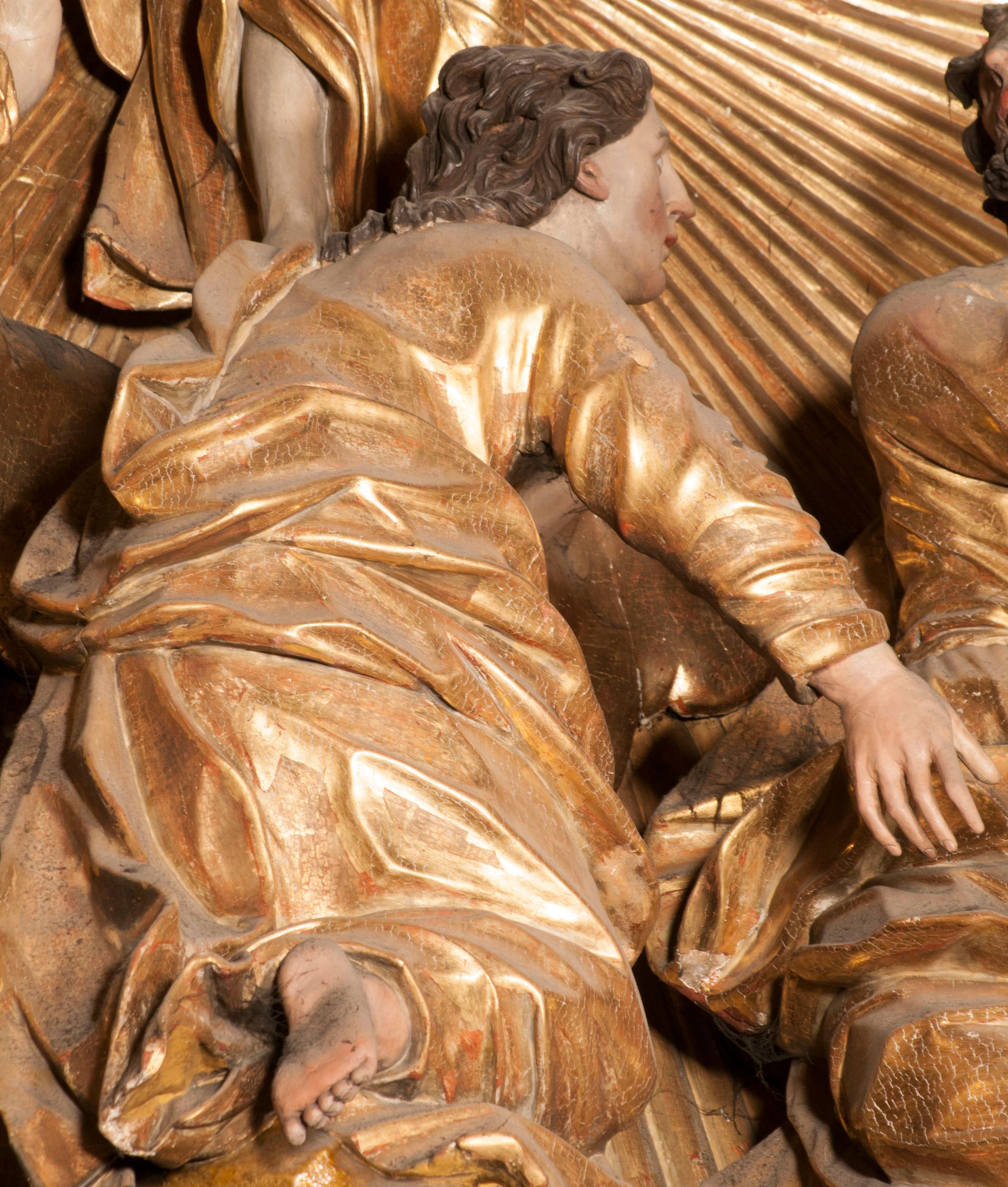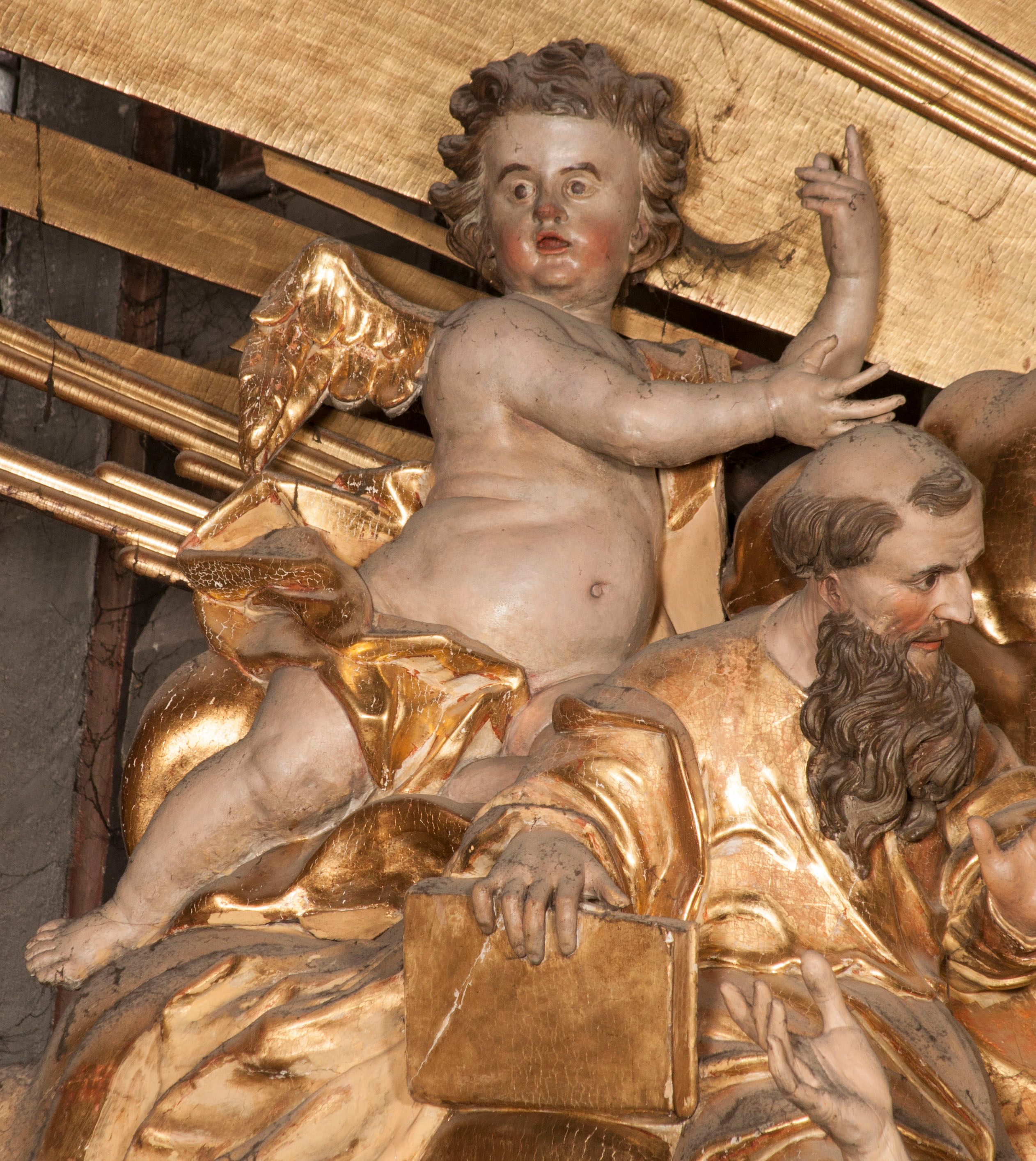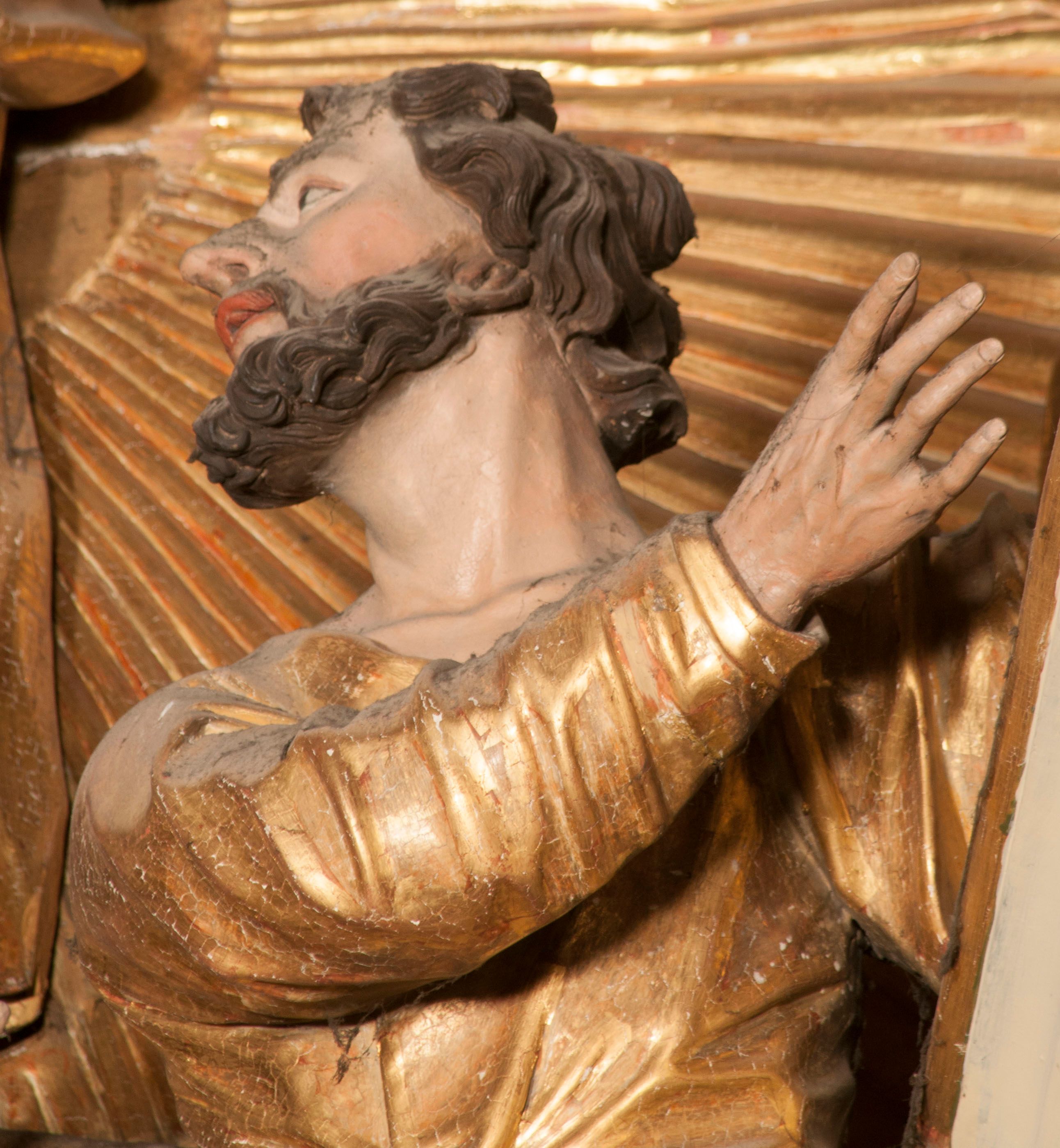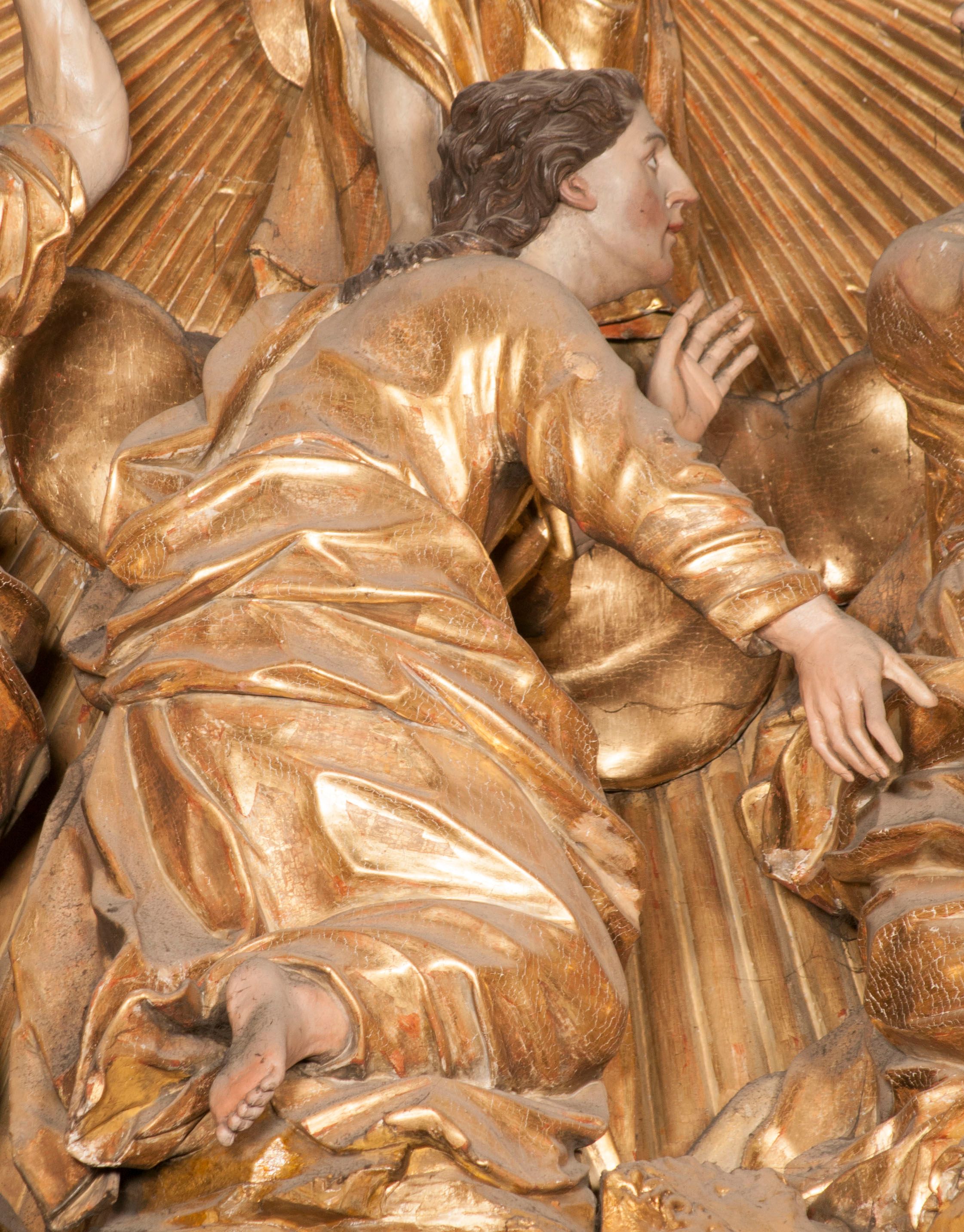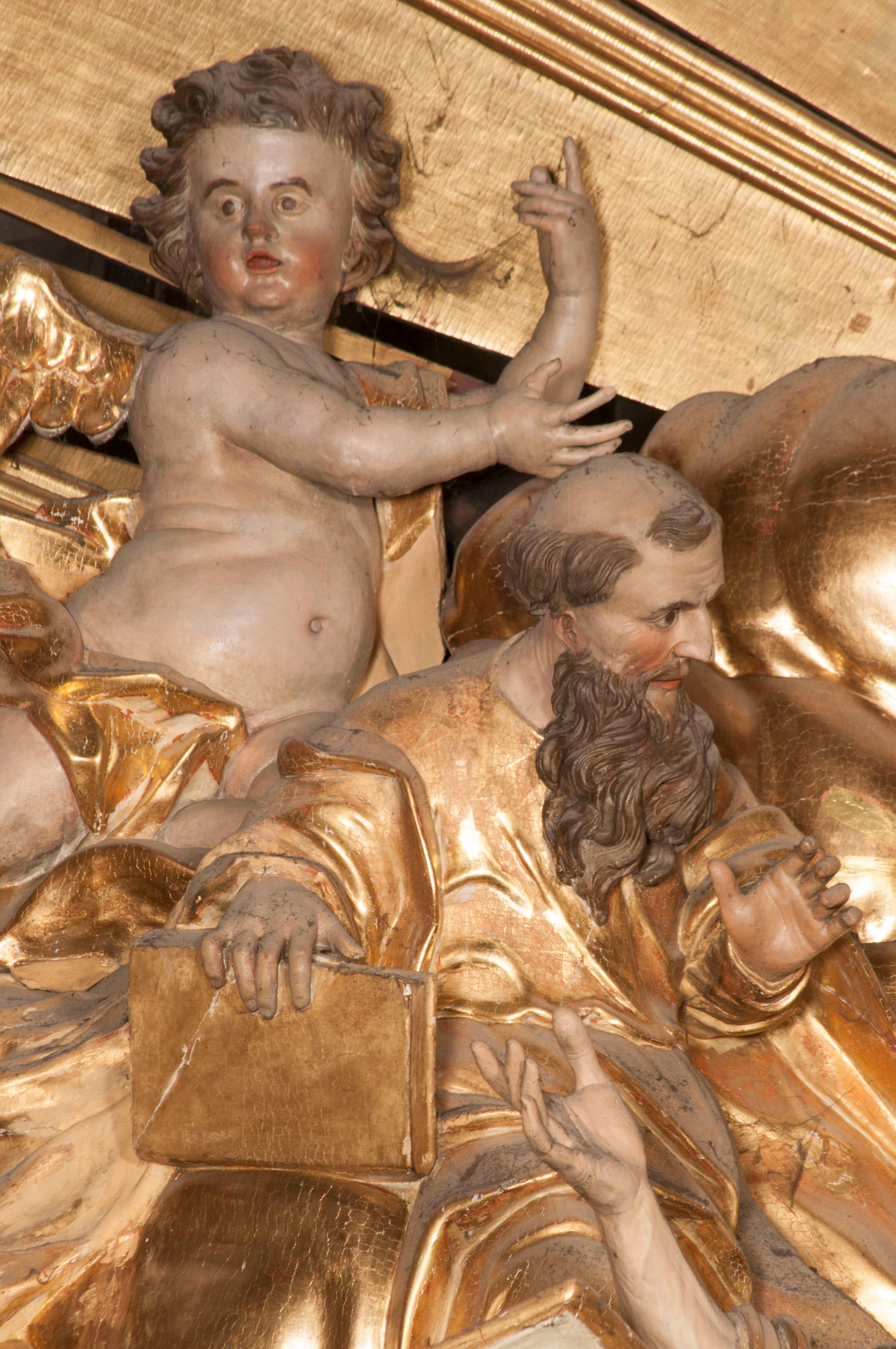 W partii belkowania nad polem głównym, na rzeźbionej skale podtrzymywanej przez rocaille klęczące postacie św. Piotra, św. Jana i św. Jakuba w dynamicznych pozach. Nad nimi unosi się Chrystus w otoku z obłoków i glorii, flankowany przez figury Mojżesza i Eliasza klęczące na przerwanym przyczółku, za nimi nadlatujące putta na obłokach. Po lewej stronie Piotr klęczący frontalnie z uniesionymi rękami. Obok niego klęczący św. Jan zwrócony profilem w lewo, z rękami wyciągniętymi w przód, o młodzieńczych rysach i długich, kręconych włosach. Święty Jakub po prawej stronie, w pozycji siedzącej, zwrócony w trzech czwartych w prawo z rękami wyciągniętymi w lewo. Wszyscy ubrani w przylegające do ciała tuniki oraz płaszcze przepasane w partii nóg. Nad nimi Chrystus w pozycji stojącej, frontalnie, w kontrapoście, z uniesioną głową i rękami rozłożonymi na boki, ubrany jest w tunikę oraz płaszcz przewiązany przez lewe ramię i wokół nóg. Na lewym fragmencie przyczółka klęczy Eliasz, zwrócony w trzech czwartych w lewo, pochylony, prawą ręką przytrzymuje na boku księgę, lewą wyciąga w przód. Ubrany jest w tunikę oraz rozwiany płaszcz. Na prawym fragmencie przyczółka klęczy Mojżesz, zwrócony w trzech czwartych w prawo, z pochylona głową, obiema rękami trzyma tablice przykazań. Ubrany jest w tunikę o krótkich rękawach oraz płaszcz zawinięty na lewym ramieniu i opadający na nogi. Obaj prorocy ukazani jako starcy. Nastawa flankowana dwoma wspornikami z figurami św. Wacława i św. Floriana. Struktura polichromowana w kolorze beżowym z żółtymi detalami oraz złoconymi profilami, ornamentyką i zwieńczeniem. Figury w partii ciała polichromowane naturalistycznie z brązowymi włosami i brodami oraz złoconymi szatami i atrybutami.