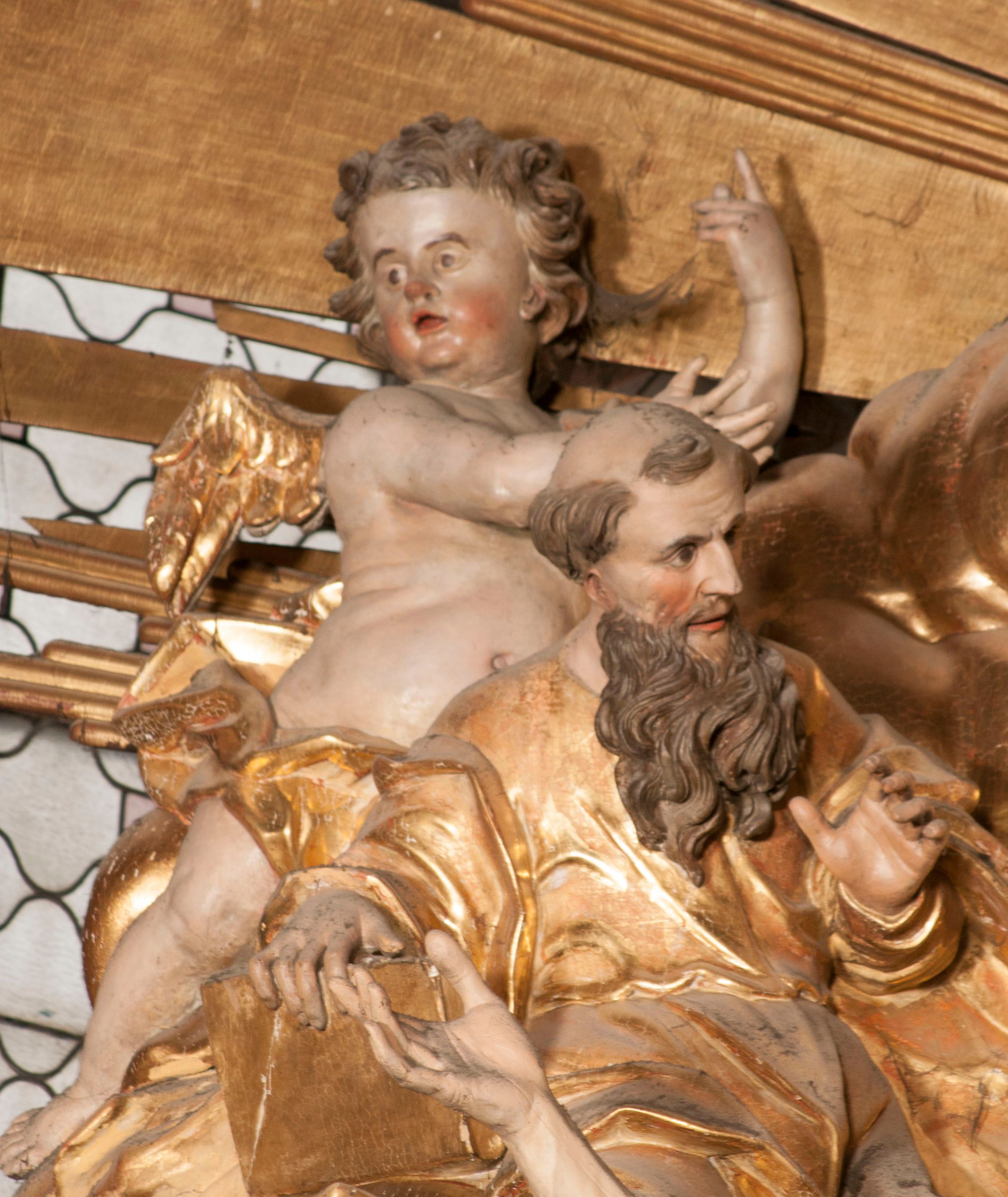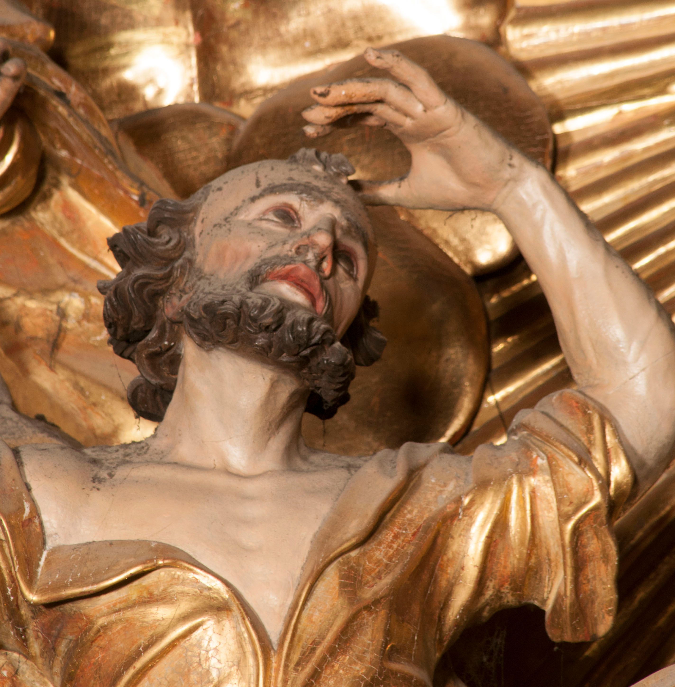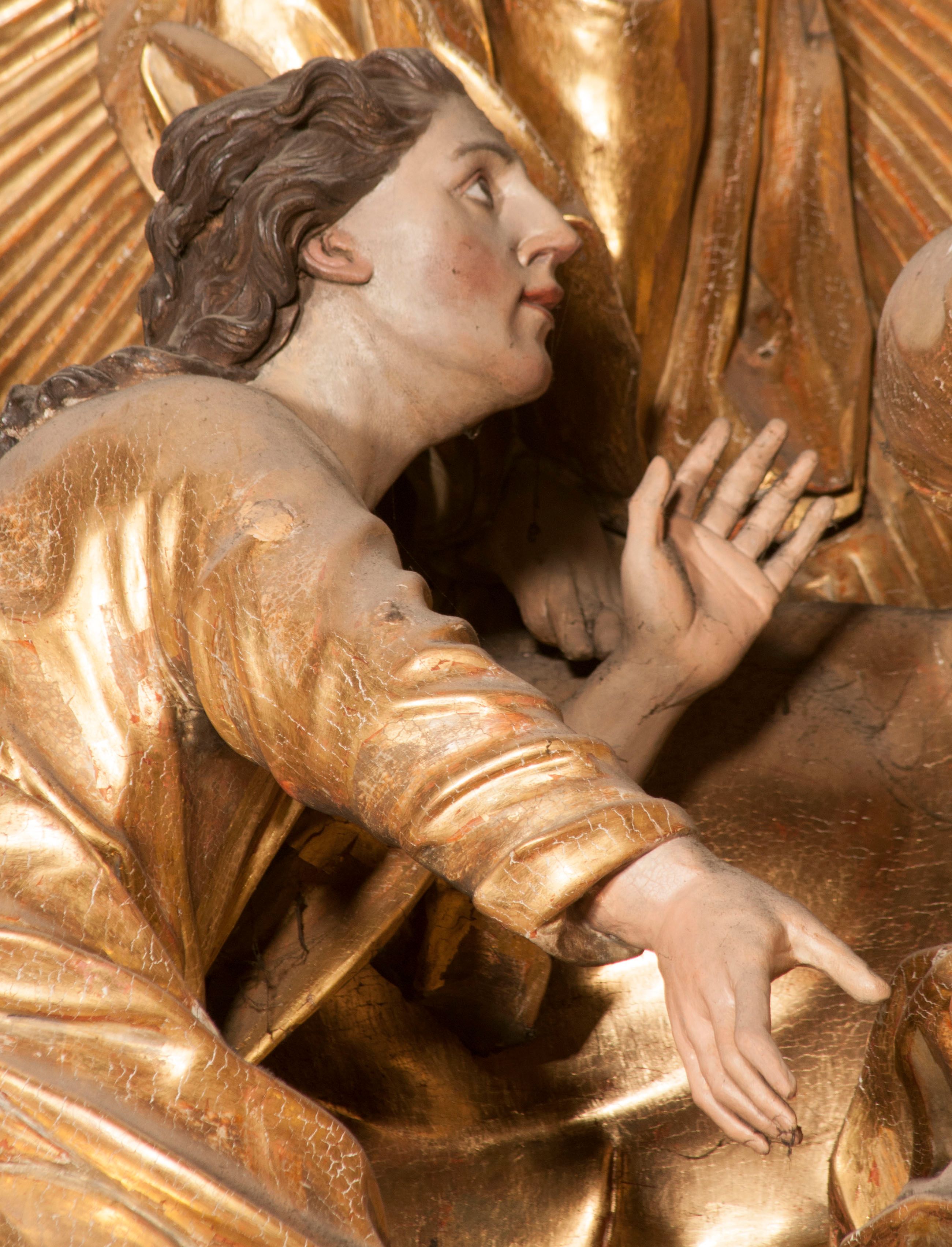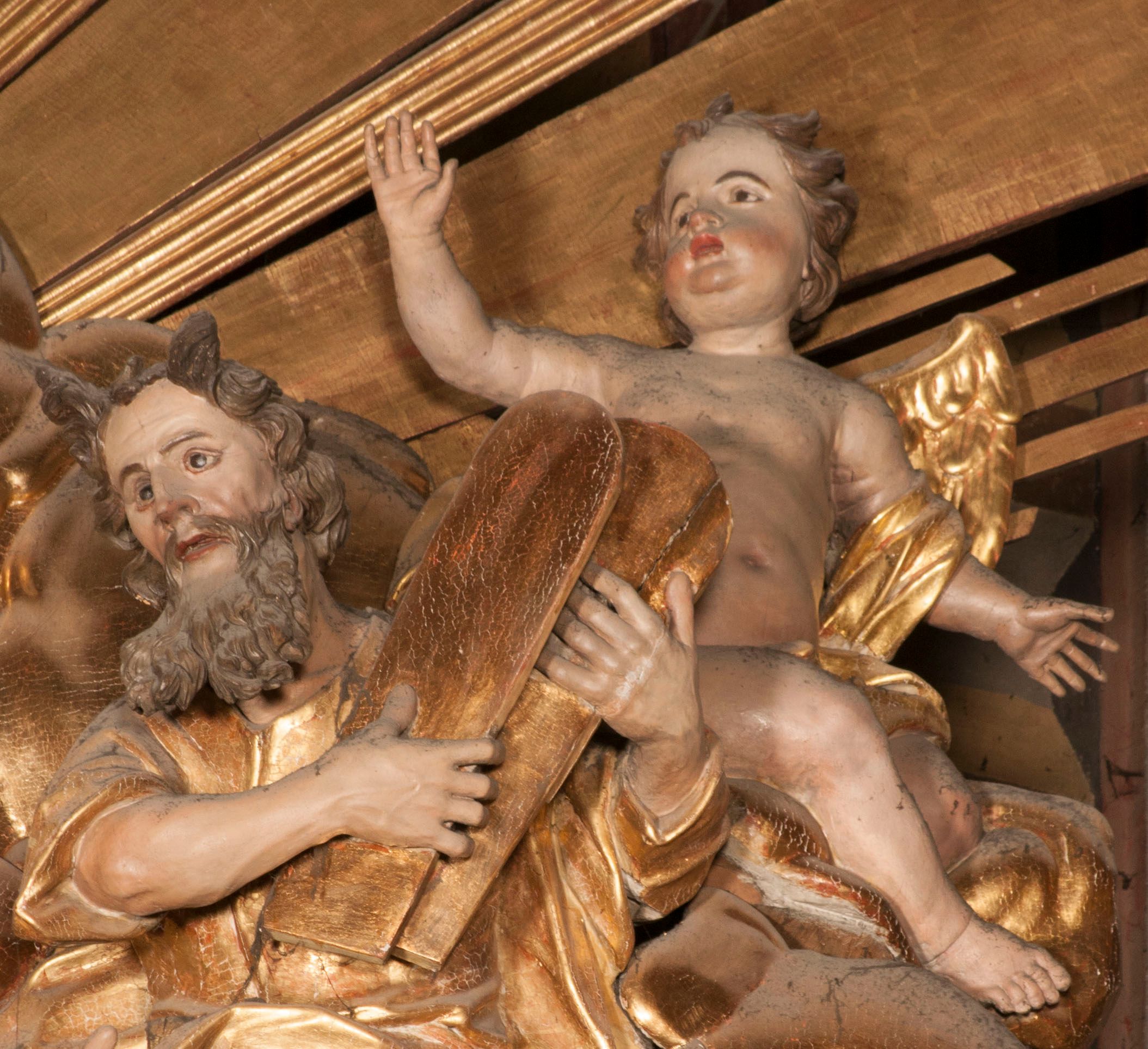 W partii belkowania nad polem głównym, na rzeźbionej skale podtrzymywanej przez rocaille klęczące postacie św. Piotra, św. Jana i św. Jakuba w dynamicznych pozach. Nad nimi unosi się Chrystus w otoku z obłoków i glorii, flankowany przez figury Mojżesza i Eliasza klęczące na przerwanym przyczółku, za nimi nadlatujące putta na obłokach. Po lewej stronie Piotr klęczący frontalnie z uniesionymi rękami. Obok niego klęczący św. Jan zwrócony profilem w lewo, z rękami wyciągniętymi w przód, o młodzieńczych rysach i długich, kręconych włosach. Święty Jakub po prawej stronie, w pozycji siedzącej, zwrócony w trzech czwartych w prawo z rękami wyciągniętymi w lewo. Wszyscy ubrani w przylegające do ciała tuniki oraz płaszcze przepasane w partii nóg. Nad nimi Chrystus w pozycji stojącej, frontalnie, w kontrapoście, z uniesioną głową i rękami rozłożonymi na boki, ubrany jest w tunikę oraz płaszcz przewiązany przez lewe ramię i wokół nóg. Na lewym fragmencie przyczółka klęczy Eliasz, zwrócony w trzech czwartych w lewo, pochylony, prawą ręką przytrzymuje na boku księgę, lewą wyciąga w przód. Ubrany jest w tunikę oraz rozwiany płaszcz. Na prawym fragmencie przyczółka klęczy Mojżesz, zwrócony w trzech czwartych w prawo, z pochylona głową, obiema rękami trzyma tablice przykazań. Ubrany jest w tunikę o krótkich rękawach oraz płaszcz zawinięty na lewym ramieniu i opadający na nogi. Obaj prorocy ukazani jako starcy. Nastawa flankowana dwoma wspornikami z figurami św. Wacława i św. Floriana. Struktura polichromowana w kolorze beżowym z żółtymi detalami oraz złoconymi profilami, ornamentyką i zwieńczeniem. Figury w partii ciała polichromowane naturalistycznie z brązowymi włosami i brodami oraz złoconymi szatami i atrybutami.
