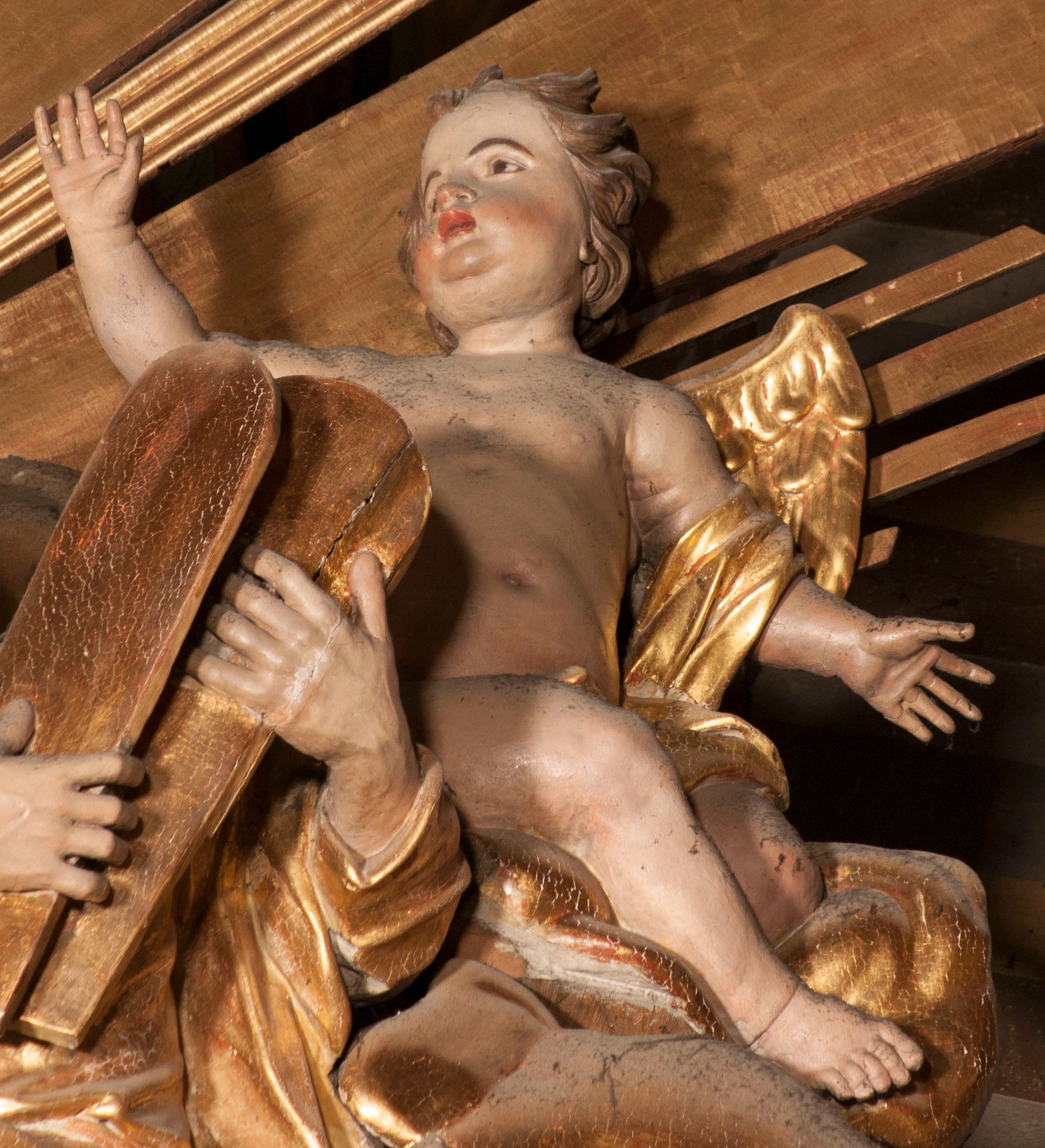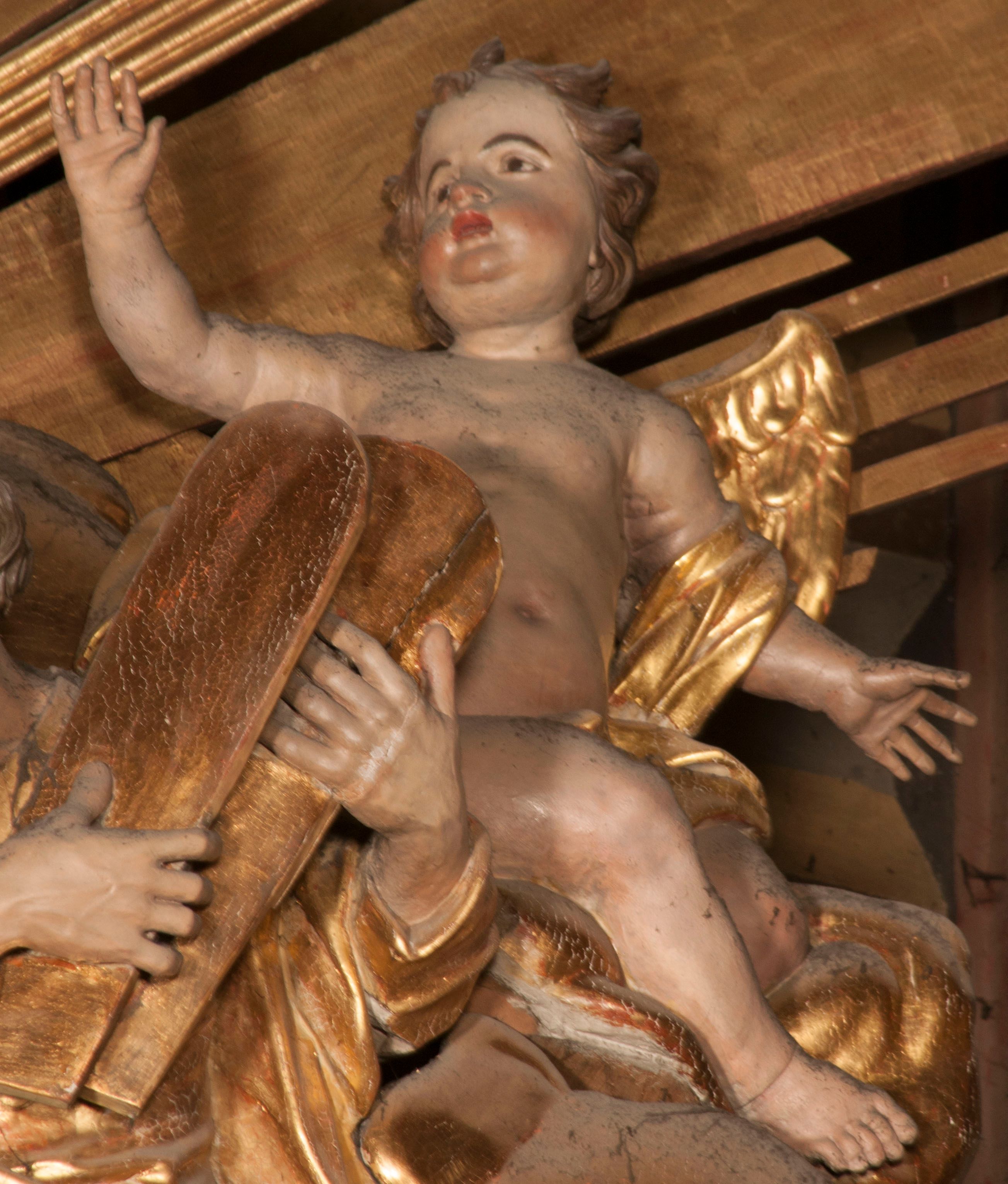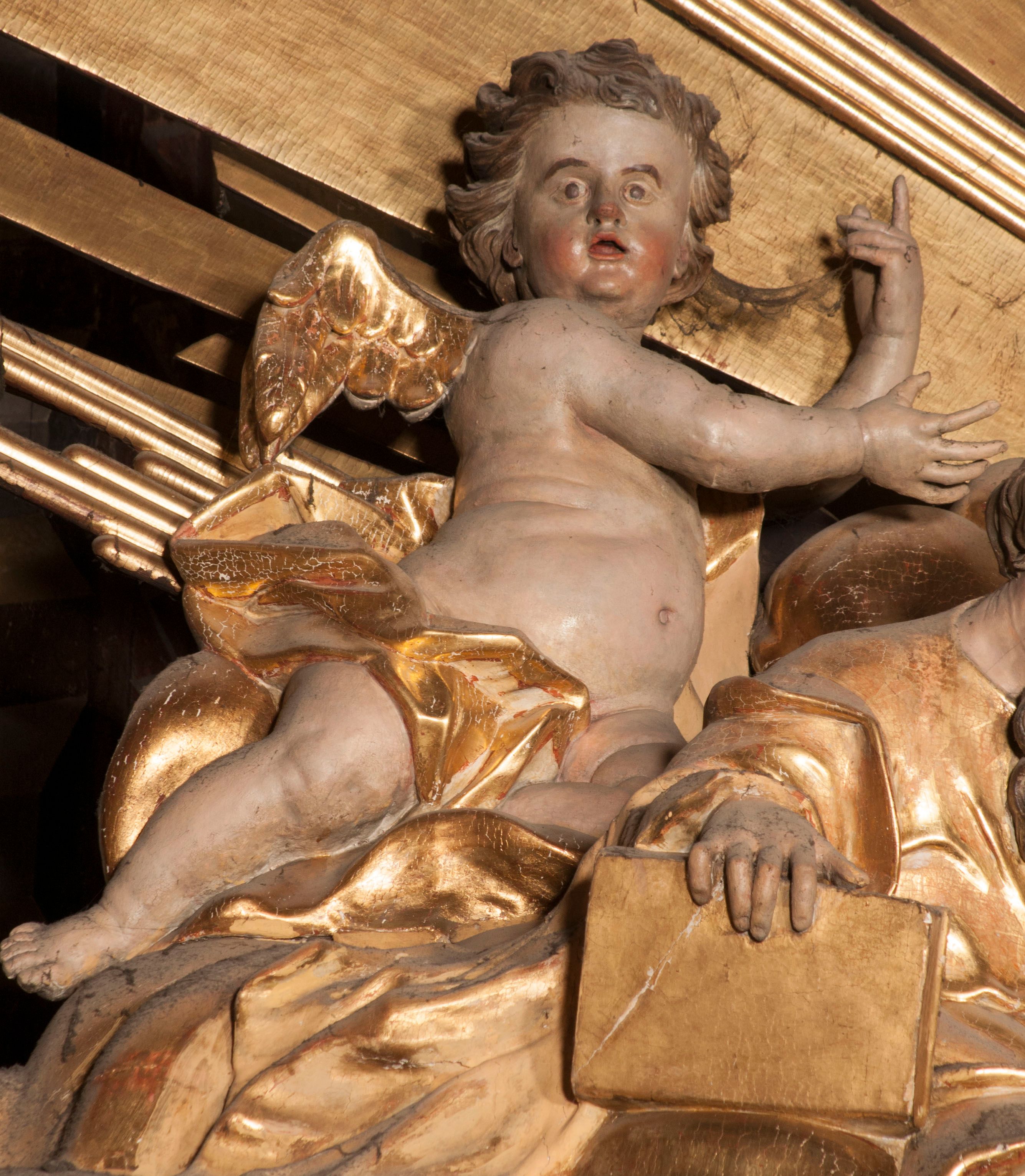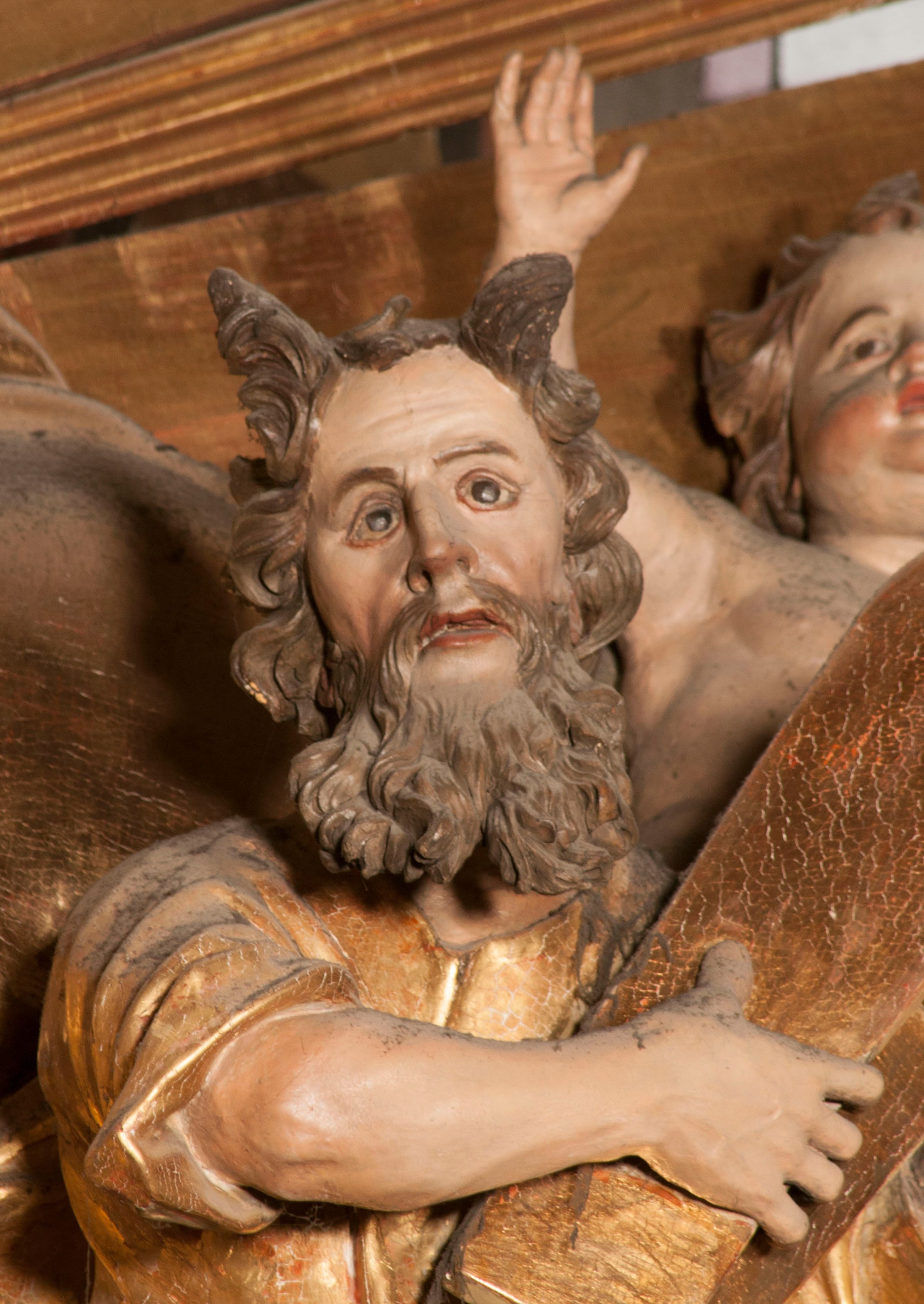 W partii belkowania nad polem głównym, na rzeźbionej skale podtrzymywanej przez rocaille klęczące postacie św. Piotra, św. Jana i św. Jakuba w dynamicznych pozach. Nad nimi unosi się Chrystus w otoku z obłoków i glorii, flankowany przez figury Mojżesza i Eliasza klęczące na przerwanym przyczółku, za nimi nadlatujące putta na obłokach. Po lewej stronie Piotr klęczący frontalnie z uniesionymi rękami. Obok niego klęczący św. Jan zwrócony profilem w lewo, z rękami wyciągniętymi w przód, o młodzieńczych rysach i długich, kręconych włosach. Święty Jakub po prawej stronie, w pozycji siedzącej, zwrócony w trzech czwartych w prawo z rękami wyciągniętymi w lewo. Wszyscy ubrani w przylegające do ciała tuniki oraz płaszcze przepasane w partii nóg. Nad nimi Chrystus w pozycji stojącej, frontalnie, w kontrapoście, z uniesioną głową i rękami rozłożonymi na boki, ubrany jest w tunikę oraz płaszcz przewiązany przez lewe ramię i wokół nóg. Na lewym fragmencie przyczółka klęczy Eliasz, zwrócony w trzech czwartych w lewo, pochylony, prawą ręką przytrzymuje na boku księgę, lewą wyciąga w przód. Ubrany jest w tunikę oraz rozwiany płaszcz. Na prawym fragmencie przyczółka klęczy Mojżesz, zwrócony w trzech czwartych w prawo, z pochylona głową, obiema rękami trzyma tablice przykazań. Ubrany jest w tunikę o krótkich rękawach oraz płaszcz zawinięty na lewym ramieniu i opadający na nogi. Obaj prorocy ukazani jako starcy. Nastawa flankowana dwoma wspornikami z figurami św. Wacława i św. Floriana. Struktura polichromowana w kolorze beżowym z żółtymi detalami oraz złoconymi profilami, ornamentyką i zwieńczeniem. Figury w partii ciała polichromowane naturalistycznie z brązowymi włosami i brodami oraz złoconymi szatami i atrybutami.