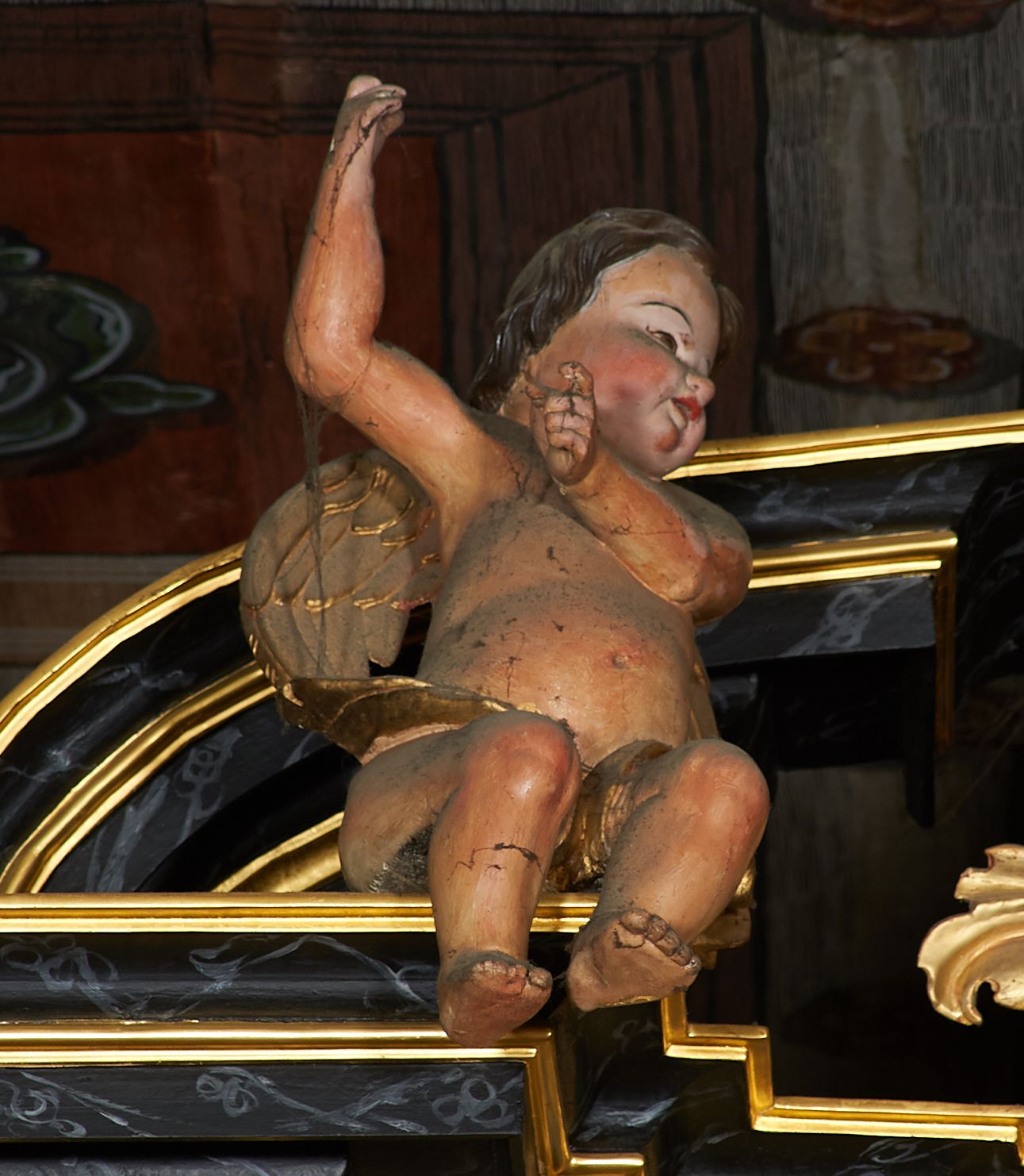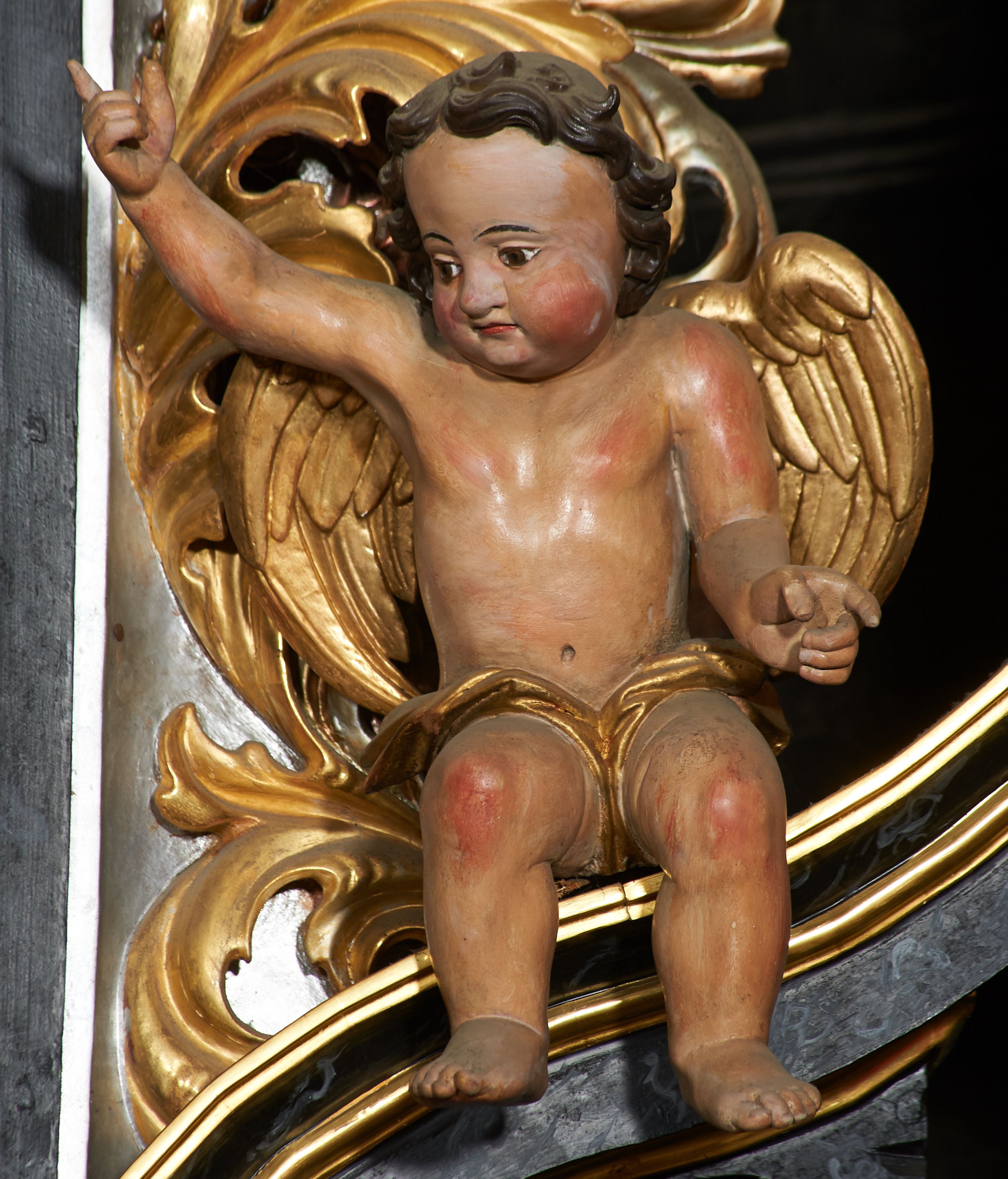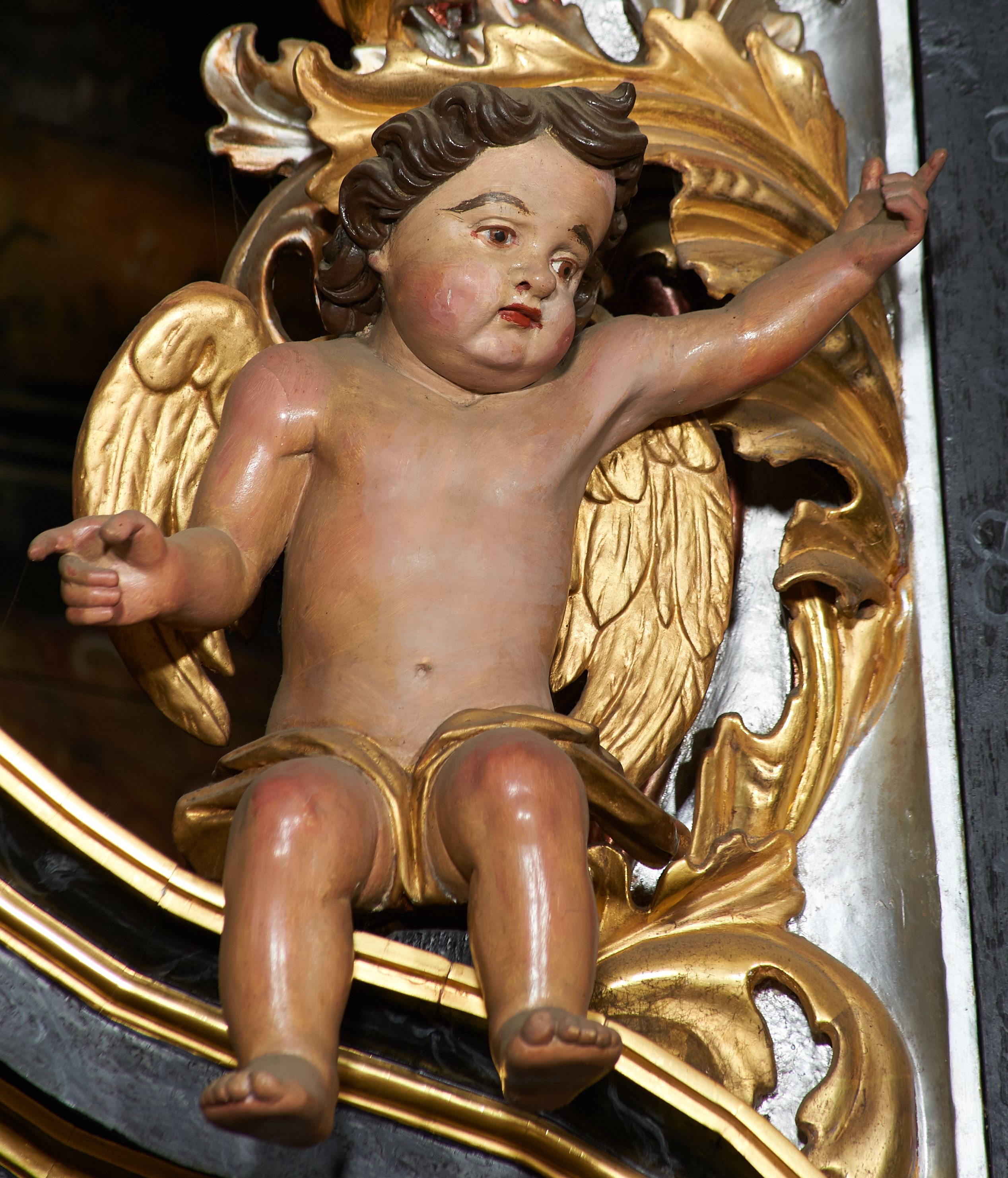 Struktura nastawy jest typowa dla XVII wieku, na co wskazuje m.in. usytuowanie w jednej płaszczyźnie wszystkich elementów, dwukondygnacyjna struktura ołtarza, obfita ilość złoceń i dekoracji ornamentalnych, uskrzydlone główki aniołków skierowane na wprost z podwieszonymi w dolnej partii ołtarza girlandami. Z kolei zastosowana ornamentyka – liście bujnego akantu – przybliża czas powstania dzieła na koniec XVII i początek XVIII wieku. Przypuszczalnie ołtarze mogły powstać wraz z fundacją malowideł ściennych lub wkrótce po nich, w czasie gdy proboszczem parafii był ksiądz Barny (1693-1705).