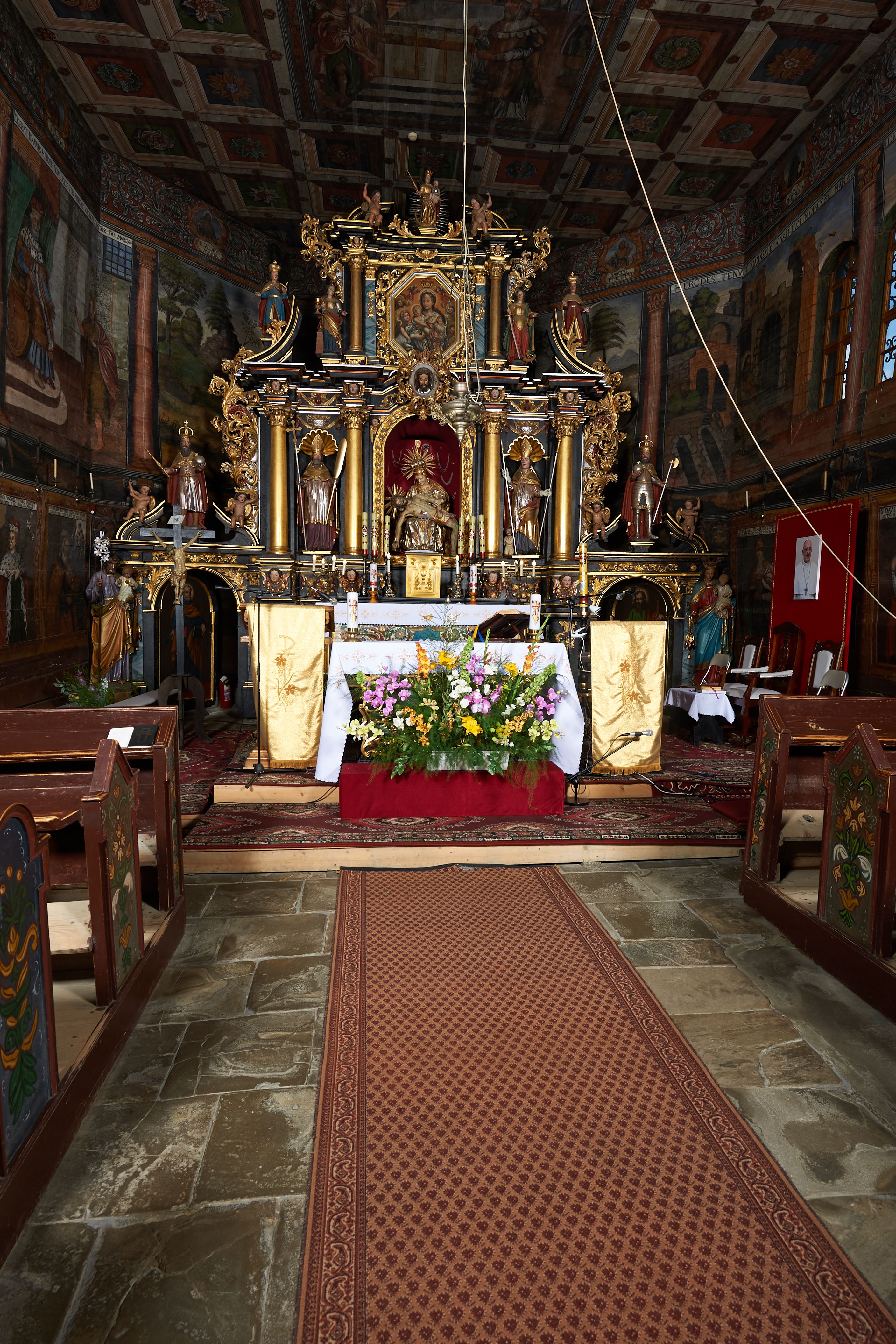 Ołtarz główny wraz z dekoracją rzeźbiarską wykonano prawdopodobnie w czasie posługi księdza Barnego około 1693-1705 roku. W polu umieszczona jest rzeźbiona Pieta, a na zasuwie obraz św. Jana Chrzciciela. Powyżej znajduje się medalion z rzeźbioną głową św. Jana Chrzciciela na tacy. W osiach bocznych płytkie nisze mieszczą figury św. Wojciecha po lewej stronie i św. Stanisława po prawej. W drugiej kondygnacji jest obraz Matki Boskiej z Dzieciątkiem. Kondygnację flankują rzeźby św. Barbary po lewej stronie oraz św. Katarzyny Aleksandryjskiej po prawej stronie. Z kolei na osi skrajnych kolumn, za przyczółkami ustawiona jest druga para dwóch świętych prawdopodobnie węgierskich. Drzwiczki bramek są ozdobione malowanymi przedstawieniami św. Piotra po lewej stronie i św. Pawła po prawej. Ponad bramkami na cokołach ustawione są figury św. Stefana po lewej stronie i św. Władysława po prawej. Interesujące przedstawienie znajduje się również na odwrociu ołtarza, gdzie umieszczone jest malowidło wyobrażające św. Marię Magdalenę.