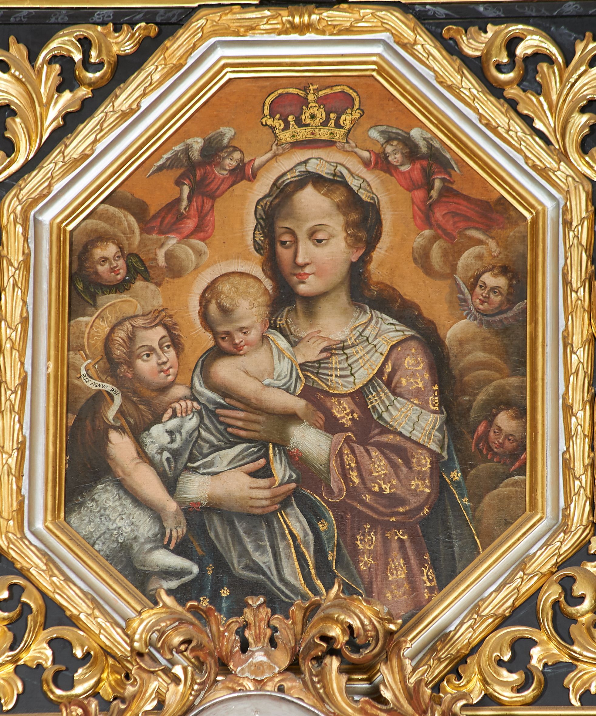 Druga kondygnacja szerokości osi środkowej, ujęta parą kolumn o kapitelach korynckich dźwigających pełne belkowanie z wydatnym gzymsem wyłamane na ich osi oraz przerwany przyczółek. W polu środkowym rama w formie stojącego prostokąta o ściętych narożach z obrazem Matki Boskiej. Kondygnacja flankowana przez figury św. Barbary po lewej stronie i św. Katarzyny po prawej. Z kolei na osi skrajnych kolumn, za przyczółkami ustawiona jest druga para dwóch świętych prawdopodobnie węgierskich. Fryz dekorowany akantem oraz uskrzydlonymi główkami anielskimi na osi podpór. Kondygnacja ujęta ażurowym suchym akantem. Na szczycie figura tronującej Matki Boskiej Królowej Niebios, stojącej na półksiężycu w glorii oraz dwa putta.