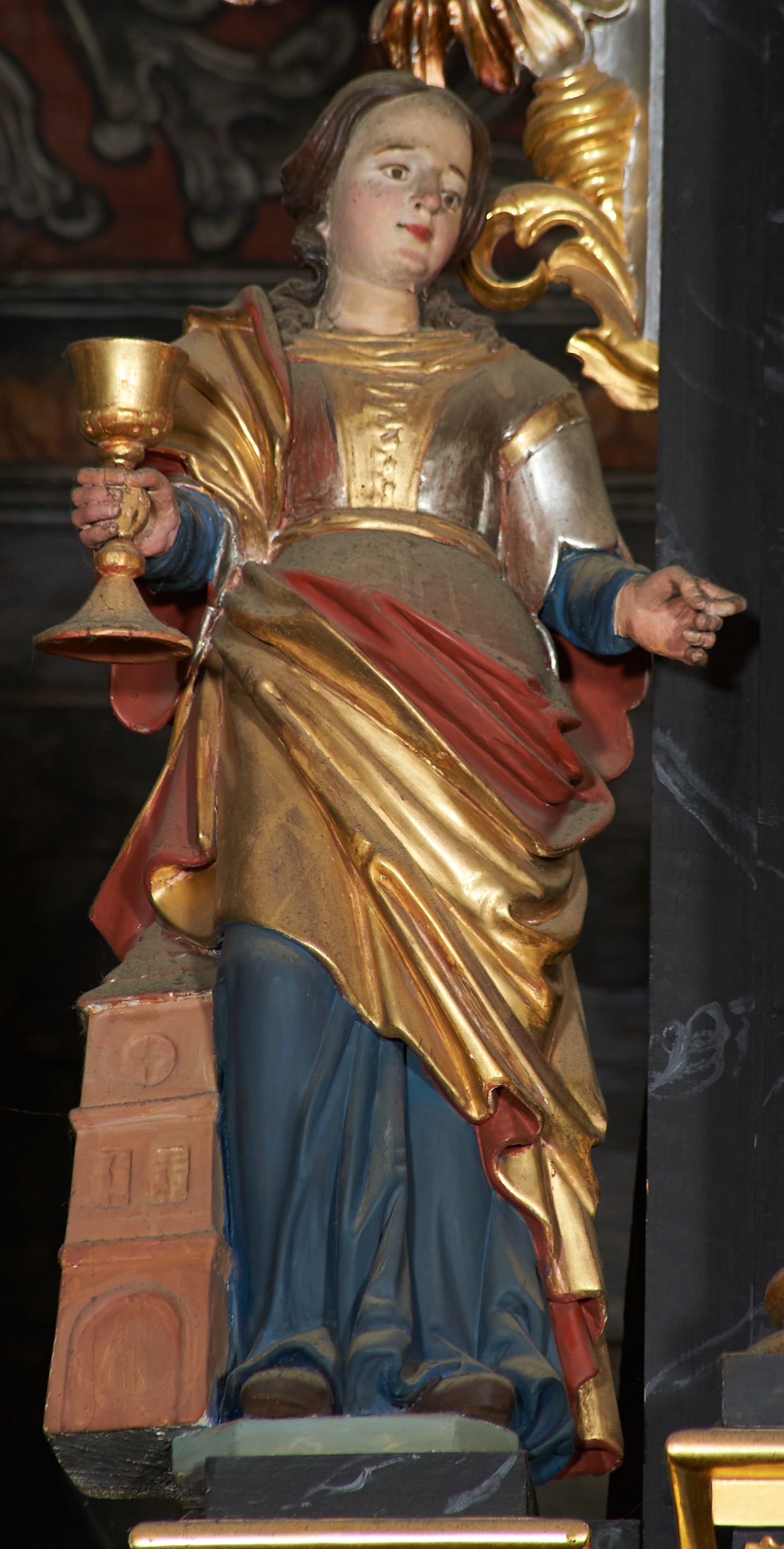 Nastawa marmoryzowana w kolorze ciemnej zieleni ze złoconymi oraz srebrzonymi detalami architektonicznymi i ornamentyką. Na odwrociu ołtarza znajduje się malowidło przedstawiające św. Marię Magdalenę.