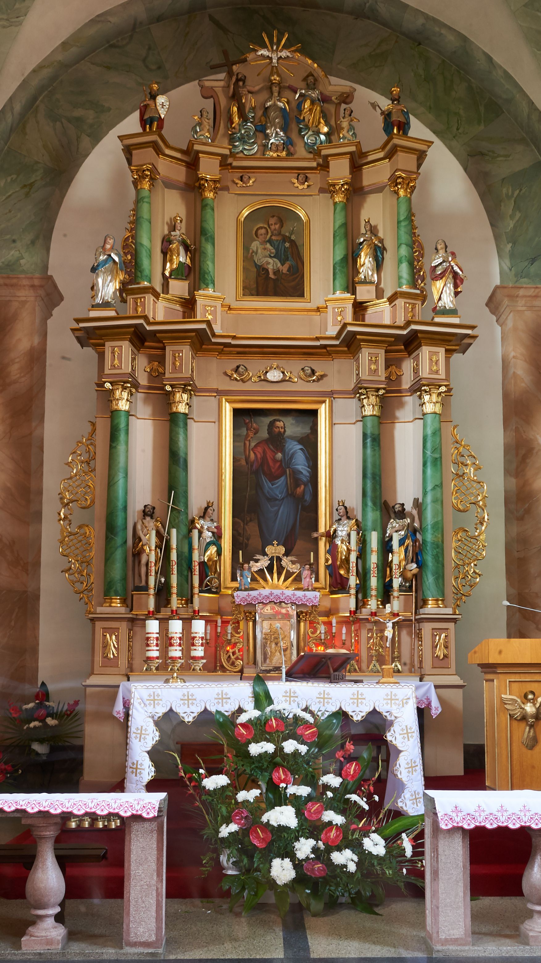 Nastawa ołtarzowa architektoniczna, dwukondygnacyjna ze zwieńczeniem, obie kondygnacje trójosiowe. Ołtarz murowany, prostopadłościenny, mensa z kamiennym portatylem. Antepedium dekorowane malowaną iluzjonistycznie prostokątną płyciną z wypukłymi krótszymi bokami. Na ołtarzu tabernakulum w formie drewnianej skrzynki ujętej kolumienkami podtrzymującymi gzyms. Do niego wbudowana drewniana skrzynka obita metalową blachą, z drzwiczkami w kształcie stojącego prostokąta, ujętego ramą, z wizerunkiem krzyża, winnego grona, kłosów zbóż i kielicha z hostią w polu. Całość flankowana uszami utworzonymi z cęg i kratki. Na tabernakulum tron wystawienia przyjmujący postać glorii promienistej, z parą aniołów unoszącą nad nią koronę zamkniętą. Tron flankowany dwoma klęczącymi aniołkami trzymającymi lichtarze ze świecami. Pierwsza kondygnacja na dwustrefowym cokole, w górnej partii z wyodrębnionymi prostopadłościanami, dekorowanymi płycinami z ornamentem roślinnym. Osie wydzielone czterema kolumnami o kapitelach kompozytowych, dźwigających pełne belkowanie z silnie wysuniętym gzymsem, wyłamane na ich osi oraz ustawione pod kątem na zewnątrz. Fryz dekorowany medalionem z monogramem IHS, uskrzydlonymi główkami anielskimi i ornamentem roślinnym. W polu środkowym wnęka w formie stojącego prostokąta, ujęta profilowaną ramą, z obrazem św. Jakuba. Wnęka flankowana figurami św. Katarzyny Aleksandryjskiej i św. Barbary ustawionymi na cokołach. Na osiach bocznych rzeźby św. Jana Chrzciciela i św. Andrzeja na cokołach. Pierwsza kondygnacja flankowana uszami utworzonymi z wici roślinnej i kratki. Druga kondygnacja na cokole z wyodrębnionymi prostopadłościanami, dekorowanymi płycinami z ornamentem roślinnym. Osie wydzielone czterema kolumnami o kapitelach kompozytowych, dźwigającymi pełne belkowanie, wyłamane na ich osi. Wewnętrzna para zwrócona pod kątem do środka, para skrajna na zewnątrz. Fryz dekorowany uskrzydlonymi główkami anielskimi. W polu obraz św. Józefa z Dzieciątkiem w formie stojącego prostokąta zamkniętego łukiem odcinkowym, ujęty profilowaną ramą. Na osiach bocznych ustawione figury niezidentyfikowanej świętej i św. Jadwigi (?). Na skraju belkowania pierwszej kondygnacji umiejscowione rzeźby Marii i św. Jana. Druga kondygnacja flankowana uszami utworzonymi z wici roślinnej. Zwieńczenie w kształcie zbliżonym do leżącego prostokąta, o wklęsłych bokach, zamkniętego łukiem odcinkowym nadwieszonym. W polu grupa rzeźbiarska Koronacji Marii, w której postacie unoszą się na obłokach, nad nimi zaś znajduje się gołębica Ducha Świętego w glorii. Na belkowaniu drugiej kondygnacji ustawione dwa klęczące na obłokach aniołki oraz figury św. Stefana i św. Władysława. Struktura polichromowana w kolorze beżowym, z bladoróżowymi detalami; kolumny malowane na sposób imitujący marmoryzacje w kolorze zielonym; profile i ornamentyka złocone.