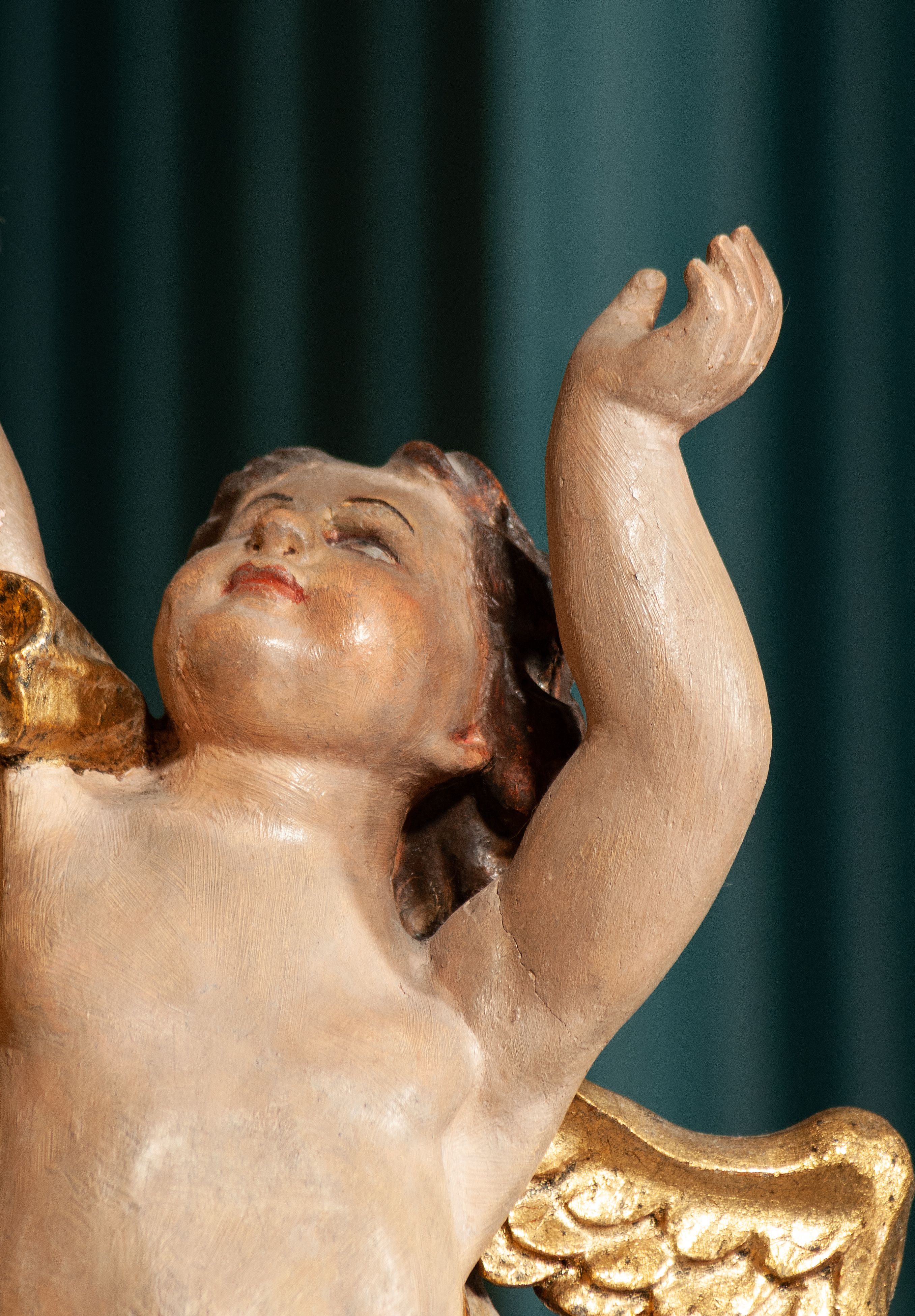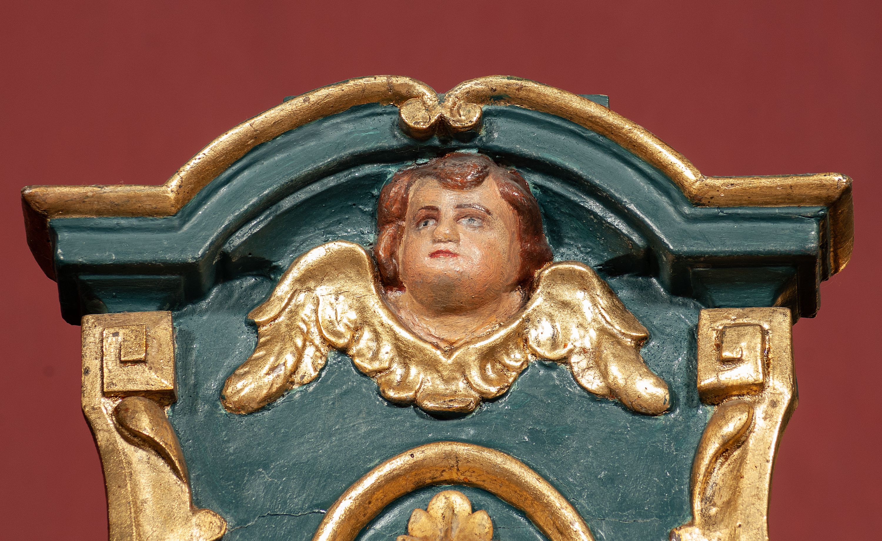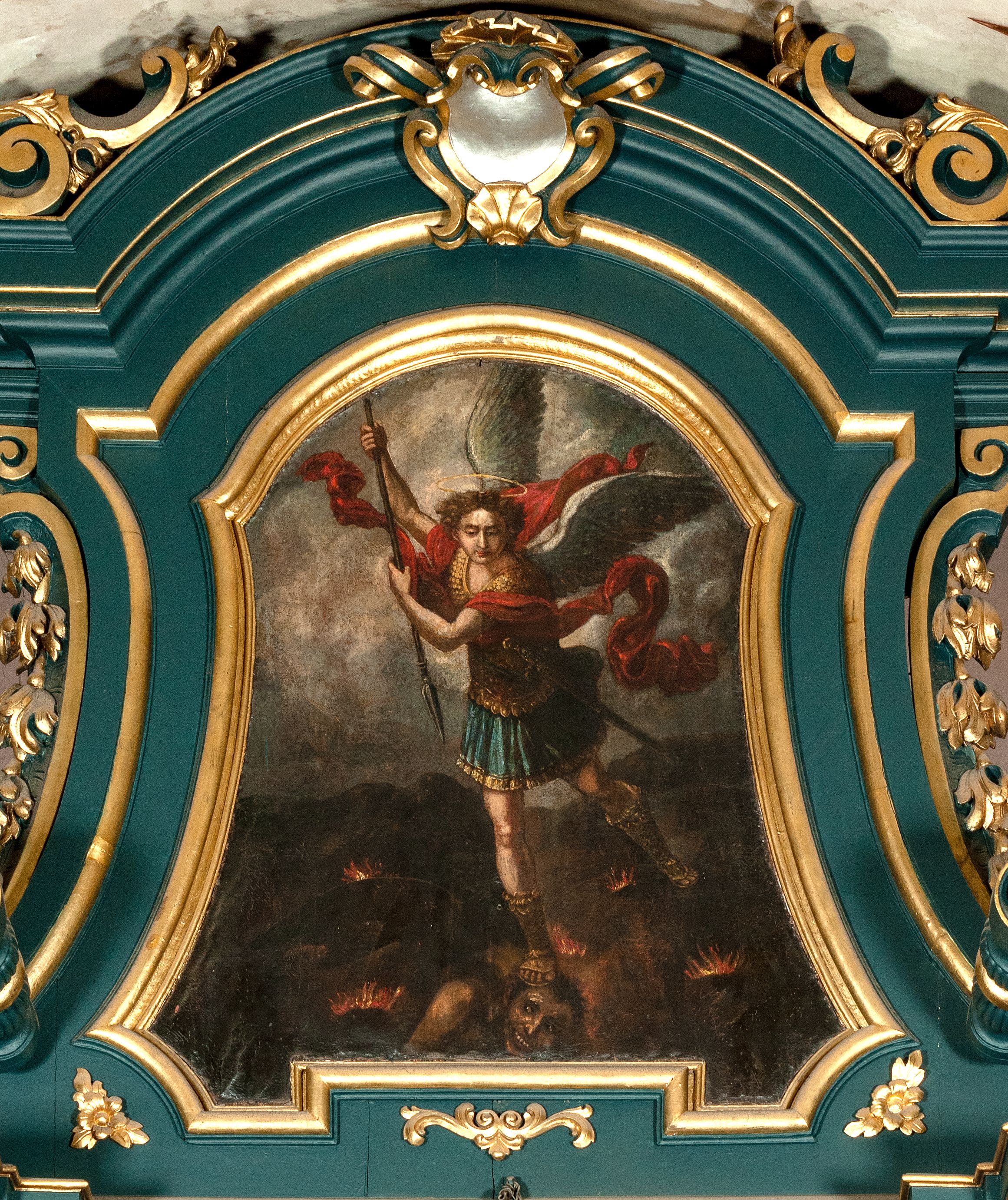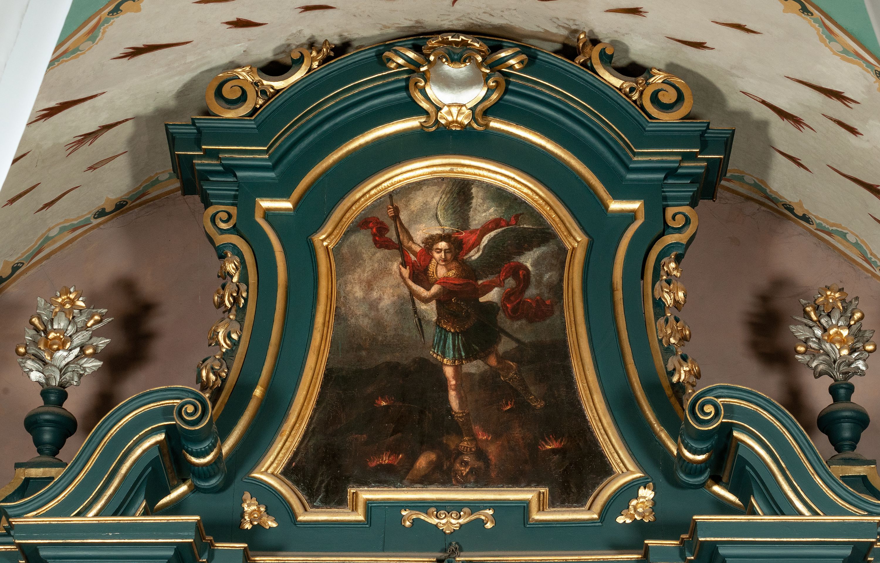 Ołtarz drewniany, dwustronny, obecnie przyścienny, architektoniczny, jednokondygnacyjny ze zwieńczeniem, trójosiowy, z bramkami. Mensa kamienna, prostopadłościenna z antepedium ujętym w profilowaną i złoconą ramę, dekorowaną kimationem jońskim i kampanulami. W polu płaskorzeźbione przedstawienie kielicha z hostią ujętego dwoma otwartymi księgami z napisem na prawej „ECCE / PANIS / ANGE/LORUM”, na lewej „EVAN/GE/LIUM”; liśćmi laurowymi, arma Christi; u podstawy kielicha nałożona korona cierniowa. W dolnych narożach antepedium dekoracja z miękko zawijającej się wstęgi regencyjnej. Tabernakulum o rozbudowanych architektonicznych formach, jednokondygnacyjne, trójosiowe, każda z osi flankowana parą kolumienek i zakończona zwieńczeniem. W osi środkowej tabernakulum metalowe: w dolnej części w formie prostopadłościennej skrzynki z wizerunkiem Chrystusa, w górnej części obrotowe z przedstawieniem Baranka Bożego, zamknięte ozdobnym zwieńczeniem z parą uskrzydlonych putt i koroną w typie zamkniętym. W polach osi bocznych umieszczone za szybką relikwie świętych ujęte prostokątną, złoconą ramą. Retabulum ustawione na wysokim, dwudzielnym cokole, z bramkami o otworach drzwiowych zamkniętych łukiem kotarowym ściętym, nadproża w formie profilowanego gryzmsu. Pole ołtarza, zarówno osi głównej jak i bocznych ujęte jest kolumnami o gładkich trzonach i złoconych kapitalach kompozytowych ustawionych na tle zwieloktrotnionych pilastrów o kanelowanych trzonach. Podpory dźwigają wyłamane na ich osi, pełne belkowanie z wydatnym, silnie profilowanych gzymsem. Na nim fragmenty przyczółka w formie wolut. Pole osi środkowej ze złoconą ramą zamkniętą łukiem wklęsło-wypukłym z uskokiem. W zwieńczeniu ramy wolutowy kartusz o nieregularnym kształcie, z napisem „CONSUMMATUM / EST”. W centrum pola ołtarzowego drewniany krycyfiks. W osi prawej figura św. Kazimierza Królewicza, w osi lewej figura św. Jadwigi Śląskiej. Rzeźby ustawione w niszach, zamkniętych łukiem wklęsło-wypukłym, na rozbudowanych, wolutowych konsolach dekorowanych z przodu kartuszem utworzonym z akantowego wieńca wypełnionego kratką regencyjną; ponad nim girlanda złożona z kampanul i kwiatów. W niszach ponad figurami umieszczone dużych rozmiarów, złocone muszle palmetowe, oraz nieco niżej dwie gałązki akantu. Ponad niszami rozbudowana płaskorzeźbiona dekoracja w formie struktury utworzonej z wolut o karbowanych wypełnieniach, w jej centrum uskrzydlone główki aniołków. Zwieńczenie w formie wklęsło-wypukłej, zamknięte gzymsem w kształcie łuku nadwieszonego, po bokach flankowane dwoma wazonami z kwiatami. W polu obraz św. Michała Archanioła. Kolorystyka ciemnozielona, ze złoceniami w partiach ornamentów oraz w załamaniach profili architektonicznych. Partie cokołu dekorowane płycinami wypełnionymi ornamentem regencyjnym. Według dokumentacji konserwatorskiej na odwrociu ołtarza znajduje się malowana iluzjonistyczna dekoracja przedstawiająca barokowy ołtarz, postacie Matki Boskiej, św. Jana Ewangelisty oraz świętych franciszkańskich.