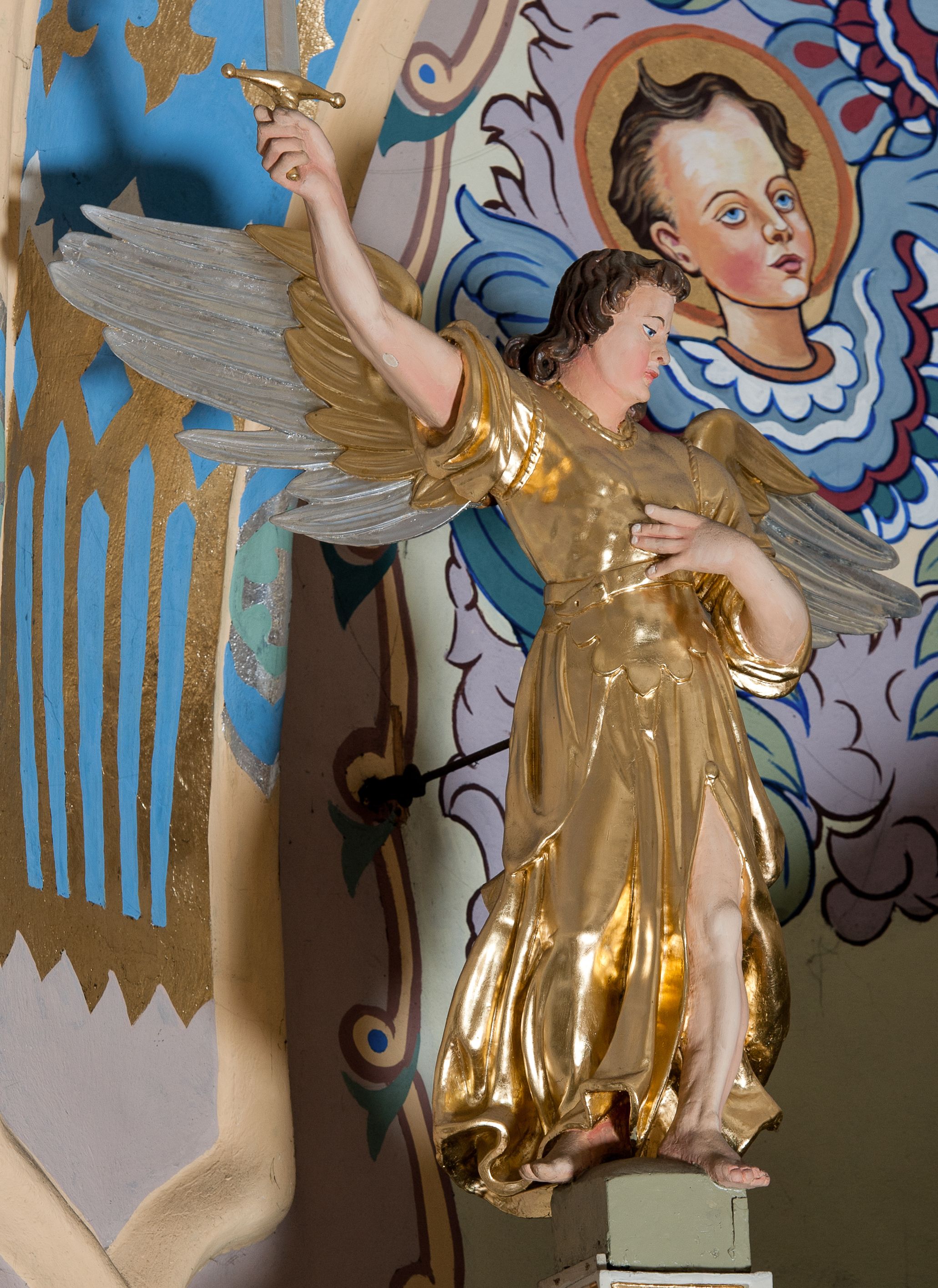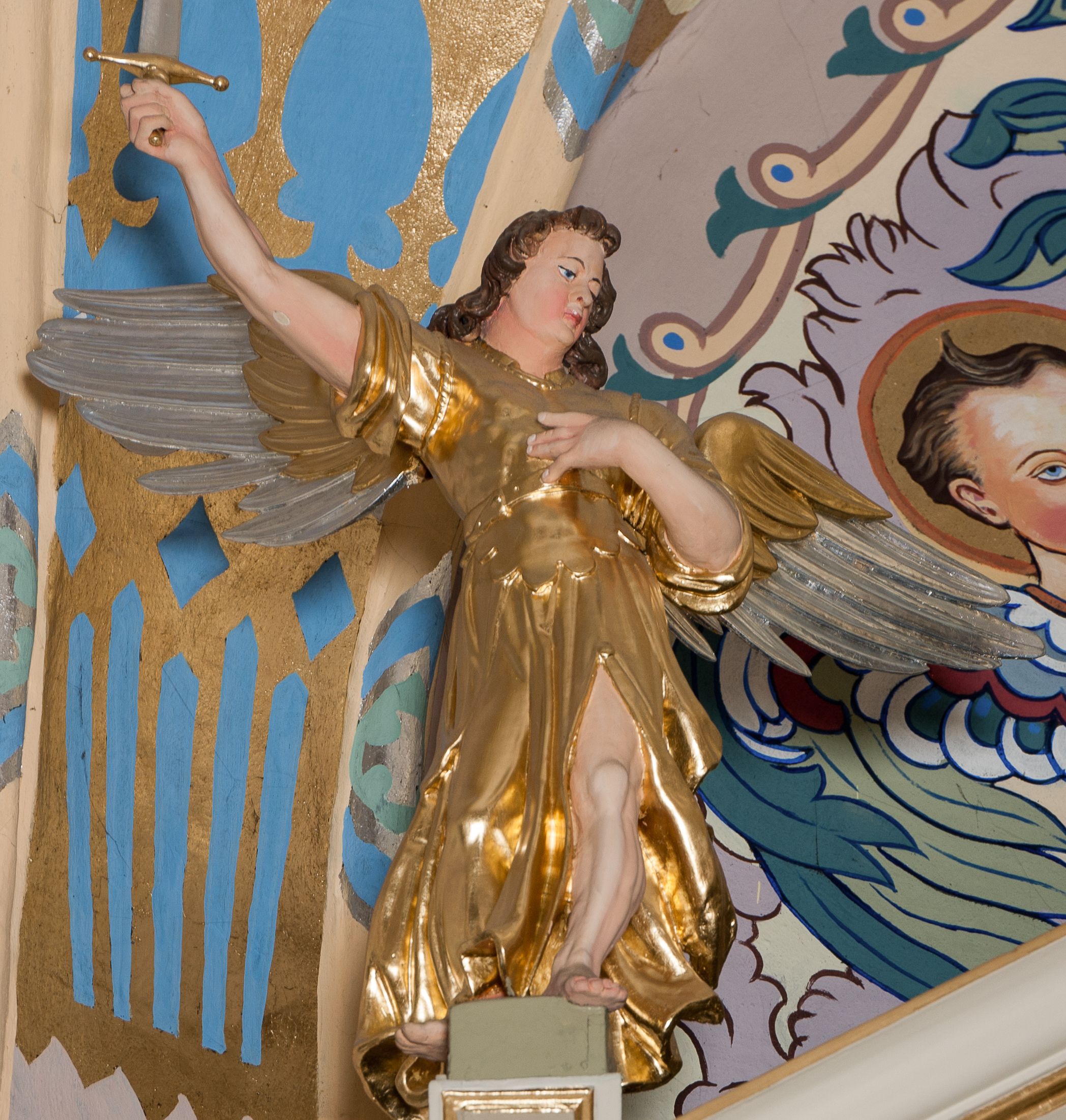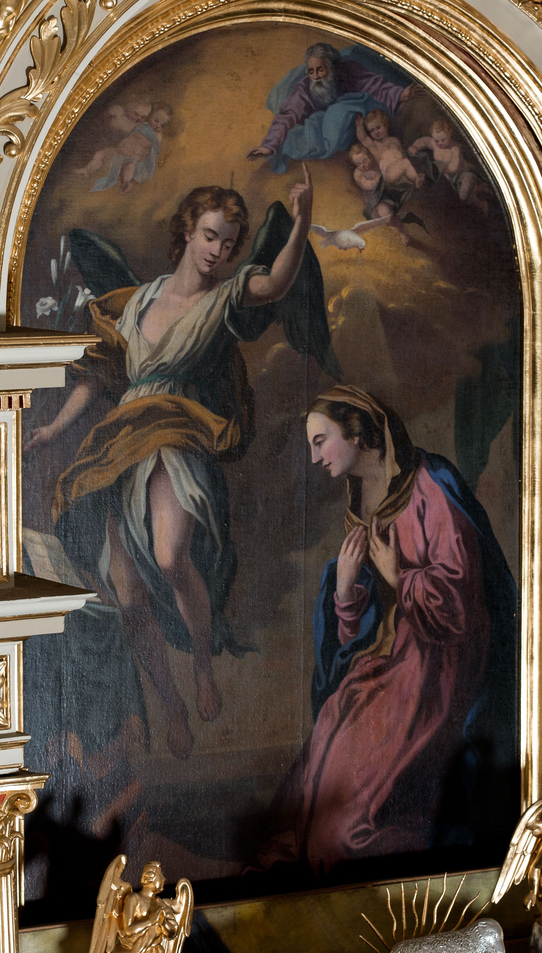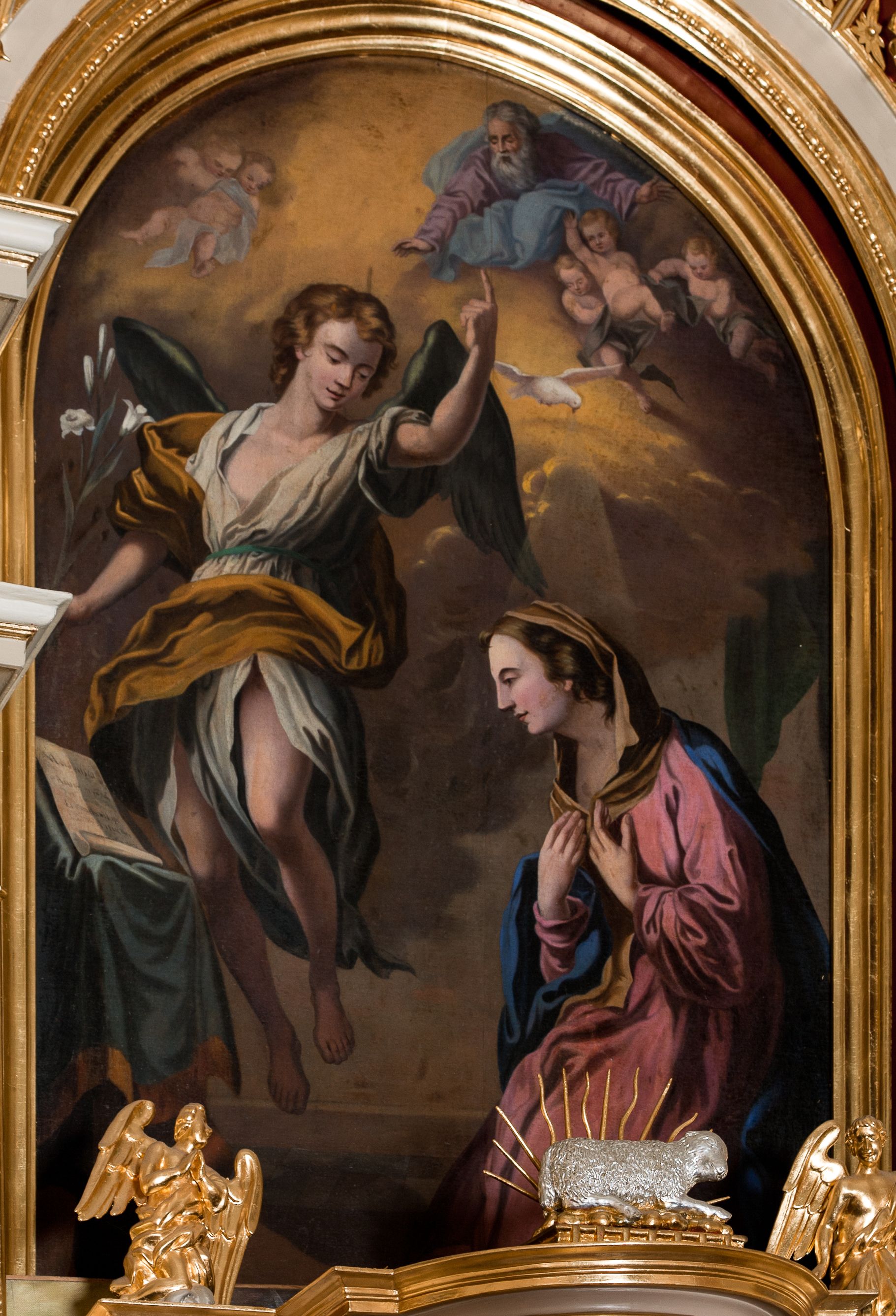 Nastawa ołtarzowa architektoniczna skomponowana na schemacie łuku triumfalnego, trójosiowa, jednokondygnacyjna ze zwieńczeniem. Ołtarz kamienny, licowany marmurowymi płytkami, z kamienną mensą. Oś środkowa jest dwukrotnie wyższa od bocznych i szersza, zamknięta półkoliście. Osie boczne ujęte dwiema parami pilastrów i stojących przed nimi kolumn o kanelowanych trzonach i kapitelach kompozytowych; między nimi nisze zwieńczone konchą z figurami św. Jana Chrzciciela i św. Jana Ewangelisty. Podpory dźwigają dwustrefowe belkowanie – niższe pełne, wyższe niepełne, delikatnie wyłamane na ich linii. Oś środkową ujmują woluty z figurami aniołów spływające na belkowanie osi bocznych; na skraju postumenty z figurami św. Floriana i św. Wacława(?). Postumenty kolumn dekorowane z trzech stron płycinami, od frontu z uskrzydlonymi główkami anielskimi; pomiędzy nimi rollwerki z podpisami figur. Podłucze osi środkowej dekorowane kasetonami z rozetami; archiwolta wypełniona akantem, zwieńczona kluczem; w przyłuczach dwie płaskorzeźbione figury kobiece. Powyżej fryz dekorowany dużych rozmiarów uskrzydloną głową anielską, ujętą wicią roślinną, na gzymsie kartusz. W polu przyczółka roślinny postument podtrzymujący dwie uskrzydlone główki anielskie. W przyłuczach konch osi bocznych ornament roślinny, powyżej rauty, u spodu figur festony. Spód belkowania dekorowany kasetonami z rozetami. Fryzy dwóch stref belkowania wypełnione ornamentem roślinnym i rozetami; na wewnętrznym boku drugiej strefy para herbów Radwan. W polu środkowym obraz ukazujący Zwiastowanie Najświętszej Marii Panny, a na zasuwie Św. Michała Archanioła. Struktura polichromowana na szaro; kolumny, ornamentyka i profile złocone.