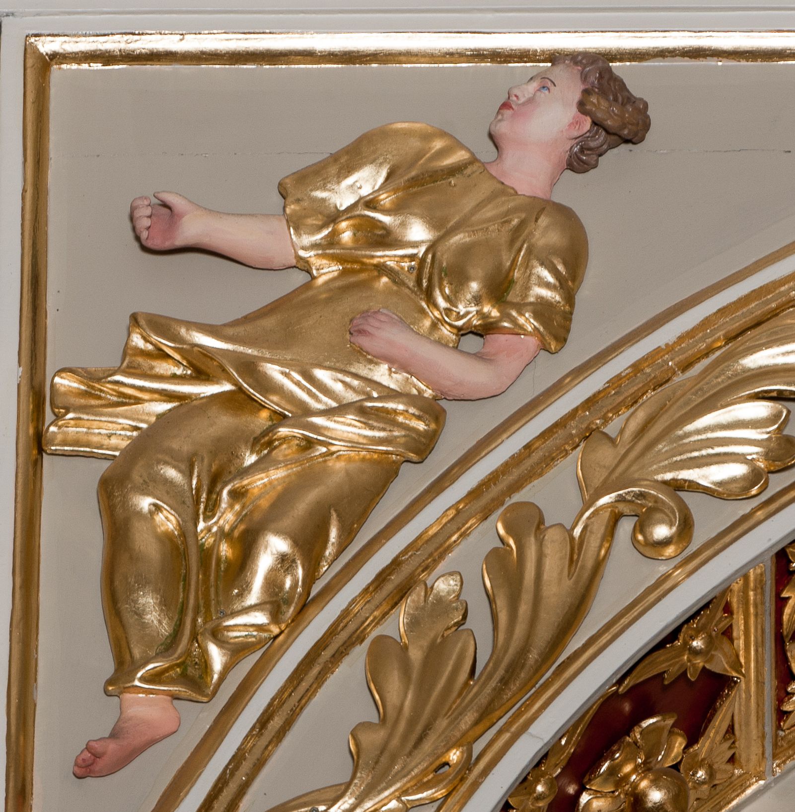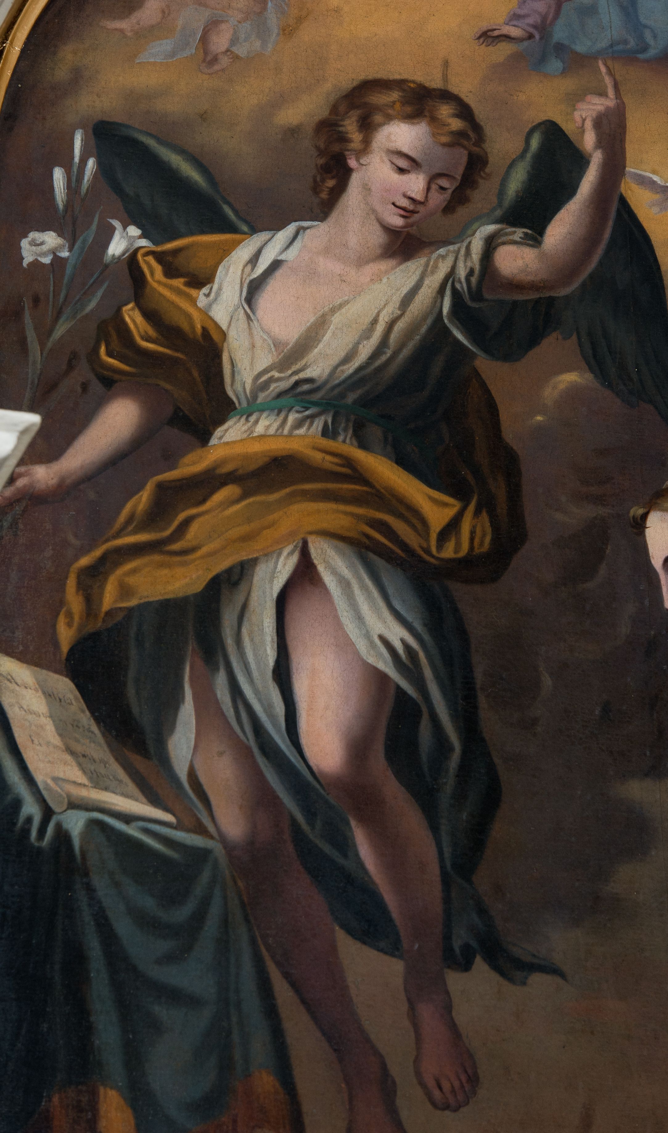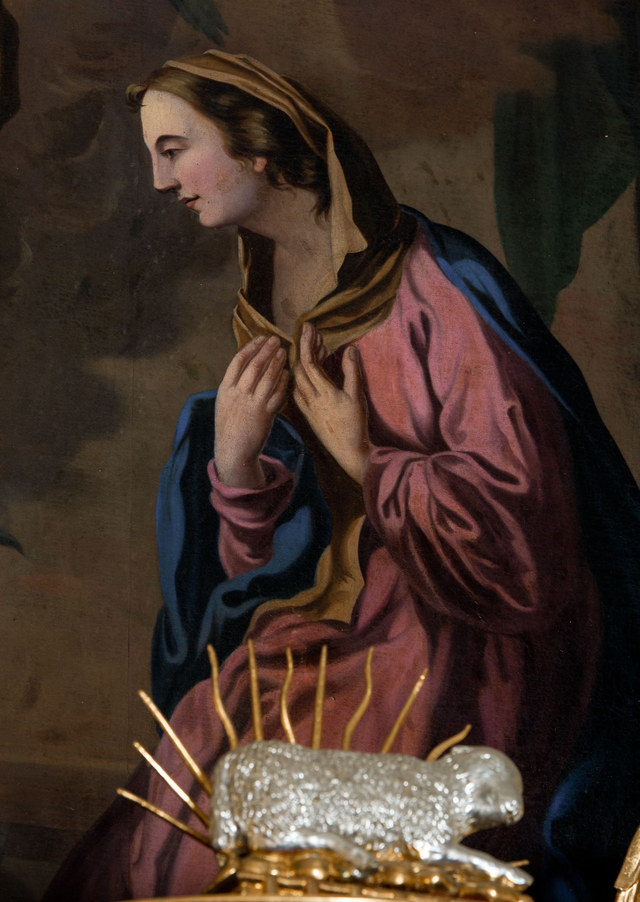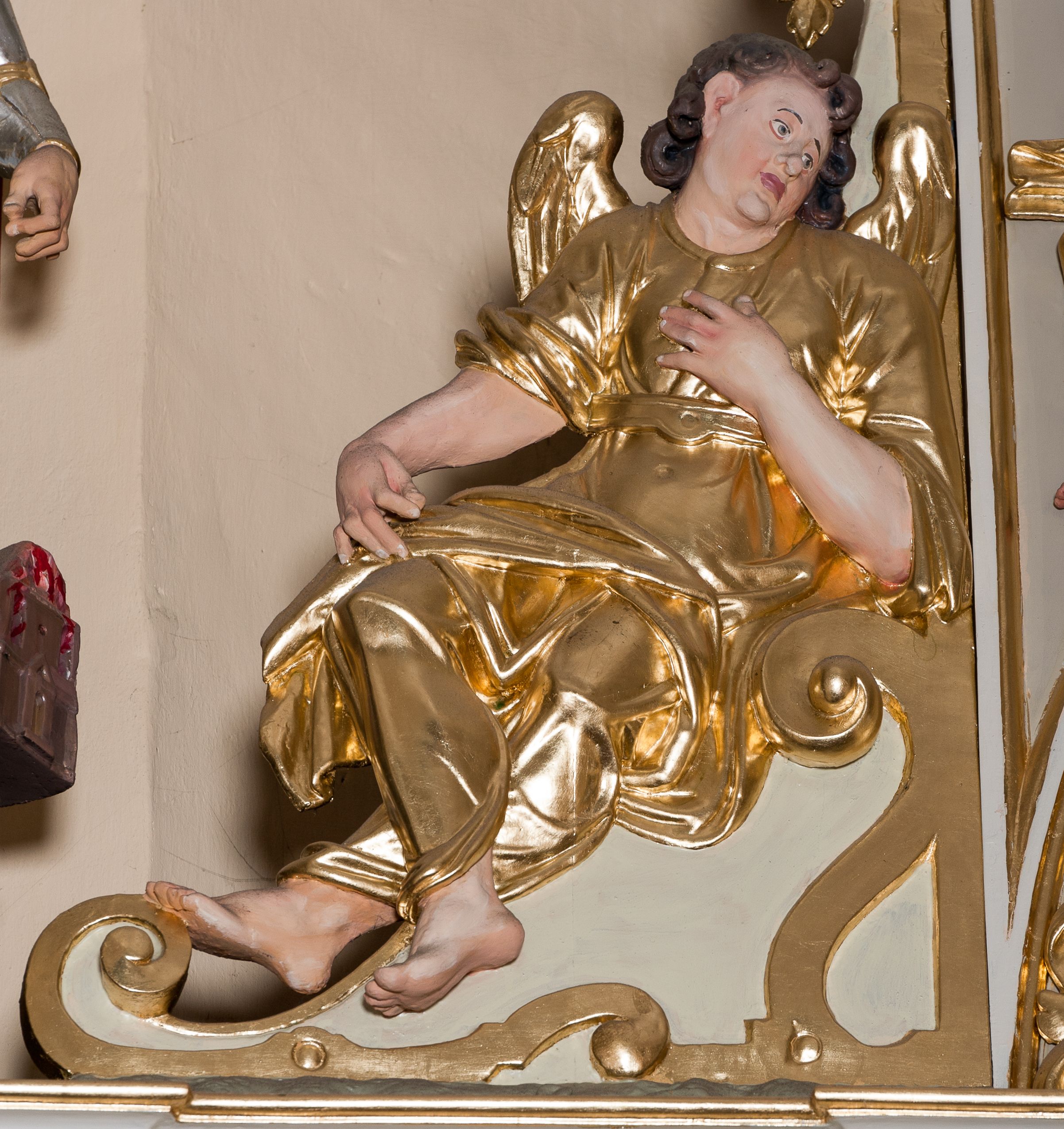 Nastawa ołtarzowa architektoniczna skomponowana na schemacie łuku triumfalnego, trójosiowa, jednokondygnacyjna ze zwieńczeniem. Ołtarz kamienny, licowany marmurowymi płytkami, z kamienną mensą. Oś środkowa jest dwukrotnie wyższa od bocznych i szersza, zamknięta półkoliście. Osie boczne ujęte dwiema parami pilastrów i stojących przed nimi kolumn o kanelowanych trzonach i kapitelach kompozytowych; między nimi nisze zwieńczone konchą z figurami św. Jana Chrzciciela i św. Jana Ewangelisty. Podpory dźwigają dwustrefowe belkowanie – niższe pełne, wyższe niepełne, delikatnie wyłamane na ich linii. Oś środkową ujmują woluty z figurami aniołów spływające na belkowanie osi bocznych; na skraju postumenty z figurami św. Floriana i św. Wacława(?). Postumenty kolumn dekorowane z trzech stron płycinami, od frontu z uskrzydlonymi główkami anielskimi; pomiędzy nimi rollwerki z podpisami figur. Podłucze osi środkowej dekorowane kasetonami z rozetami; archiwolta wypełniona akantem, zwieńczona kluczem; w przyłuczach dwie płaskorzeźbione figury kobiece. Powyżej fryz dekorowany dużych rozmiarów uskrzydloną głową anielską, ujętą wicią roślinną, na gzymsie kartusz. W polu przyczółka roślinny postument podtrzymujący dwie uskrzydlone główki anielskie. W przyłuczach konch osi bocznych ornament roślinny, powyżej rauty, u spodu figur festony. Spód belkowania dekorowany kasetonami z rozetami. Fryzy dwóch stref belkowania wypełnione ornamentem roślinnym i rozetami; na wewnętrznym boku drugiej strefy para herbów Radwan. W polu środkowym obraz ukazujący Zwiastowanie Najświętszej Marii Panny, a na zasuwie Św. Michała Archanioła. Struktura polichromowana na szaro; kolumny, ornamentyka i profile złocone.