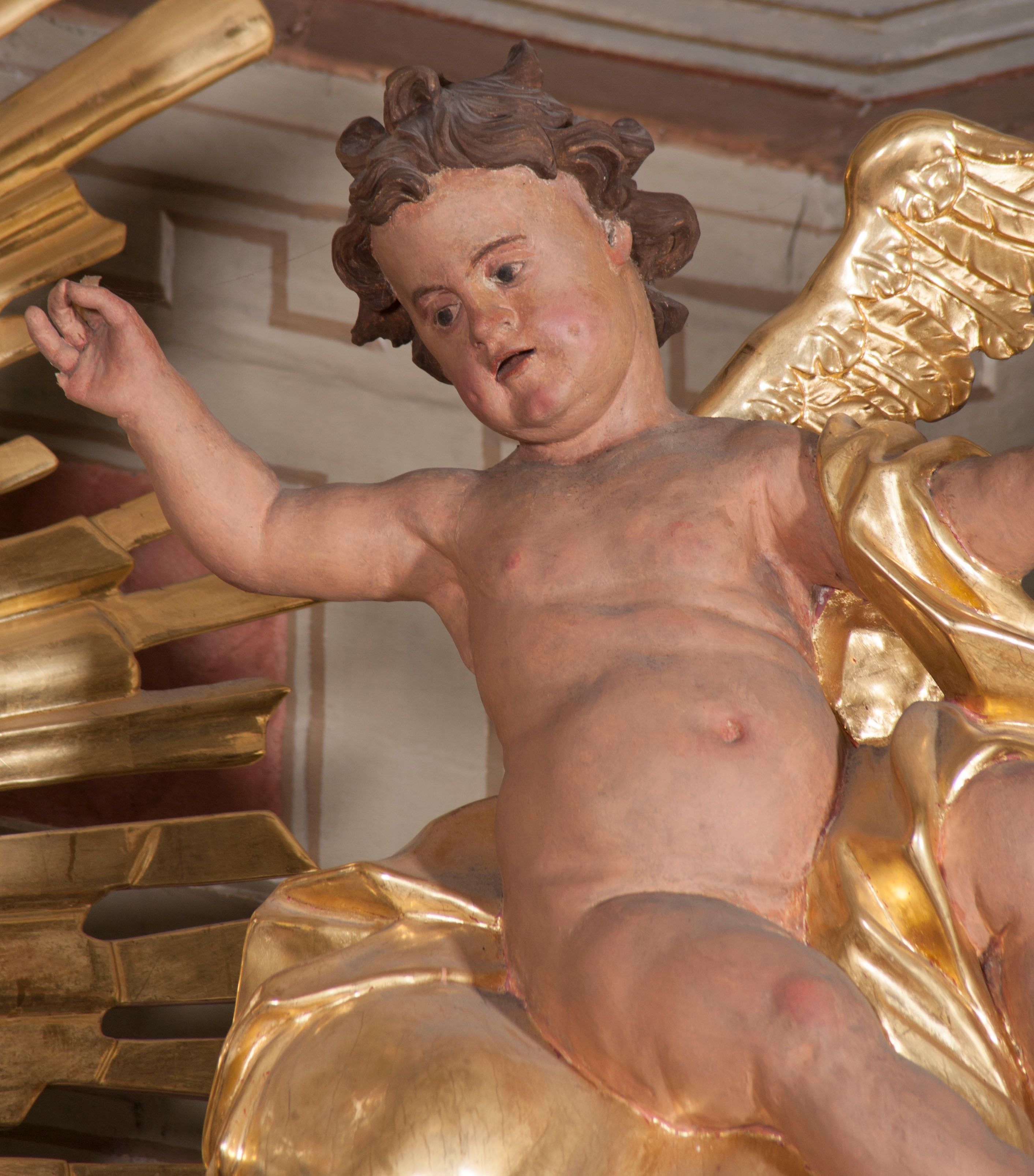 Drobne ubytki polichromii i złoceń. Ołtarz odnawiany w latach 1886-1887, 1958, 1997.