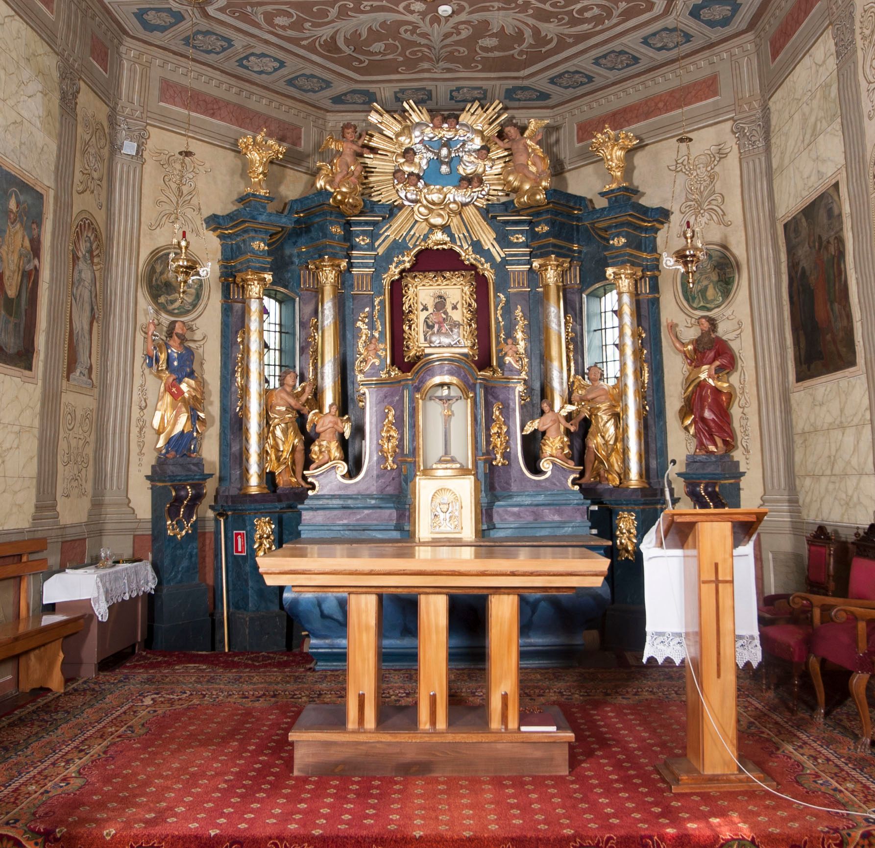 Nastawa ołtarzowa architektoniczna, trójosiowa, jednokondygnacyjna, ustawiona na wysokim cokole. Ołtarz wolnostojący, odsunięty od retabulum, drewniany, sarkofagowy z drewnianą mensą, na nim ustawione tabernakulum. Nastawa opasująca trójbocznie zamknięte prezbiterium, osie wydzielone czterema parami pilastrów o trzonach dekorowanych rocaille'em, przed którymi stoją cztery kolumny o kapitelach kompozytowych i trzonach z dekoracją geometryczną, dźwigających imposty. W polu środkowym nisza w formie stojącego prostokąta zamkniętego łukiem segmentowym nadwieszonym z uskokiem, ujęta profilowaną ramą dekorowaną rocaille'em z dużo mniejszym obrazem Matki Boskiej Nieustającej Pomocy w osobnej ramie na czerwonym tle. Osie boczne przeprute oknami w formie stojącego prostokąta zamkniętego łukiem segmentowym, na ich tle stoją figury aniołów. Nad polem głównym medalion z obłoków i uskrzydlonych główek anielskich z gołębicą Ducha Świętego w glorii promienistej. Na belkowaniu, na osi wewnętrznych impostów dwa siedzące na obłokach putta, na osi zewnętrznych rokokowe wazony. Nastawa flankowana dwoma przyściennymi cokołami, na których stoją figury św. Piotra i św. Pawła. Struktura architektoniczna polichromowana na sposób imitujący niebiesko-białą marmoryzację, trzony pilastrów fioletową. Ornamentyka, profile, kolumny i gloria pozłacane i posrebrzane.