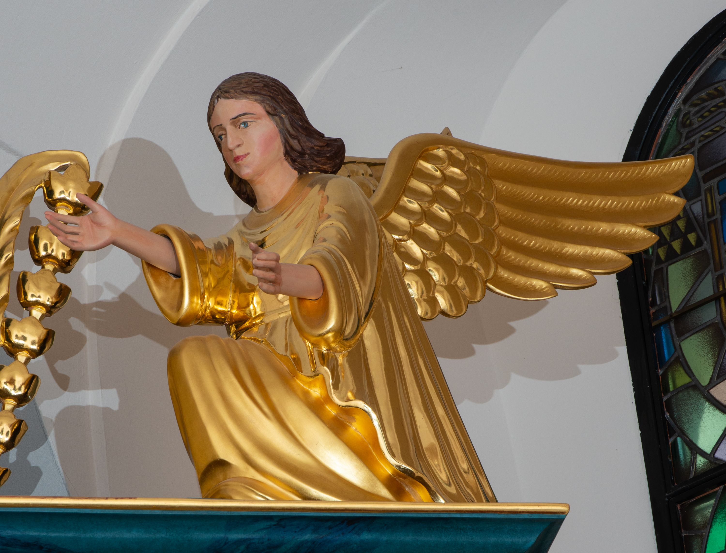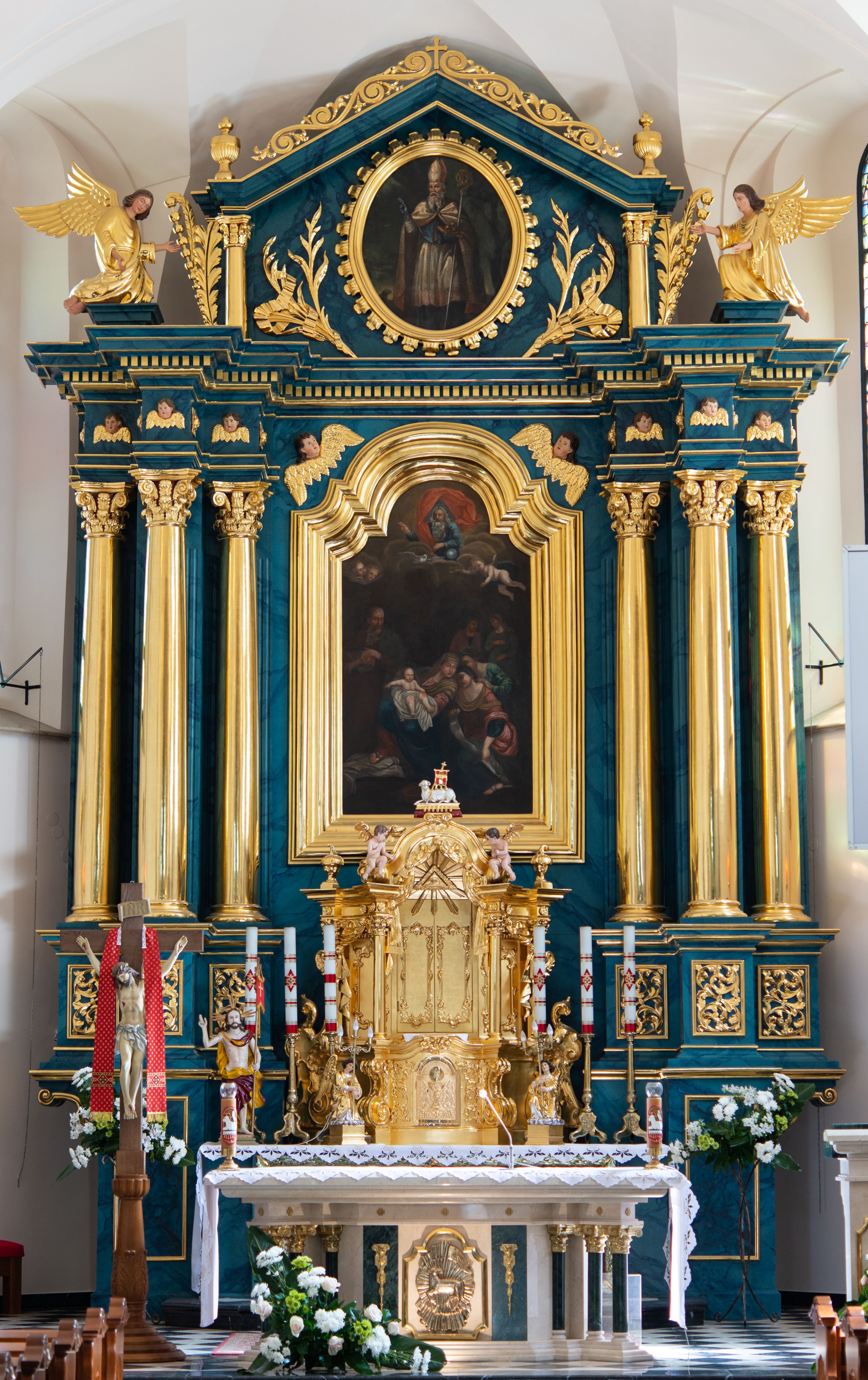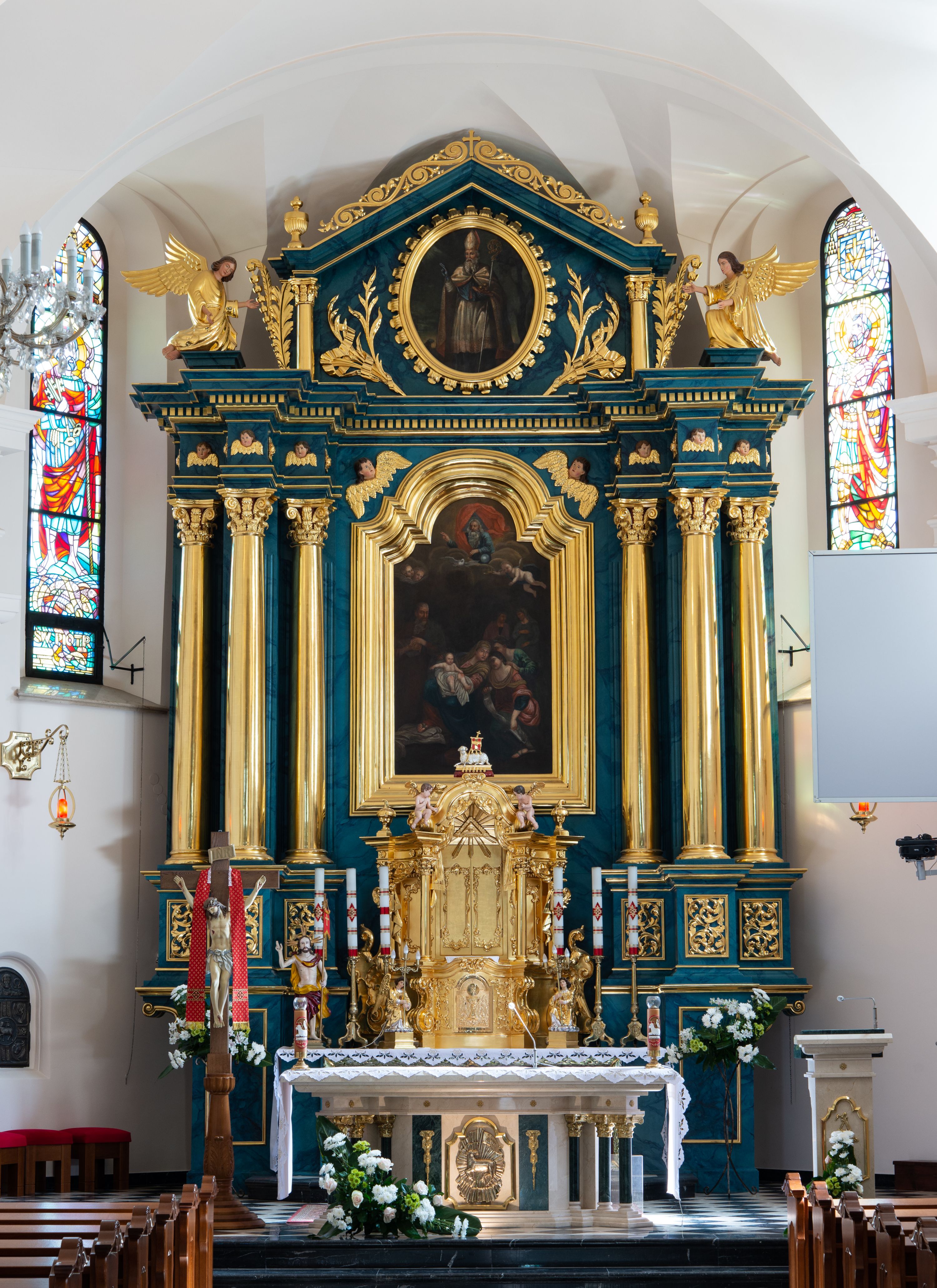 Retabulum osadzone na zdwojonym cokole, w górnej partii o zryzalitowanych bokach. Część środkową ujmują trzy pary kolumn, z których środkowe wysunięte, wspierających przerwane w partii architrawu i fryzu belkowanie. Zwieńczenie ujęte parą kolumn wspierających gzyms w formie trójkątnego przyczółka. Pola cokołu retabulum wypełnia stylizowana ornamentyka roślinna, partie fryzu oraz górne naroża części środkowej zdobią uskrzydlone główki anielskie, a gzyms kostkowanie. Zwieńczenie ujęte po bokach motywem liści paproci, pole ulistnionymi gałązkami z wstążką. Krawędź gzymsu wieńczącego zdobi wić roślinna z krzyżem pośrodku, po bokach para wazonów. Całość ujmuje para figur klęczących aniołów. Pole części środkowej w kształcie stojącego prostokąta ujętego profilowaną, złoconą ramą z przedstawieniem Narodzenia Najświętszej Marii Panny. W zwieńczeniu obraz w kształcie stojącego owalu, ujętego ramą zdobioną akantowymi liśćmi, z wizerunkiem św. Mikołaja. Struktura marmoryzowana w odcieniach błękitów, detal architektoniczny i ornamentyka złocone.