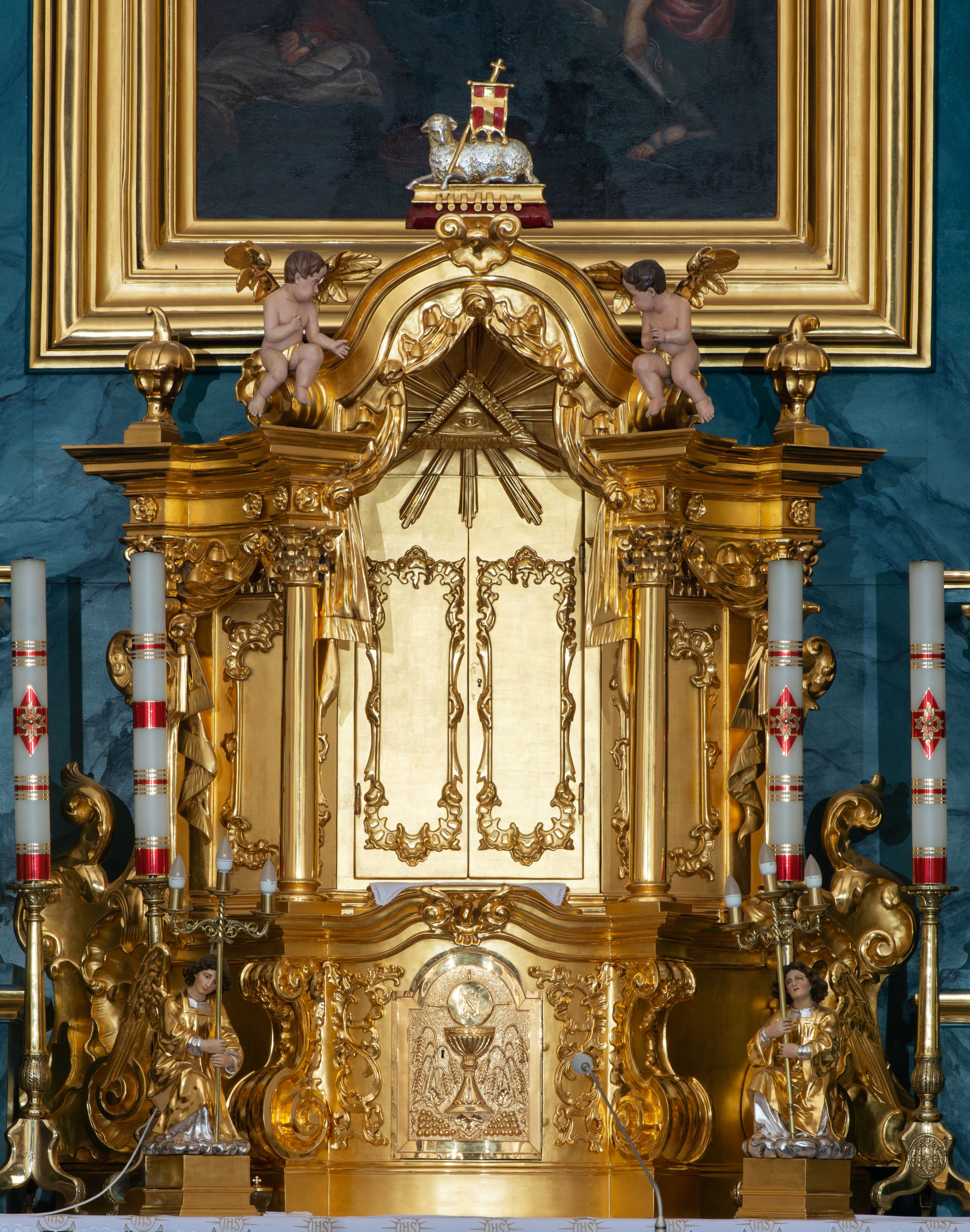 Ołtarz przyścienny, jednokondygnacyjny, jednoosiowy, ze zwieńczeniem. Ołtarz prostopadłościenny, tabernakulum z tronem wystawienia w formie architektonicznej na rzucie trapezoidalnym. W przedniej ściance wysokiego cokołu, o narożach ujętych spływami wolutowymi, są drzwiczki w kształcie prostokąta zamkniętego półkolistym łukiem nadwieszonym zdobione płaskorzeźbionym przedstawieniem kielicha eucharystycznego. Cokół wieńczy gzyms przekształcający się pośrodku w parę stykających się wolut. Na występach nad spływami cokołu osadzone kolumienki wspierające wyłamujące się ponad nimi belkowanie baldachimu tronu wystawienia. Zwieńczenie w formie pary stykających się spływów wolutowych z motywem paludamentu. Zaplecek zdobiony płycinami z ornamentalnymi obramieniami z motywami rocaille’u, w górnej partii płaskorzeźbiony trójkąt z okiem Opatrzności Bożej ujęty promienistą glorią. W zwieńczeniu para wazonów i para figurek aniołków, na szczycie księga z siedmioma pieczęciami i leżącym barankiem paschalnym.