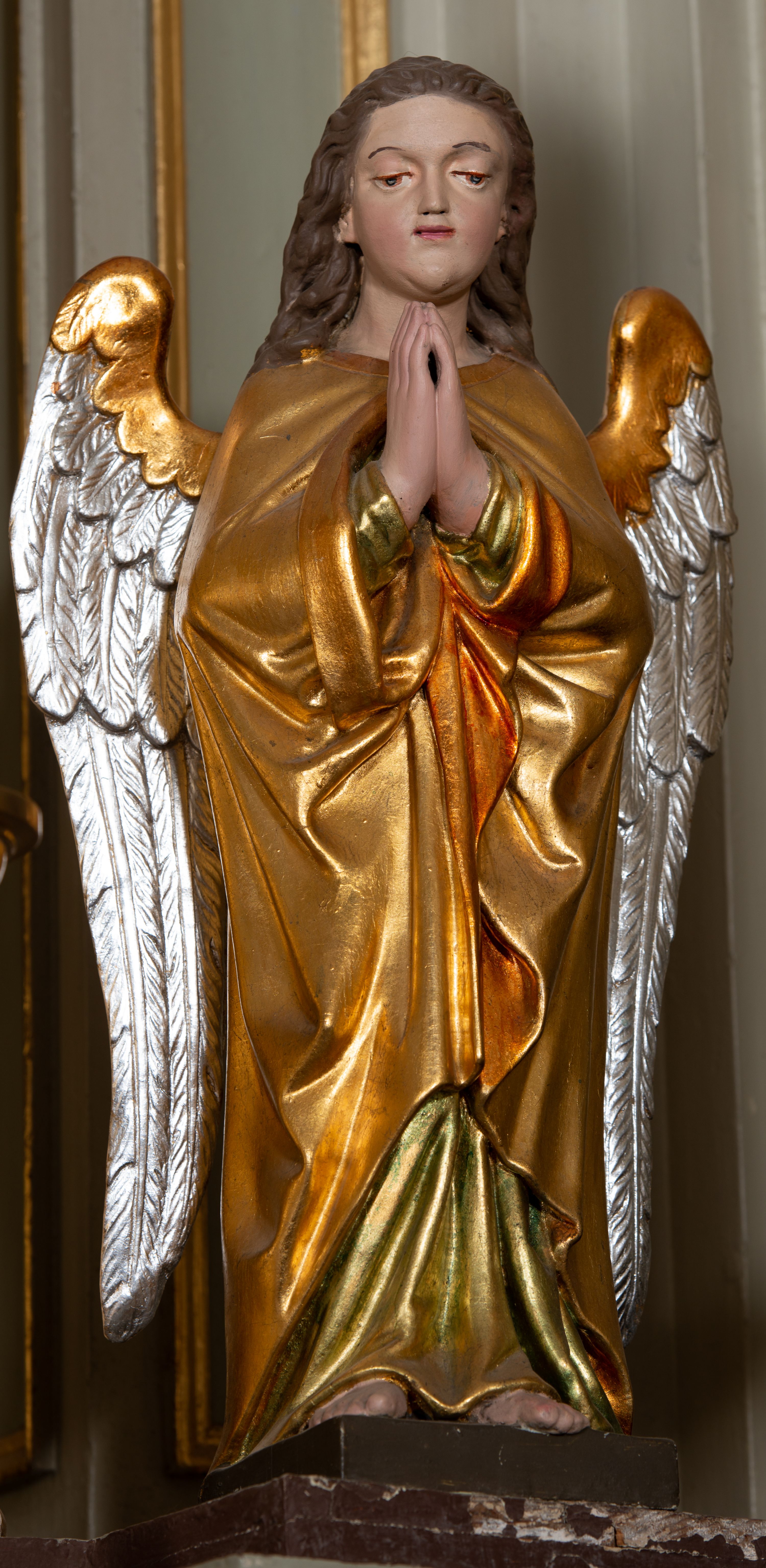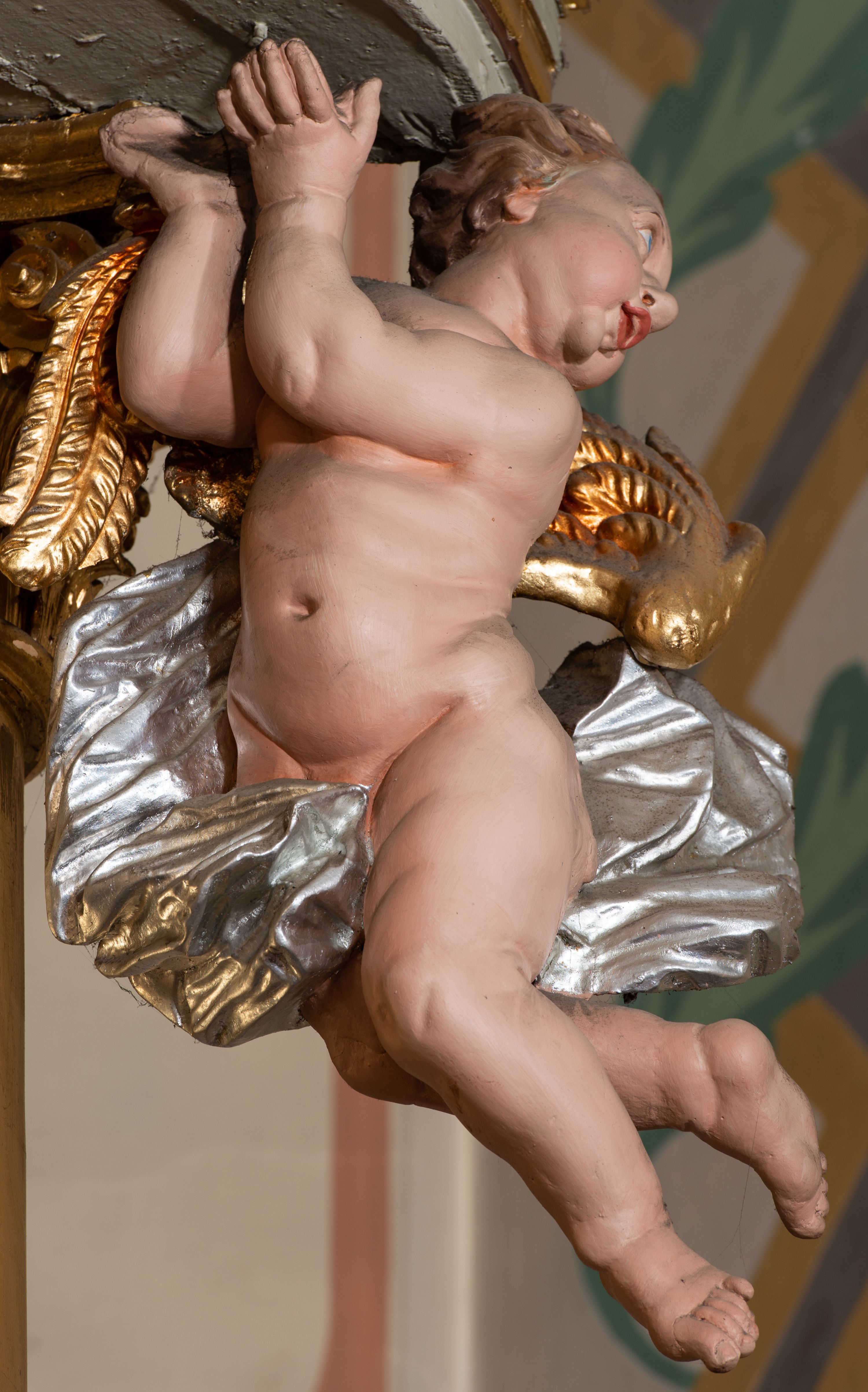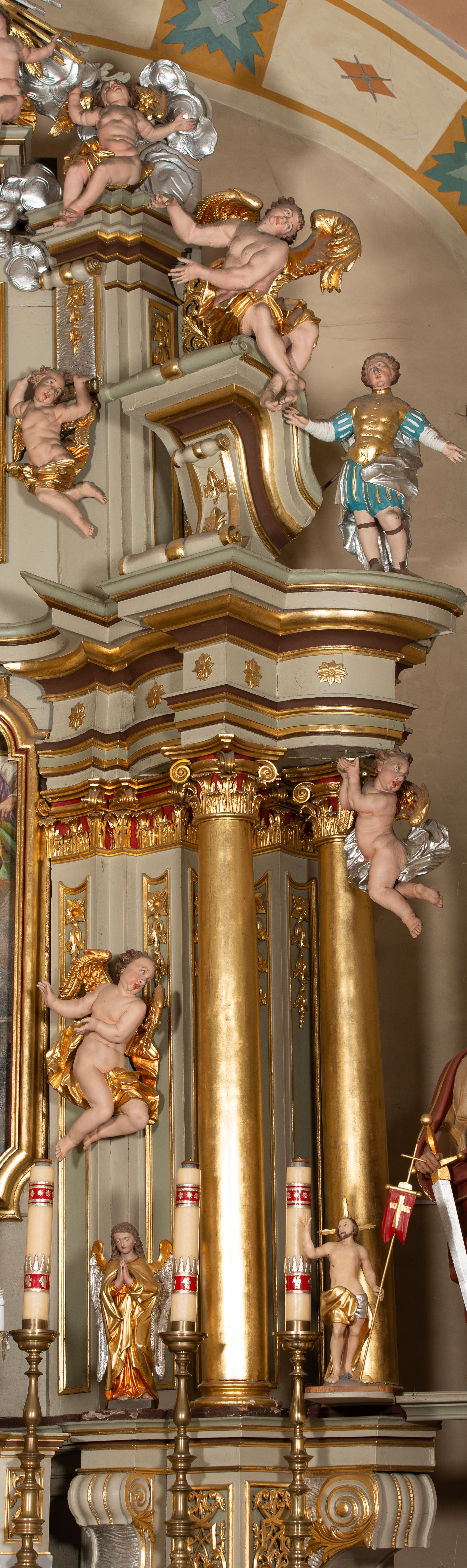 Rzeźby stanowiące dekorację ołtarza charakteryzuje miękkie i bardzo plastyczne kształtowanie pulchnego ciała, o silnych efektach światłocieniowych oraz swoboda w pełnym gracji upozowaniu. Wszystkie figury i putta z ołtarza mają znamienny typ twarzy, modelowany niezwykle plastycznie o specyficznych cechach anatomicznych, takich jak szeroko otwarte oczy, czasem z głęboko rzeźbionymi powiekami, zadarty nos oraz szeroko otwarte, pełne, małe usta i wyodrębniony okrągły podbródek. Ten sam rzeźbiarz wykonał figurę anioła dmącego w trąbę z baldachimu ambony w Stryszowie. Rzeźba została najpewniej wykonana przez nieznany dotychczas krakowski warsztat, który zrealizował dwa ołtarze boczne wraz z ich rzeźbą figuralną w kościele w Igołomi, jak również dwa ołtarze boczne w Spytkowicach (koło Chabówki).