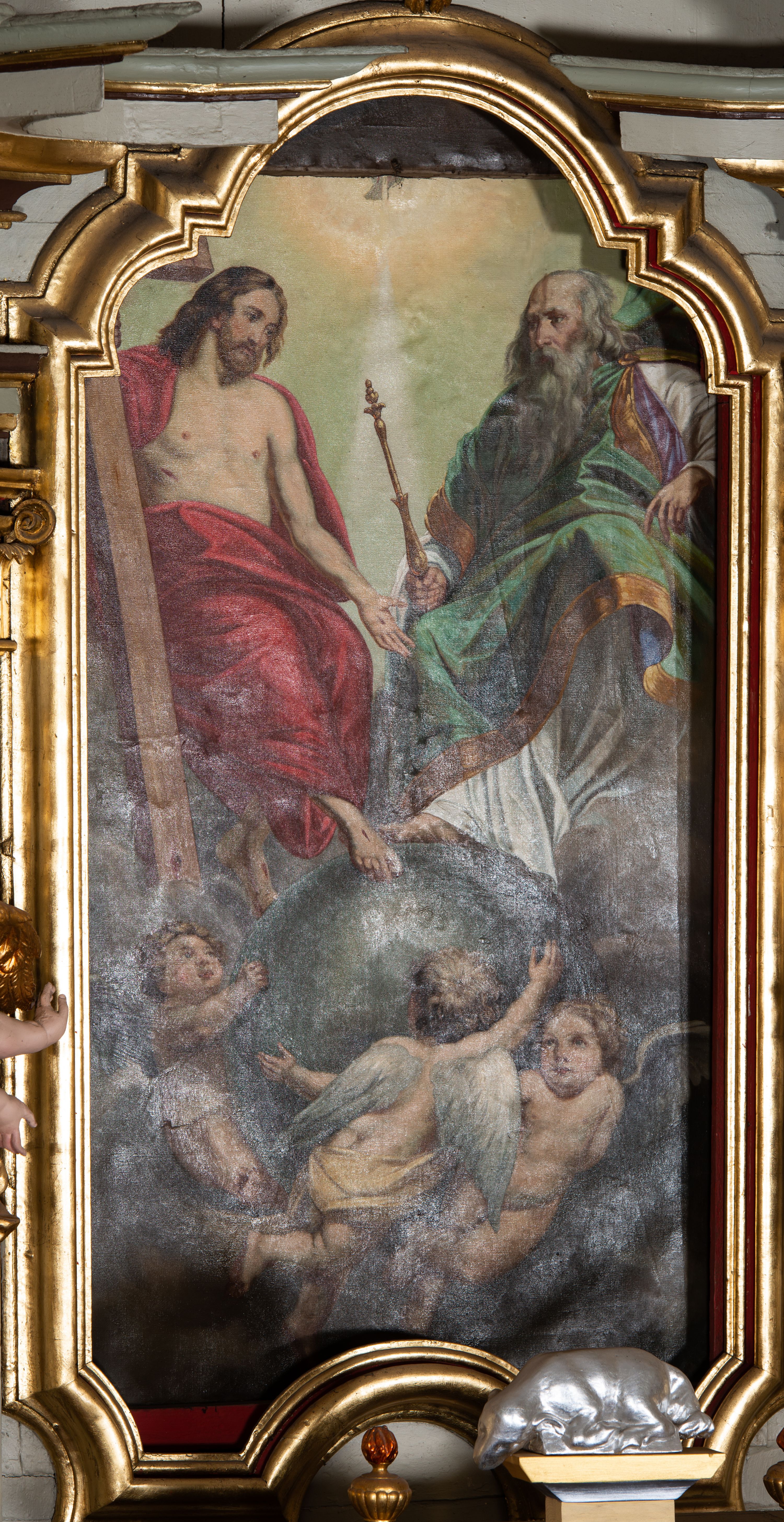 Retabulum na dwustrefowym, uskokowym cokole ustawionym pod kątem, w górnej strefie z wyodrębnionymi po bokach postumentami i konsolami. Nastawa ujęta dwiema parami kolumn kompozytowych ustawionych na tle uskokowych, zwróconych pod kątem filarów, o trzonach dekorowanych płycinami z kampanulami. Podpory oraz dwa putta dźwigają wyłamane na ich osi, odcinkami wklęsło-wypukłe, pełne belkowanie, przerwane nad polem środkowym, z fryzem dekorowanym rozetami oraz fragmenty przerwanego, falistego przyczółka z siedzącymi na nim figurami aniołów. Na zewnętrznych krawędziach belkowania ustawione dwie figury w strojach żołnierzy. W polu środkowym nisza w formie stojącego prostokąta zamkniętego trójlistnie z uskokiem, o wklęsłych dolnych narożach, ujęta profilowaną ramą, z obrazem Trójcy Świętej i flankowana parą puttów.
