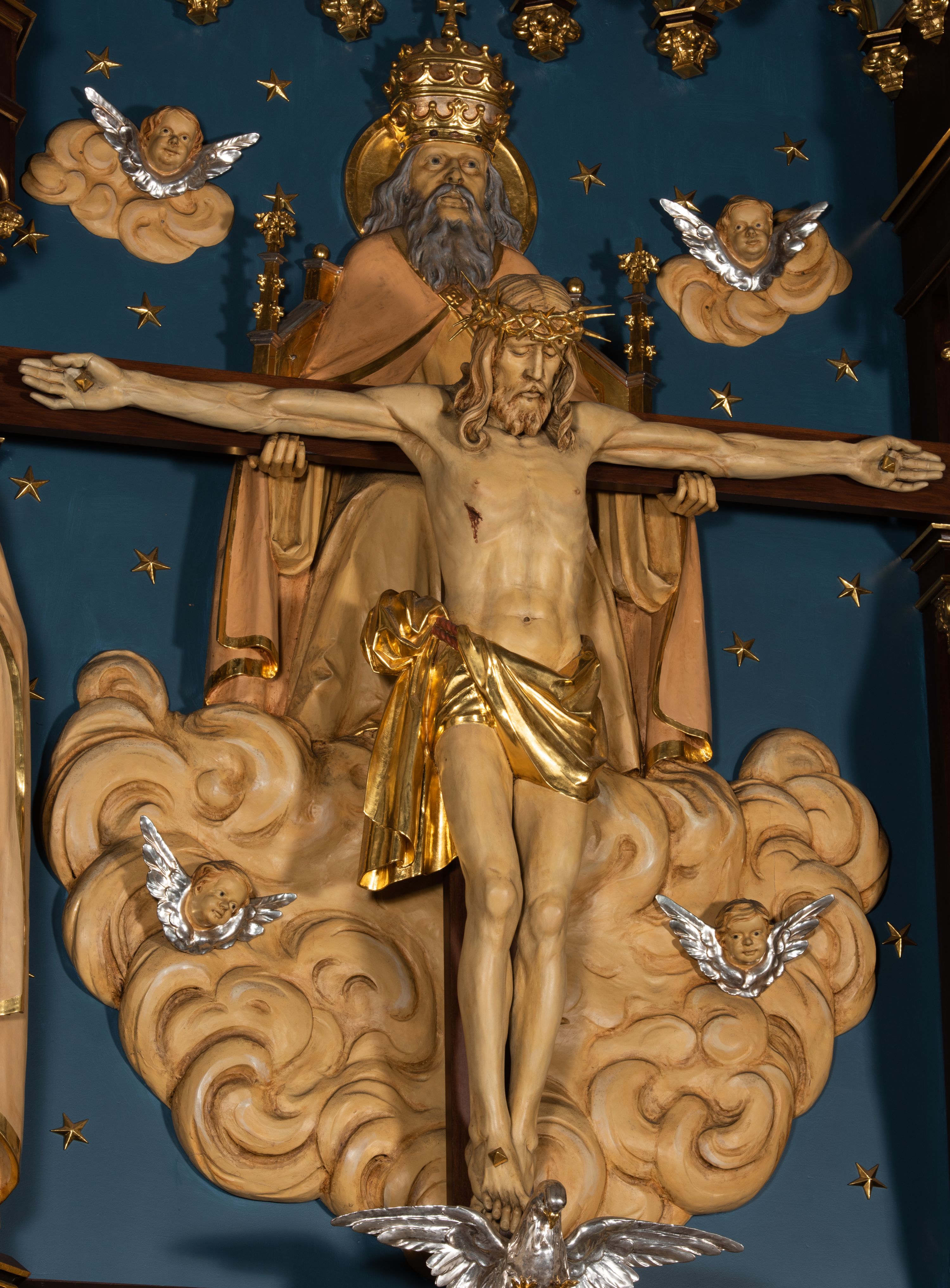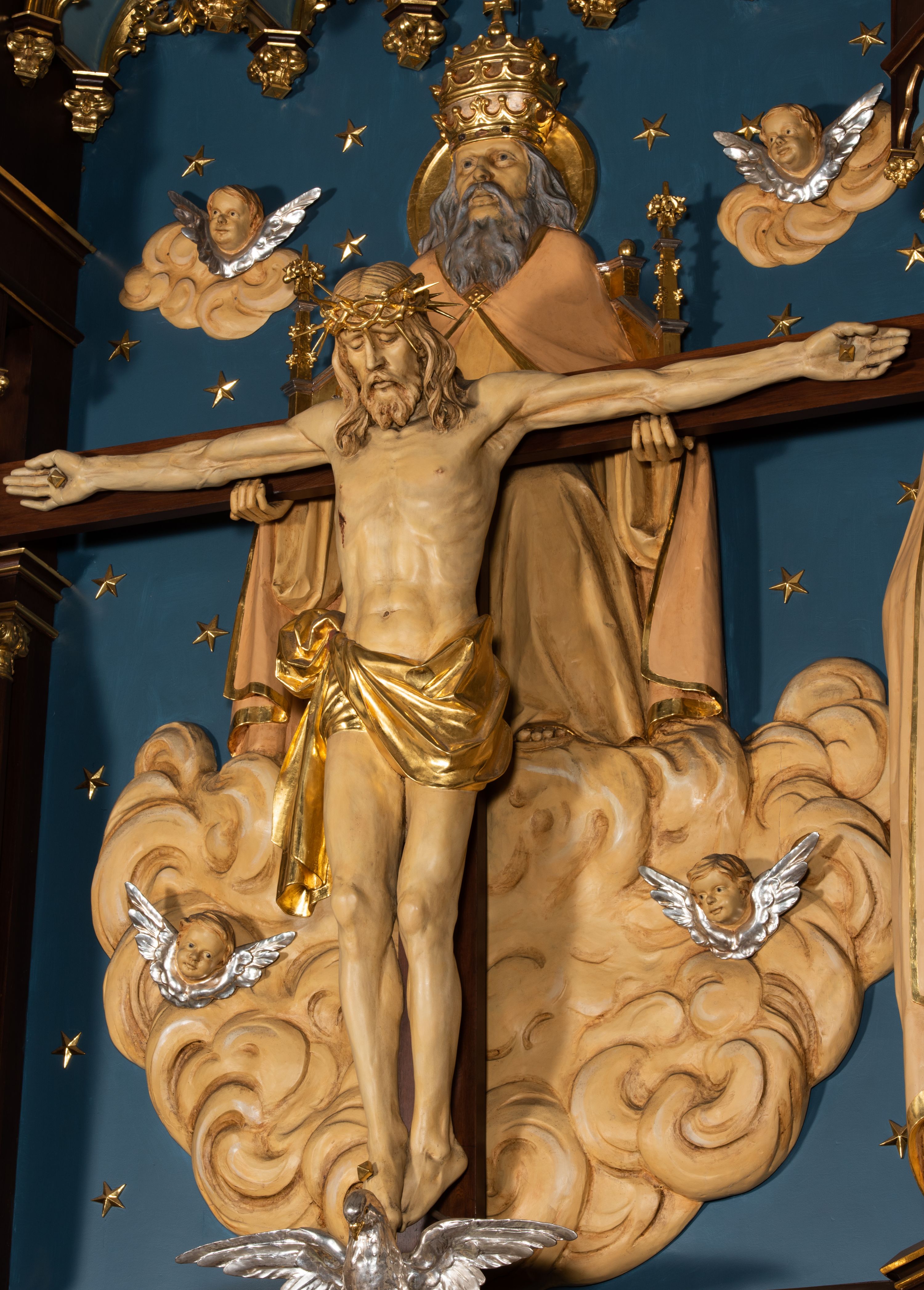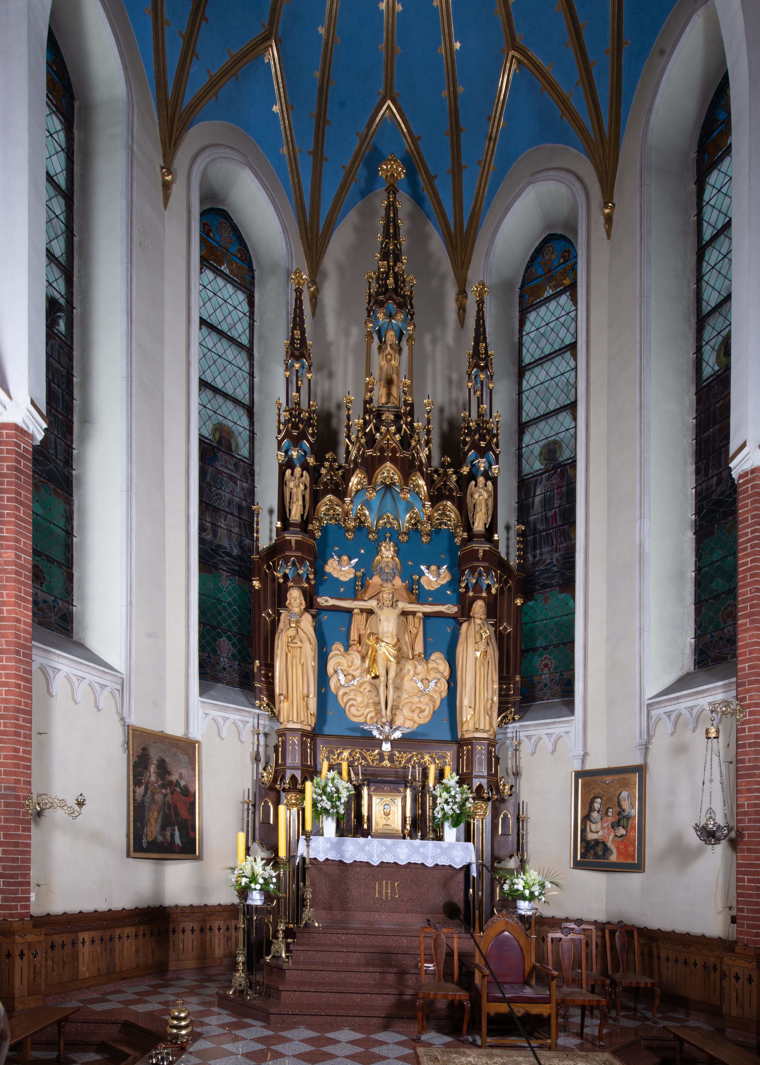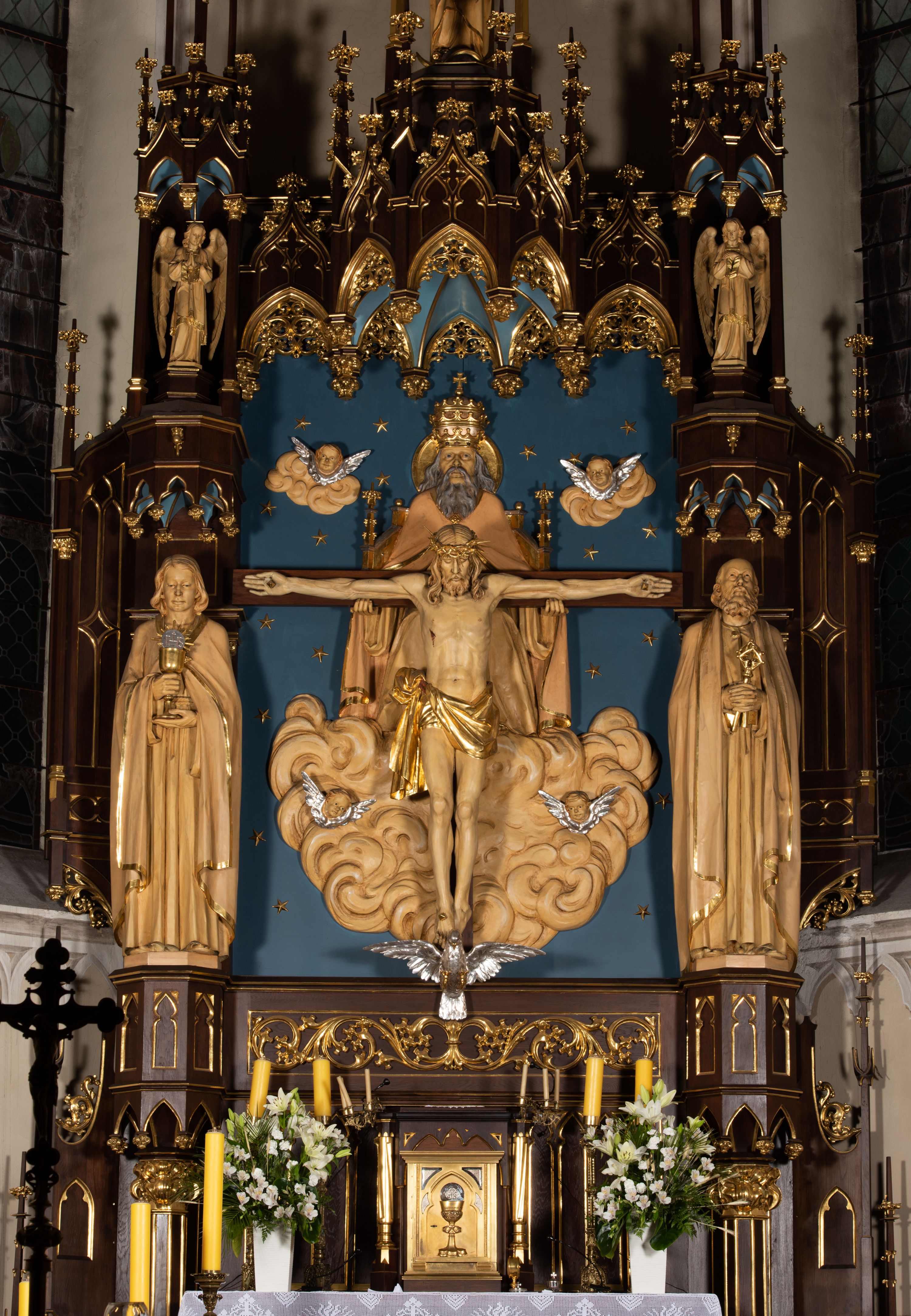 Nastawa flankowana dwiema dwukondygnacyjnymi wieżyczkami na planie ośmioboku z figurami św. Jana Ewangelisty i św. Piotra w pierwszej kondygnacji oraz figurami aniołów w drugiej. Figury apostołów ustawione są na ośmiobocznych wspornikach zdobionych od dołu arkadowaniem z kwiatonami, podtrzymywanych przez ośmioboczne kolumienki, flankujące kamienny ołtarz. Nad figurami ośmioboczne baldachimy zdobione od dołu arkadowaniem z kwiatonami, stanowiące podstawę dla figur aniołów, które zwieńczone są analogicznymi ośmiobocznymi baldachimami i rozbudowanymi pinaklami. W polu środkowym rzeźbiona Trójca Święta ukazana jako Tron łaski pośród obłoków i uskrzydlonych główek anielskich. Nad nią duży, ośmioboczny baldachim, zdobiony od dołu arkadowaniem, zakończonym kwiatonami, dekorowany maswerkami, wimpergami i kwiatonami, naprzemiennie z pinaklami, który stanowi podstawę wieżyczki wieńczącej ołtarz. W jej polu ustawiona figura Matki Boskiej, nad nią ośmioboczny baldachim zdobiony od dołu arkadowaniem i kwiatonami, zakończony dużym pinaklem dekorowanym żabkami. Nastawa flankowana uszami w formie przypór dekorowanych maswerkiem i wąskimi kolumienkami z pinaklami.