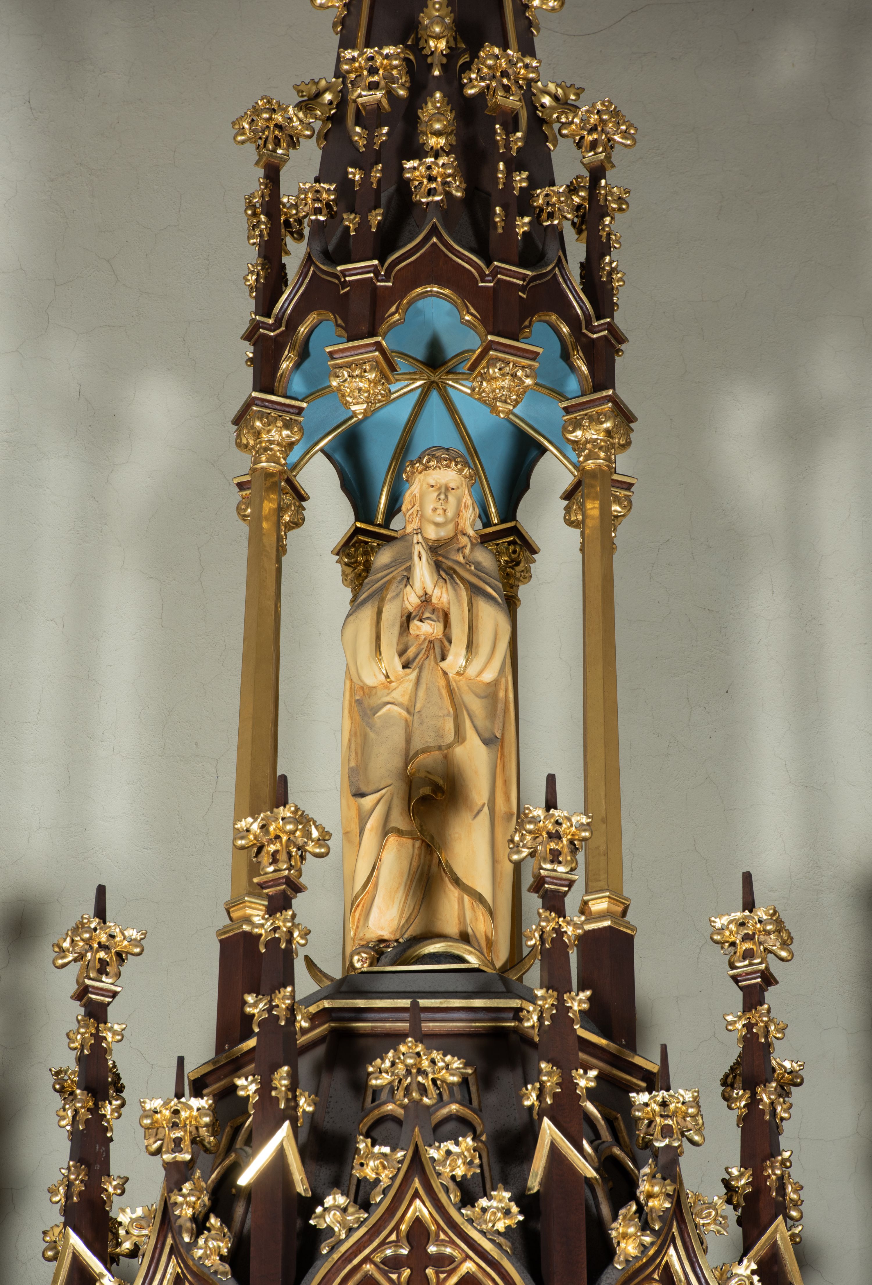 Struktura politurowana w kolorze ciemnobrązowym, detale i ornamentyka złocone, tło pola głównego oraz podniebienia baldachimów błękitne.