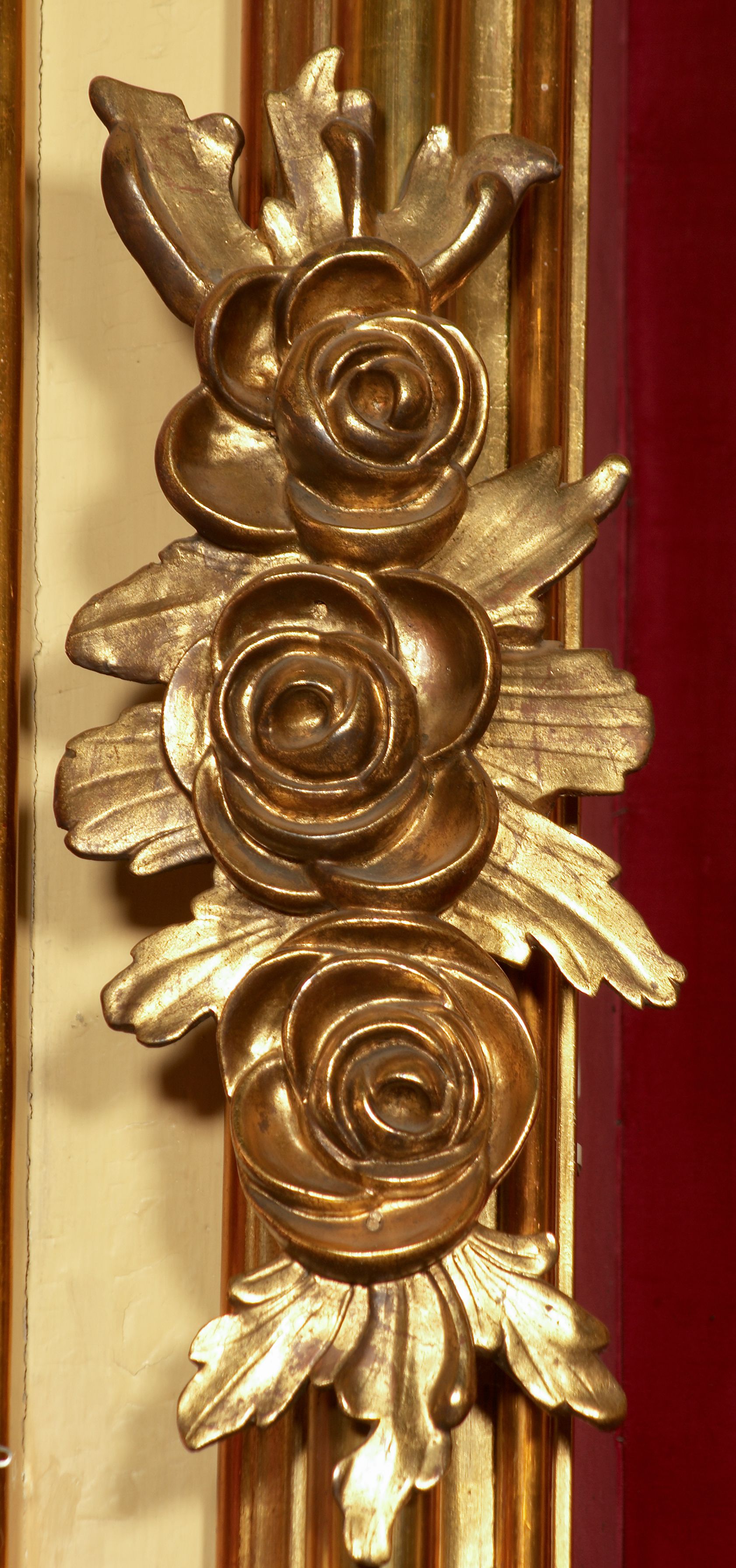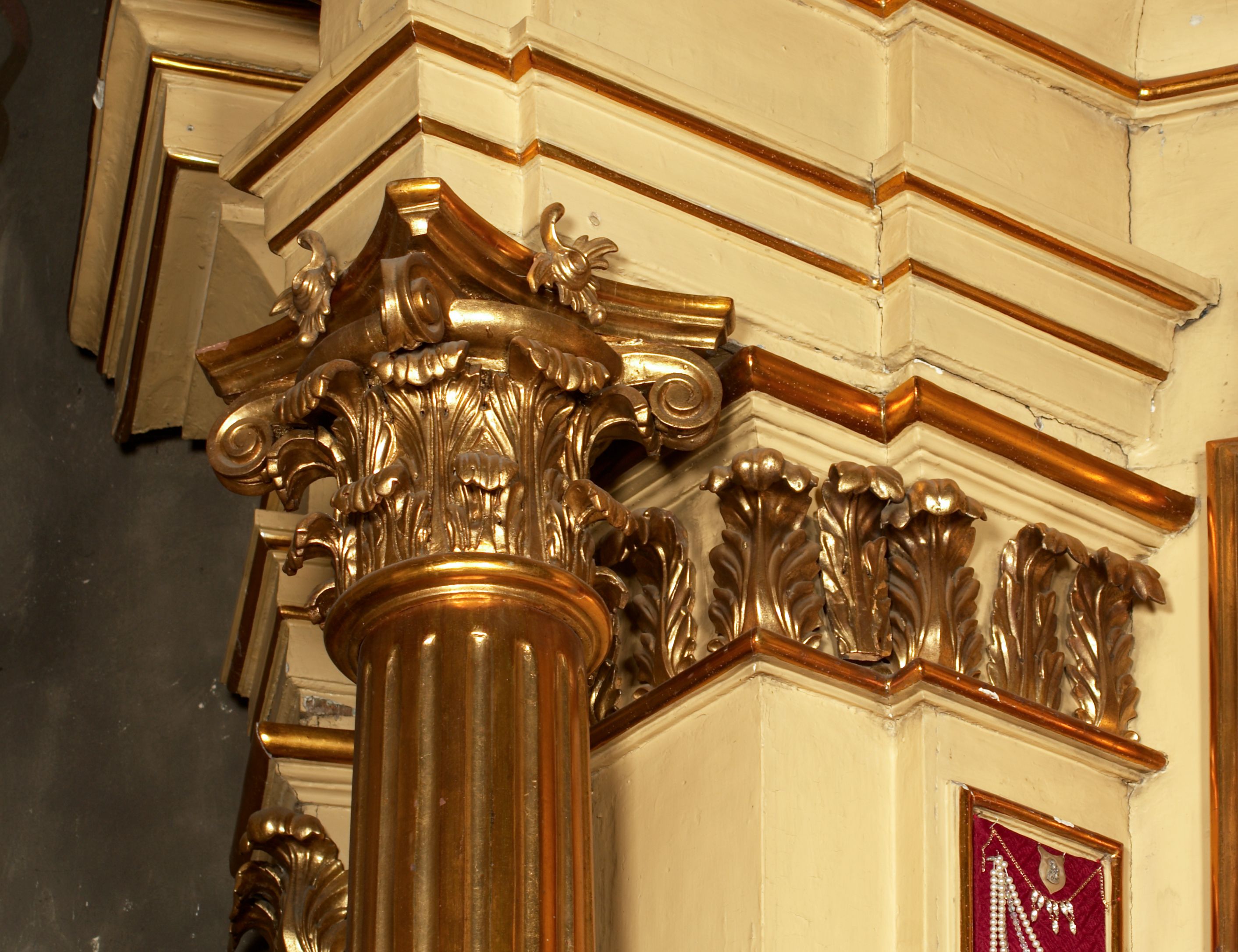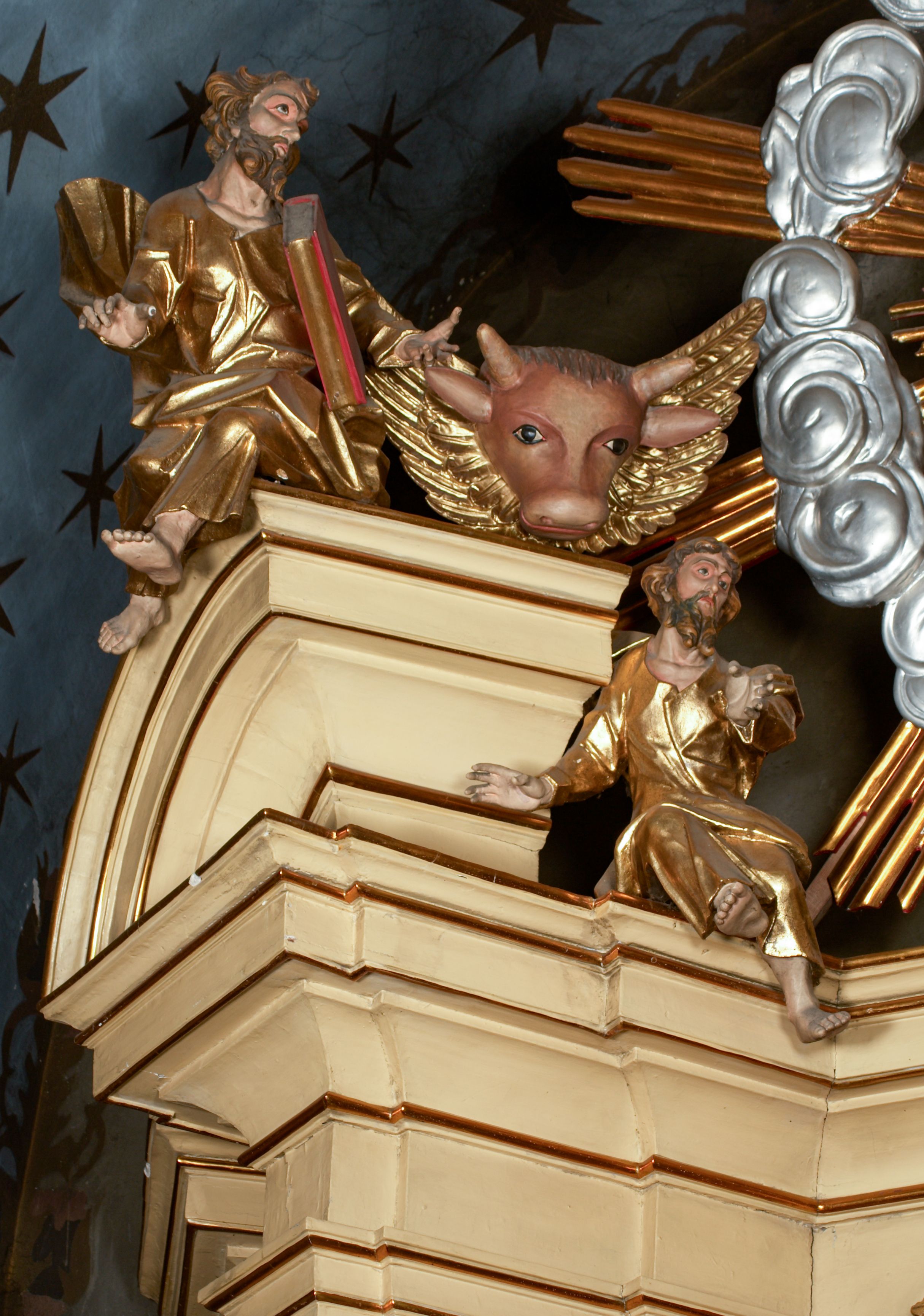 Struktura ołtarza utrzymana jest w kolorze kremowym, detal architektoniczny i ornamentyka są złocone.