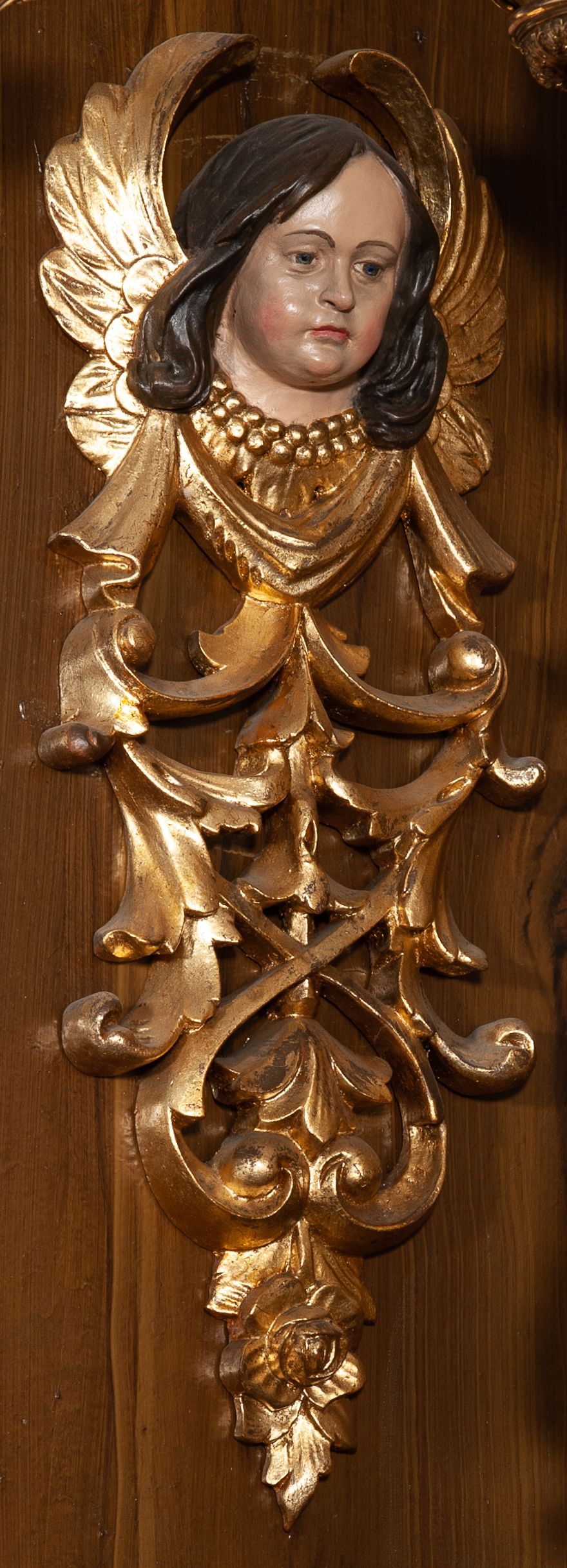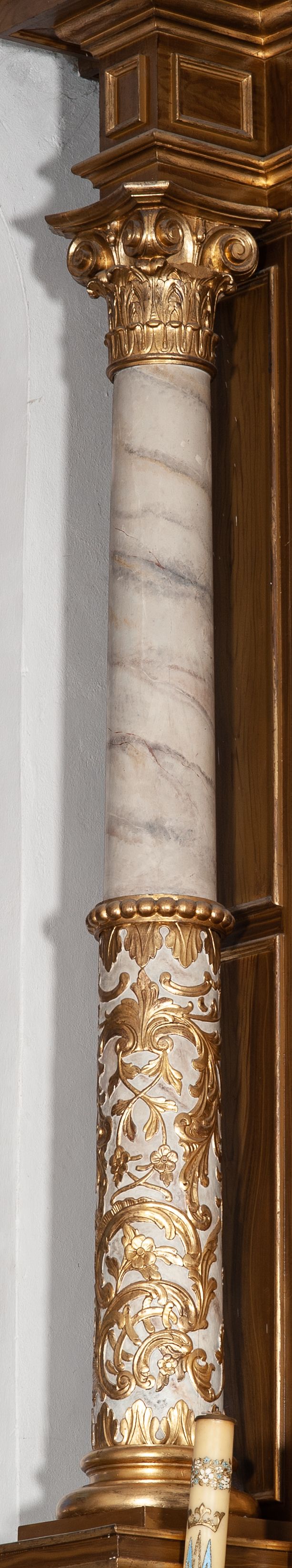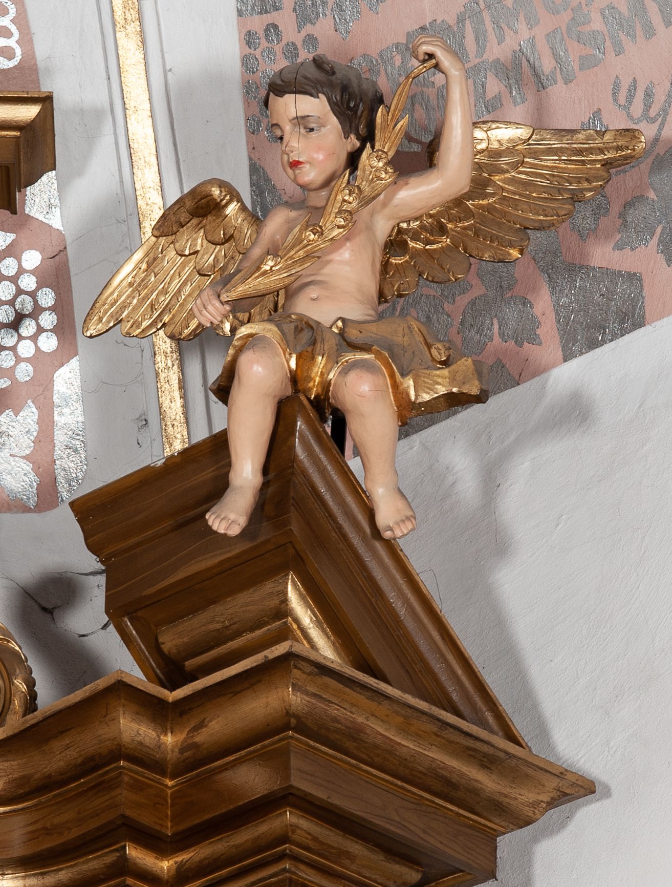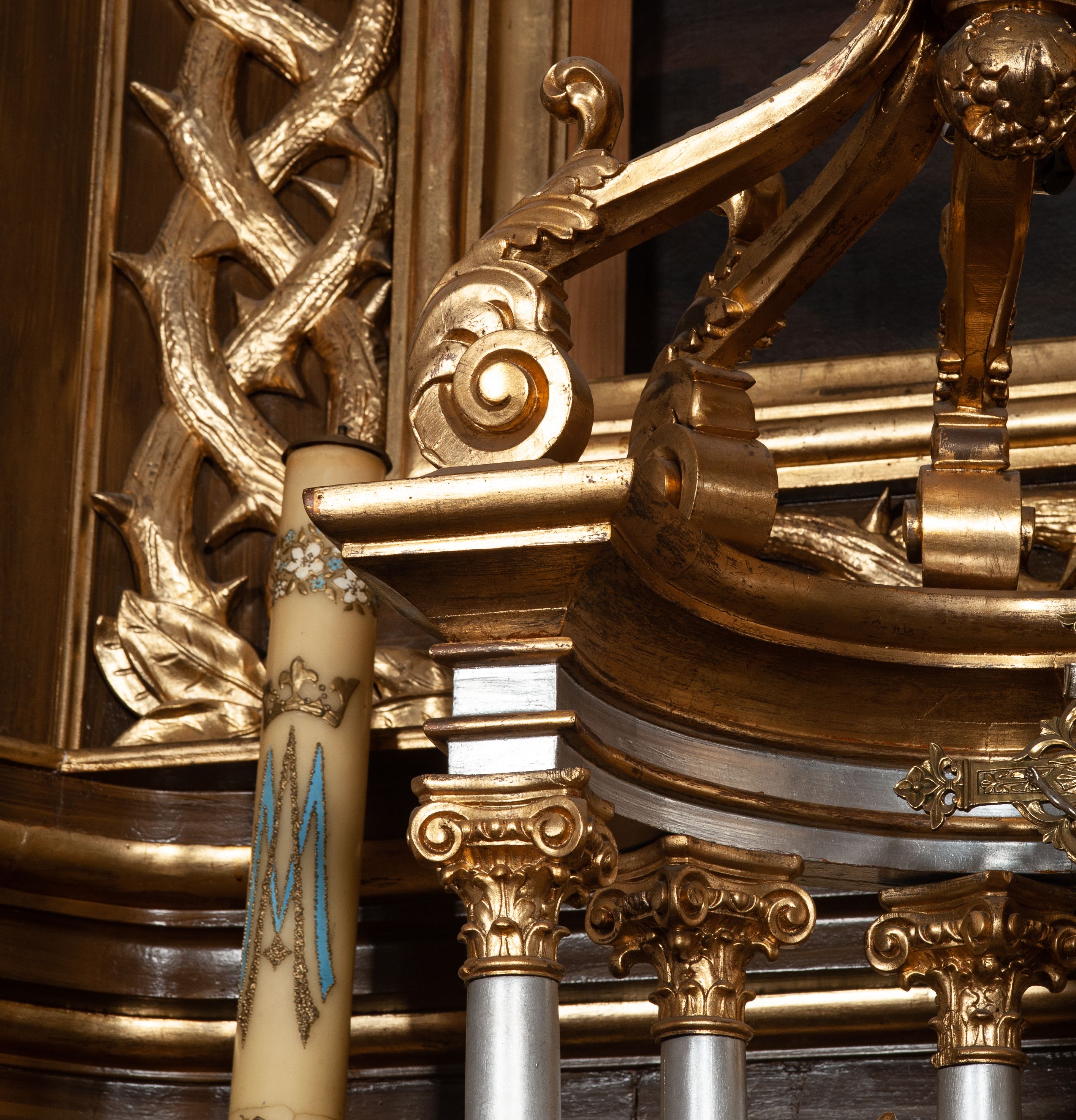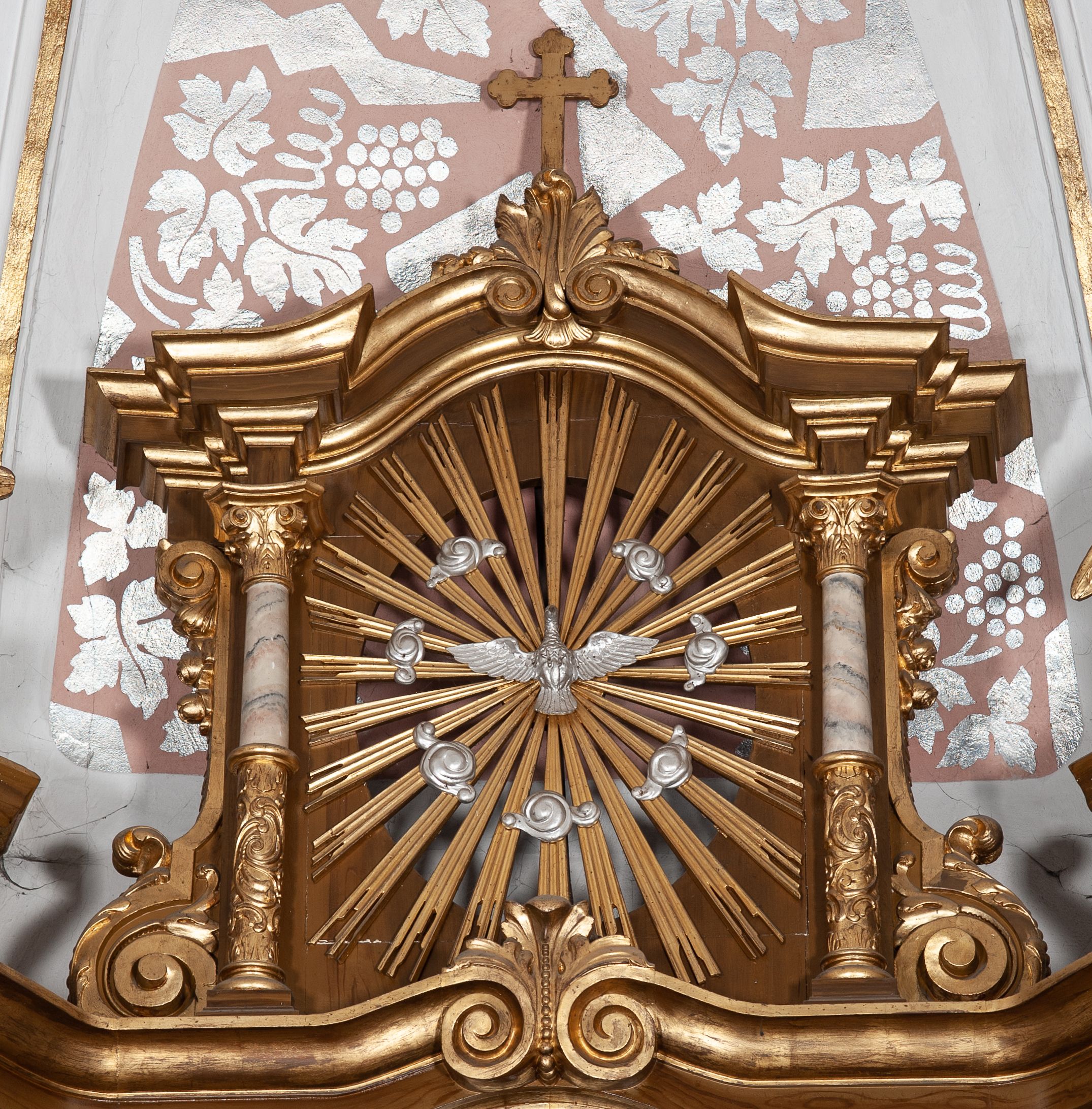 Zwieńczenie ujęte jest kolumnami analogicznymi jak w kondygnacji dźwigającymi niepełne, przełamane na osi podpór belkowanie o linii wklęsło-wypukłej. W polu promienista gloria z gołębicą Ducha Świętego na tle obłoków. Po bokach zwieńczenia znajdują się spływy wolutowe dekorowane kwiatami. U szczytu krzyż wyrastający z palmety. Ołtarz malowany na kolor brązowy, złocenia w partiach profili elementów architektonicznych i ornamentów złocone, detale srebrzone.