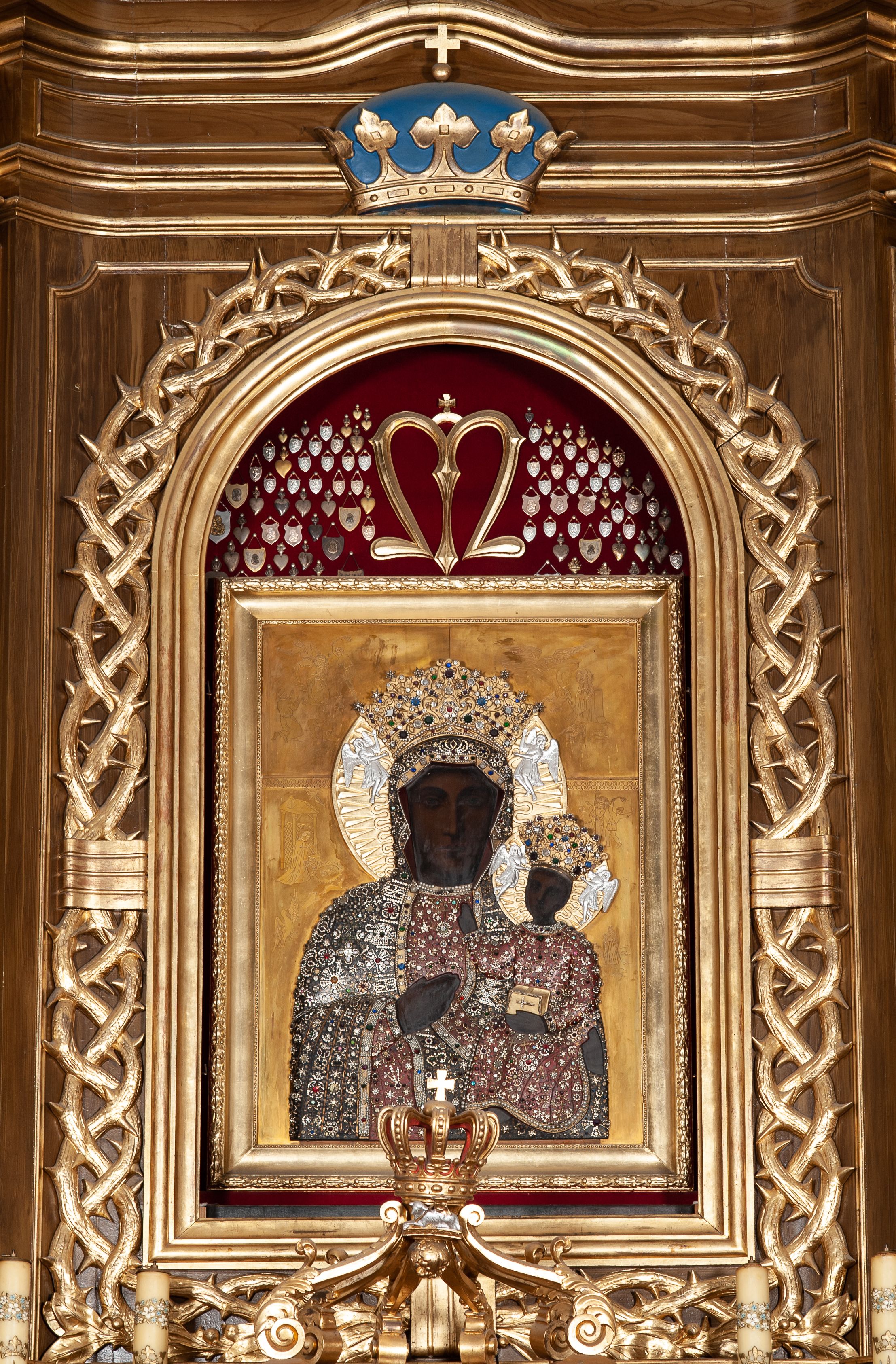 Retabulum ustawione na wysokim cokole z bokami zwróconymi pod kątem 45 stopni, zwieńczonym wydatnym profilowanym gzymsem. Na ścianach cokołów uskrzydlone główki aniołów z podwieszonym ornamentem o motywach cęgowych i roślinnych. Kondygnacja flankowana jest parą kolumn podtrzymujących niepełne belkowanie. Kolumny o kapitelach kompozytowych, marmoryzowanych trzonach, z nałożoną do połowy dekoracją w formie ornamentalnej wici roślinnej złożonej z motywów akantu, rocaille'u, palmety i ornamentu cęgowego. Na gzymsie fragmenty przerwanego trójkątnego przyczółka, na których siedzą pełnoplastyczne figury aniołków. Pole główne ołtarza o lekko zaoblonych narożach, w jego centrum złocona, profilowana rama w otoku z cierniowej korony, o kształcie prostokąta stojącego zakończonego półkoliście. Pośrodku obraz Matki Boskiej Częstochowskiej oraz obraz Ukrzyżowanie na zasuwie, ponad którym umieszczona jest płaskorzeźba Boga Ojca. Powyżej, na osi ołtarza złocona korona z krzyżykiem.