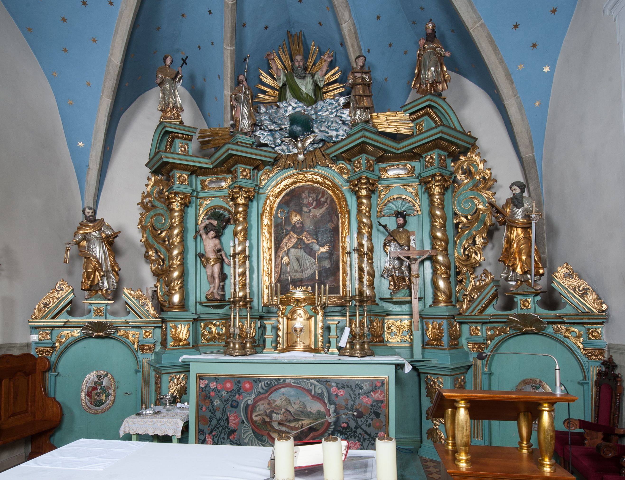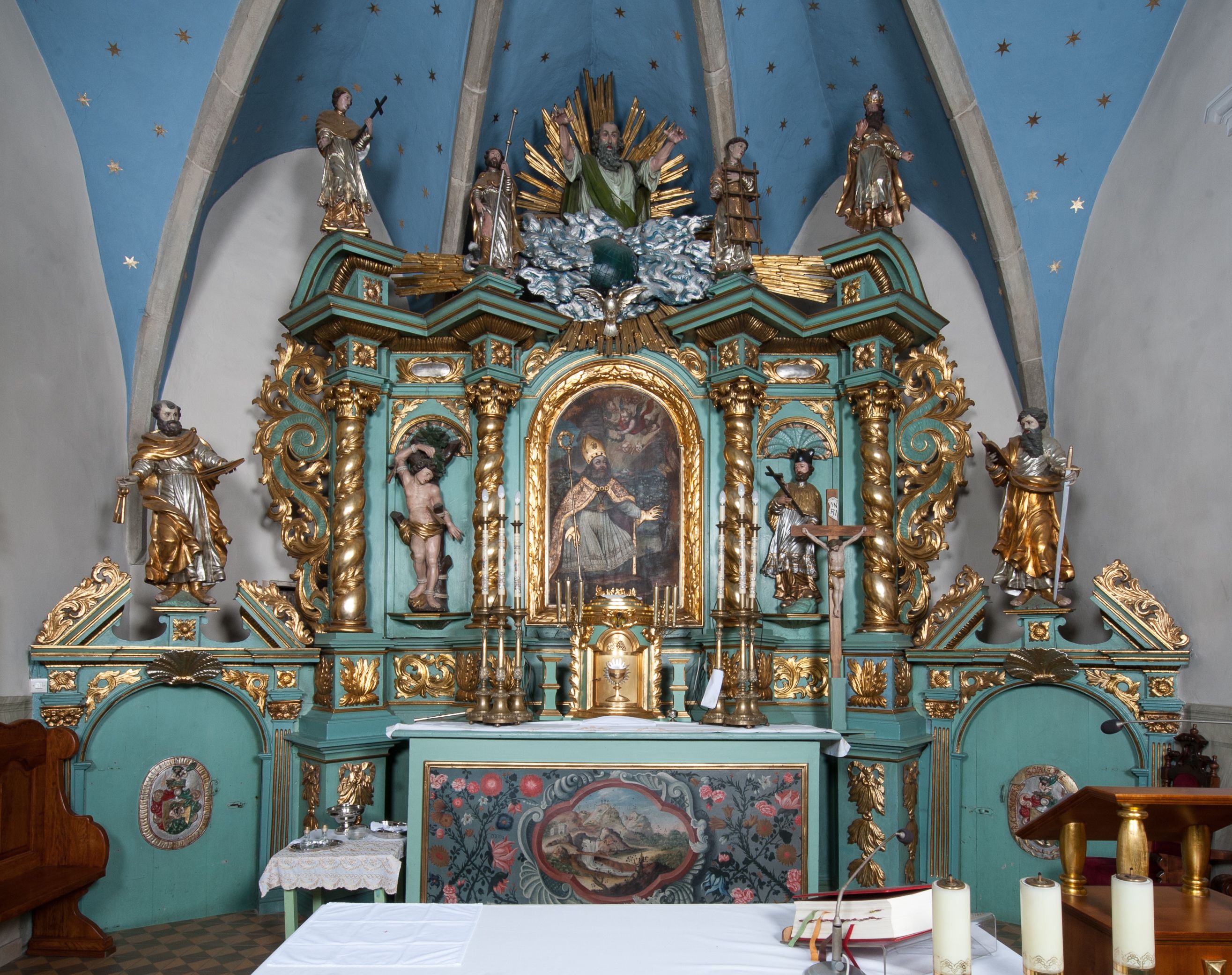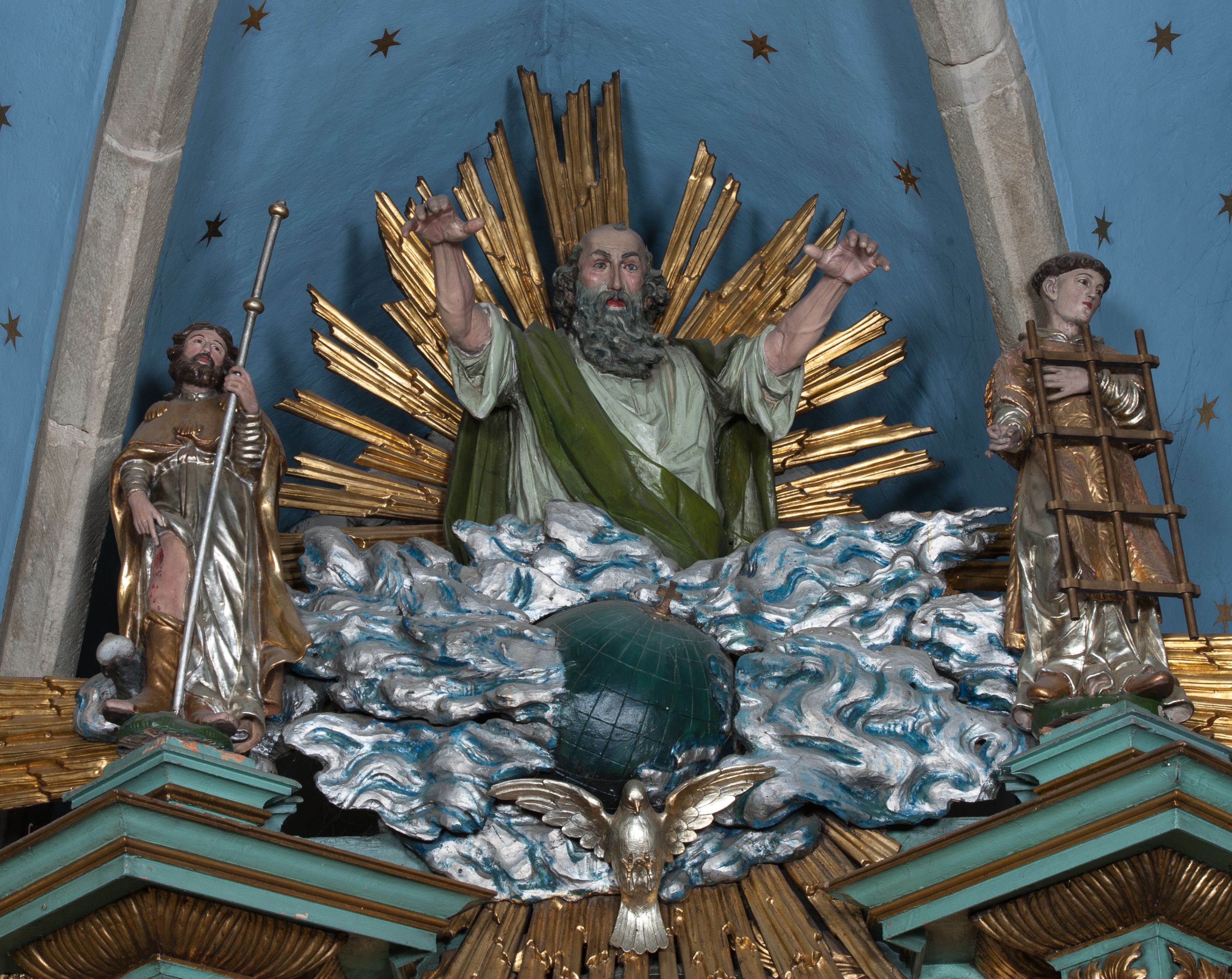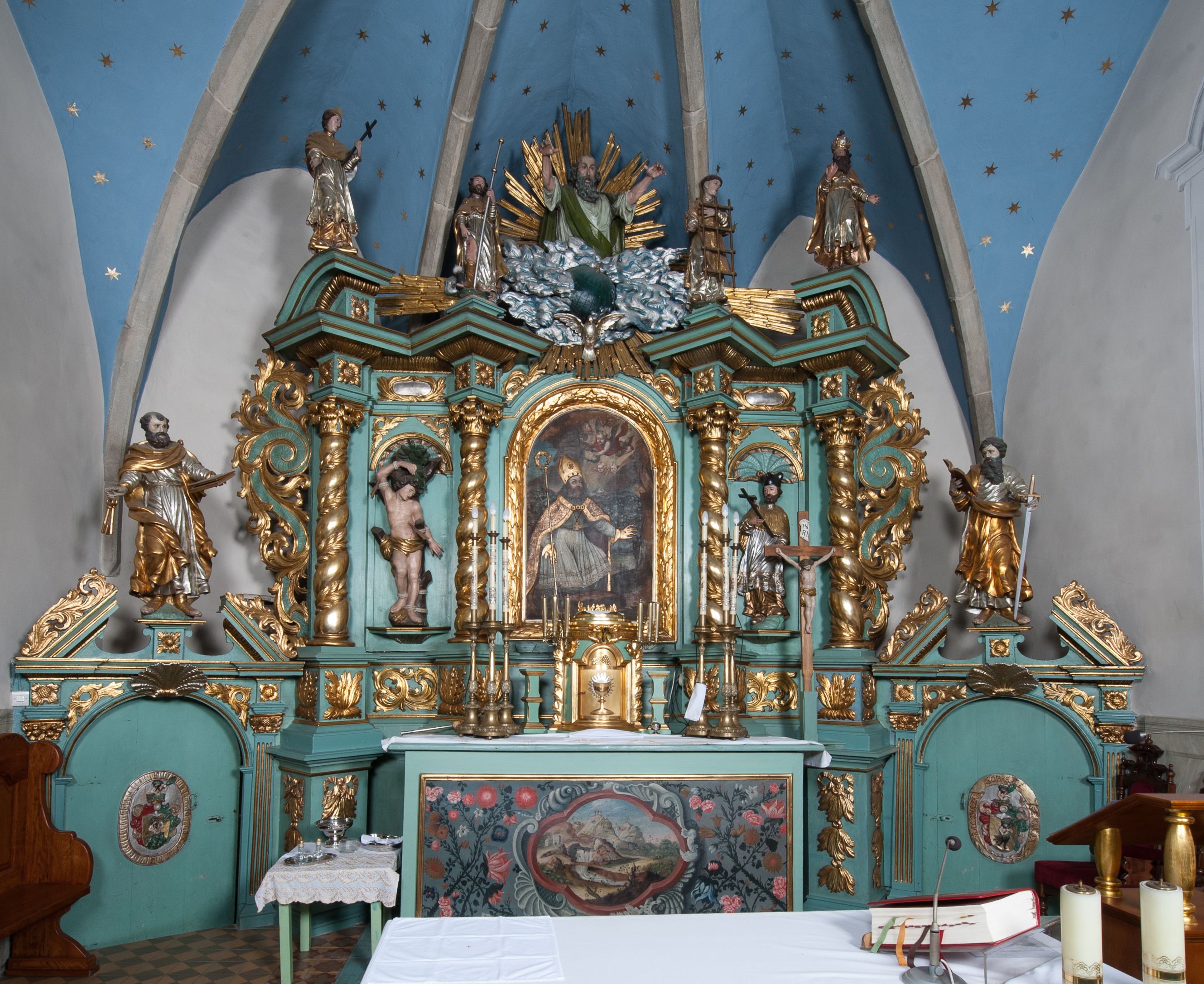 W zwieńczeniu rzeźbiona półpostać Boga Ojca na obłoku z widocznym poniżej fragmentem globu ziemskiego i gołębicą Ducha Świętego; całość ukazana na tle promienistej glorii. Na belkowaniu, na osiach podpór wewnętrznych ustawione są rzeźby: św. Rocha po lewej stronie i św. Wawrzyńca po prawej, a na zewnętrznych osiach retabulum rzeźby: Karola Boromeusza po lewej stronie i św. Stefana po prawej.