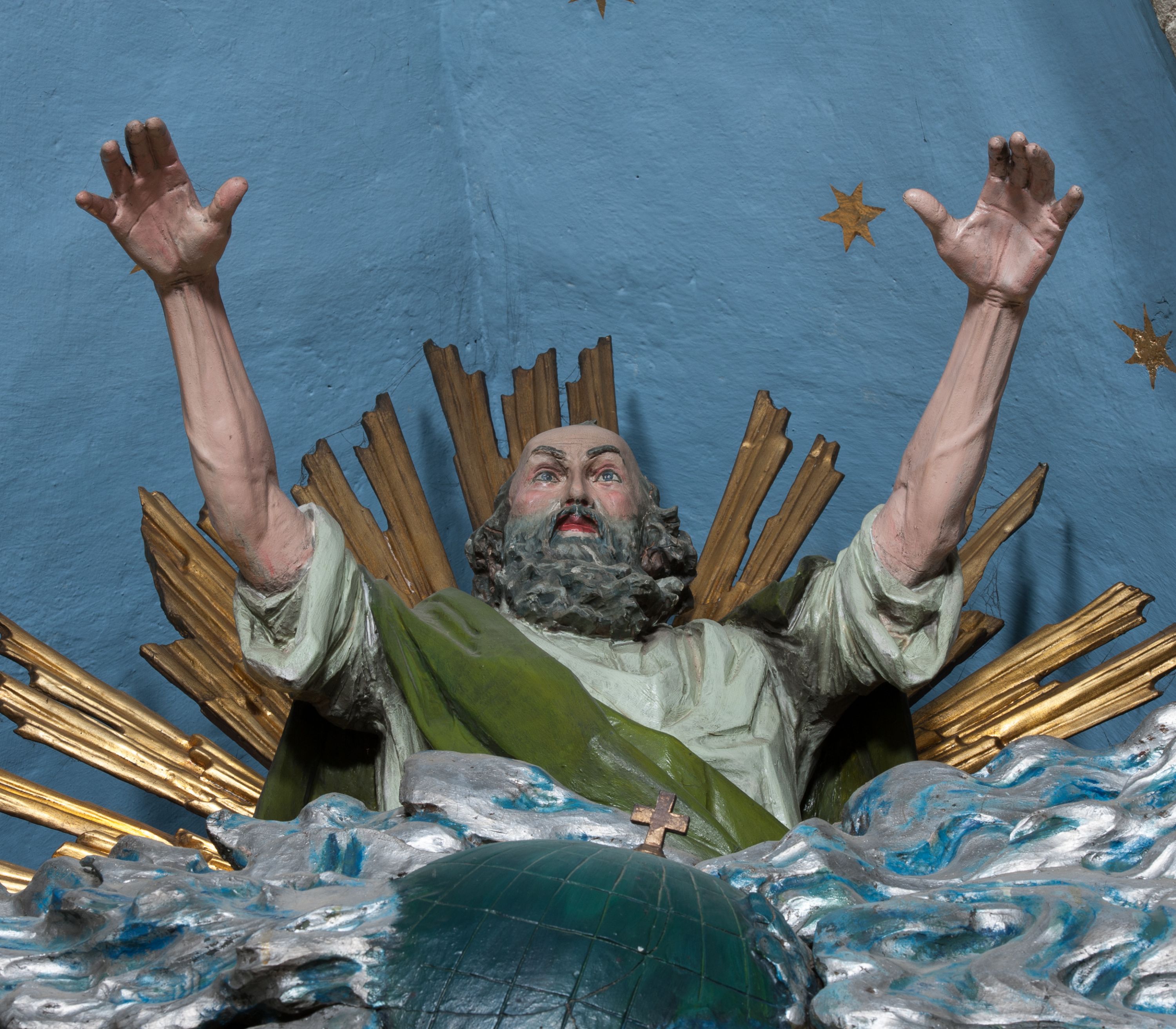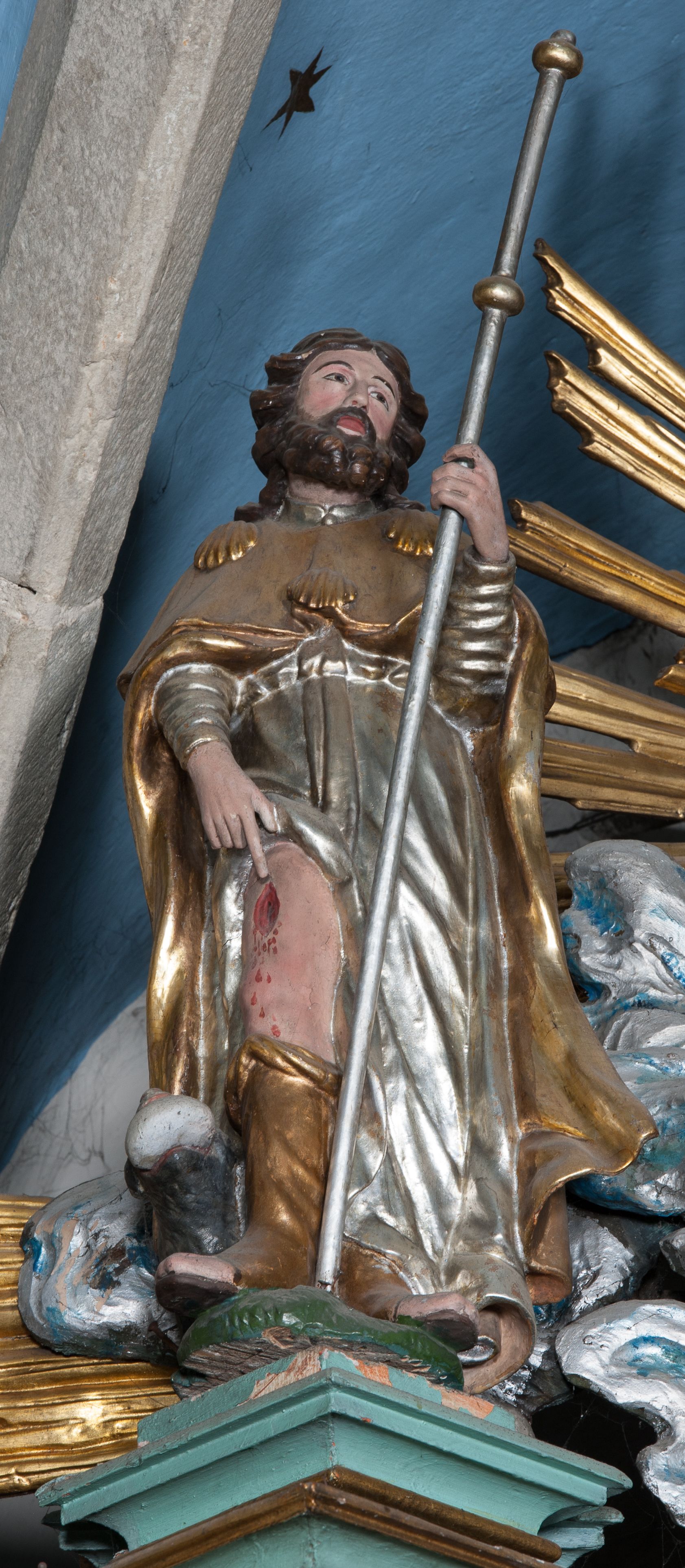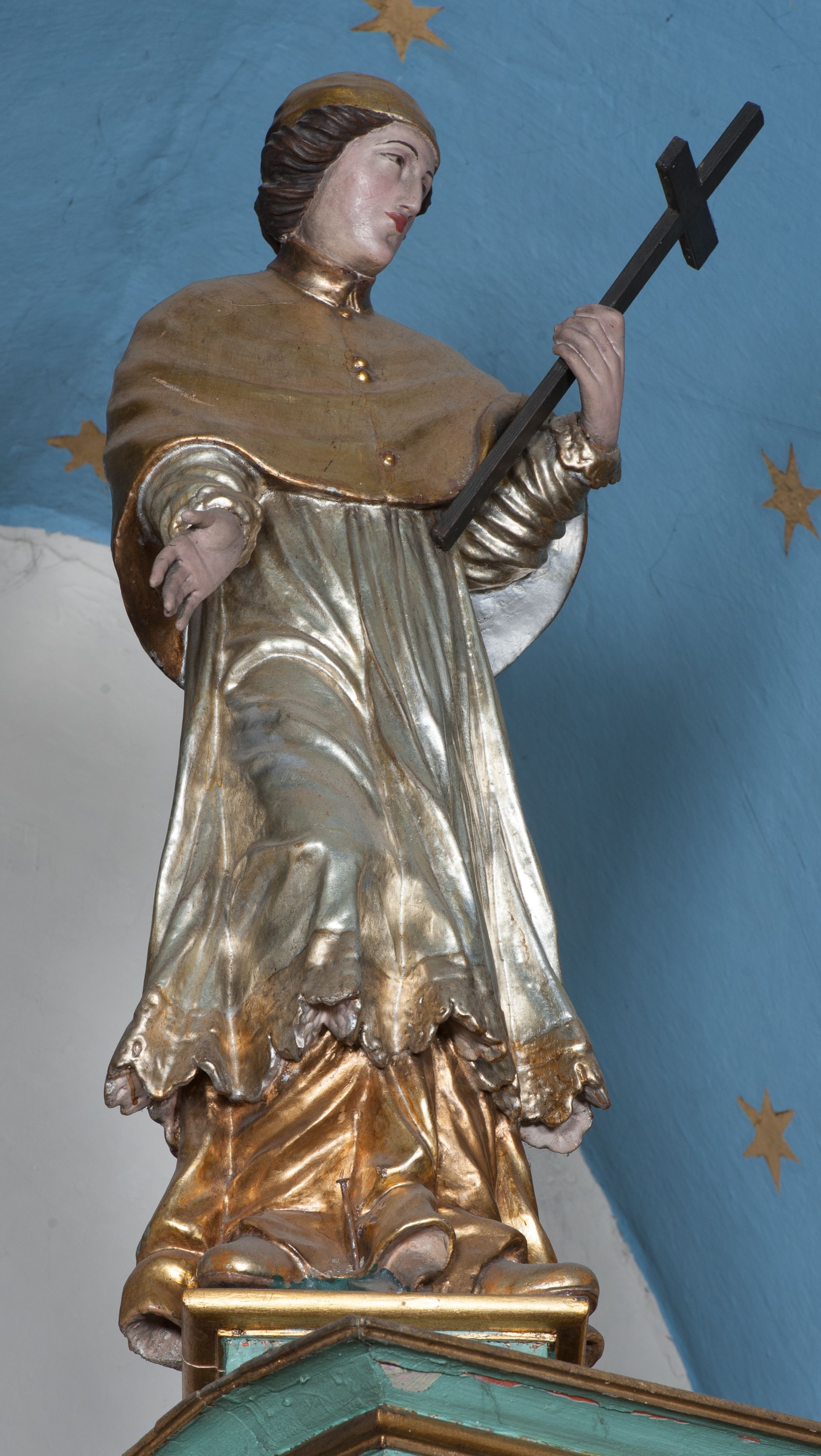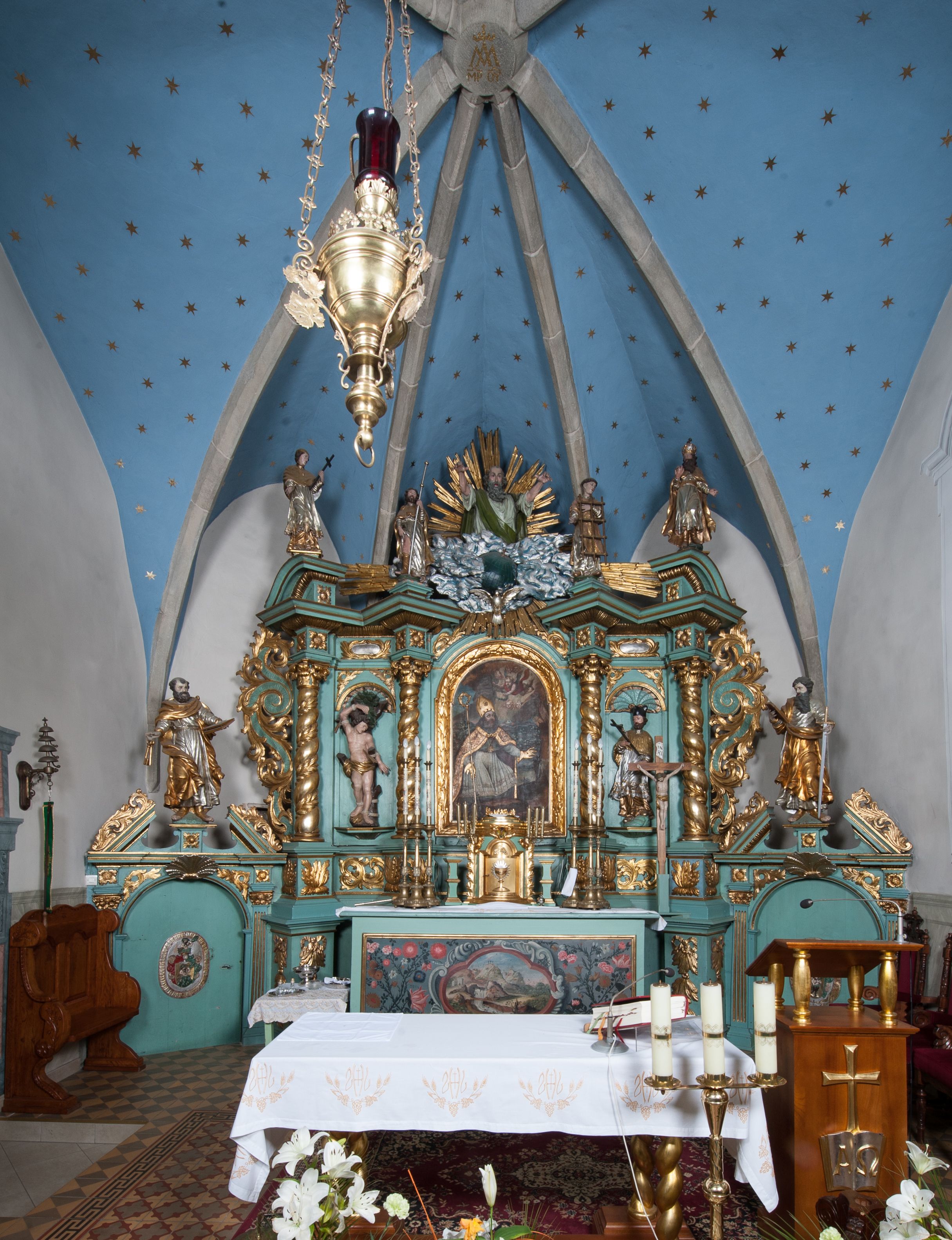 W zwieńczeniu rzeźbiona półpostać Boga Ojca na obłoku z widocznym poniżej fragmentem globu ziemskiego i gołębicą Ducha Świętego; całość ukazana na tle promienistej glorii. Na belkowaniu, na osiach podpór wewnętrznych ustawione są rzeźby: św. Rocha po lewej stronie i św. Wawrzyńca po prawej, a na zewnętrznych osiach retabulum rzeźby: Karola Boromeusza po lewej stronie i św. Stefana po prawej.