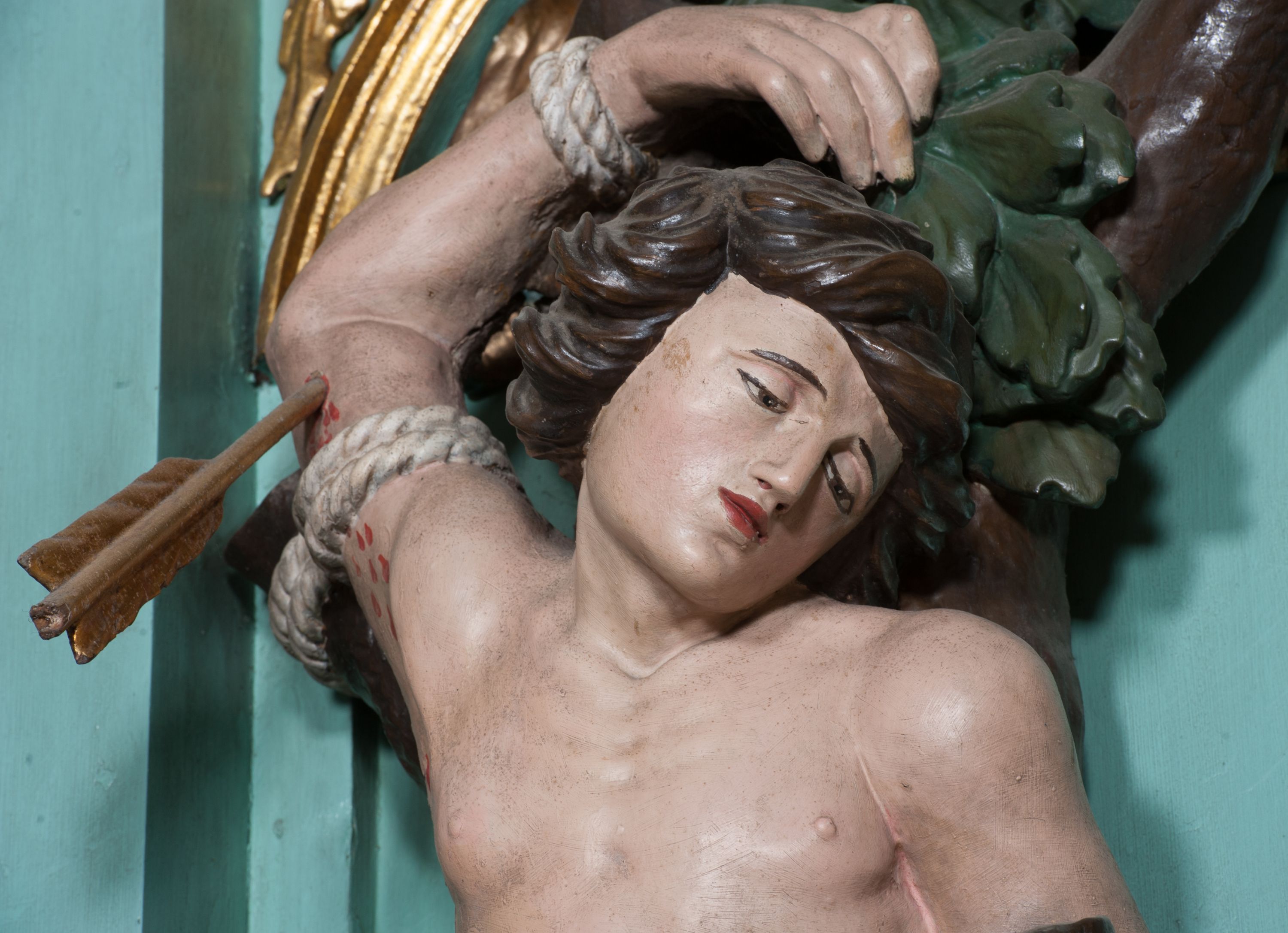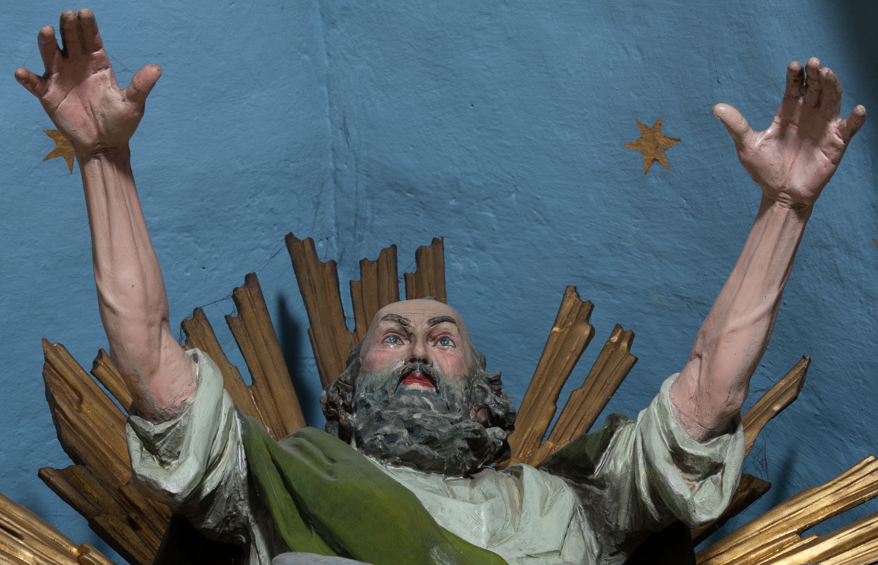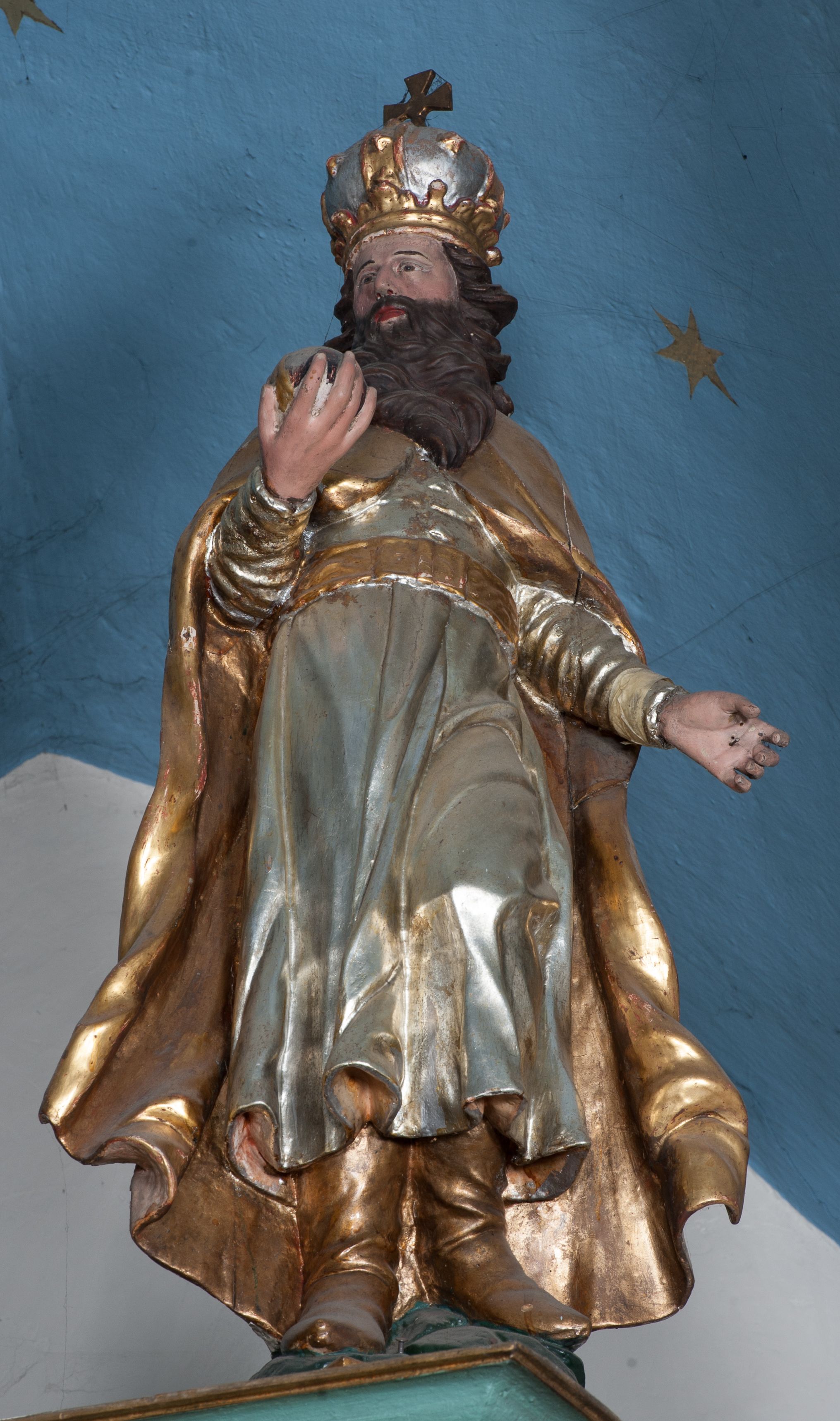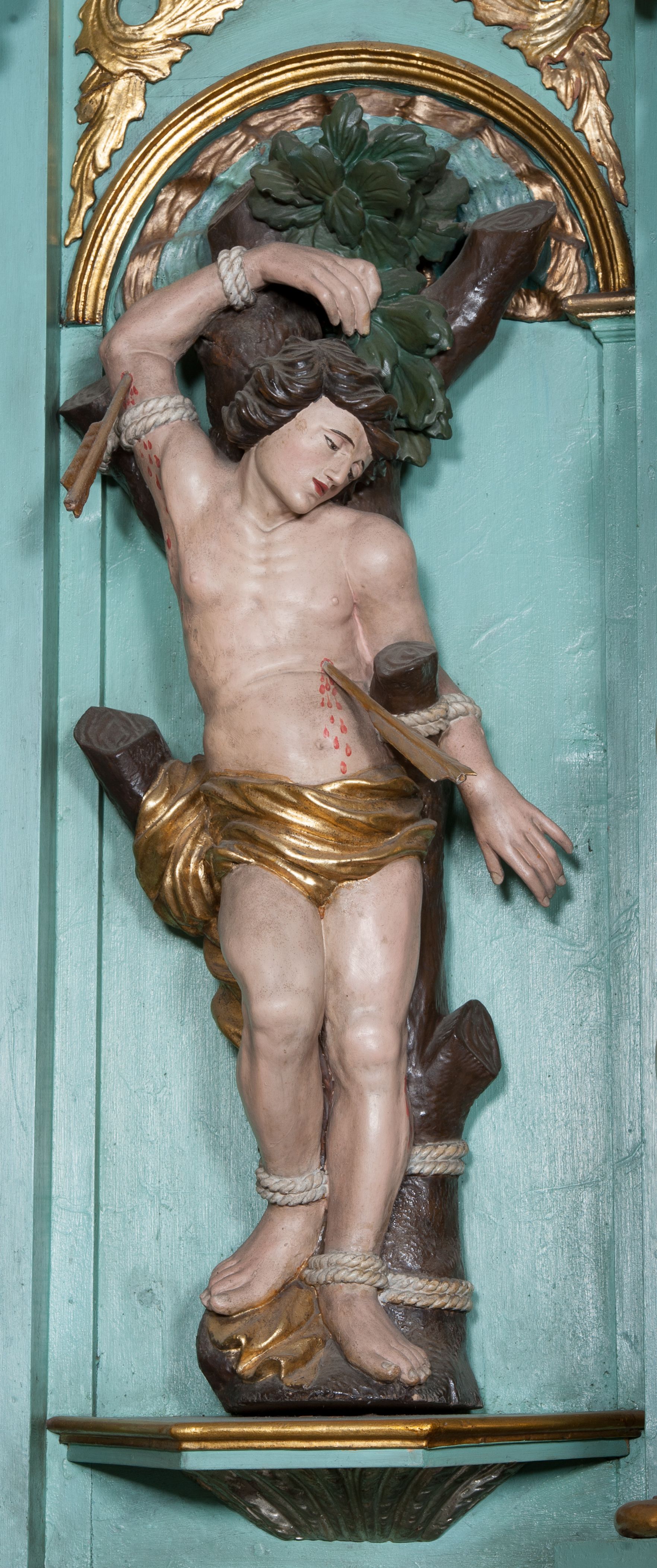 W zwieńczeniu rzeźbiona półpostać Boga Ojca na obłoku z widocznym poniżej fragmentem globu ziemskiego i gołębicą Ducha Świętego; całość ukazana na tle promienistej glorii. Na belkowaniu, na osiach podpór wewnętrznych ustawione są rzeźby: św. Rocha po lewej stronie i św. Wawrzyńca po prawej, a na zewnętrznych osiach retabulum rzeźby: Karola Boromeusza po lewej stronie i św. Stefana po prawej.