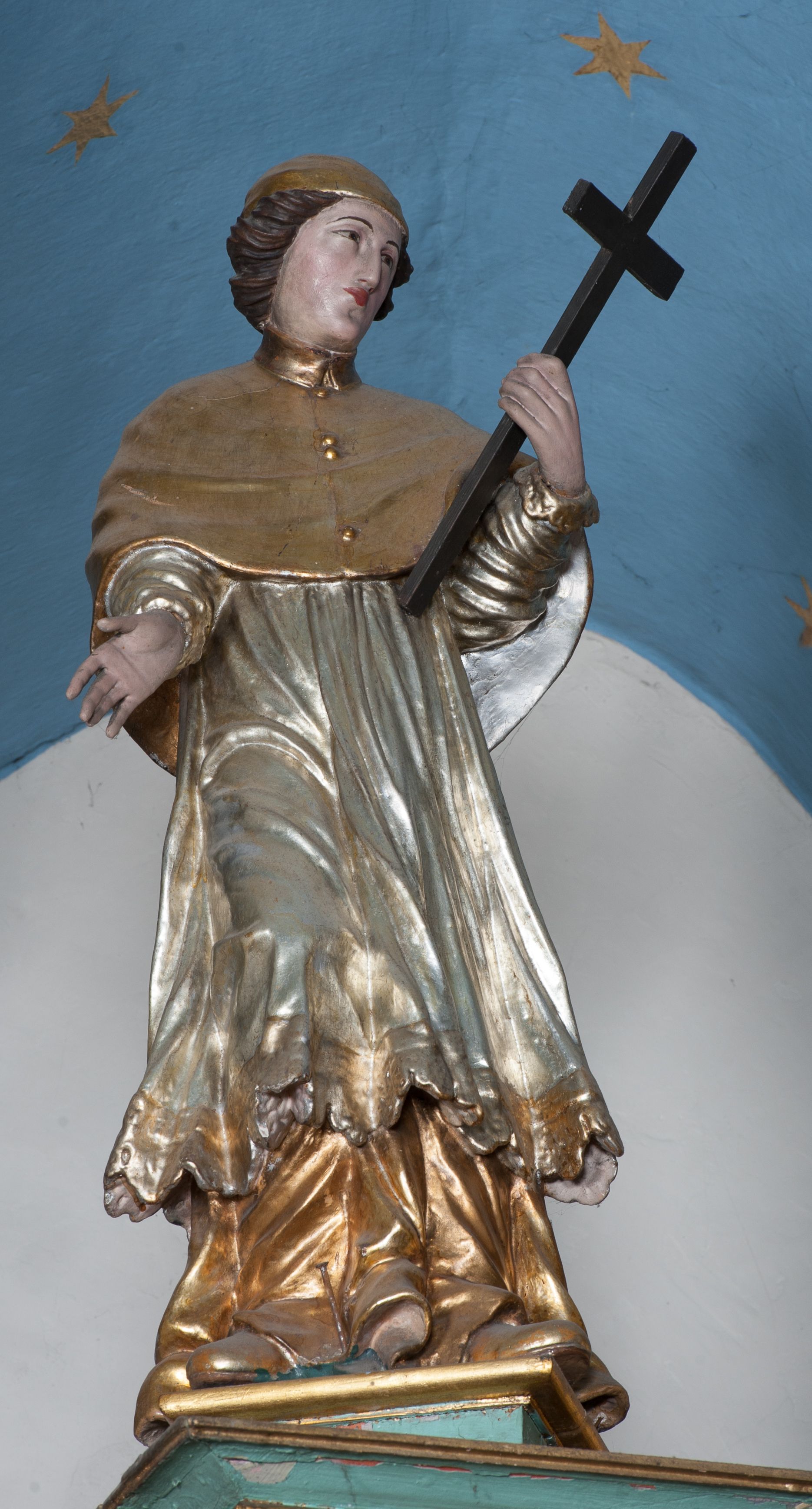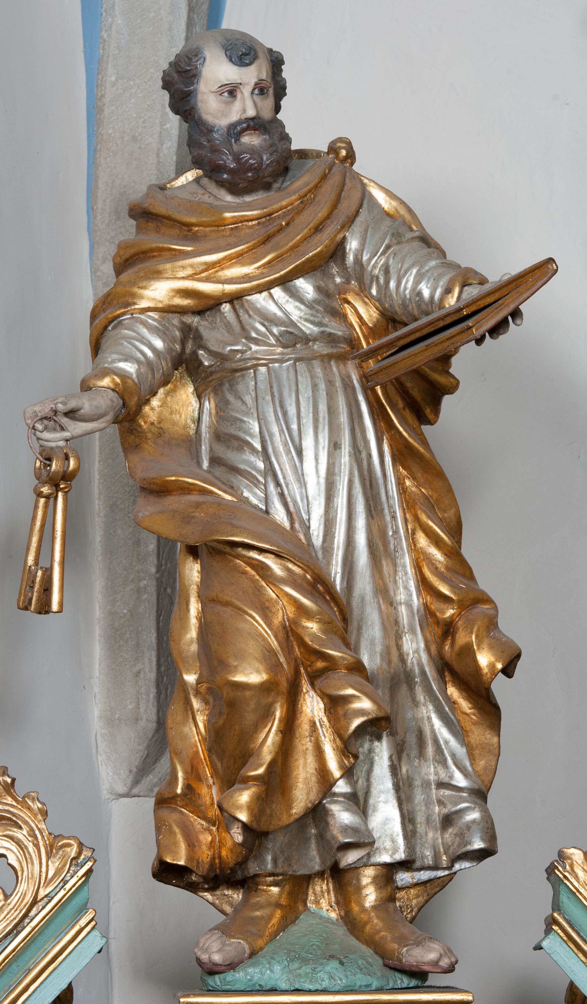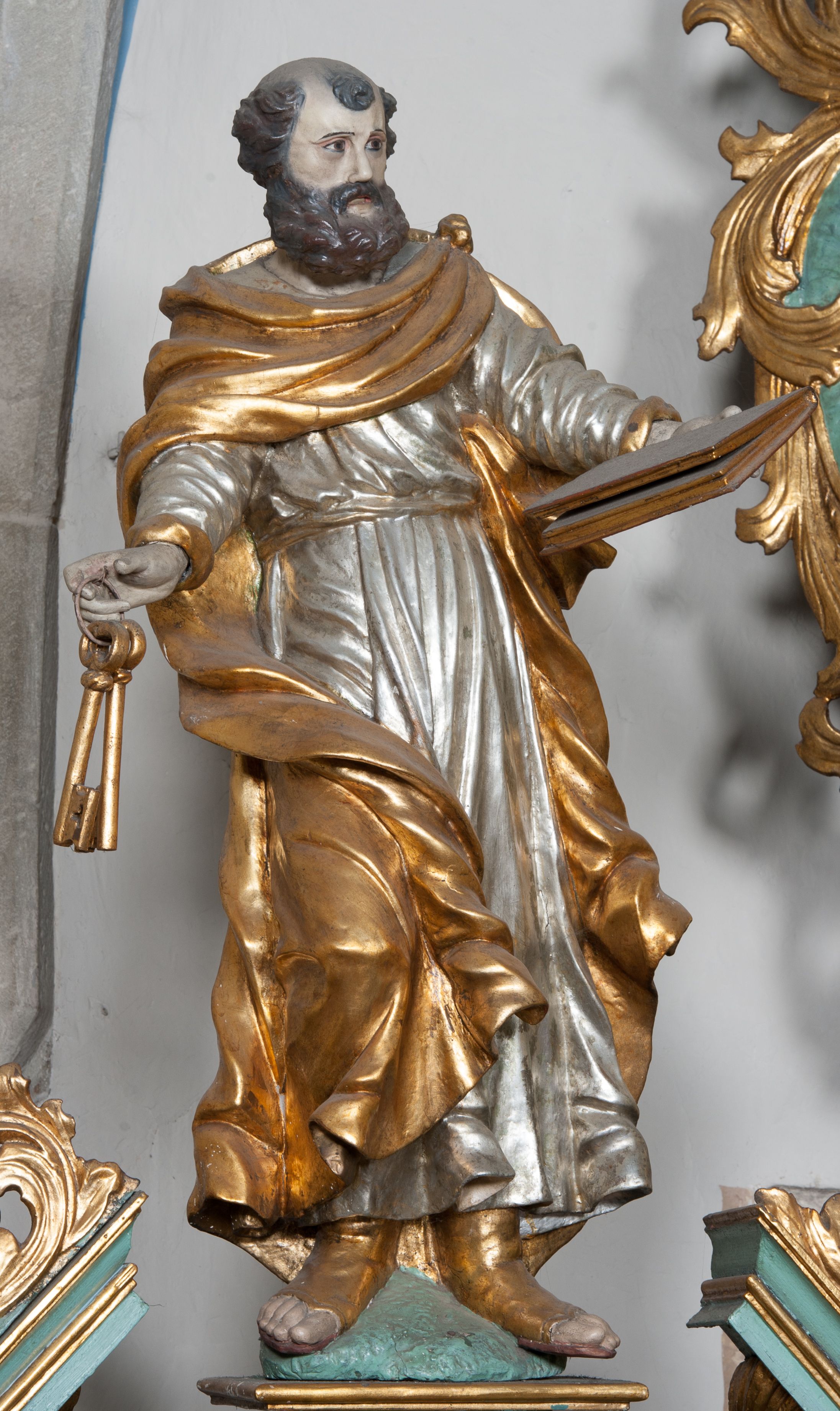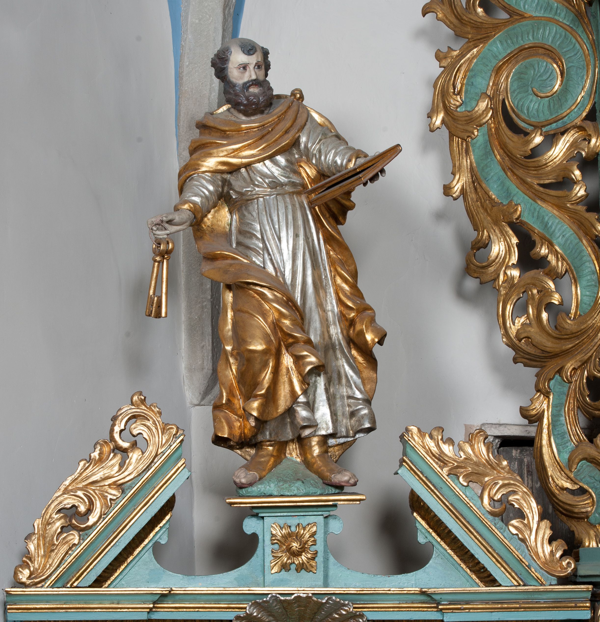 Nastawa ołtarzowa ujęta jest po bokach szerokimi bramkami w kształcie stojących prostokątów z drzwiczkami zamkniętymi półkoliście. Bramki ujęte są pilastrami o kanelowanych trzonach i fantazyjnych kapitelach, wspierających niepełne belkowanie oraz przerwany przyczółek. Nad bramkami ustawione są na cokołach rzeźby: św. Piotra po lewej stronie i św. Pawła po prawej. W polu drzwiczek owalne kartusze z herbem Görgey. W prawym kartuszu opisanym słowami: „BALTHAZAR GÖRGEI SENIOR”. Nad arkadami bramek są muszle, w przyłuczach akant, we fryzie rozety, a przerwany przyczółek dekorowany jest akantem. Struktura w całości polichromowana w odcieniu bladozielonym; ornamentyka, kolumny i profilowania złocone, detale srebrzone.
