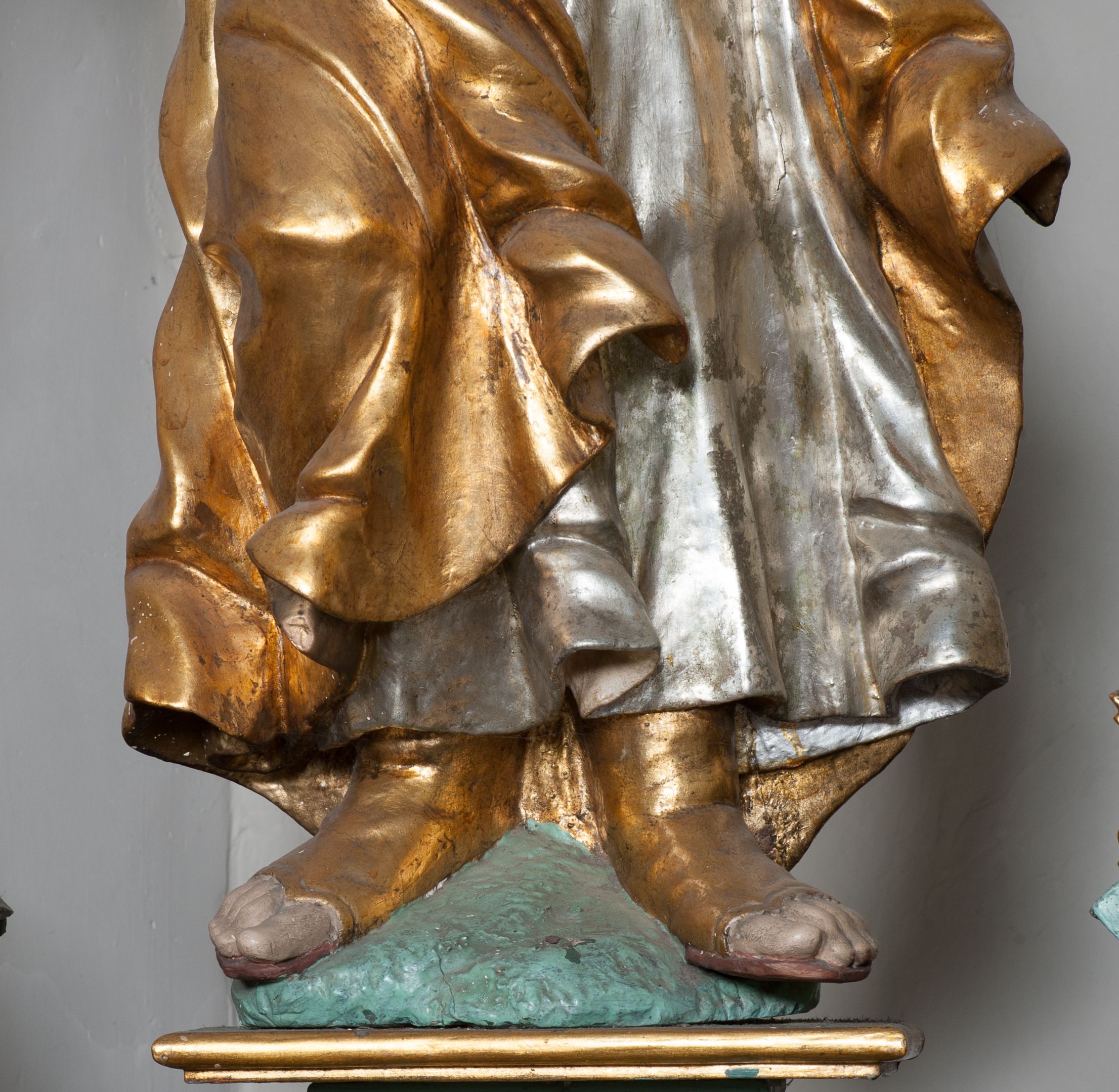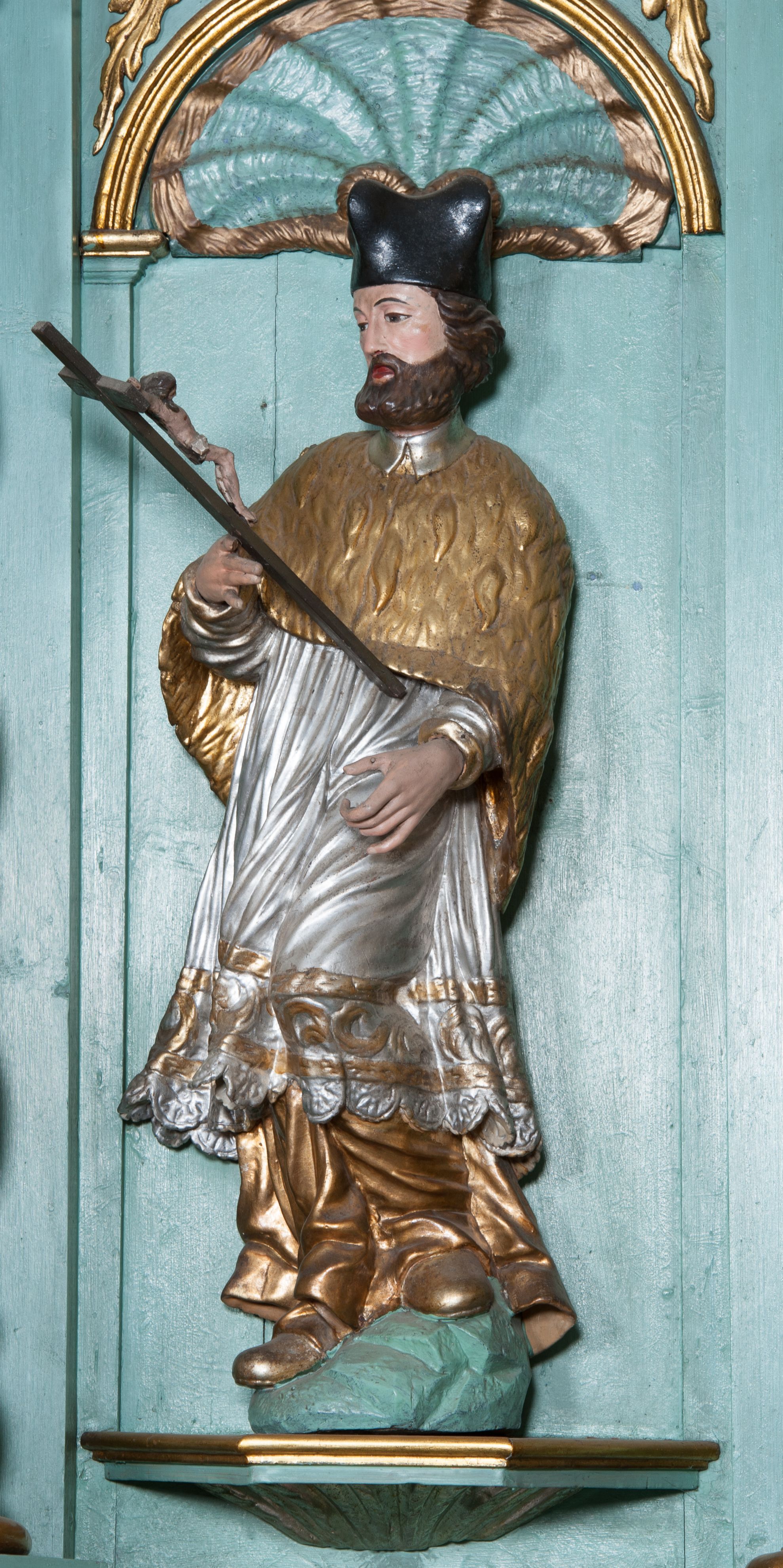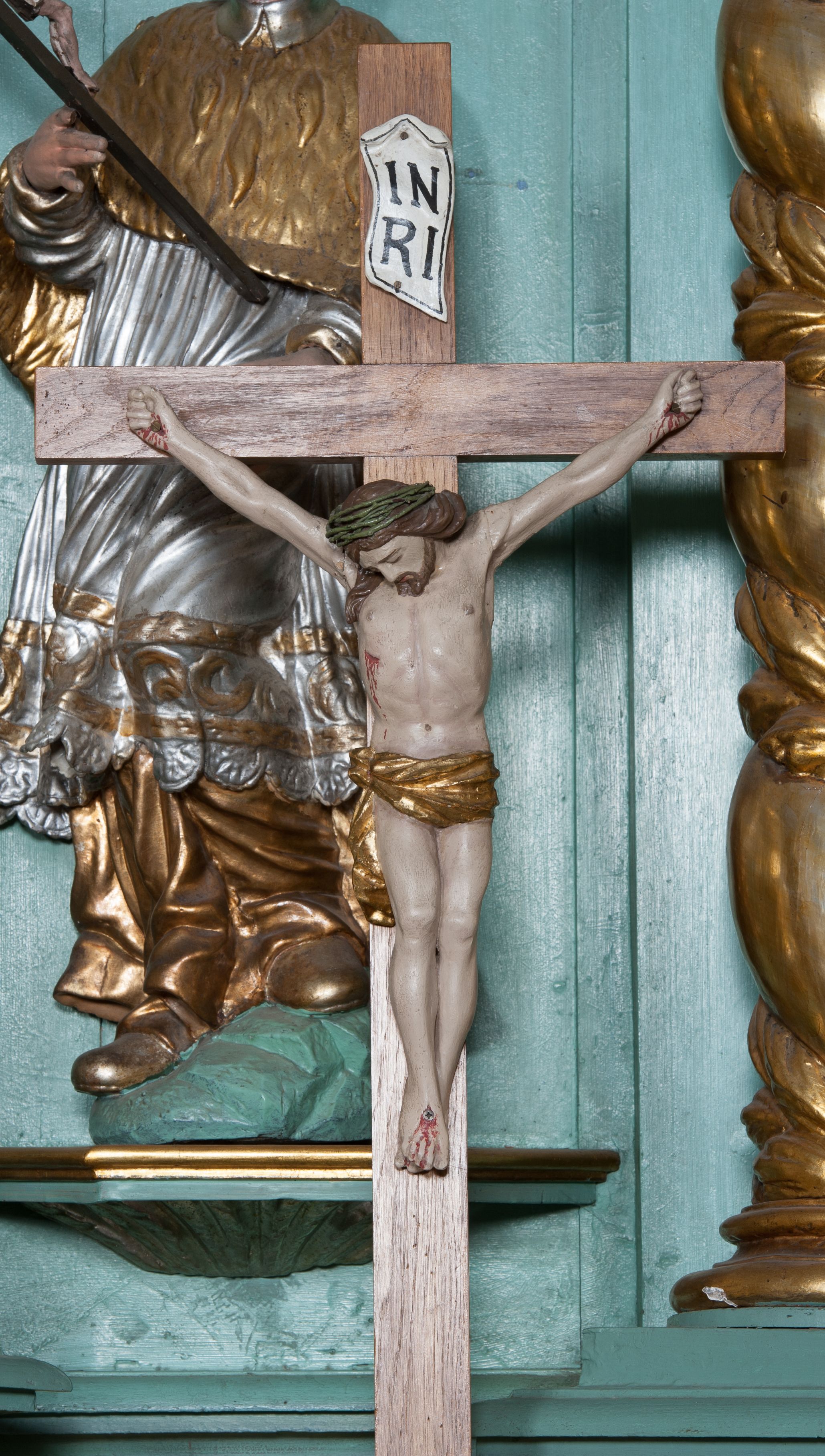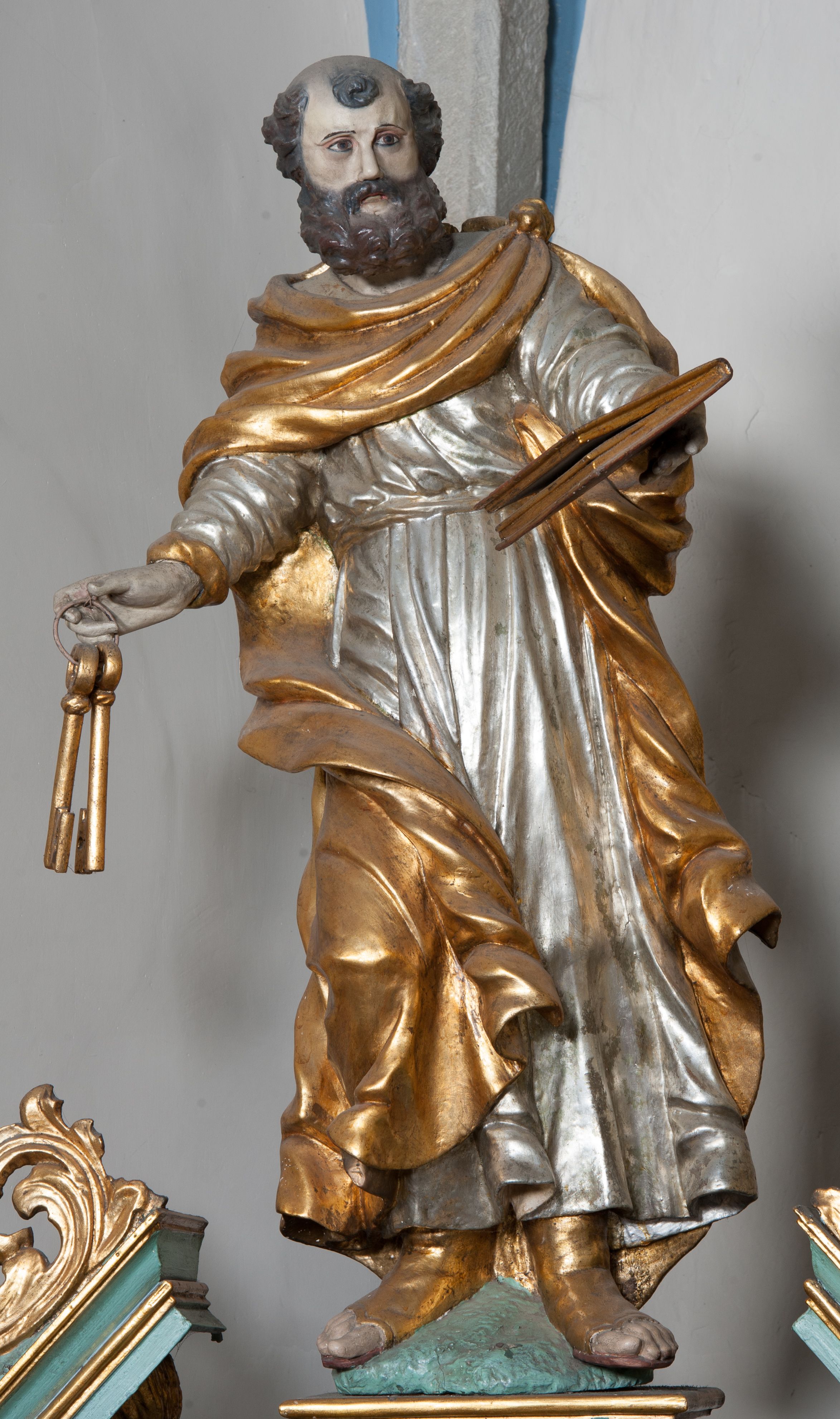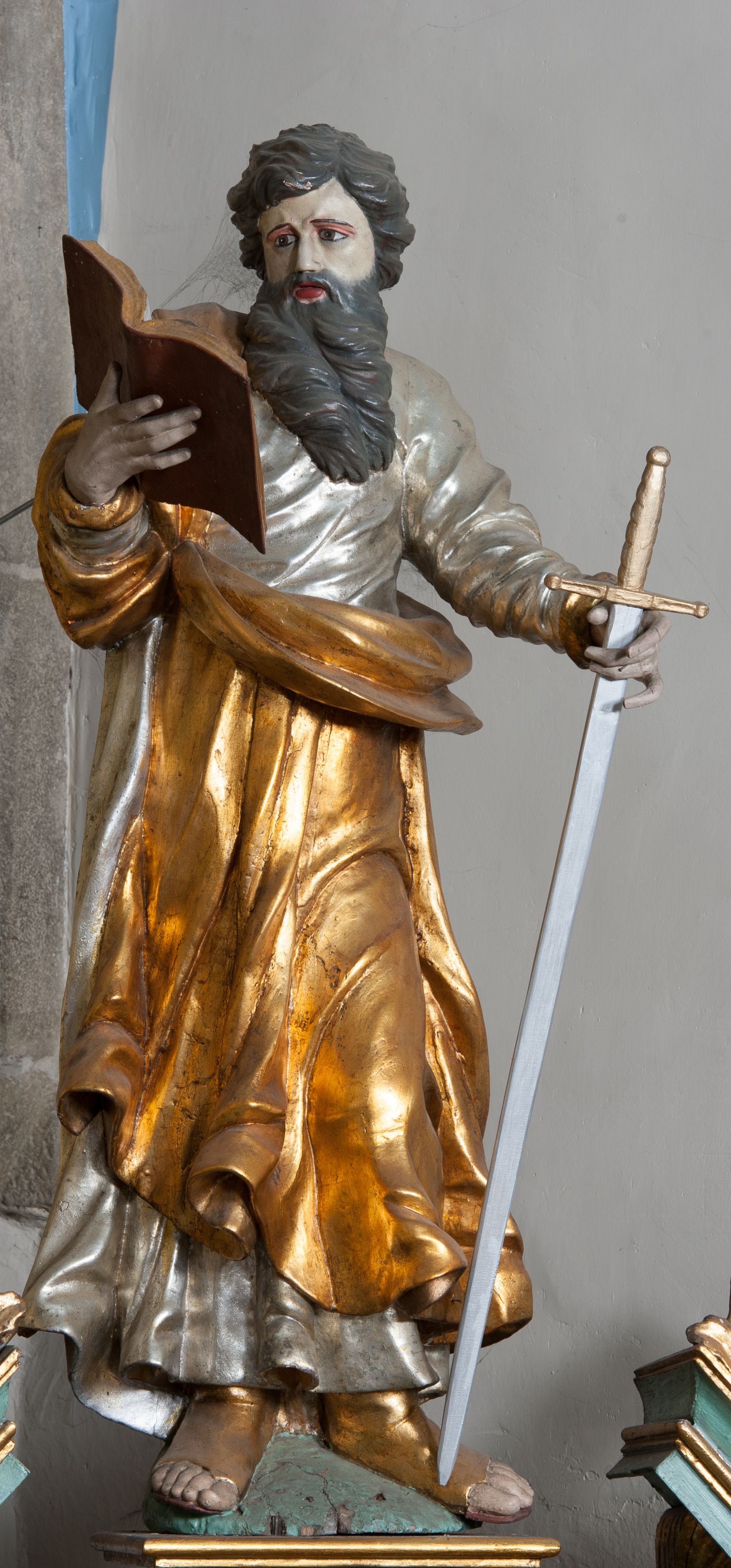 Nastawa ołtarzowa ujęta jest po bokach szerokimi bramkami w kształcie stojących prostokątów z drzwiczkami zamkniętymi półkoliście. Bramki ujęte są pilastrami o kanelowanych trzonach i fantazyjnych kapitelach, wspierających niepełne belkowanie oraz przerwany przyczółek. Nad bramkami ustawione są na cokołach rzeźby: św. Piotra po lewej stronie i św. Pawła po prawej. W polu drzwiczek owalne kartusze z herbem Görgey. W prawym kartuszu opisanym słowami: „BALTHAZAR GÖRGEI SENIOR”. Nad arkadami bramek są muszle, w przyłuczach akant, we fryzie rozety, a przerwany przyczółek dekorowany jest akantem. Struktura w całości polichromowana w odcieniu bladozielonym; ornamentyka, kolumny i profilowania złocone, detale srebrzone.