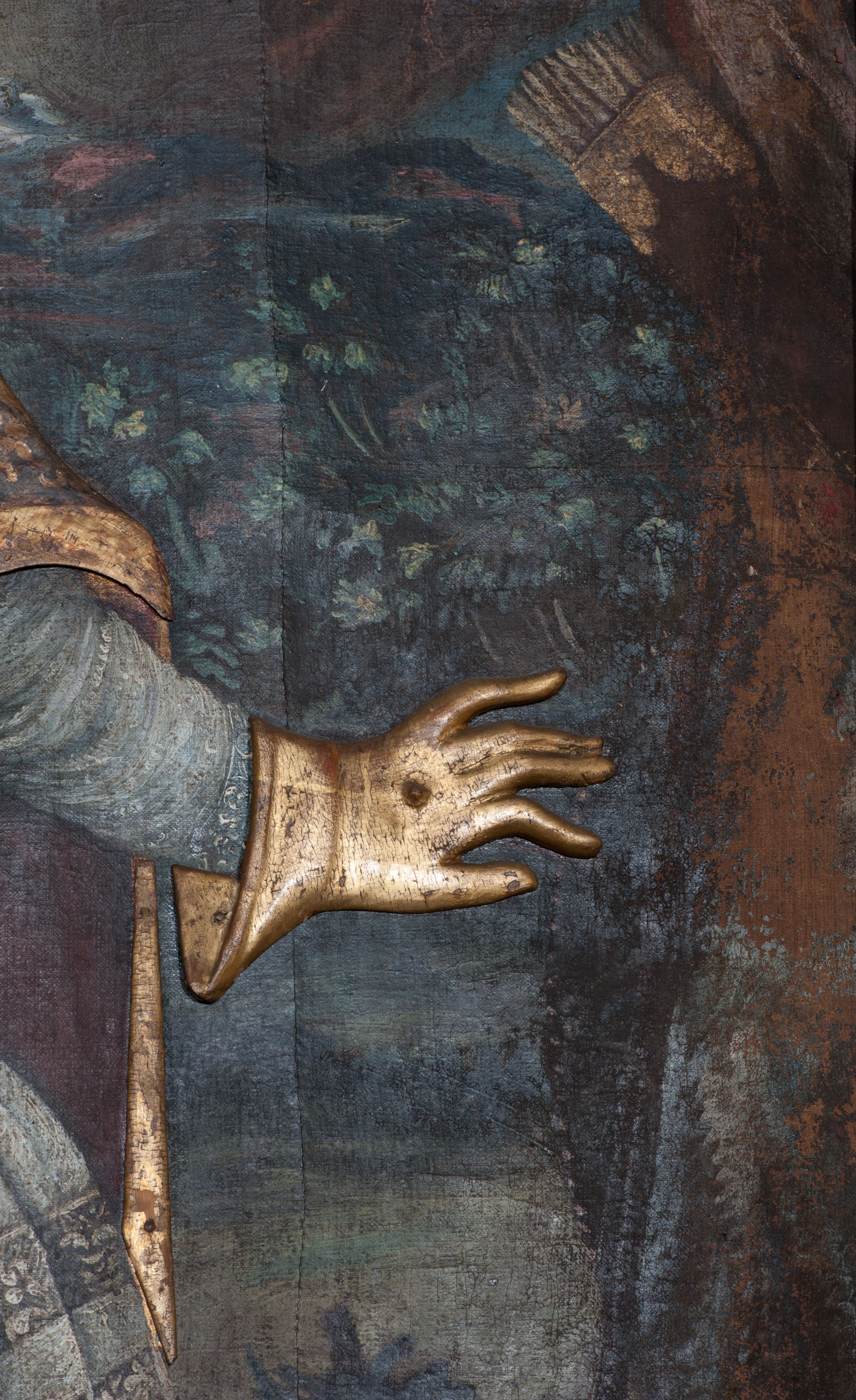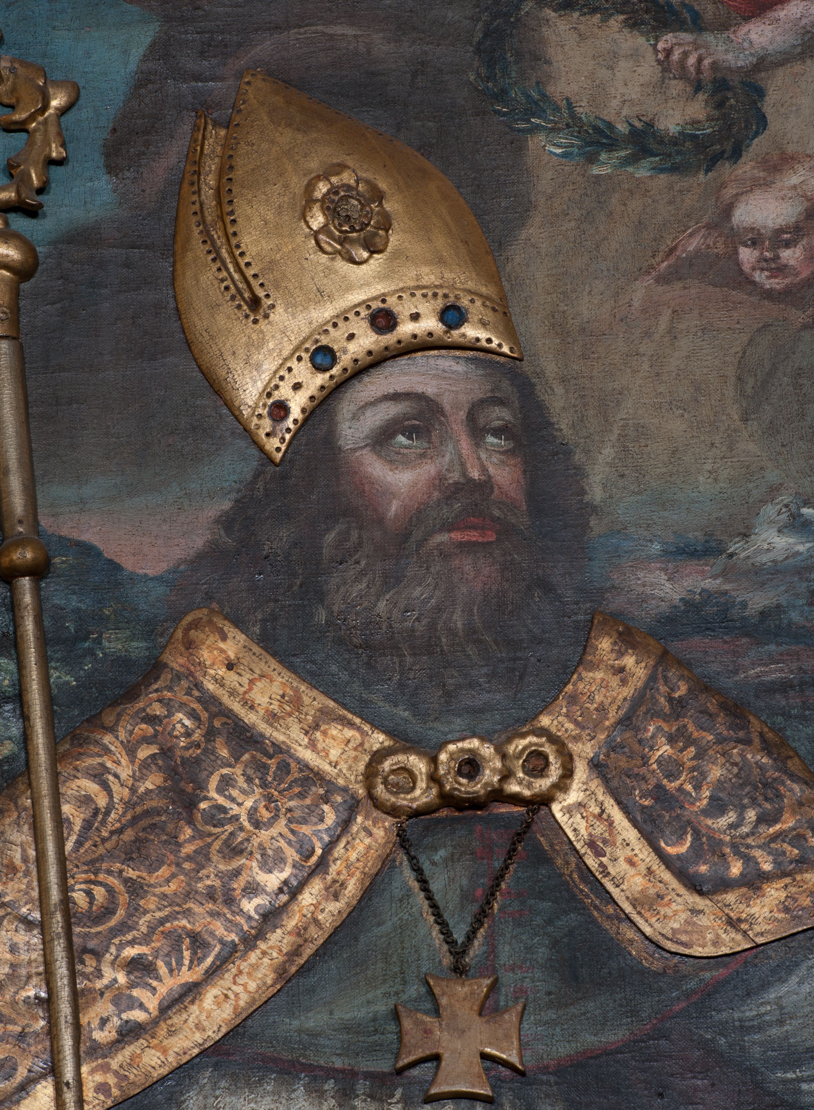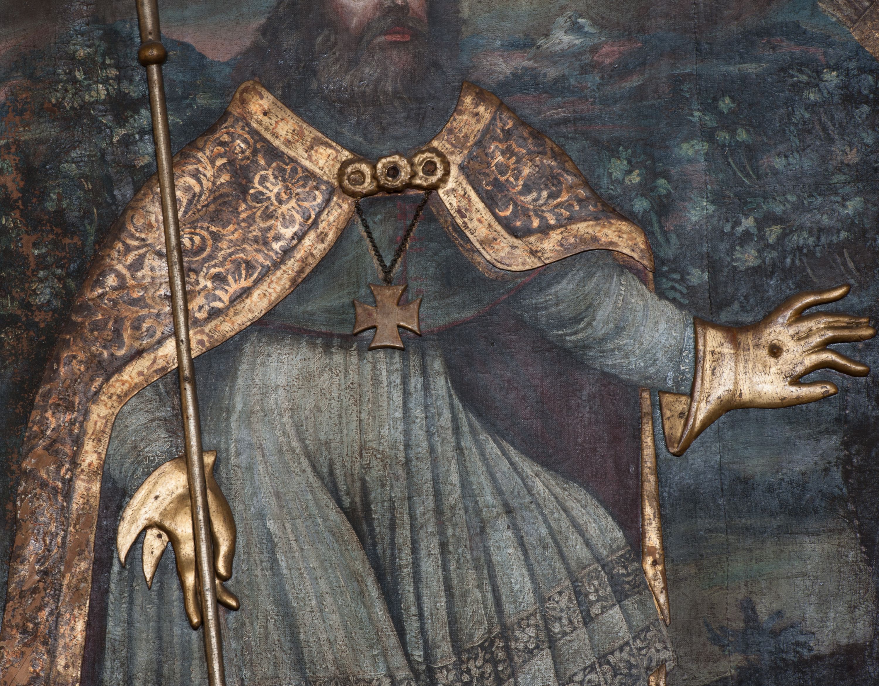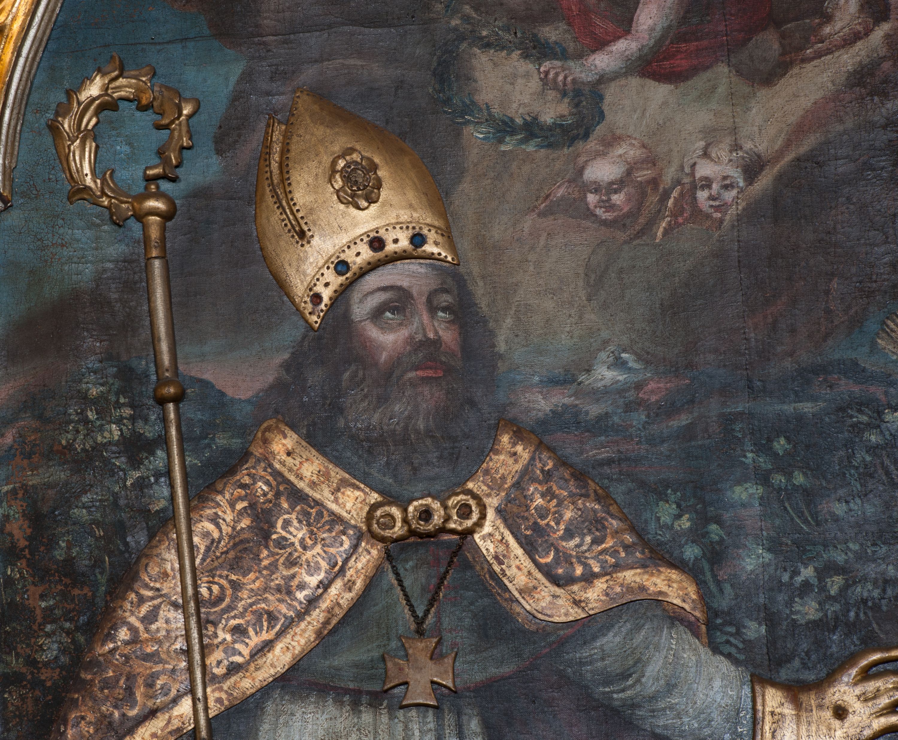 Nastawa ołtarzowa ujęta jest po bokach szerokimi bramkami w kształcie stojących prostokątów z drzwiczkami zamkniętymi półkoliście. Bramki ujęte są pilastrami o kanelowanych trzonach i fantazyjnych kapitelach, wspierających niepełne belkowanie oraz przerwany przyczółek. Nad bramkami ustawione są na cokołach rzeźby: św. Piotra po lewej stronie i św. Pawła po prawej. W polu drzwiczek owalne kartusze z herbem Görgey. W prawym kartuszu opisanym słowami: „BALTHAZAR GÖRGEI SENIOR”. Nad arkadami bramek są muszle, w przyłuczach akant, we fryzie rozety, a przerwany przyczółek dekorowany jest akantem. Struktura w całości polichromowana w odcieniu bladozielonym; ornamentyka, kolumny i profilowania złocone, detale srebrzone.