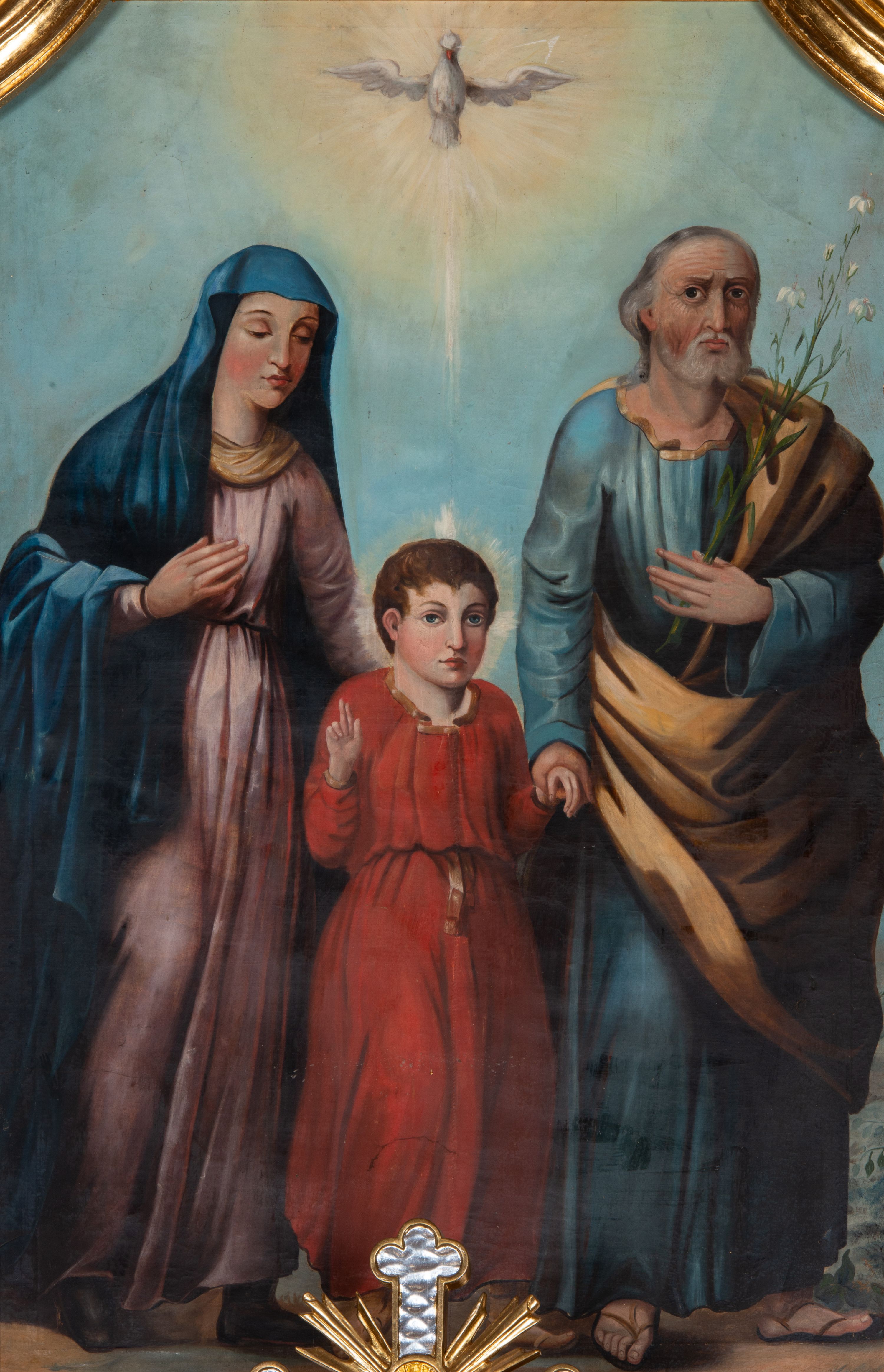 Retabulum na wysokim cokole zryzalitowanym przy brzegach; ujęte parą zwielokrotnionych pilastrów o kanelowanych trzonach i stojącą przed nimi parą kolumn o kapitelach kompozytowych. Podpory dźwigają pełne belkowanie, wyłamane na ich osi, przerwane glorią nad polem środkowym oraz przerwany falisty przyczółek. W polu środkowym płytka nisza w formie stojącego prostokąta o wklęsłych górnych narożach, ujęta profilowaną ramą z obrazem Święta Rodzina. Na zasuwie obrazy: Mistyczne Zaślubiny Św. Katarzyny oraz Najświętsza Maria Panna Niepokalanie Poczęta. W polu belkowania gloria promienista, w której centrum rzeźbione przedstawienie Baranka Apokaliptycznego na księdze, w otoczeniu obłoków, nad nim Gołębica Ducha Świętego; u spodu flankowana dwoma rzeźbami puttów. Bramki z przejściami w formie stojącego prostokąta zamkniętego łukiem półkolistym nadwieszonym, ujęte profilowanymi ramami. Ponad szczyty o fantazyjnym wykroju, tworzące postumenty dla figur św. Augustyna po lewej stronie i św. Hieronima po prawej. Cokół i ryzality dekorowane płycinami, od frontu z ornamentem roślinnym. Rama dekorowana trzema muszlami; w przyłuczach uskrzydlone główki anielskie. W partii fryzu, na osi kolumn rozety. Kondygnacja ujęta uszami utworzonymi z suchego akantu. Struktura polichromowana w kolorze beżowym, detal na czerwono, kolumny, gloria, ornamentyka i profile złocone.