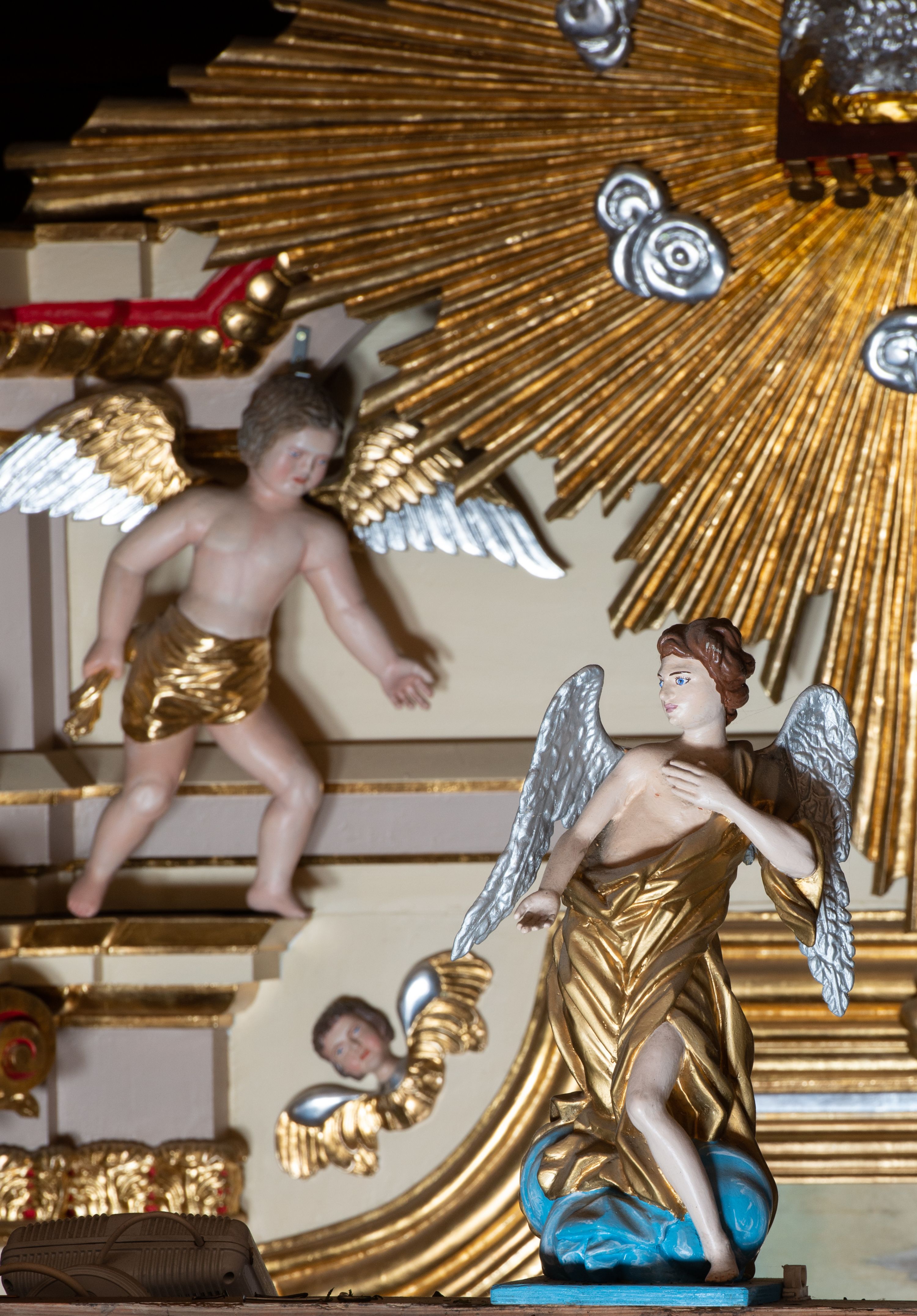 Tabernakulum w formie dużej, prostopadłościennej skrzynki ujętej w przednich narożach pilastrami dźwigającymi profilowany, trójbocznie wyłamany gzyms, dekorowany u spodu kostkowaniem i uskrzydloną główką anielską u szczytu. Drzwiczki w formie stojącego prostokąta zamkniętego łukiem półkolistym, ujęte opaską i rzeźbioną ramą; w polu medalion w glorii promienistej z płaskorzeźbioną postacią Dzieciątka na obłoku. Drzwiczki ujęte podwieszonymi na wstędze festonami utworzonymi z winnego grona, kłosów zbóż i kampanuli. Tabernakulum flankowane uszami z karbowanych wolut i liści palmowych; zwieńczone cokołem, na którym stoi równoramienny krzyż o trójlistnym zakończeniu ramion, na ich skrzyżowaniu medalion z Okiem Opatrzności w glorii. Na gzymsie, na osi pilastrów dwie klęczące figury adorujących aniołów. Przed tabernakulum druga para klęczących aniołów trzymających kwieciste girlandy.