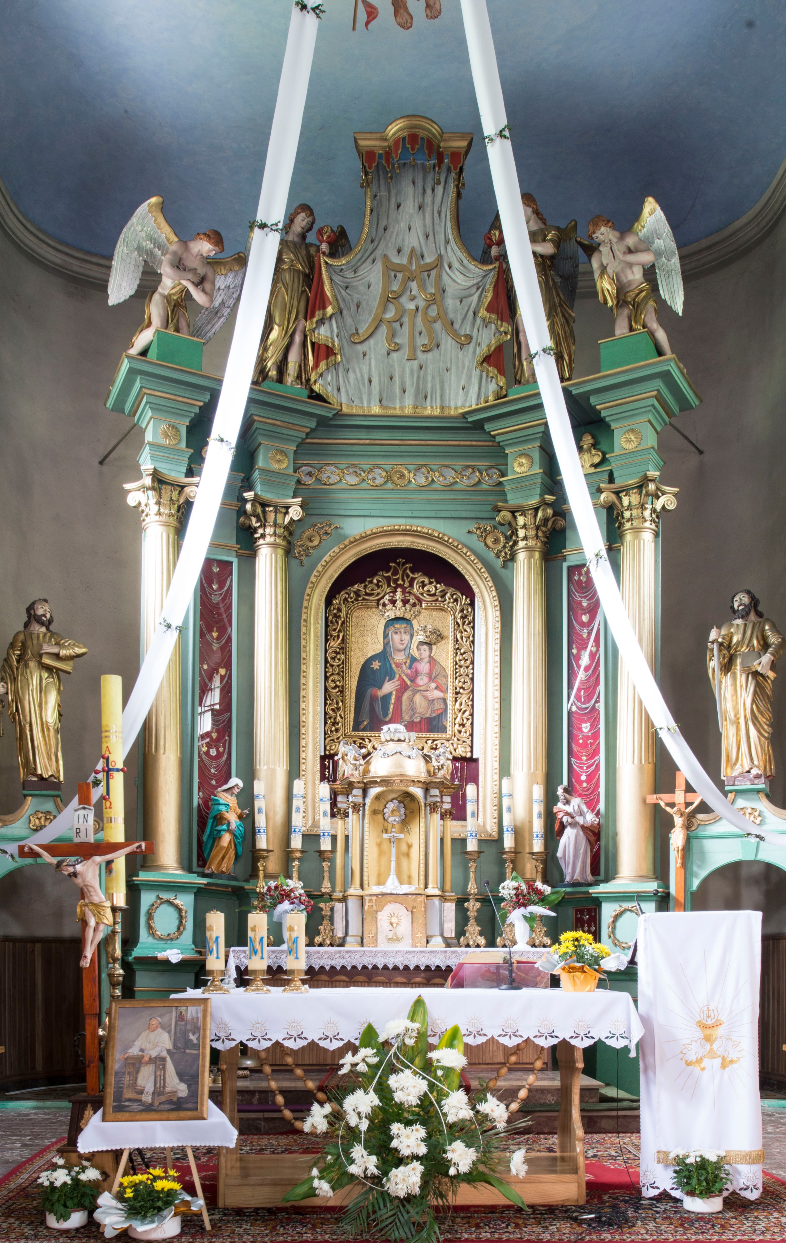 Dobry. Ołtarz został dwukrotnie odmalowany przez Józefa Stopę, malarza z makowa w czerwcu i lipcu 1901 i 1912 roku (wówczas też został odzłocony). Kolejne odmalowanie miało miejsce w 1948 roku. W 1985 roku ołtarz został odnowiony przez Stanisława Mielęckiego z Sułkowic i pana Nawałkę z Krakowa. W 2001 roku córka malarza Stanisława Kudłacza -