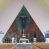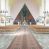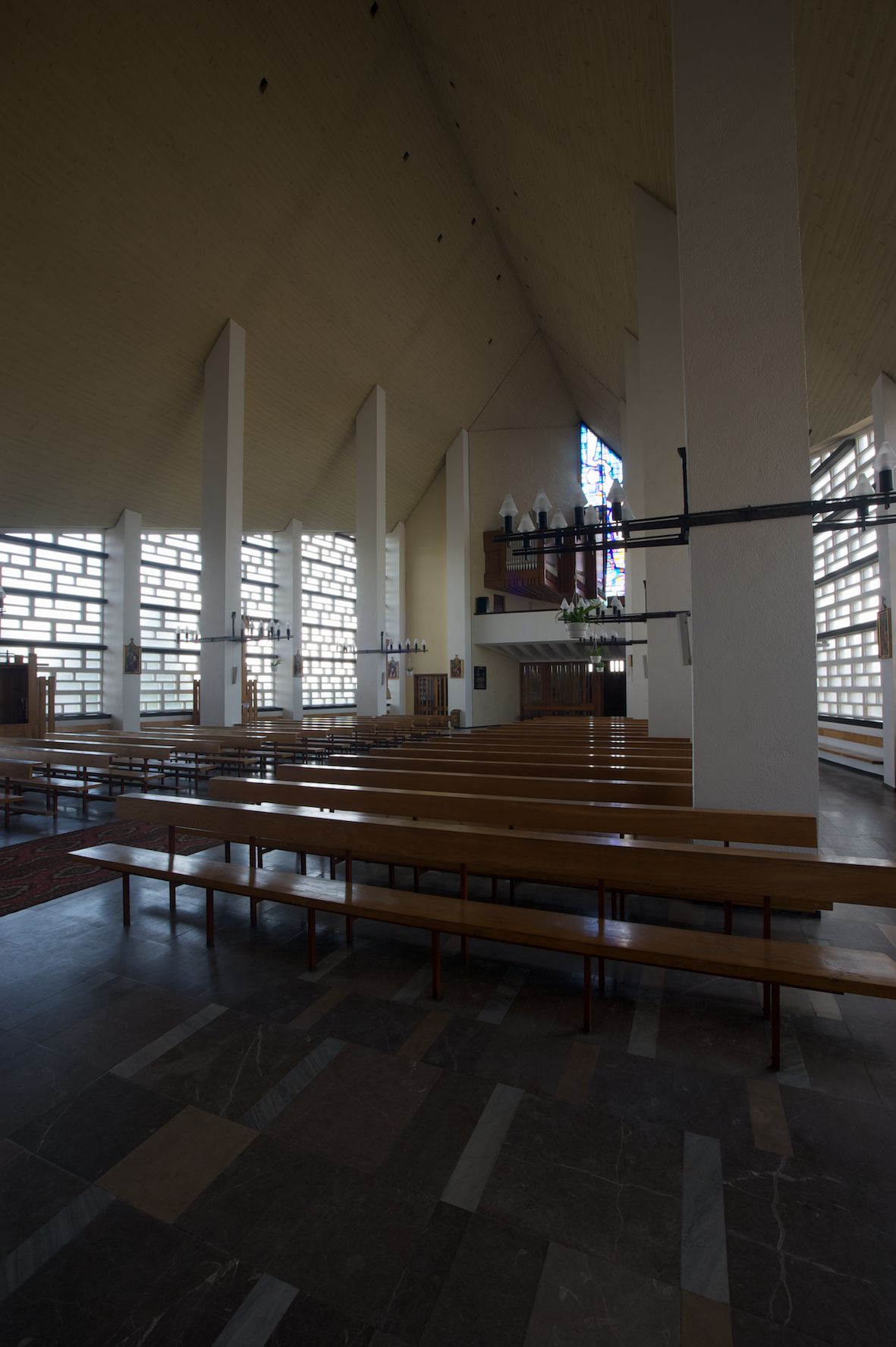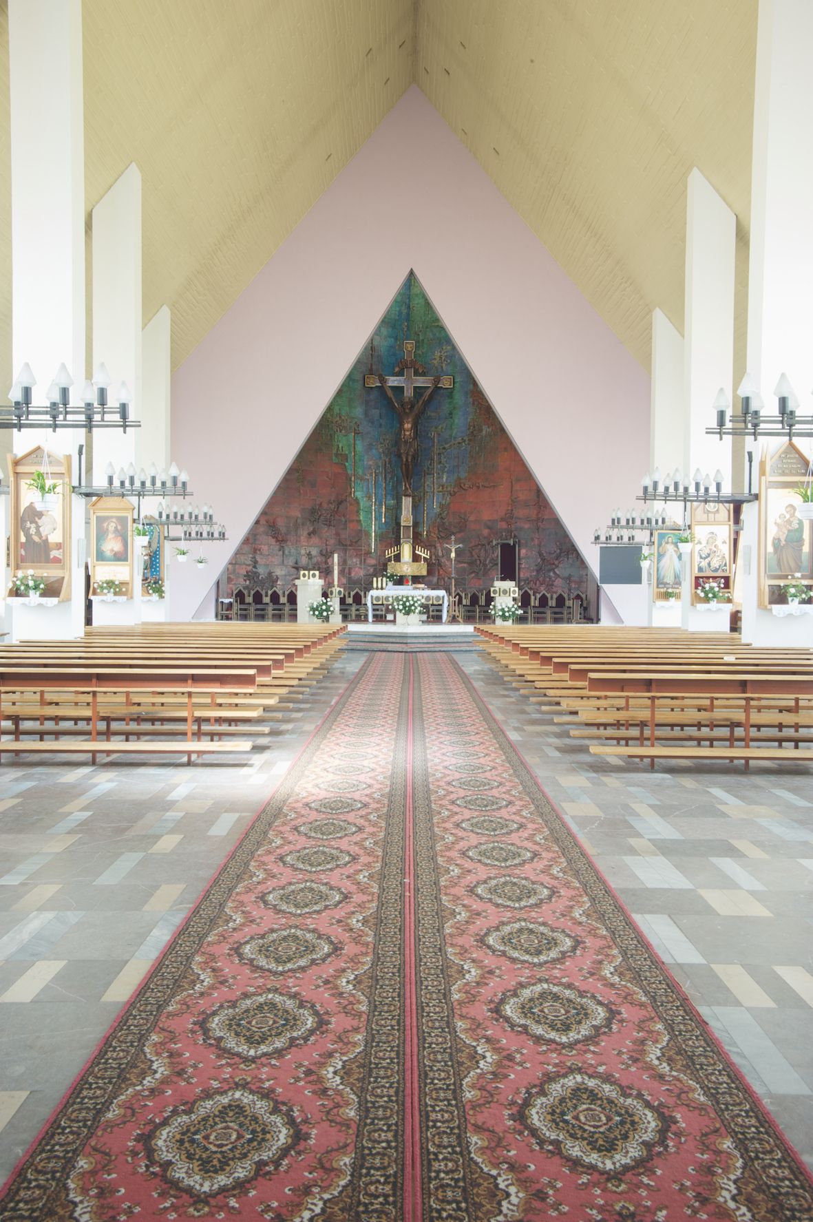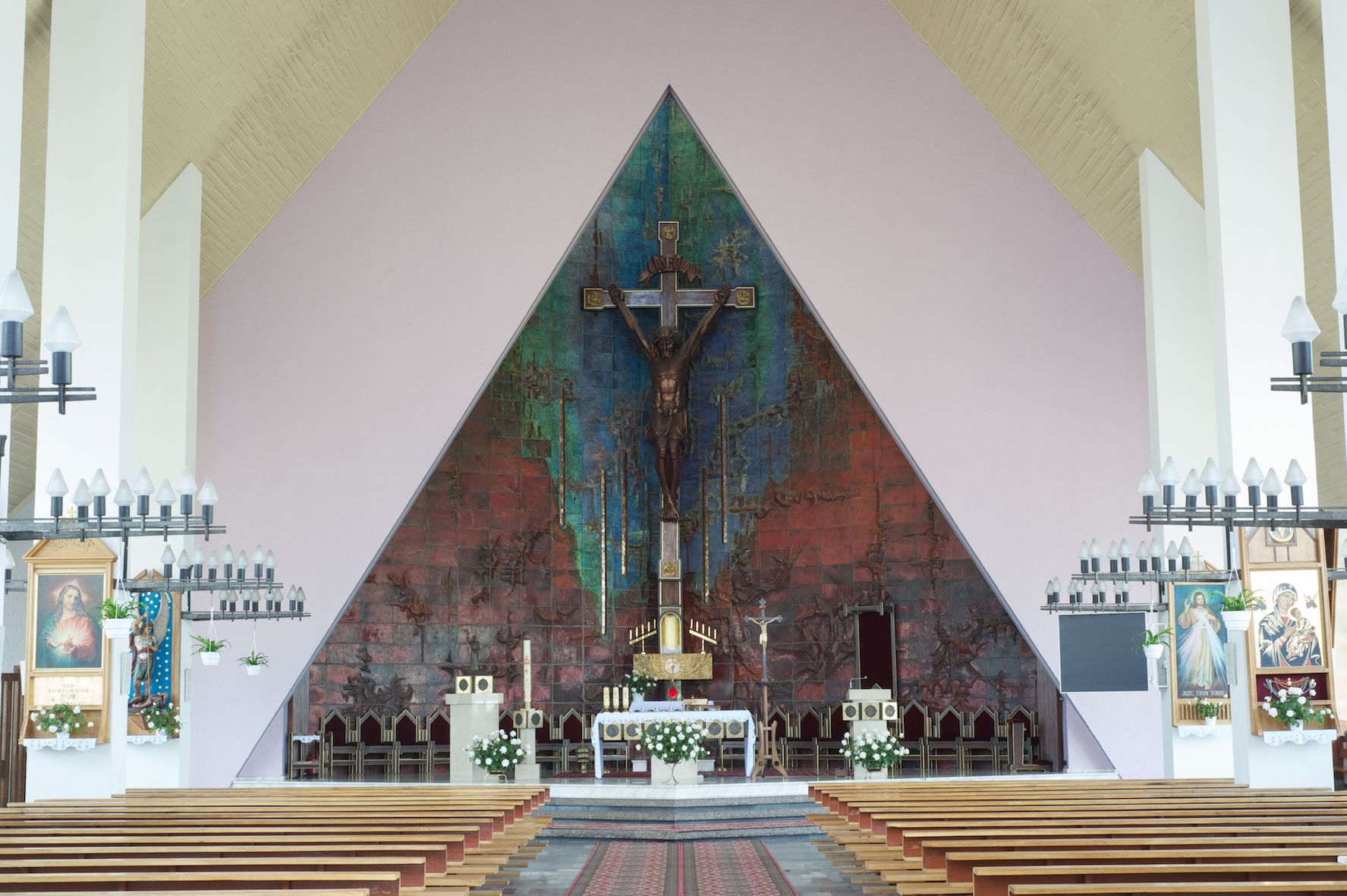 Okładzina ceramiczna pokrywa dwie ściany zamykające prezbiterium, łączące się pod kątem rozwartym i doświetlone pośrodku przez wpadające z górnego świetlika światło. Płyty są płaskorzeźbione i opracowane reliefowo, w kolorystyce błękitnej i seledynowej spływającej od szczytu ściany i przechodzącej w intensywną czerwień i brązy.