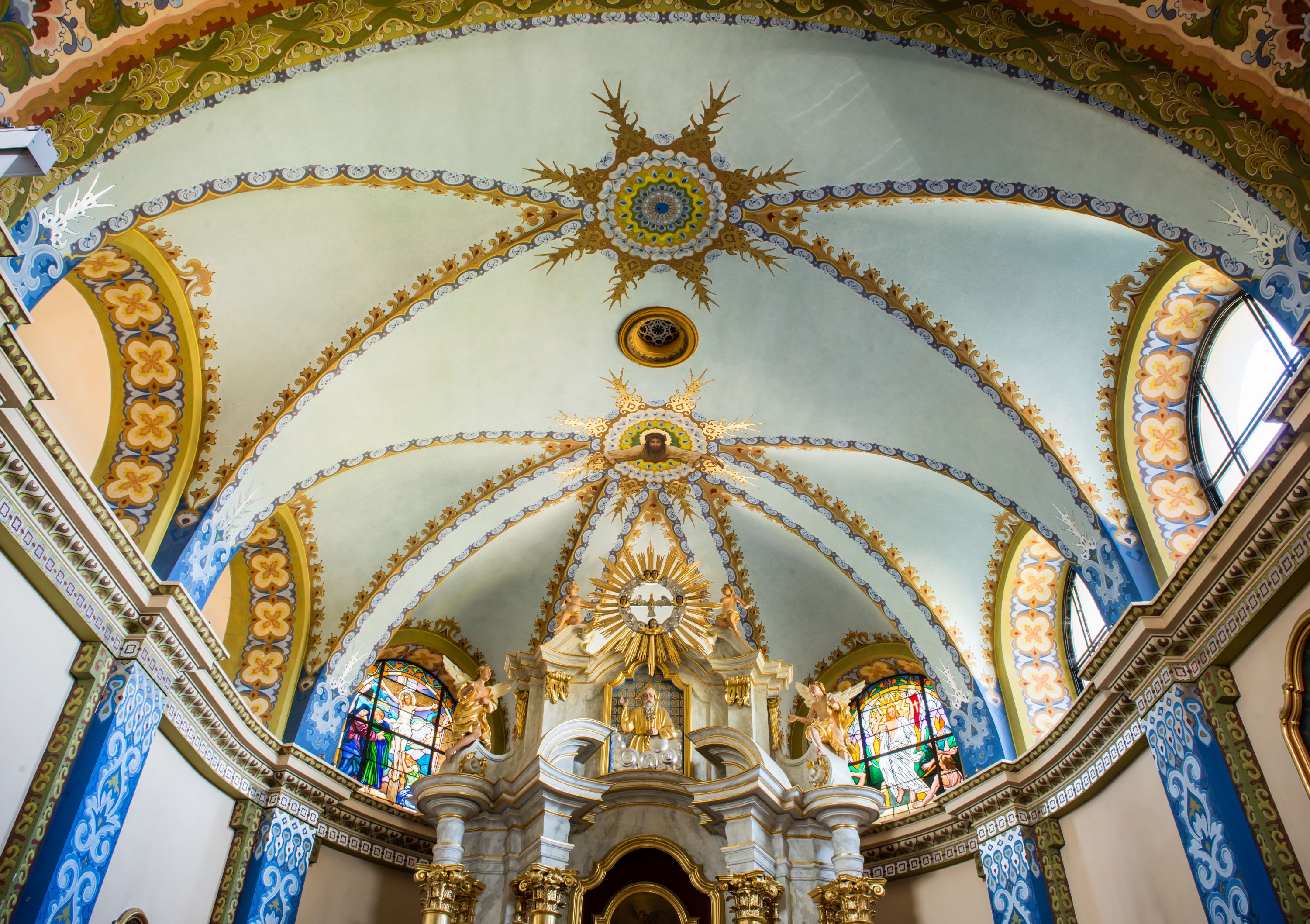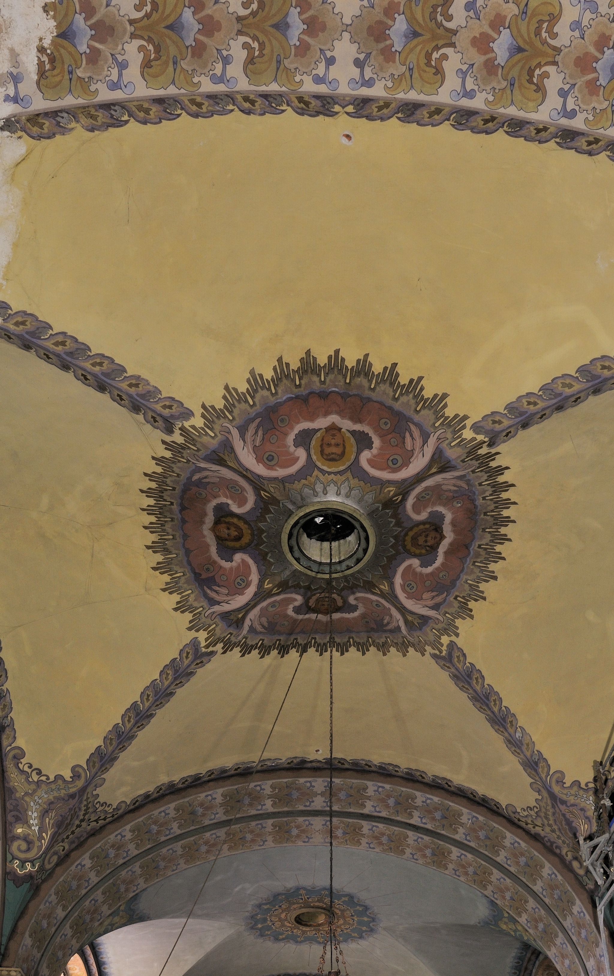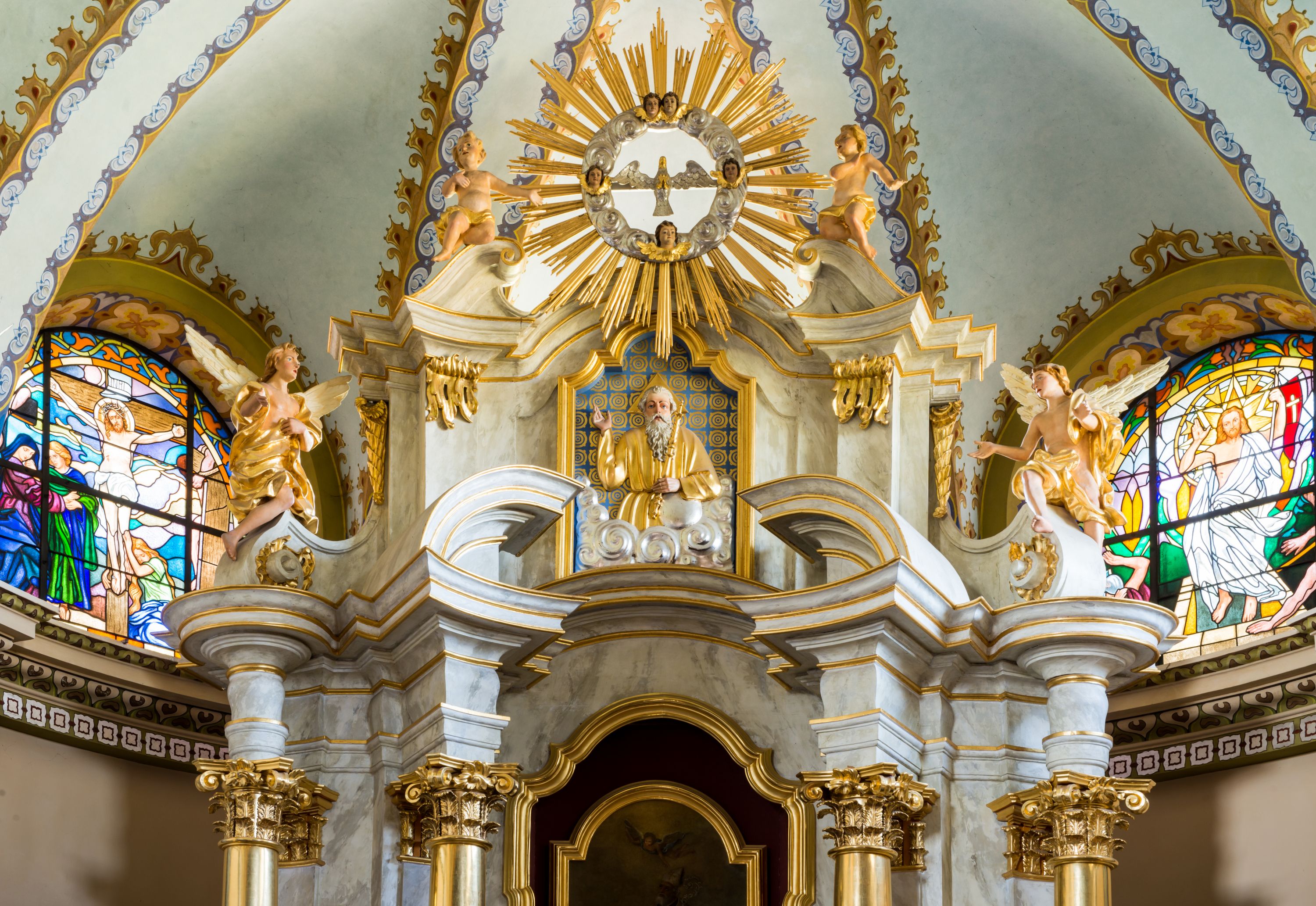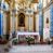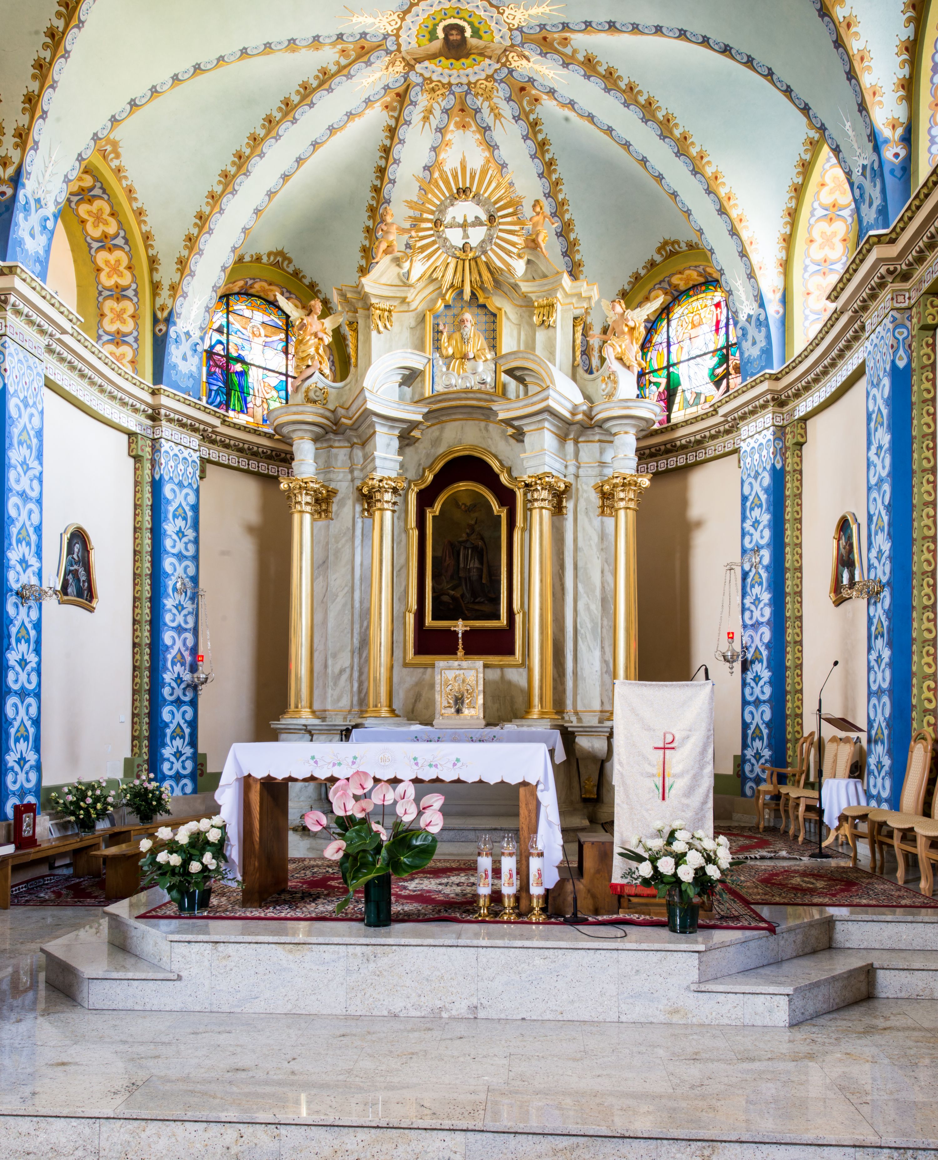 Struktura marmoryzowana w kolorze jasnoszarym; ornamentyka, profile, kolumny i detale złocone i srebrzone.