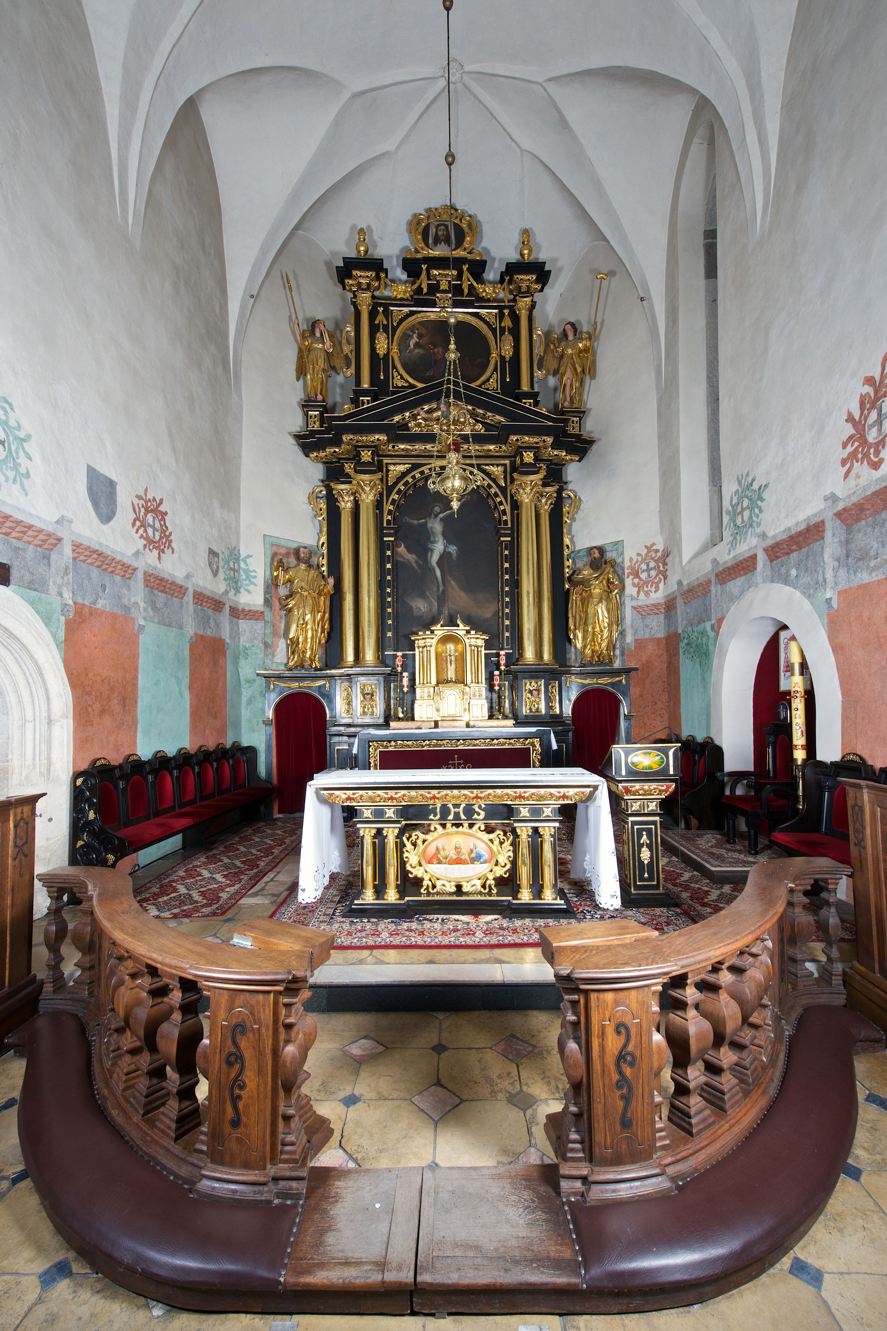 Oba ołtarze oparte zostały na schemacie aediculi, w której dwie pary kolumn na wysokich cokołach podtrzymują wyłamujące się belkowanie dźwigające przyczółek i flankujące prostokątny, zamknięty półkoliście obraz. Kolumny wewnętrzne zostały znacząco wysunięte do przodu. Opisany schemat kompozycyjny ma włoskie pochodzenie. Występuje w ołtarzach rzymskich kościołów, m.in. w kościele S. Agostino, którego retabulum powstało zapewne według projektu Orazia Torrianiego. Polskie ołtarze są smuklejsze i mają bardziej rozbudowane zwieńczenia, zapewne z uwagi na możliwości rzeźbiarskie, jakie dało zastosowane do budowy drewno, w przeciwieństwie do stosowanego we Włoszech, trudniejszego w obróbce i cięższego kamienia.