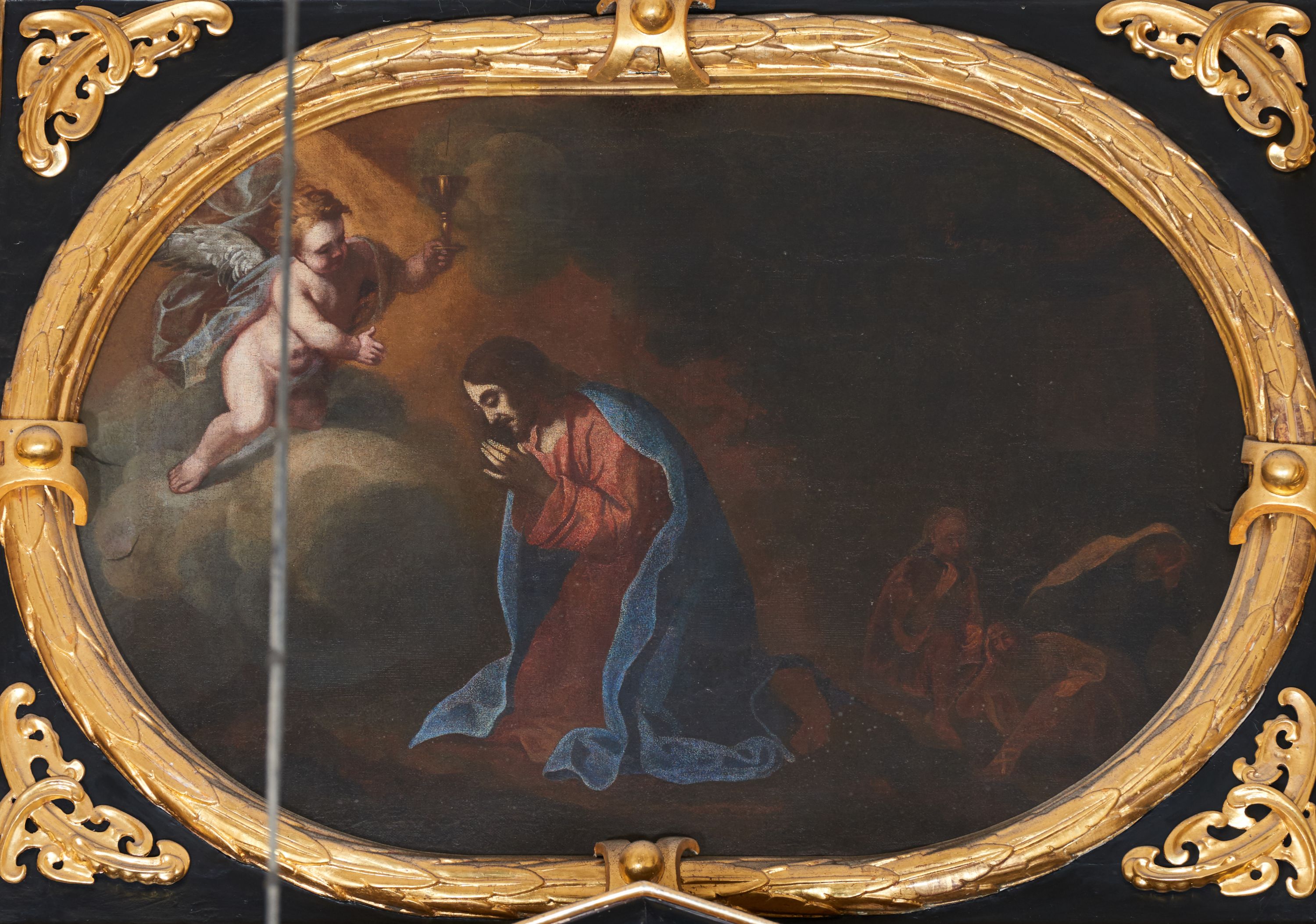 Ołtarz architektoniczny, jednoosiowy, dwukondygnacyjny, z bramkami, na cokole. Pierwsza kondygnacja ujęta parą pilastrów za dwiema parami gładkich kolumn o kapitelach kompozytowych, dźwigających imposty, z gzymsem wyłamanym w partii podpór. Środkowa para wysunięta przed lico ołtarza, zwieńczona trójkątnym przyczółkiem z rzeźbą przedstawiającą Boga Ojca w obłokach. Pole środkowe w formie arkady z obrazem Ukrzyżowania. Kondygnacja ujęta uszami utworzonymi z ornamentu małżowinowo-chrząstkowego. Na bramkach figury św. Piotra i św. Pawła. Druga kondygnacja w formie leżącego prostokąta, ujęta parą pilastrów i stojącą przed nimi parą gładkich kolumn o kapitelach kompozytowych, dźwigających imposty. Kondygnacja flankowana dwiema figurami aniołów stojących na postumentach. Pole obrazowe z przedstawieniem Chrystusa w Ogrójcu w formie leżącego owalu w prostokątnej płycinie. Zwieńczenie przyjmujące kształt impostu dźwigającego na szerokim gzymsie owalny kartusz ujęty ornamentem małżowinowo-chrząstkowym z przedstawieniem Veraicon. Nastawa pokryta bogatą dekoracją ornamentalną. W partii cokołów płyciny z ornamentem małżowinowo-chrząstkowym, w wewnętrznych dodatkowo główki anielskie oraz girlandy utworzone z tkaniny nad arkadami bramek. Czoło arkady pola środkowego dekorowane rozetami, w ościeżach bocznych małżowina, w podłuczu kasetony z rozetami. W przyłuczu arkady ornament roślinny. W impostach, w partii fryzu rozety, powyżej ażurowy ornament małżowinowo-chrząstkowy dekoruje podstawę gzymsu. Przyczółek ozdobiony małżowiną. W drugiej kondygnacji owalna rama obrazu przyjmuje postać wieńca laurowego dekorowanego kartuszami z kaboszonami. W narożach płyciny małżowina. Pole ujęte festonami utworzonymi z tkaniny, owoców i kwiatów. Fryz impostów dekorowany analogicznie jak w pierwszej kondygnacji. Na fragmentach belkowania wazony. Odcinki gzymsu połączone girlandą z tkaniny z pękiem owoców i kwiatów. Kondygnacja ujęta uszami z ornamentu małżowinowo-chrząstkowego.