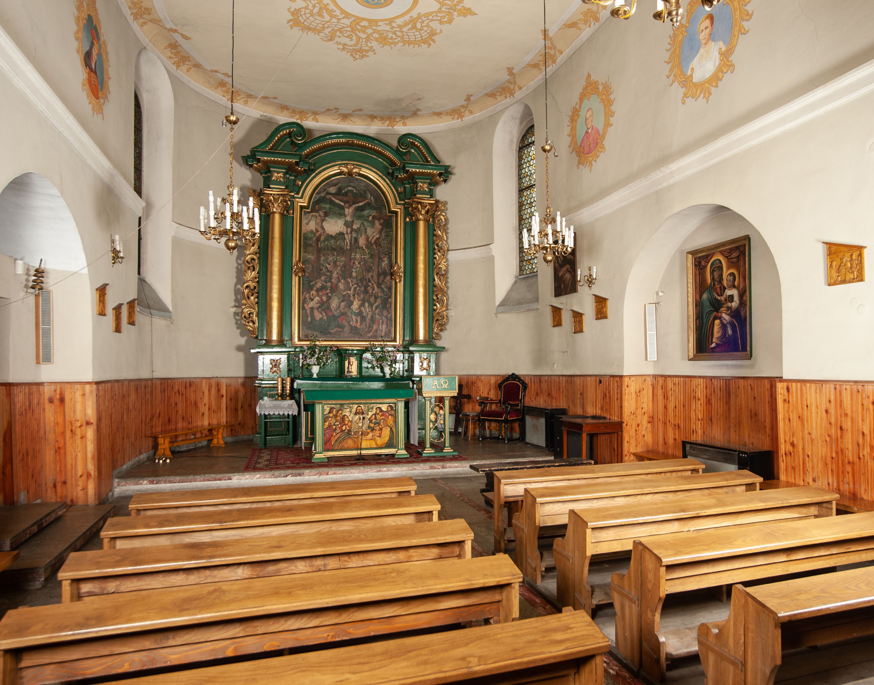 Ołtarz przyścienny, architektoniczny, jednoosiowy, jednokondygnacyjny, z uszakami. Mensa prostopadłościenna. Na niej prostopadłościenne tabernakulum zwieńczone wydatnym gzymsem, z drzwiczkami zamkniętymi łukiem nadwieszonym z motywem kielicha z hostią. Nastawa ołtarzowa ujęta korynckimi kolumnami ustawionymi na podwójnym cokole zdobionym prostokątnymi płycinami w dolnej partii i plakietami utworzonymi z ornamentu małżowinowo-chrząstkowego w górnej. Podpory dźwigają pełne, wyłamane na ich osiach belkowanie, którego gzyms jest wyniesiony nad polem centralnym. Fryz wysuniętych części dekorowany rozetami, silnie wystający gzyms zdobiony wałeczkami. Na wyłamanych częściach belkowania ustawiono symetrycznie woluty. W polu nisza zamknięta łukiem półkolistym nadwieszonym mieszcząca obraz z wielopostaciową sceną Ukrzyżowania w profilowanej ramie dekorowanej w trzech miejscach ornamentem roślinnym. Kondygnacja ujęta ażurowymi uszakami utworzonymi z suchej wici akantu. Struktura ołtarza w kolorze zielonym, trzony kolumn, detale i ornamenty złocone.