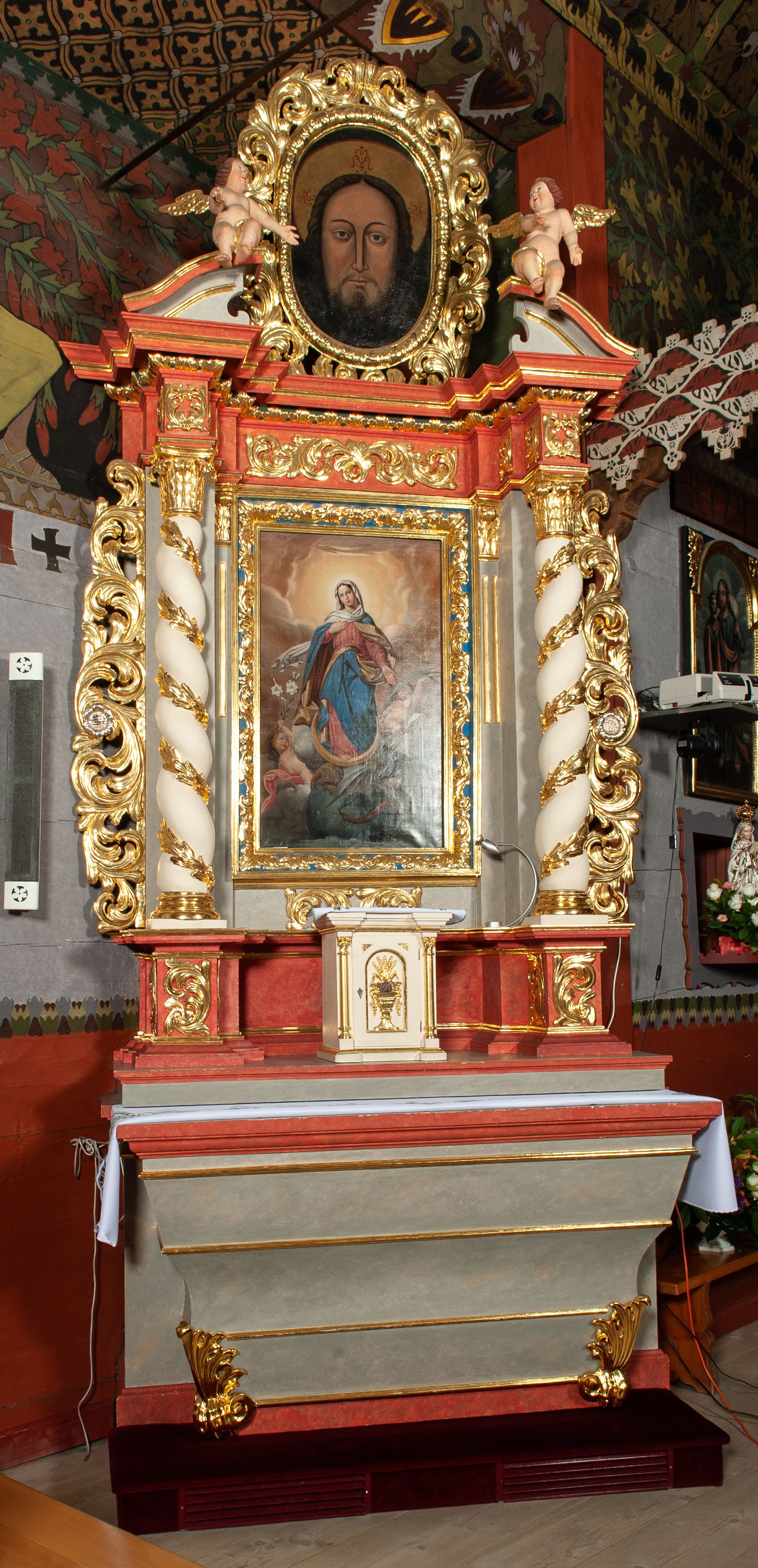 Ołtarz architektoniczny, jednokondygnacyjny, jednoosiowy, ze zwieńczeniem i drewnianą, sarkofagową mensą z kamiennym portatylem. Na mensie ołtarza kremowe tabernakulum w formie prostopadłościennej szafki, ujęte parą korynckich, złoconych półkolumienek, stojących na wyłamującym się, zdwojonym cokoliku, wspierających silnie wysunięty gzyms wieńczący. Drzwiczki w kształcie stojącego prostokąta, z prostokątną płyciną zwieńczoną łukiem półkolistym, zdobioną płaskorzeźbionym motywem kielicha, hostii, kłosów zboża i winnych gron. Retabulum na cokole, ujęte parą pilastrów korynckich, z kanelurowaniem do połowy trzonu i parą filarów, na tle których ustawiona jest para kolumn akantowych o spiralnie skręconych trzonach. Podpory wspierają wyłamujące się ponad nimi belkowanie o wysuniętym gzymsie. Zwieńczenie w formie stojącego owalu ujętego ażurową, akantową ramą, flankowane przerwanym, wklęsło wypukłym przyczółkiem. Dolne naroża antepedium zdobione motywem lwiej łapy ujętej parą wolut, z liściem akantu w zwieńczeniu. Pola cokołu, dolna partia pola środkowego i pola wewnątrz wnęki, oraz fryz retabulum zdobiony motywem wici akantowej. Na trzonach kolumn retabulum spiralnie oplatająca ją wić roślinna. Cześć środkowa retabulum ujęta parą ażurowych, akantowych uszaków. Pole środkowe w formie wnęki w kształcie stojącego prostokąta z przedstawieniem Matki Boskiej Nieustającej Pomocy oraz Niepokalanego Poczęcia Najświętszej Marii Panny na zasuwie. W zwieńczeniu pole obrazowe w kształcie stojącego owalu z przedstawieniem Veraicon. Na gzymsie przyczółka para siedzących aniołków. Kolorystyka struktury ołtarza w odcieniach szarości i czerwieni; ornamentyka i fragmenty detali architektonicznych złocone.