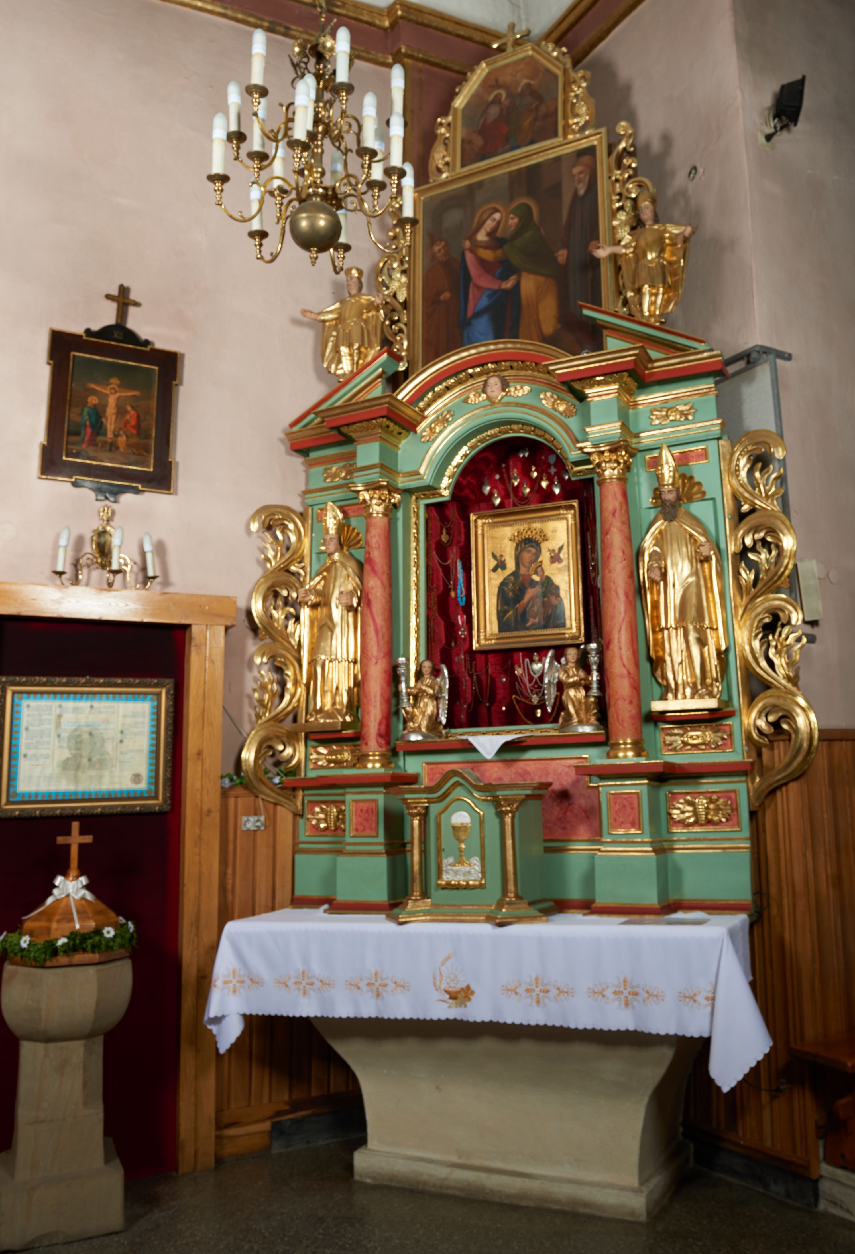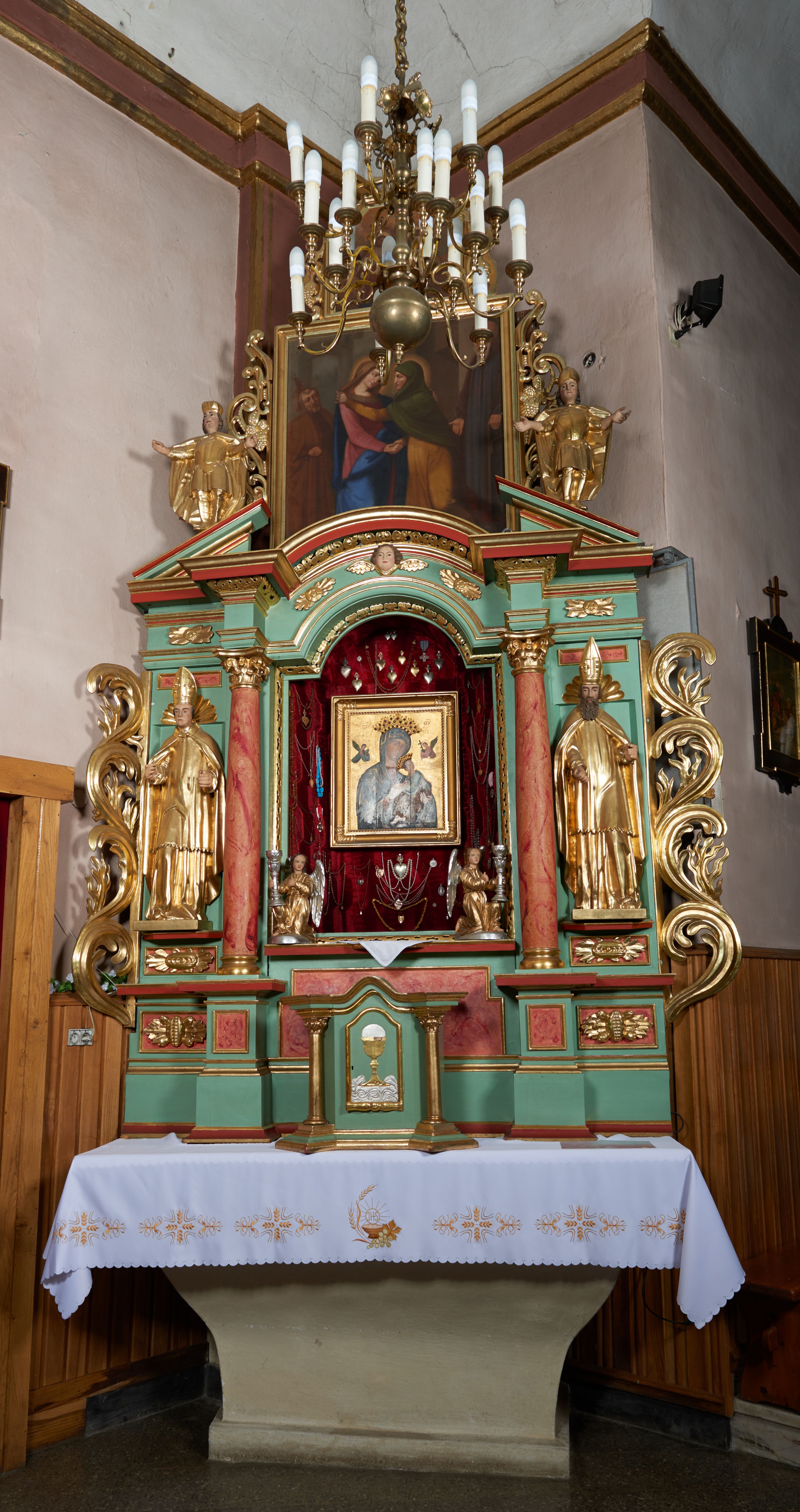 Ołtarz przyścienny, architektoniczny, trójosiowy, jednokondygnacyjny ze zwieńczeniem i uszakami. Mensa w typie sarkofagowym na niewielkim prostopadłościennym postumencie. Tabernakulum drewniane, architektoniczne, ujęte złoconymi kolumienkami dźwigającymi wyłamane i wyniesione belkowanie. Na drzwiczkach płaskorzeźbione przedstawienie kielicha z hostią. Nastawa drewniana ujęta korynckimi kolumnami ustawionymi na wysokich postumentach. Dźwigają one pełne, wyłamane na osiach kolumn i półkoliście wyniesione na osi środkowej ołtarza belkowanie. Fryz dekorowany rozetami oraz uskrzydloną główką anielską. Powyżej odcinki przyczółka, na których ustawione pełnoplastyczne figury świętych wojowników. W polu środkowym nisza zamknięta łukiem półkolistym nadwieszonym mieszcząca obraz Matki Boskiej Nieustającej Pomocy. W osiach bocznych ustawione na tle płycin pełnoplastyczne figury świętych biskupów w złoconych szatach oraz akantowe, ażurowe uszaki utworzone z wici akantowej. W zwieńczeniu obraz „Nawiedzenie Najświętszej Marii Panny” w kształcie stojącego prostokąta ujęty ażurowymi uszami utworzonymi z ornamentu mażowinowo-chrząstkowego, i winorośli. Powyżej, analogicznie, mniejszy obraz „Trójca Święta” w kształcie prostokąta stojącego o ściętych górnych narożach, zwieńczonego krzyżem równoramiennym. Struktura ołtarza w kolorze jasnozielonym, wypełnienia płycin, trzony kolumn oraz elementy gzymsu jasnoczerwone, marmoryzowane; ornamenty złocone.