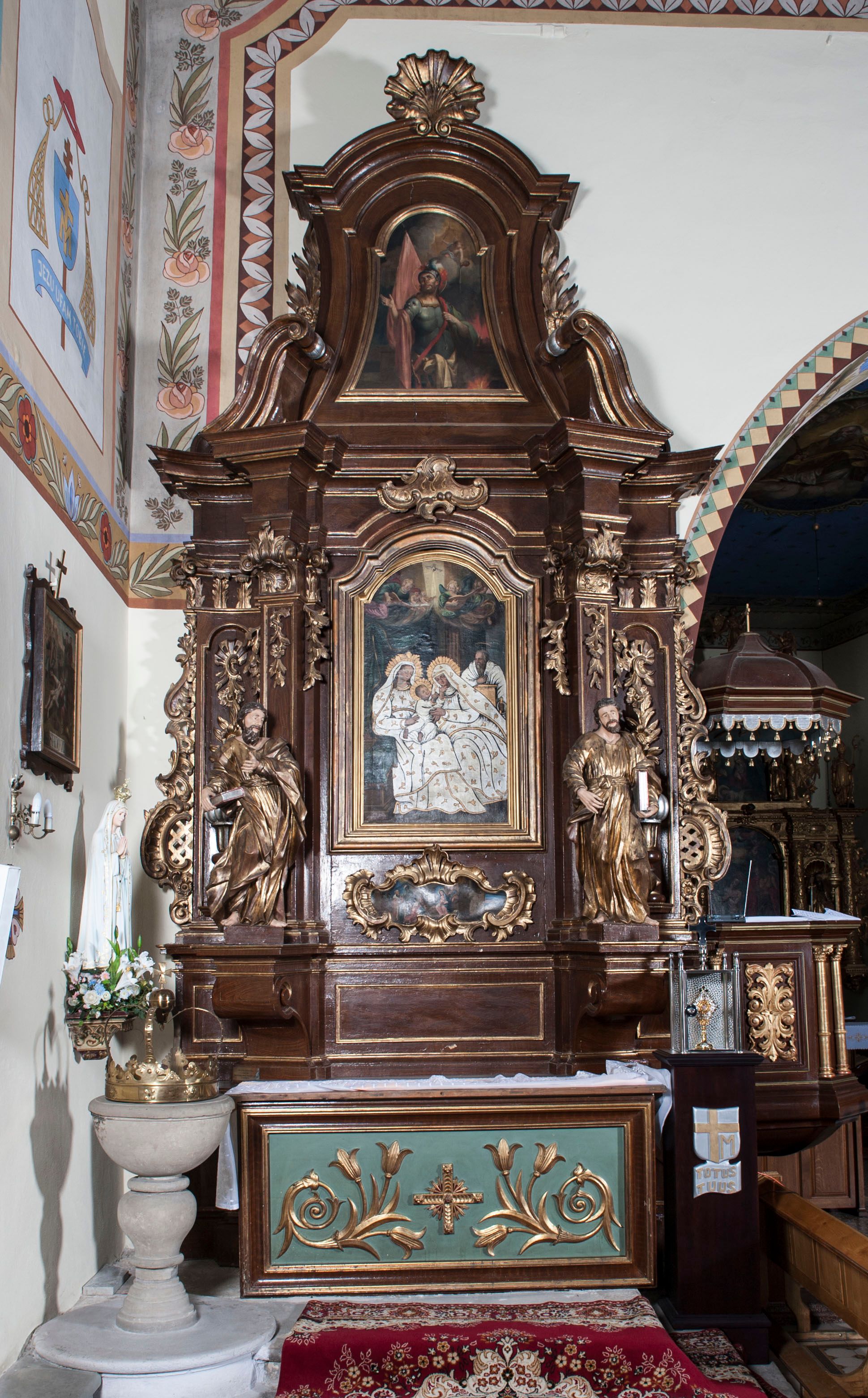 Ołtarz architektoniczny, jednokondygnacyjny, jednoosiowy ze zwieńczeniem. Antepedium z płaskorzeźbionym krzyżem ujętym wolutami z motywami lilii. Nastawę ujmują ukośnie ustawione zwielokrotnione pilastry z konsolami, na których stoją figury. Pilastry podtrzymują belkowanie, które nad zewnętrznymi pilastrami jest lekko wklęsłe, nad wewnętrznymi zwieńczone falującymi naczółkami, a nad osią środkową z lekko wybrzuszonym architrawem. Zwieńczenie o lekko wklęsłych bokach zamknięte profilowanym gzymsem w formie łuku nadwieszonego. W polu środkowym wnęka w kształcie stojącego prostokąta zakończonego łukiem odcinkowym, nadwieszonym, w niej obraz "Św. Anna Samotrzeć" i "Męczeństwo św. Sebastiana" na zasuwie. Pole obrazowe w zwieńczeniu powtarza jego kształt, wypełnione wizerunkiem św. Floriana. W partii predelli wkomponowano fantazyjny kartusz z obrazem przedstawiającym hołd Trzech Króli. Na dekorację ornamentalną składają się motywy rocaille'owe na pilastrach, uszy ujmujące nastawę z rocaille'ami w części wypełnionymi kratką regencyjną, kartusz w partii belkowania oraz drobne motywy roślinne i rokokowe w partii zwieńczenia.,